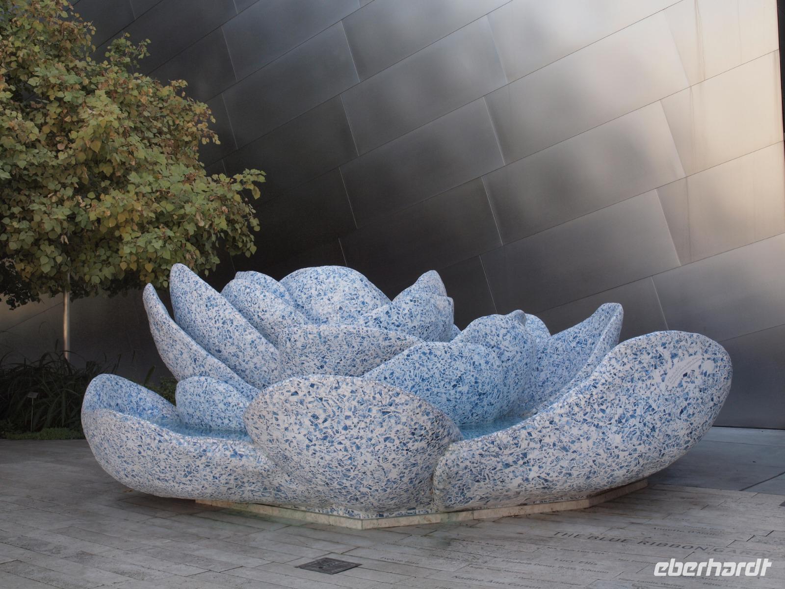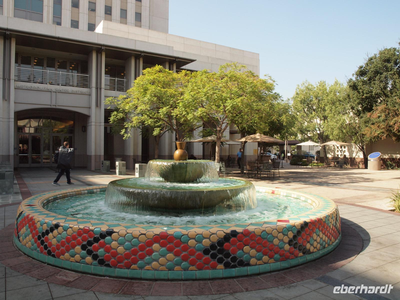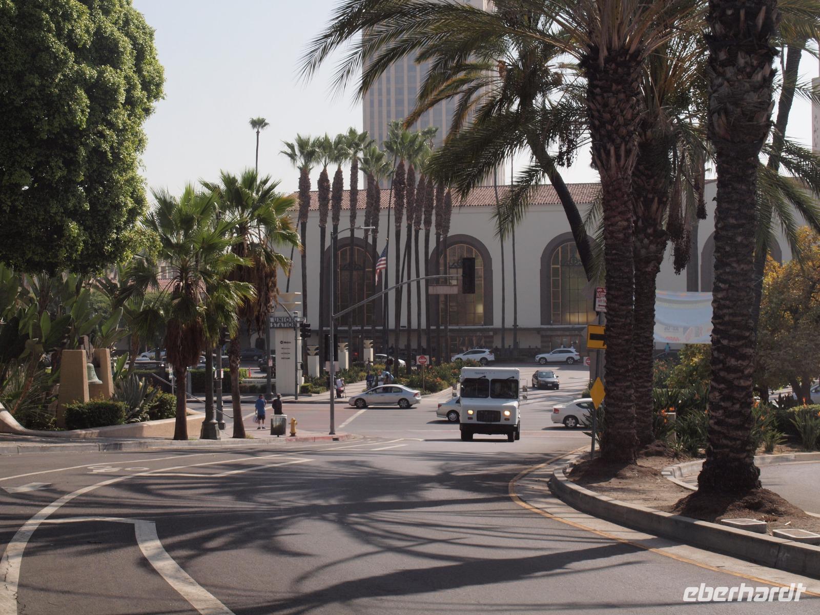 Frisch, munter und gestärkt treffen wir uns am Morgen nach dem Frühstück wieder. Heute erkunden wir Los Angeles und lernen dabei auch unseren Chauffeur für die Reise kennen, den Belgier Serge. Unsere Tour beginnt im ältesten Teil der Stadt. An der Old Plaza, etwas oberhalb vom Bahnhof, befindet sich die Olvera Street. Sie wird als Geburtsstätte von L.A. bezeichnet und würdigt das mexikanische Erbe der Stadt. Den mexikanischen Einfluss erleben wir auch in der kleinen katholischen Kirche, die wir zuerst besuchen. Die Olvera Street selbst ist heute noch etwas verschlafen, die kleinen Läden und Restaurants erwachen erst mit unserer Ankunft zum Leben. Wir schauen uns ein altes Gutshaus an, es wurde liebevoll restauriert und bietet den Besuchern einen einmaligen Einblick ins damalige Leben der Menschen. Langsam schlendern wir entlang der Straße weiter in Richtung Union Station, den Bahnhof. Hier sind wir dann schon wieder mitten im modernen Leben angekommen. Die Menschen warten in den großen Hallen auf die ankommenden Züge oder eilen durch die langen Gänge um den Anschluss nicht zu verpassen - People Watching kann man hier ausgiebig ausüben. Nach einer kleinen Pause zum herum stöbern und schauen treffen wir uns wieder bei Serge am Bus und fahren weiter. Der nächste Stopp ist das Walt Disney Theater. Hier führt uns Martina in den kleinen „Blue Ribbon"-Garten und zur „Rose für Lilly". Diese riesige Rose, welche aus den Bruchstücken von Delfter Porzellan Vasen besteht, ist ein Andenken an Lillian Disney. Hier befindet sich auch eine riesige, problemlösende Spirale auf dem Boden, hat's bei euch schon funktioniert?