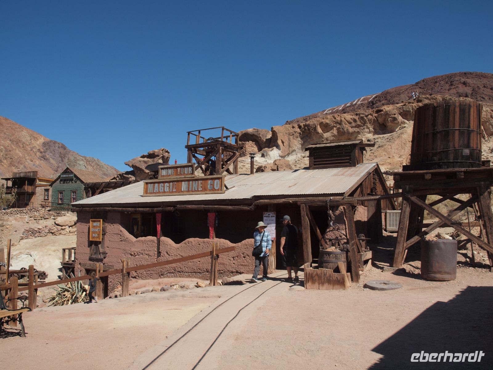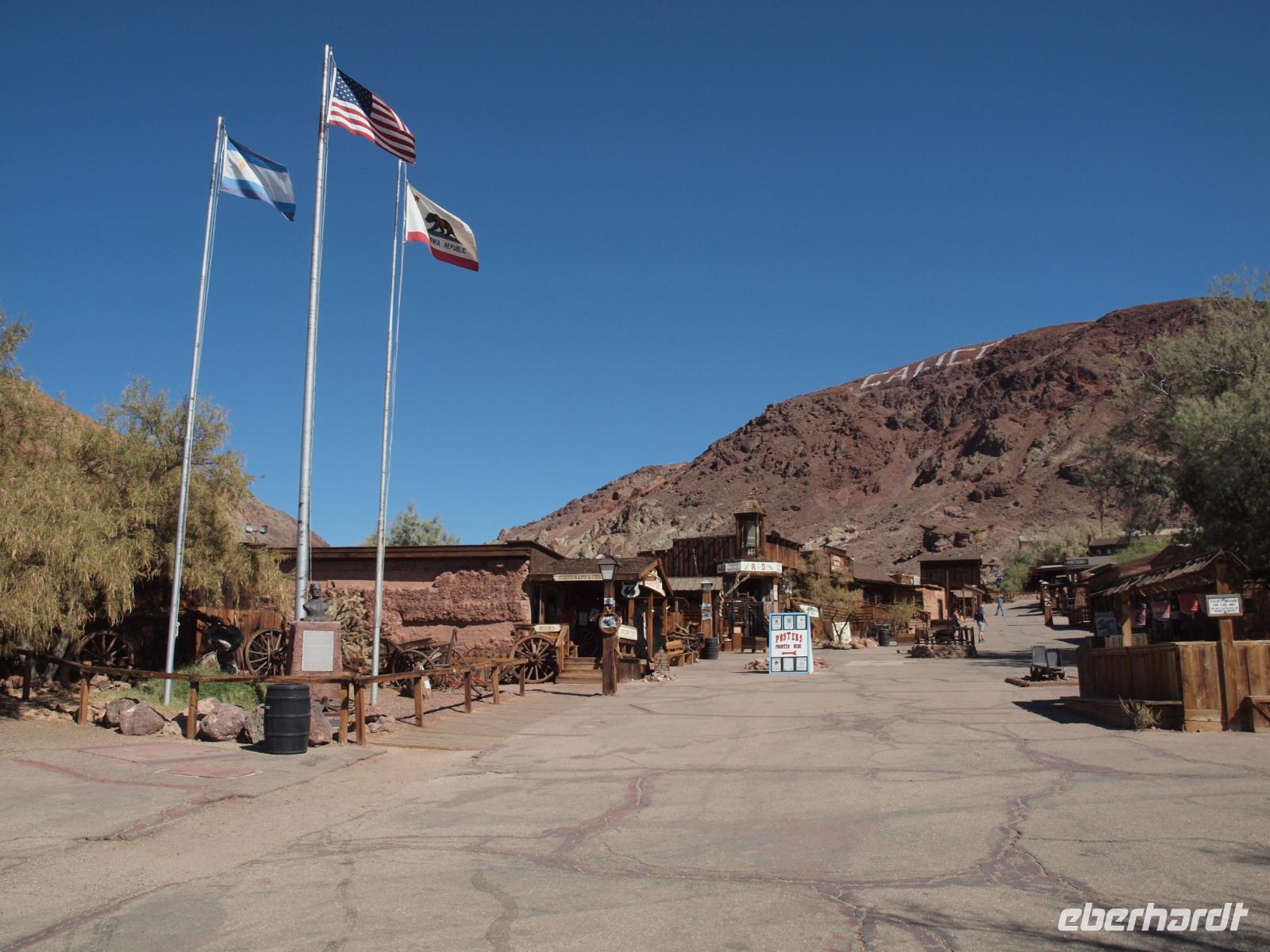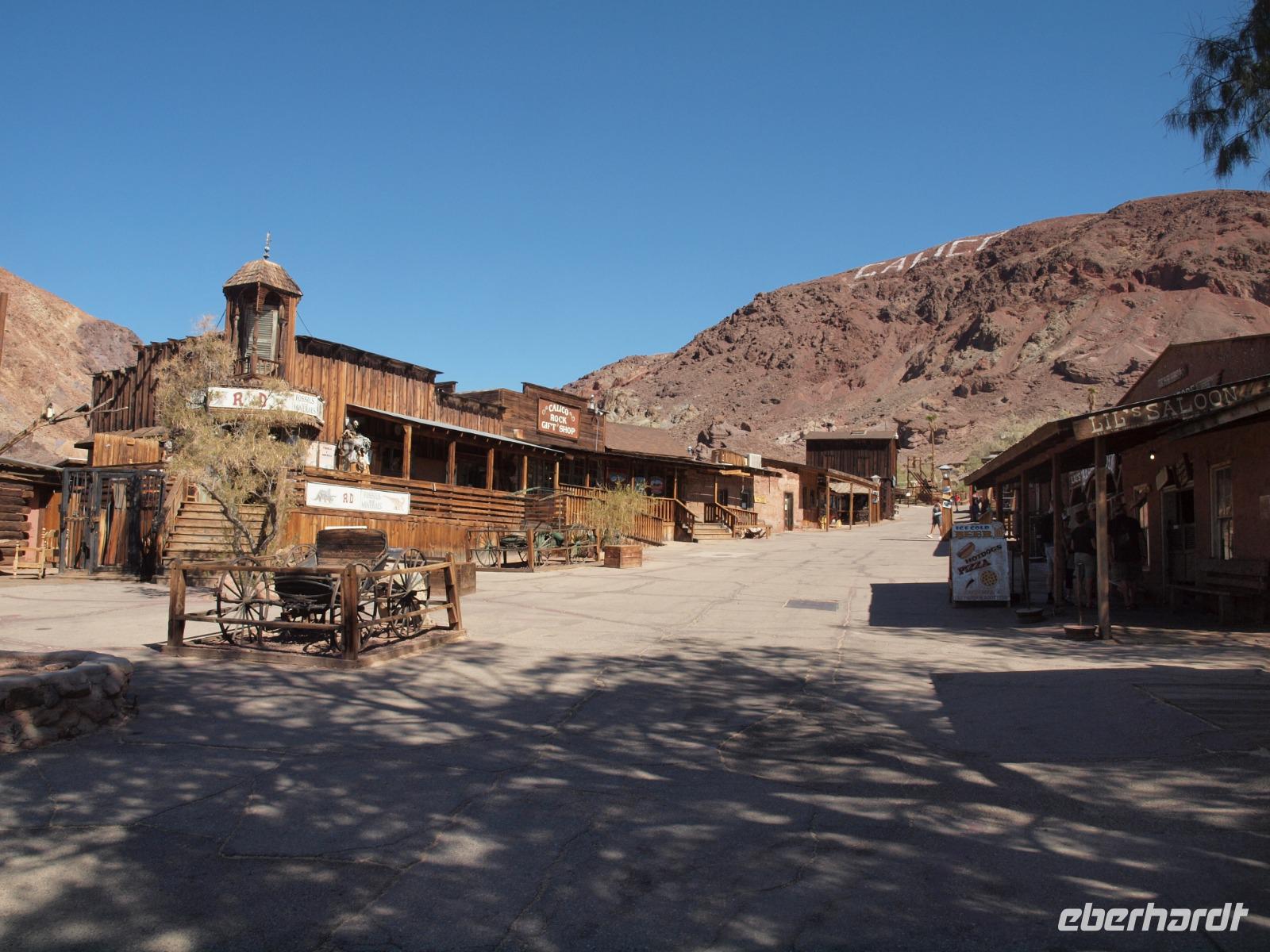 Nach dem Frühstück geht es mit gepackten Koffern und guter Laune gen Osten. Die Geisterstadt Calico in der Mojave-Wüste ist unser erster Stopp auf dem heutigen Programm. Auf dem Weg erzählt uns Martina spannende Geschichten aus der Zeit der Cowboys und Goldgräber. Könnt ihr euch noch erinnern? Zum Beispiel an den Posthund Dorsey? Nach etwa zweieinhalb Stunden Fahrt erreichen wir die Geisterstadt, welche schon aus der Ferne mit einem in weißer Farbe auf die roten Felswände gemalten Schriftzug „CALICO" auf sich aufmerksam macht. Calico erwachte 1881 zum Leben, hier wurde vor allem Silber abgebaut und es gab über 500 Minen. Wir haben genug Zeit um auf Erkundungstour zu gehen. Es gibt eine Hauptstraße mit vielen kleinen Häuschen, natürlich im Wildwest-Stil restauriert. Hier findet man unter anderem die stilechte Cowboy-Kleidung, Schätze aus den Minen und den einen oder anderen Steckbrief mit ausgeschriebenem Kopfgeld, aber auch für das leibliche Wohl wird ausreichend gesorgt. Nach dem wir all unsere Fotos geschossen und uns etwas im Schatten ausgeruht haben, fahren wir weiter. Es ist Mittagszeit und glücklicherweise ist unweit von uns ein typisches amerikanisches Diner, das „Peggy Sue". Direkt neben dem Diner befindet sich auch eine Militärbasis und somit sehen wir schon von der Straße aus die Panzer und einige uniformierte Soldaten. Der farbenfrohe Eingang, eine riesige Jukebox, verleiht dem eher kargen Ort eine ordentliche Brise Pep. Die Einrichtung des Diners ließ keine Wünsche offen, verrückte und typische 50er Jahre Dekoration soweit das Auge sehen kann. Wir gehen in einen etwas größeren Bereich des Restaurants und werden schon von den Kellnerinnen in Empfang genommen, es ist laut, wirkt hektisch und durcheinander, aber wir wollten ja wissen, wie die Amerikaner sind... Nach der Bestellung und dem darauf folgenden Essen bleibt noch etwas Zeit um herum zu schauen. Beim Zahlen erhält man sogar noch einen Gutschein für eine kleine Süßigkeit im Krimskrams-Laden auf der anderen Seite. Weiter geht die Fahrt durch die staubige Wüste. Nach etwa drei Stunden erreichen wir am Nachmittag unser Ziel, die Spielerstadt Laughlin im Bundesstaat Nevada. Es heißt, es sei das Kleine Vegas. Im Hotel angekommen warten wir auf Martina und die Zimmerkarten, danach unternehmen wir eine kleine Führung durch das Hotelcasino. Es ist relativ dunkel gehalten, die eine oder andere Rauchwolke kommt einem entgegen, wenn man an den Spielautomaten vorbei geht. Nach unserer Orientierungstour treffen wir uns wieder, beziehen die Zimmer und verabreden uns für einen Spaziergang. Gemeinsam finden wir auch aus dem Wirrwarr hinaus und freuen uns über die warme Luft draußen. Unser Hotel befindet sich direkt am Flussufer des Colorado und die Uferpromenade lädt zum Schlendern ein. Leider nicht ganz so weit wie gehofft und wir müssen wieder durchs nächste Spielcasino durch. Rein kommt man ja schnell, nur der Weg nach draußen ist immer etwas schwieriger...