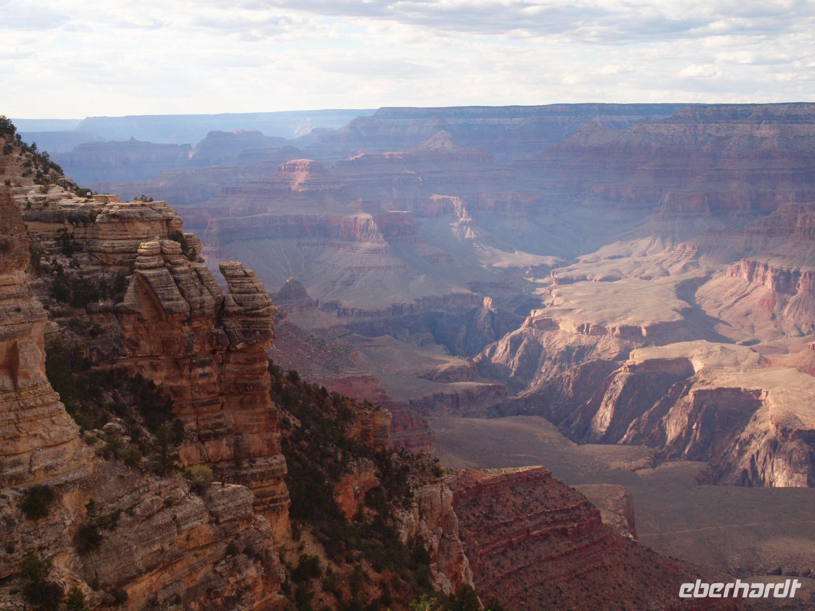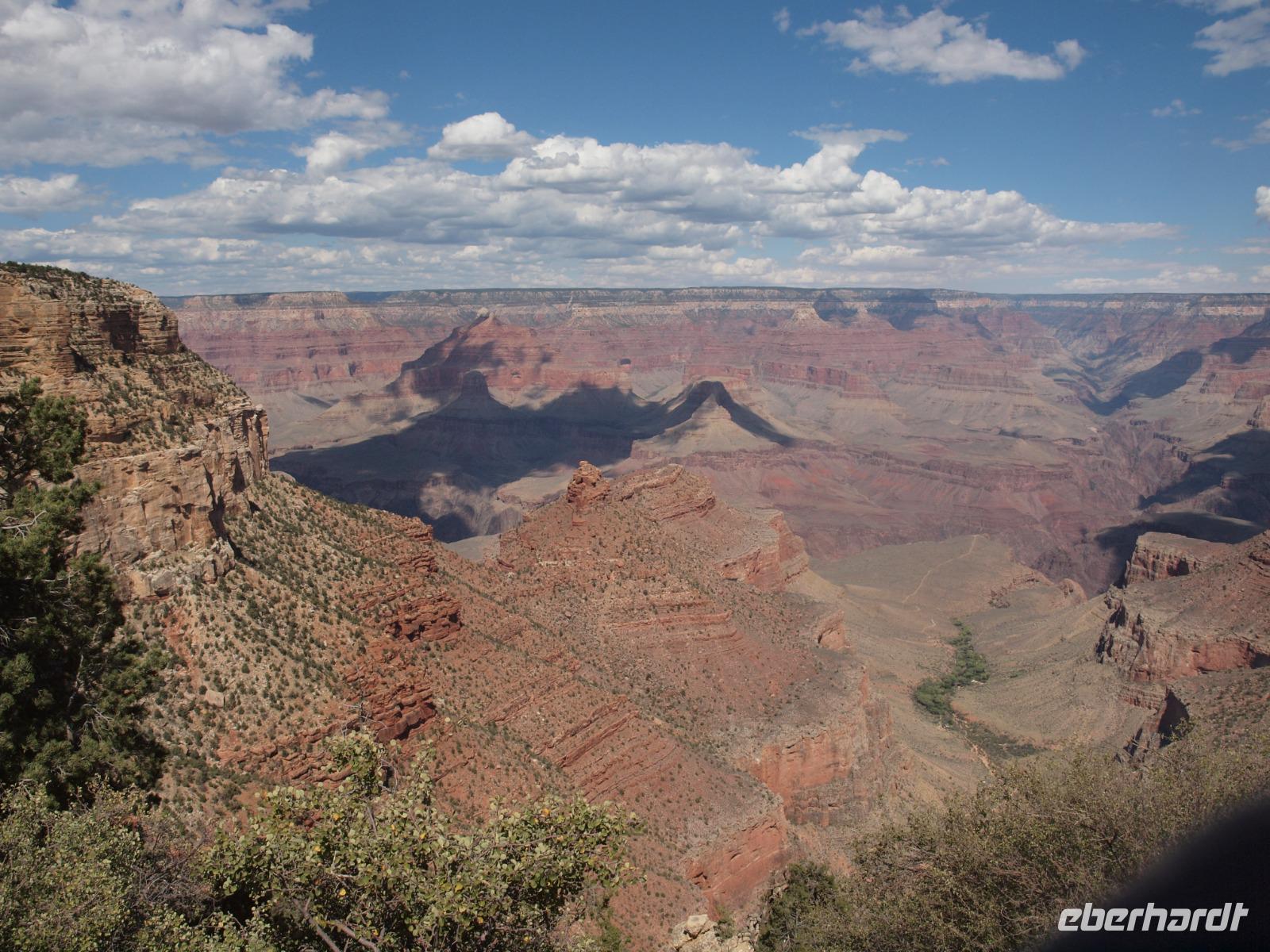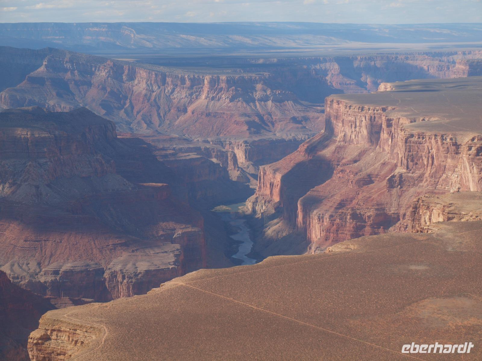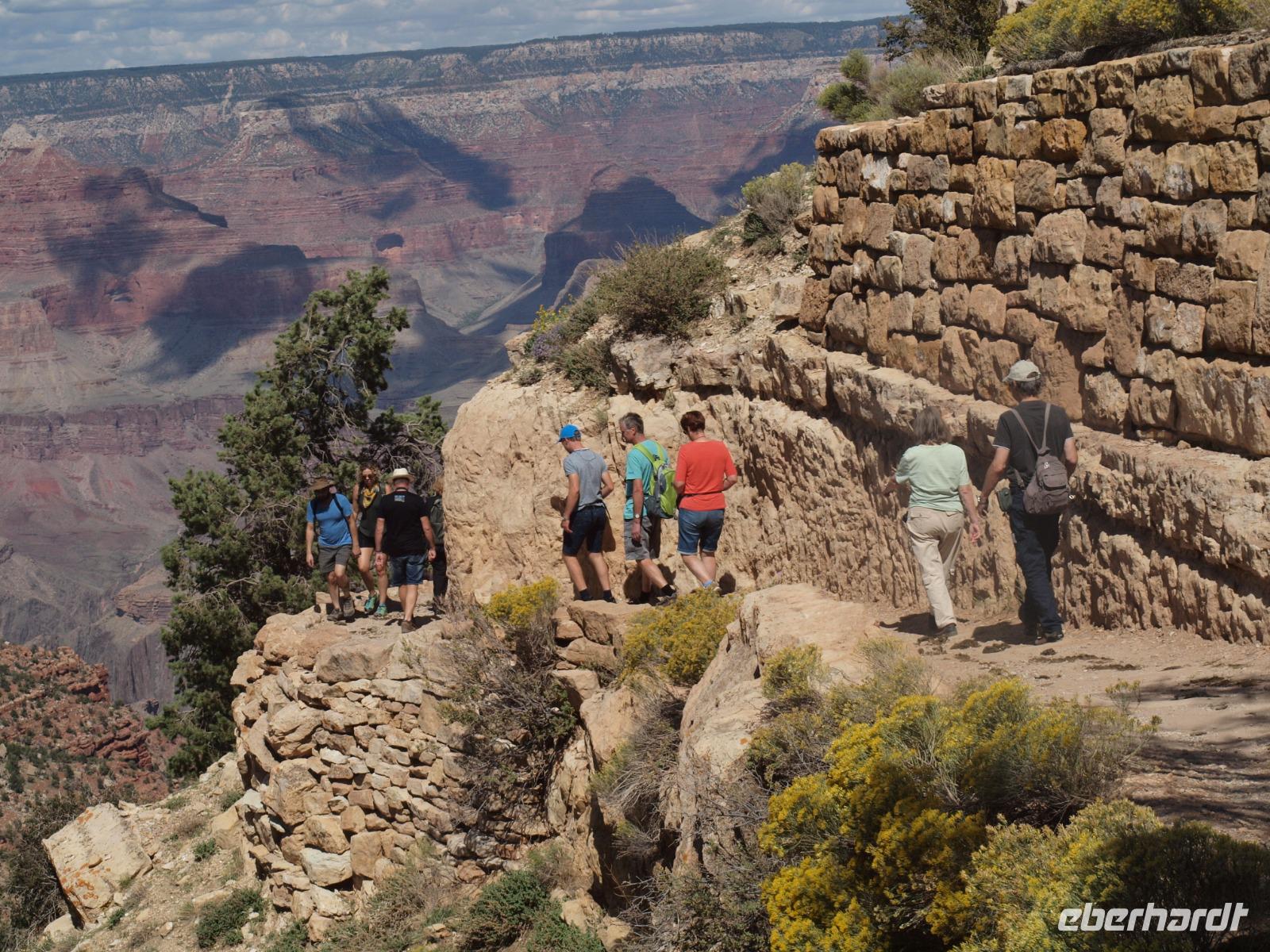 Heute verlassen wir den Bundesstaat Nevada schon wieder und fahren über den Colorado nach Arizona. Es dauert noch ein ganzes Stück, eh wir auf der legendären Route 66 fahren. Im kleinen verrückten Örtchen Seligman haben wir es dann geschafft und machen eine kleine Pause. Hier gibt es einen berühmten, oder besser gesagt DEN berühmten Barber-Shop. Neben Souvenirständen, Kühlschränken, Magneten, anderem Krimskrams und jeder Menge Kleidungsstücke befindet sich auch noch tatsächlich ein kleiner Bereich des Barber-Shops. Heute ist sogar der Besitzer da und bedient höchstpersönlich einen Kunden. Nach unserer Pause und einer Begegnung mit einer Riesenheuschrecke, die erstaunlich schnell in unser Herz gesprungen ist, zieht es uns weiter, immerhin haben wir heute noch ein wundervolles Highlight vor uns. Gegen Mittag erreichen wir die Bright Angel Lodge, das Besucherzentrum am Grand Canyon Nationalpark. Auf direktem Wege hindurch und schon offenbart sich ein einzigartiger Blick in den Canyon hinein. Wir spazieren entlang der Südkante bis zum Bright Angel Trailhead, von hier aus kann man nach Belieben so weit wie man möchte in den Canyon hinunter laufen. Einige unserer Weggefährten machen sich auf den Weg nach ganz unten. Einige von uns aber wollen eher in die andere Richtung, nämlich ganz nach oben. Wir treffen uns alle am Bus wieder und fahren erst einmal zurück nach Tusayan, gleich vor den Toren des Grand Canyon. Hier werden wir heute auch übernachten, aber zuerst lassen wir die Nicht-Flieger am IMAX Kino raus und fahren dann weiter zum Flugplatz. Hier startet unser Kleinflugzeug-Ausflug. Nach einer kurzen Sicherheitseinweisung setzen wir die Kopfhörer auf und werden von stimmungsvoller Musik und interessanten Fakten über den Grand Canyon während des Fluges begleitet. Eine wirklich einzigartige Perspektive, unbeschreiblich. Der Rundflug dauert etwa 40 Minuten und noch völlig beflügelt von den Eindrücken aus der Luft holen wir die anderen wieder ab. Serge und Martina bringen uns zum Abschluss noch zum Mather Point, einem weiteren Aussichtspunkt. So langsam steht die Sonne auch schon etwas tiefer und die Farben wirken noch intensiver als am Mittag. An jeder Ecke sieht es wieder anders fantastisch aus und man könnte ununterbrochen fotografieren. Dennoch wird es langsam Zeit den Nationalpark zu verlassen, auf dem Rückweg begegnen wir aber noch den Wildtieren, wir sehen Elchkühe mit ihren Jungen und das ein oder andere niedliche puschelige Eichhörnchen. Nach der Ankunft in der Lodge machen wir uns fürs Abendessen im Steakhouse fertig, es ist ein ruhiger Abend, der mit dem Besuch der Spätvorstellung im Kino endet, für die, die den Film nicht gesehen haben. Danach heißt es dann aber schnell ins Bett und Kraft tanken für den nächsten Tag.