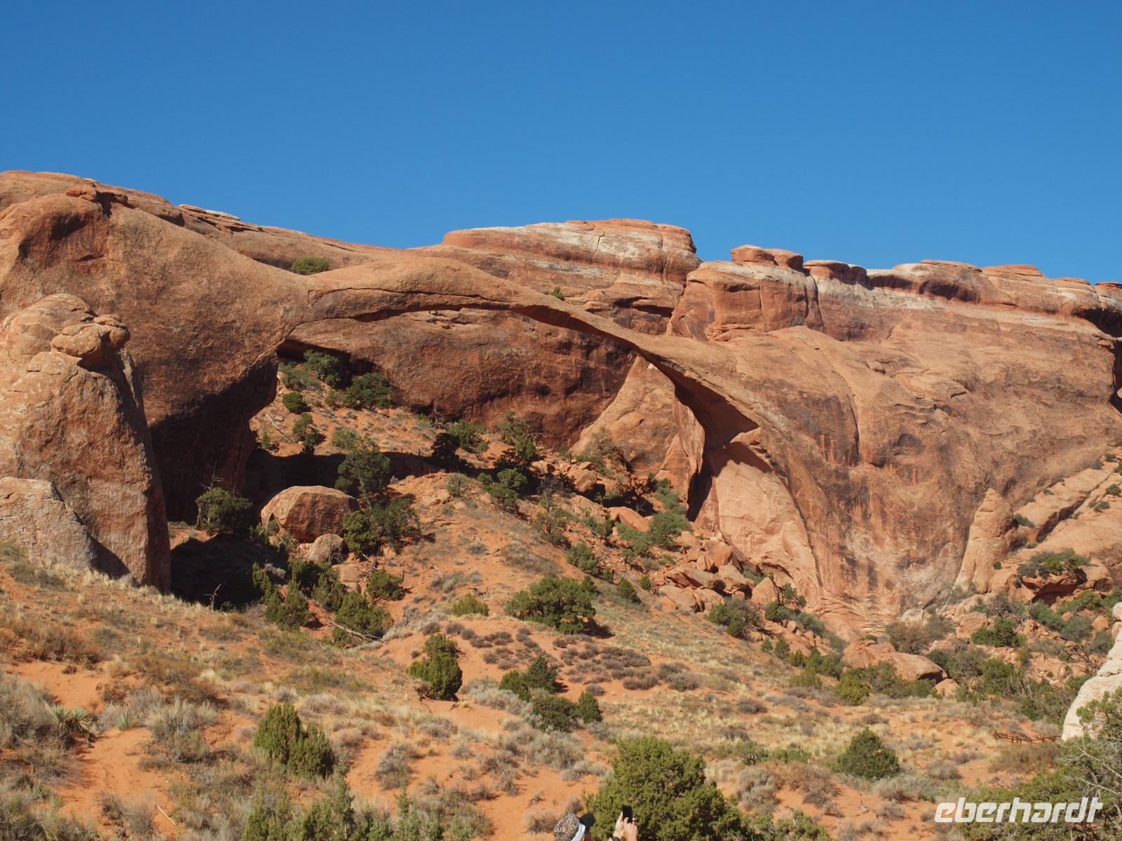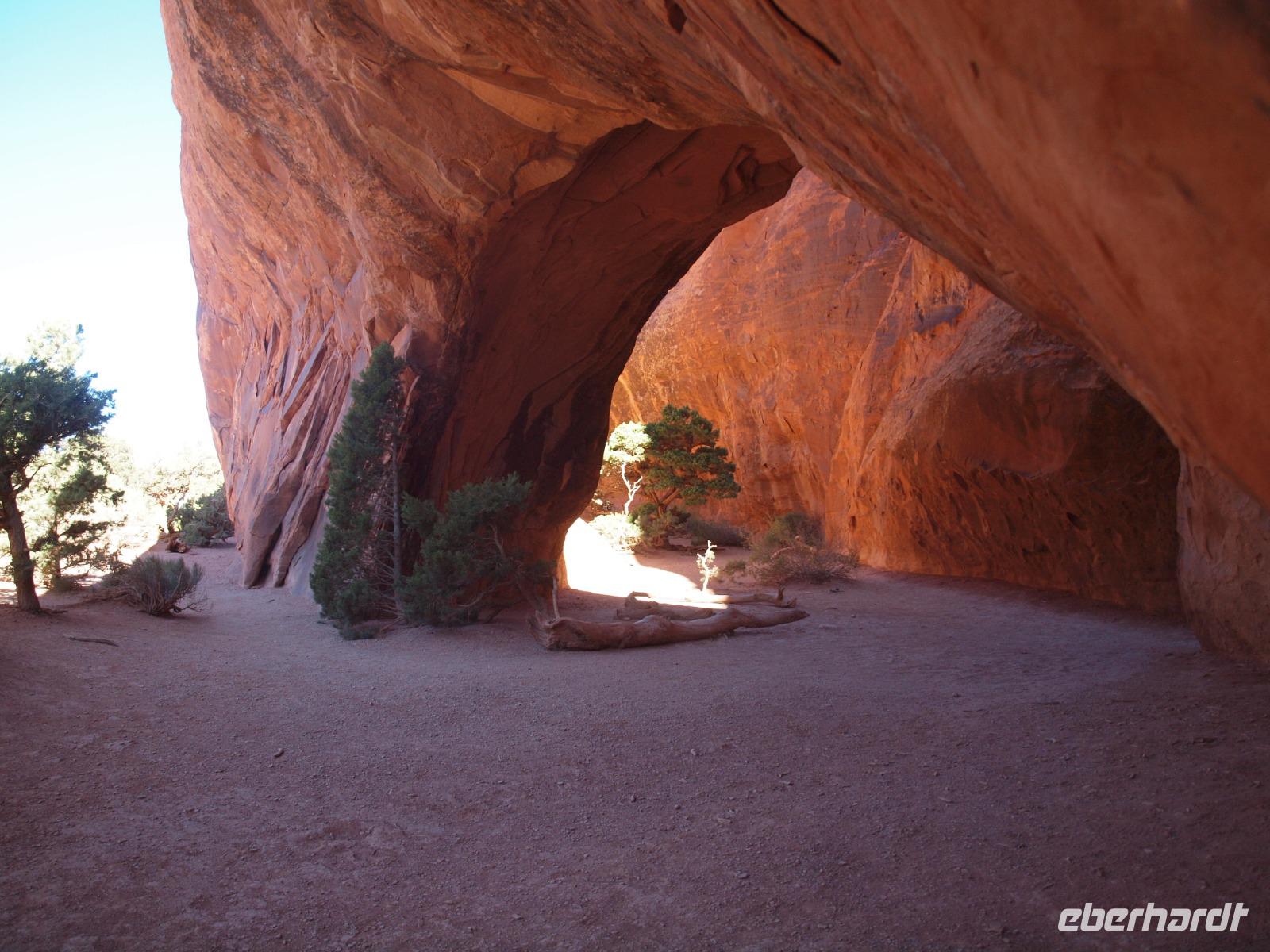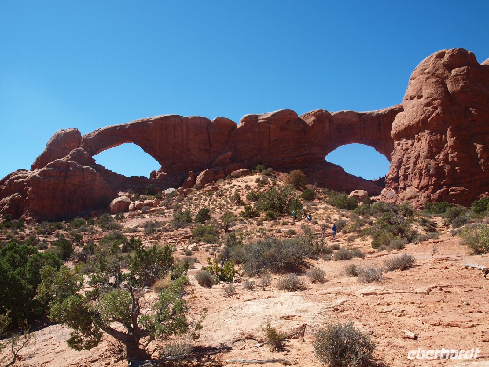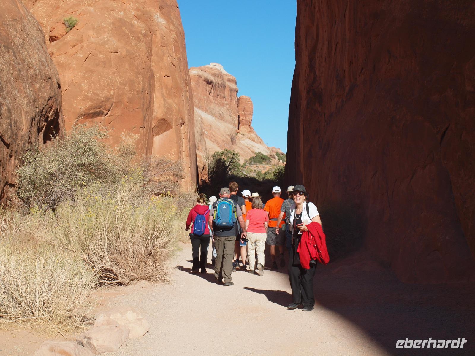 Moab liegt direkt vor den Toren des Arches Nationalparks, also die perfekte Ausgangposition für den heutigen Tag. Den Namen verdankt der Nationalpark der Vielzahl an natürlich vorkommenden Steinbögen, die durch Erosion ständig neu geformt werden. Und genau diese Steinbögen sind heute unsere Hauptattraktion, neben dem Geburtstagskind natürlich. Wir haben heute den ganzen Tag Zeit, diesen Park zu erkunden. Gleich nach dem festlichen Frühstück bringen uns Serge und Martina zum Devils Garden Trailhead. Von hier aus starten wir unsere erste Wanderung mit dem Ziel den Landscape Arch zu sehen. Auf dem Weg dahin biegen kleinere Wege zu anderen Arches ab, wie zum Beispiel zum Tunnel und Pine Tree Arch. Der anfangs recht leicht zu gehende und befestigte breite Weg wird nach einer Weile durch Sand abgelöst, welcher das Laufen natürlich etwas erschwert, aber uns nicht davon abhält weiter zu gehen. Der Landscape Arch hat eine Spannweite von 92 Meter und ist damit einer der größten Steinbögen der Welt. An seiner dünnsten Stelle ist er heute weniger als drei Meter breit. Von hier aus wollen wir gern noch weitere Arches bestaunen und gehen weiter in Richtung „Double O"-Arch. Auf dem weiteren Weg dorthin weicht der Weg mehr und mehr einem Trampelpfad. Wir erreichen eine Stelle, an der sich die Gruppe teilt, einige von uns bleiben zurück und die anderen begeben sich auf Klettertour. Um zum „Double O"-Arch zu gelangen muss man einen steilen Trampelpfad mit wenig Ausweichmöglichkeiten für andere Wanderer folgen. Mit gegenseitiger Hilfe schaffen wir den Aufstieg und können die Landschaft von einer höheren Ebene aus betrachten. Hier müssen wir uns nun aber auch entscheiden welchen der drei Arches wir anschauen wollen, denn ganz dürfen wir auch die Zeit nicht verpassen. Wir entscheiden uns für zwei kürzere Wege zu den nächsten Arches, Partition und Navajo Arch und kehren dann zu unseren lieben Zurückgebliebenen zurück, die sorgfältig People Watching betrieben haben und auf unsere Sachen in der Zeit aufgepasst haben. Am Busparkplatz erwarten uns Serge und Martina bereits und schon sind wir auf dem Weg zum nächsten Highlight, dem Nord- und Südfenster. Hier empfiehlt uns Martina den Weg gegen den Strom zu nehmen und das Ganze von hinten anzufangen, gar keine so schlechte Idee, wenn da nicht die eine oder andere Orientierungslücke wäre. Aber nach ein paar Mal hin und her gehen und Nachfragen bei anderen Orientierungslosen Wanderern finden wir den richtigen Weg. Nach mehreren Fotostopps und wagemutigen Männerausflügen gehen wir zurück zum Busparkplatz. Unser letzter Programmpunkt für heute ist der Dead Horse Point. Dieser liegt bereits außerhalb den Arches Nationalpark und nach ca. einer Stunde fahrt erreichen wir ihn dann auch. Von diesem Punkt hier oben haben wir eine wunderschöne Sicht über die Canyonlands und sehen sogar den Coloradoriver. Einer alten Geschichte nach, sollen Cowboys an diesem Ort ihre Pferde in einem selbstgebauten Gehege zusammengetrieben haben. Die Cowboys verschwanden und kamen wohl nie wieder, denn Jahre später hat man hier oben nur noch die übrig gebliebenen Knochen der Pferde wieder gefunden. Heute sind diese Knochen natürlich nicht mehr zu sehen, im Gegenteil, heute gibt es dort eine große Aussichtsplattform und wie wir selbst sehen können, ist es ein beliebter Ort um zu heiraten.