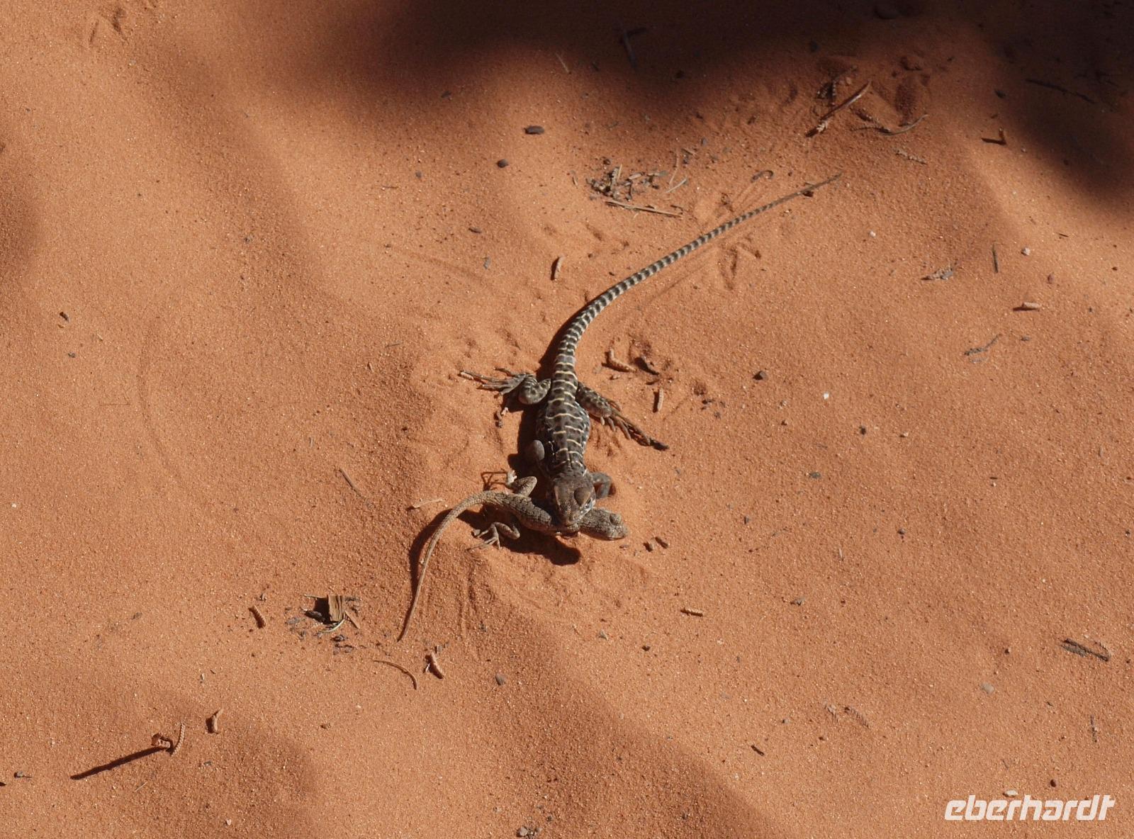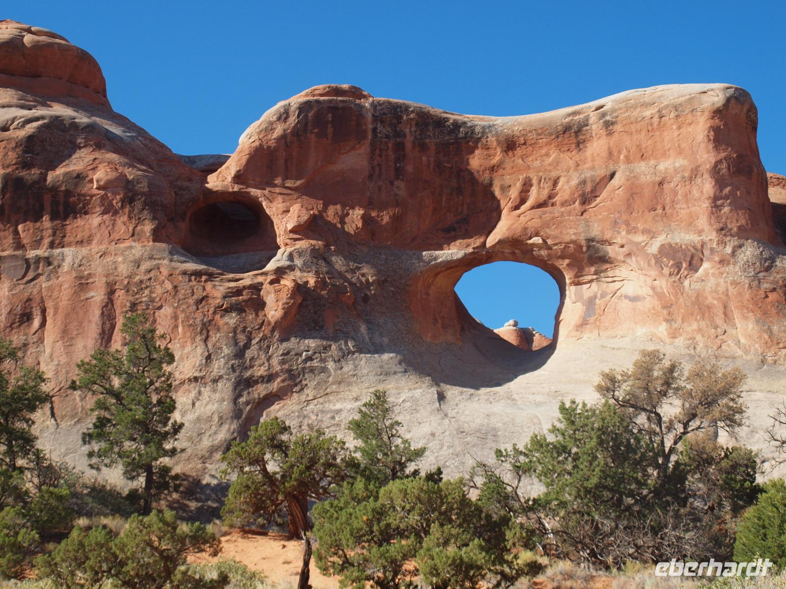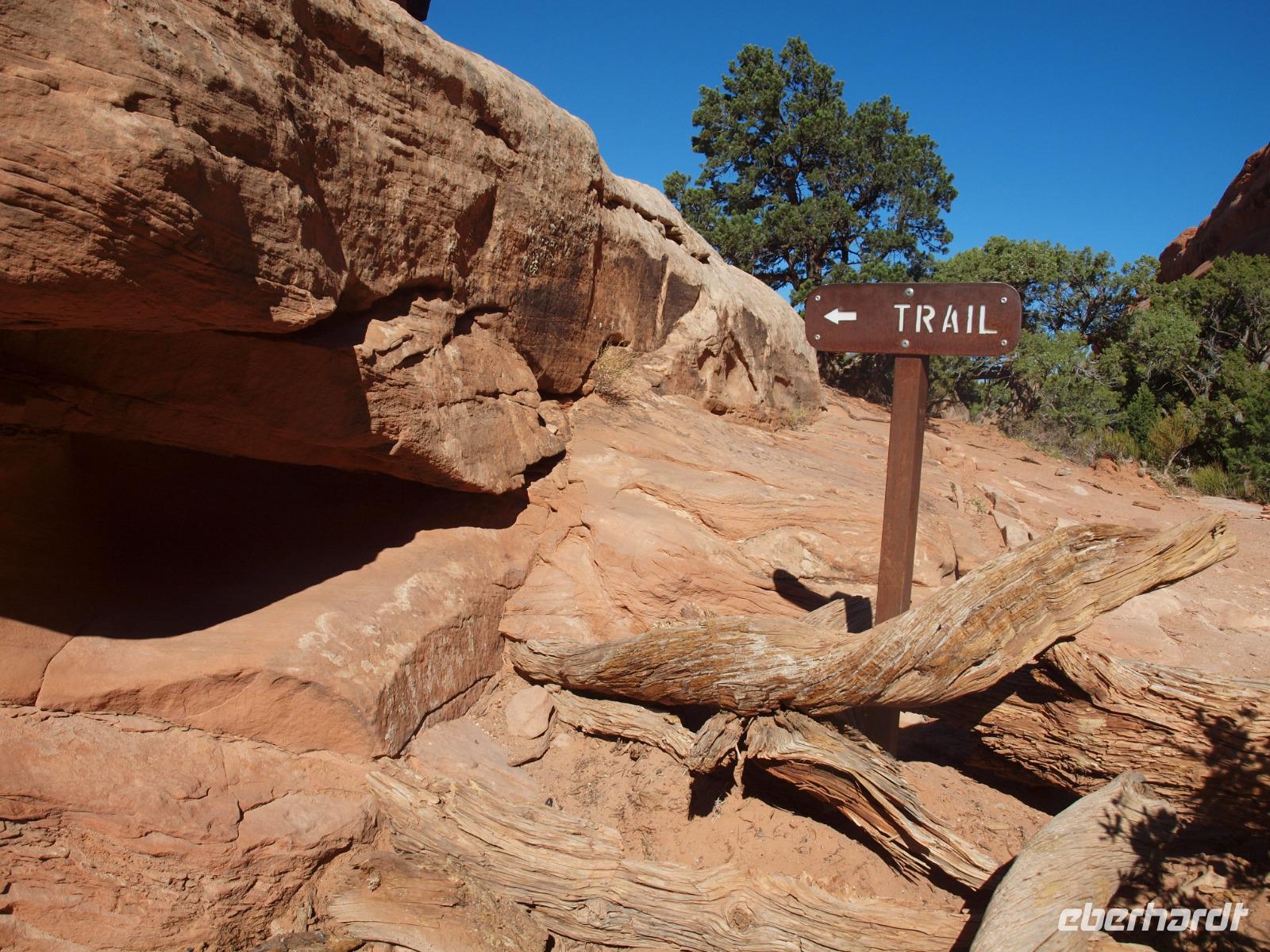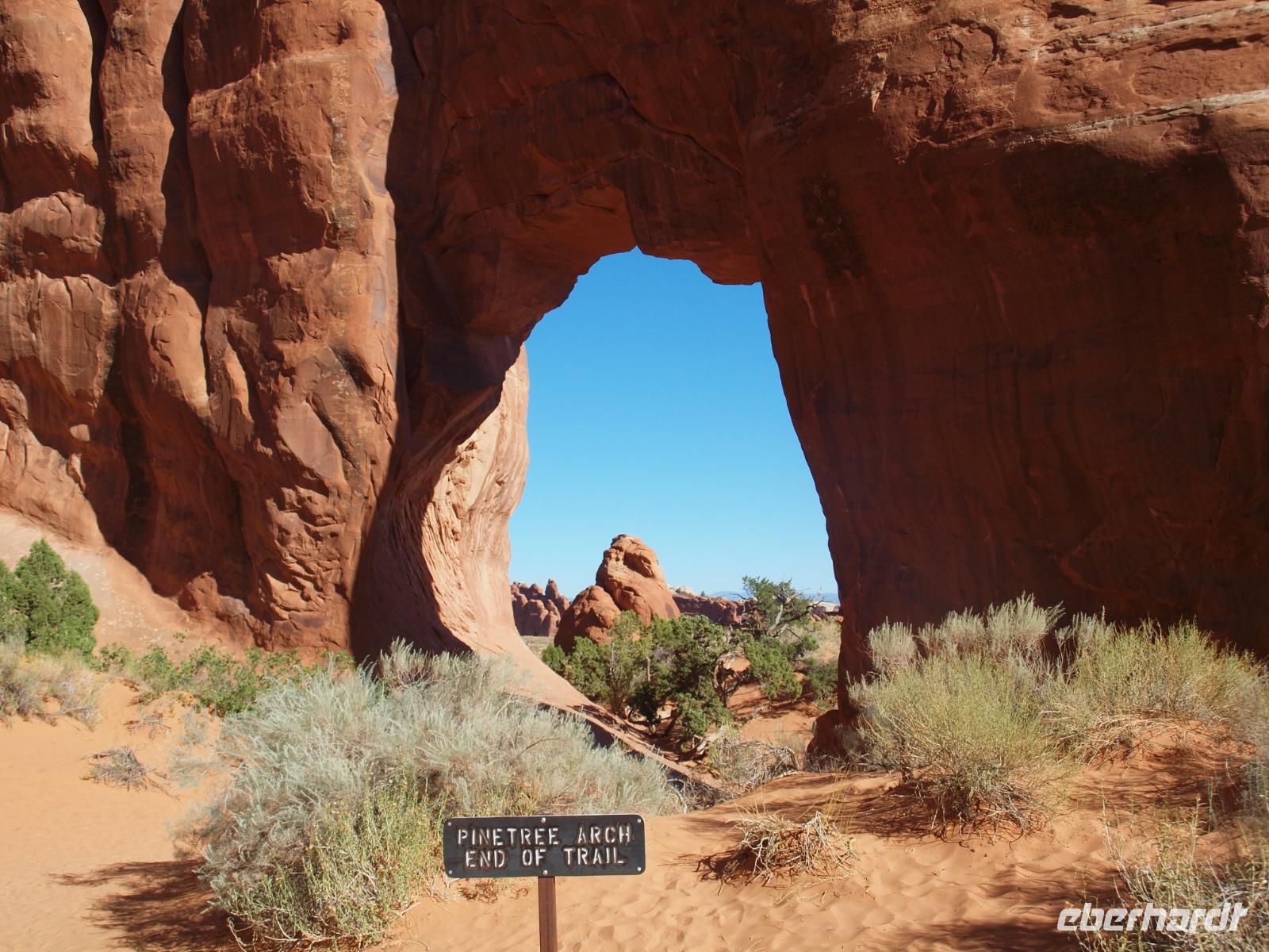 Moab liegt direkt vor den Toren des Arches Nationalparks, also die perfekte Ausgangposition für den heutigen Tag. Den Namen verdankt der Nationalpark der Vielzahl an natürlich vorkommenden Steinbögen, die durch Erosion ständig neu geformt werden. Und genau diese Steinbögen sind heute unsere Hauptattraktion, neben dem Geburtstagskind natürlich. Wir haben heute den ganzen Tag Zeit, diesen Park zu erkunden. Gleich nach dem festlichen Frühstück bringen uns Serge und Martina zum Devils Garden Trailhead. Von hier aus starten wir unsere erste Wanderung mit dem Ziel den Landscape Arch zu sehen. Auf dem Weg dahin biegen kleinere Wege zu anderen Arches ab, wie zum Beispiel zum Tunnel und Pine Tree Arch. Der anfangs recht leicht zu gehende und befestigte breite Weg wird nach einer Weile durch Sand abgelöst, welcher das Laufen natürlich etwas erschwert, aber uns nicht davon abhält weiter zu gehen. Der Landscape Arch hat eine Spannweite von 92 Meter und ist damit einer der größten Steinbögen der Welt. An seiner dünnsten Stelle ist er heute weniger als drei Meter breit. Von hier aus wollen wir gern noch weitere Arches bestaunen und gehen weiter in Richtung „Double O"-Arch. Auf dem weiteren Weg dorthin weicht der Weg mehr und mehr einem Trampelpfad. Wir erreichen eine Stelle, an der sich die Gruppe teilt, einige von uns bleiben zurück und die anderen begeben sich auf Klettertour. Um zum „Double O"-Arch zu gelangen muss man einen steilen Trampelpfad mit wenig Ausweichmöglichkeiten für andere Wanderer folgen. Mit gegenseitiger Hilfe schaffen wir den Aufstieg und können die Landschaft von einer höheren Ebene aus betrachten. Hier müssen wir uns nun aber auch entscheiden welchen der drei Arches wir anschauen wollen, denn ganz dürfen wir auch die Zeit nicht verpassen. Wir entscheiden uns für zwei kürzere Wege zu den nächsten Arches, Partition und Navajo Arch und kehren dann zu unseren lieben Zurückgebliebenen zurück, die sorgfältig People Watching betrieben haben und auf unsere Sachen in der Zeit aufgepasst haben. Am Busparkplatz erwarten uns Serge und Martina bereits und schon sind wir auf dem Weg zum nächsten Highlight, dem Nord- und Südfenster. Hier empfiehlt uns Martina den Weg gegen den Strom zu nehmen und das Ganze von hinten anzufangen, gar keine so schlechte Idee, wenn da nicht die eine oder andere Orientierungslücke wäre. Aber nach ein paar Mal hin und her gehen und Nachfragen bei anderen Orientierungslosen Wanderern finden wir den richtigen Weg. Nach mehreren Fotostopps und wagemutigen Männerausflügen gehen wir zurück zum Busparkplatz. Unser letzter Programmpunkt für heute ist der Dead Horse Point. Dieser liegt bereits außerhalb den Arches Nationalpark und nach ca. einer Stunde fahrt erreichen wir ihn dann auch. Von diesem Punkt hier oben haben wir eine wunderschöne Sicht über die Canyonlands und sehen sogar den Coloradoriver. Einer alten Geschichte nach, sollen Cowboys an diesem Ort ihre Pferde in einem selbstgebauten Gehege zusammengetrieben haben. Die Cowboys verschwanden und kamen wohl nie wieder, denn Jahre später hat man hier oben nur noch die übrig gebliebenen Knochen der Pferde wieder gefunden. Heute sind diese Knochen natürlich nicht mehr zu sehen, im Gegenteil, heute gibt es dort eine große Aussichtsplattform und wie wir selbst sehen können, ist es ein beliebter Ort um zu heiraten.