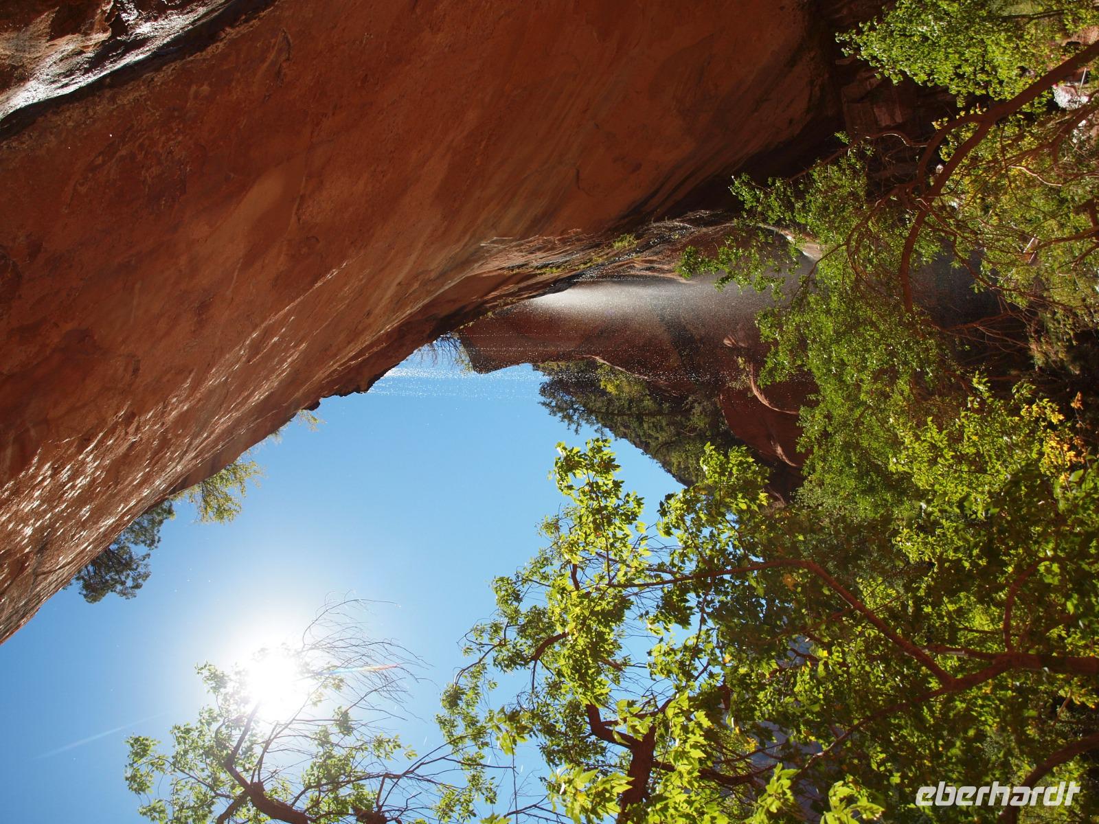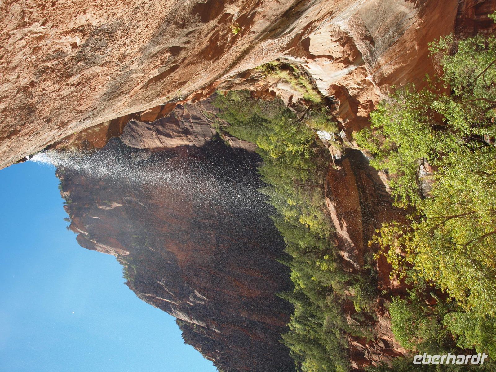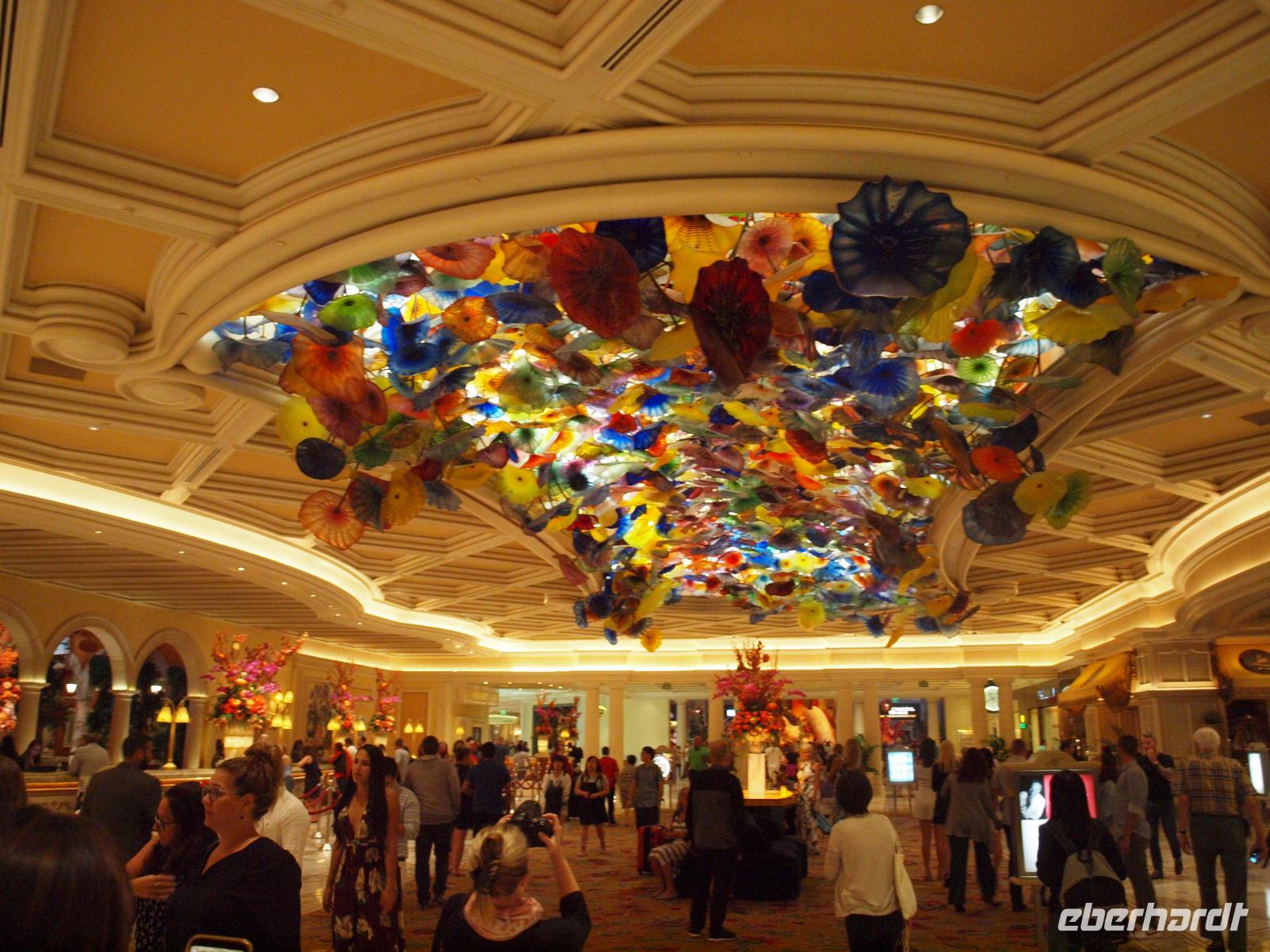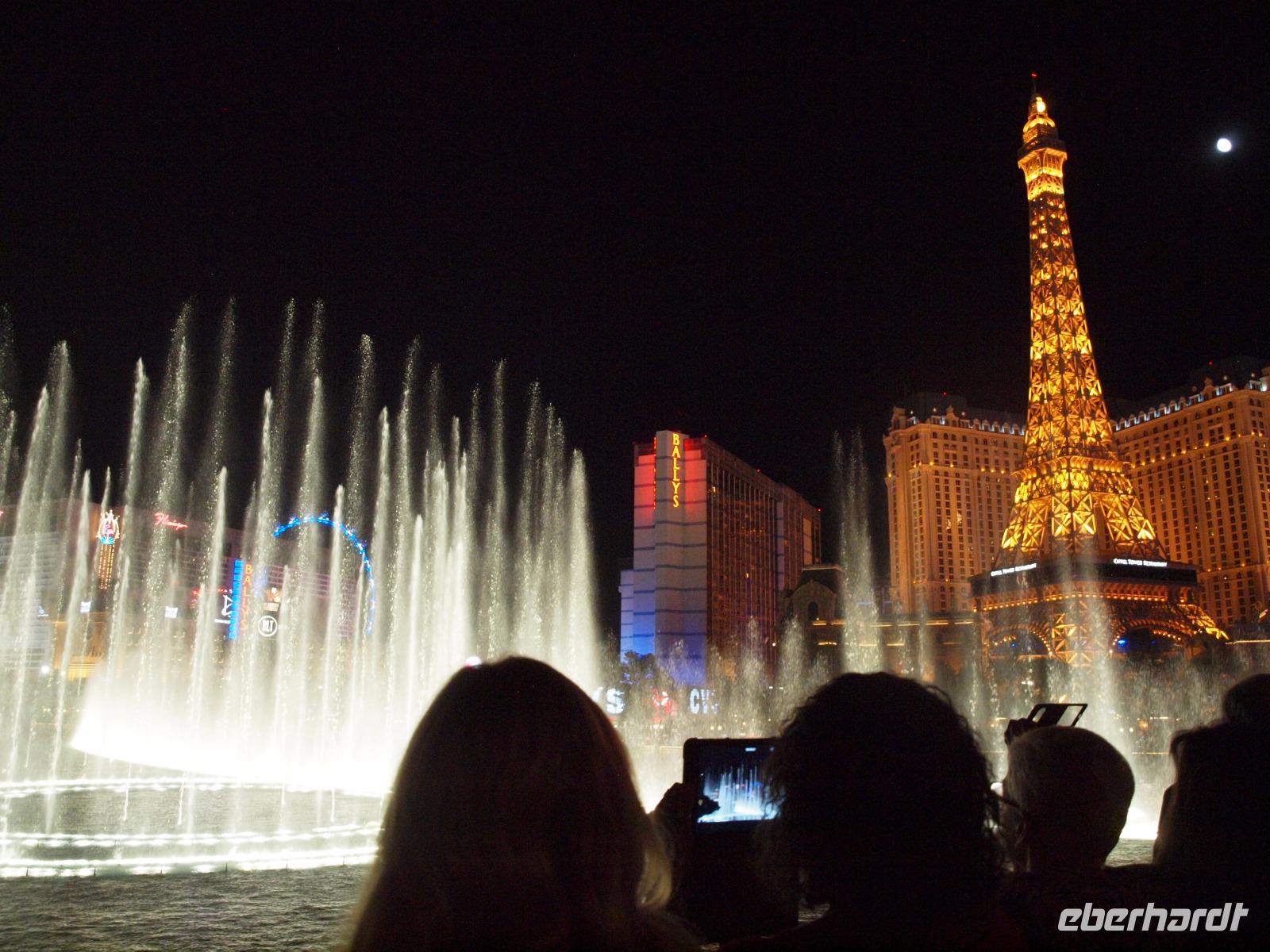 Am frühen Morgen fängt der Vogel auch heute wieder den Wurm. Nach ca. zwei Stunden Fahrt und einer packenden Cowboy-Geschichte über Hundefleisch Jack, erreichen wir den Zion Nationalpark. Im Nationalpark befinden sich zahlreiche Canyons, Zion ist im Übrigen ein hebräisches Wort und bedeutet Zufluchtsort. Die Mormonen haben dieses Wort oft genutzt, denn immerhin waren sie es, die Jahre lang von ihren Siedlungen vertrieben wurden und lange Zeit auf der Suche nach Zion, ihrem Zufluchtsort waren. Wir unternehmen im Park einen kleinen Spaziergang zu den Emerald Pools. Es ist zwar recht trocken überall, aber erstaunlicher Weise gibt es hier trotzdem einen Wasserfall, der den Weg am Ende etwas nass werden lässt. Nach dieser kleinen, unfreiwilligen Dusche kehren wir wieder zurück zur Zion Lodge, bummeln noch etwas durch den Souvenir Laden und dann fahren wir weiter in Richtung Las Vegas. Unterwegs lauschen wir Martinas Geschichten über die Banditen Jesse James und Billy the Kid. Und so vergeht die Zeit wie im Fluge bis wir Las Vegas erreichen. Wir erkunden noch „kurz" das Hotel, damit wir uns auch nicht verlaufen, beziehen unsere Zimmer und treffen uns vor dem frühen Abendessen zum Anstoßen auf dem Zimmer, denn Gründe haben wir heute genug, nicht wahr? Nach dem Abendessen geht dann auch schon unsere Lichterfahrt durch Vegas los. Unser erster Stopp ist das Venetian Resort Hotel. Dieses Hotel ist komplett der italienischen Stadt Venedig nachempfunden. Man kann hier sogar mit den typischen Gondeln in den Kanälen fahren. Die Decke wurde so nachgebildet, dass es scheint man sei draußen unter freiem Himmel. Viele Geschäfte locken mit Angeboten und Leckereien. Weiter die Fahrt zur Fremont Street, hier erwartet uns ein buntes Treiben unterschiedlicher Menschen, Straßenkünstler, Musiker, Feuerwehrmänner, Schönheiten aus dem alten Ägypten und natürlich jede Menge Touristen. Um 20 Uhr erleben wir noch eine kleine Show mit bevor wir uns auf den Weg zum Bellagio machen. Dieses Luxushotel zählt zu den größten weltweit, natürlich auch mit einer entsprechenden Vielzahl an Casinos. Wir interessieren uns allerdings vorrangig für die Wassershow vor dem Hotel. In dem See vor dem Hotel schießen einige der Düsen unter Wasser über 140 Meter hohe Wasserfontänen in die Höhe, andere Düsen sind beweglich und können ihren Wasserstrahl passend zur Hintergrundmusik „tanzen" lassen. Unser Abendprogramm endet mit den Fontänen und Martina bringt die Meisten von uns wieder zurück ins Hotel. Eine kleine Gruppe allerdings stürzt sich noch etwas ins Nachtleben, bevor es ins hoteleigene Spielcasino im Luxor um ein paar Dollar geht.