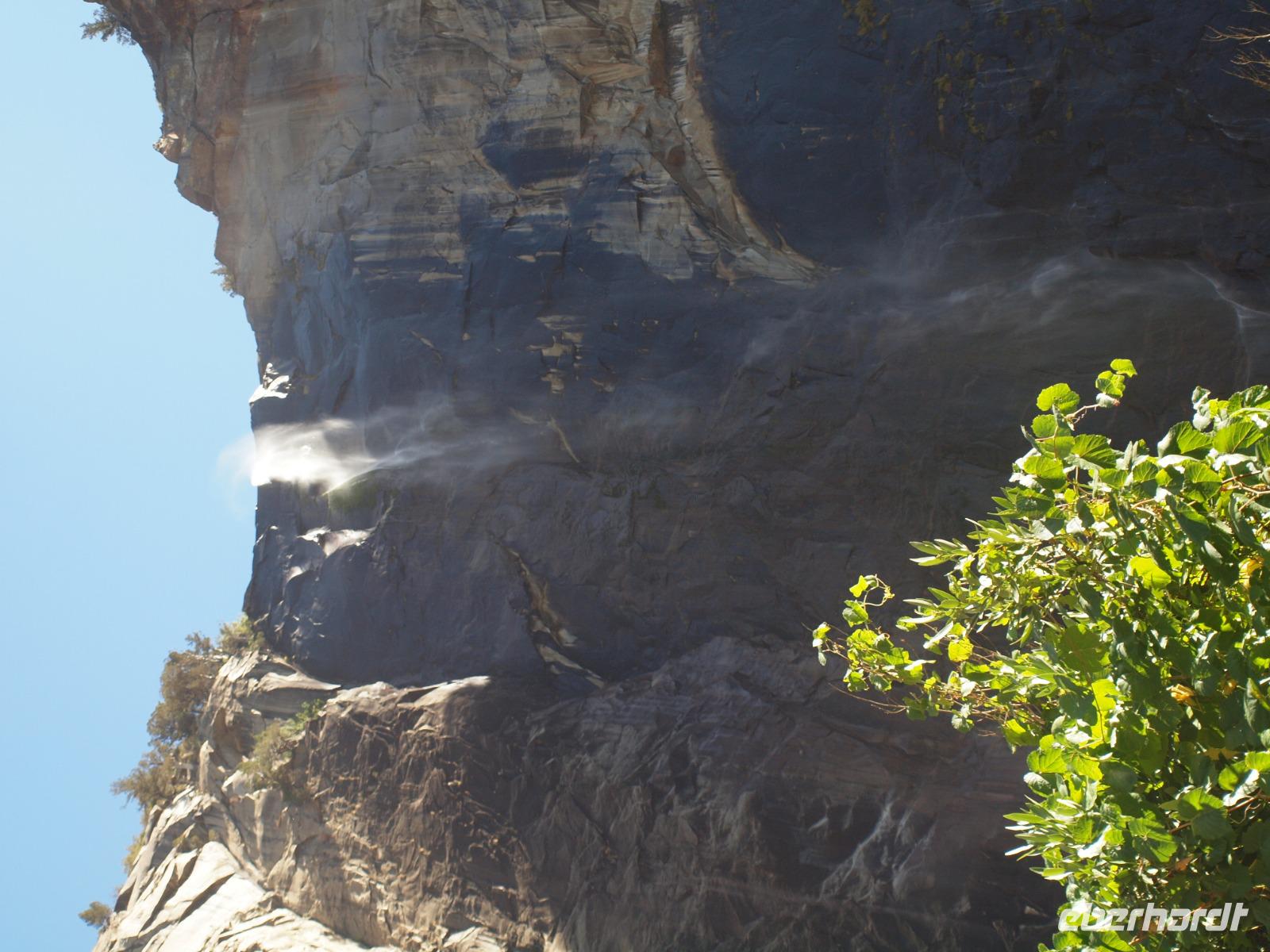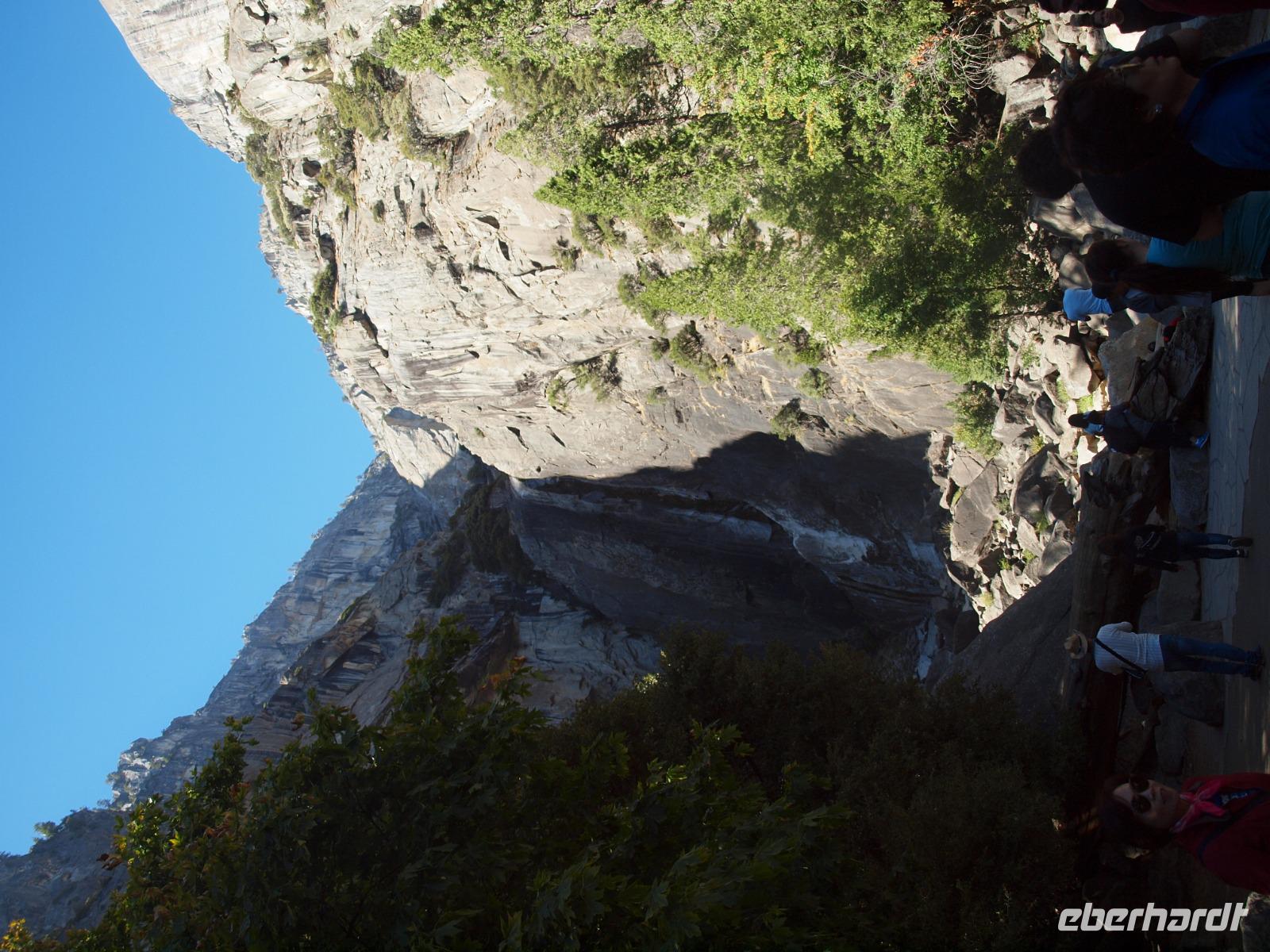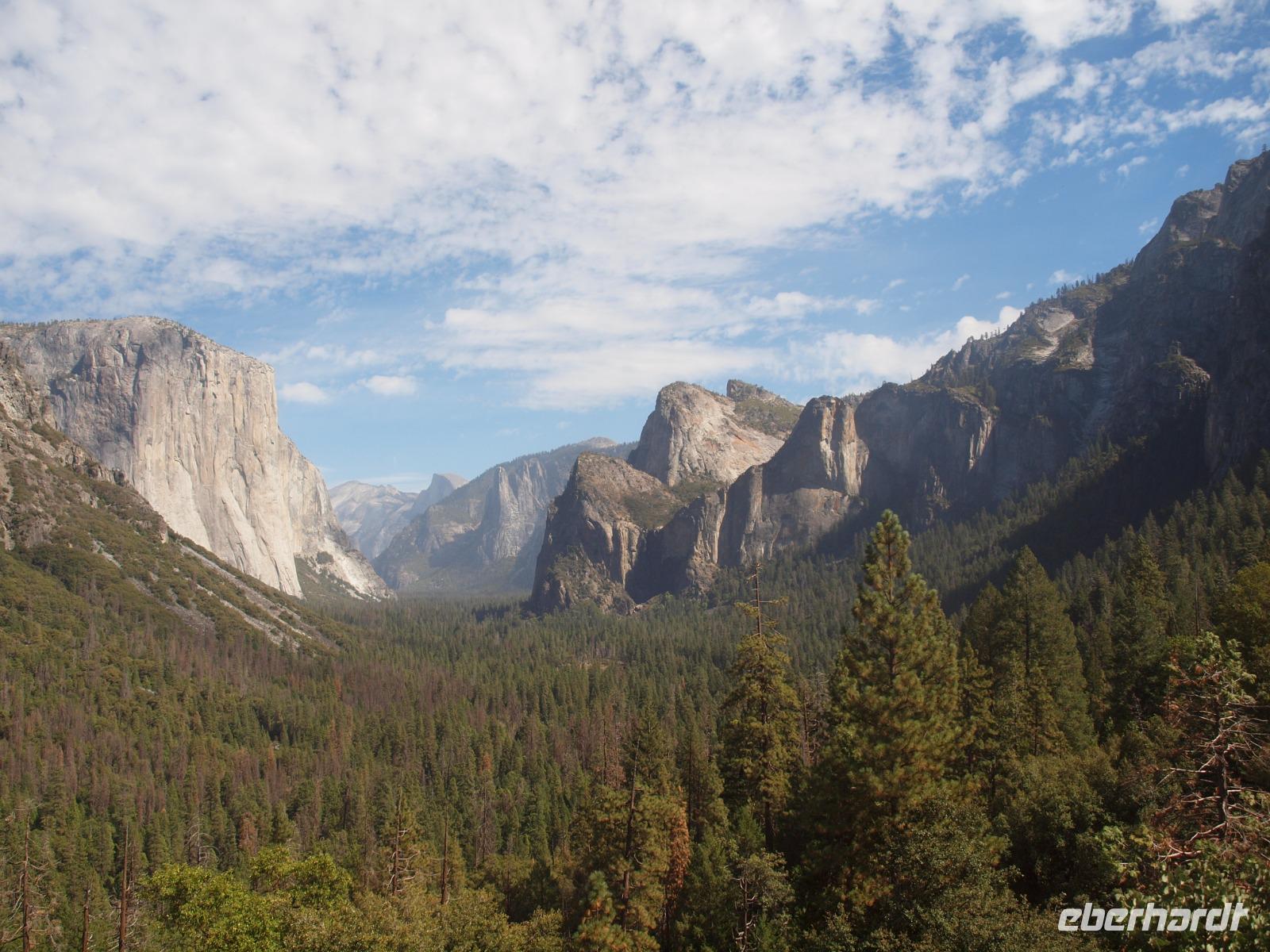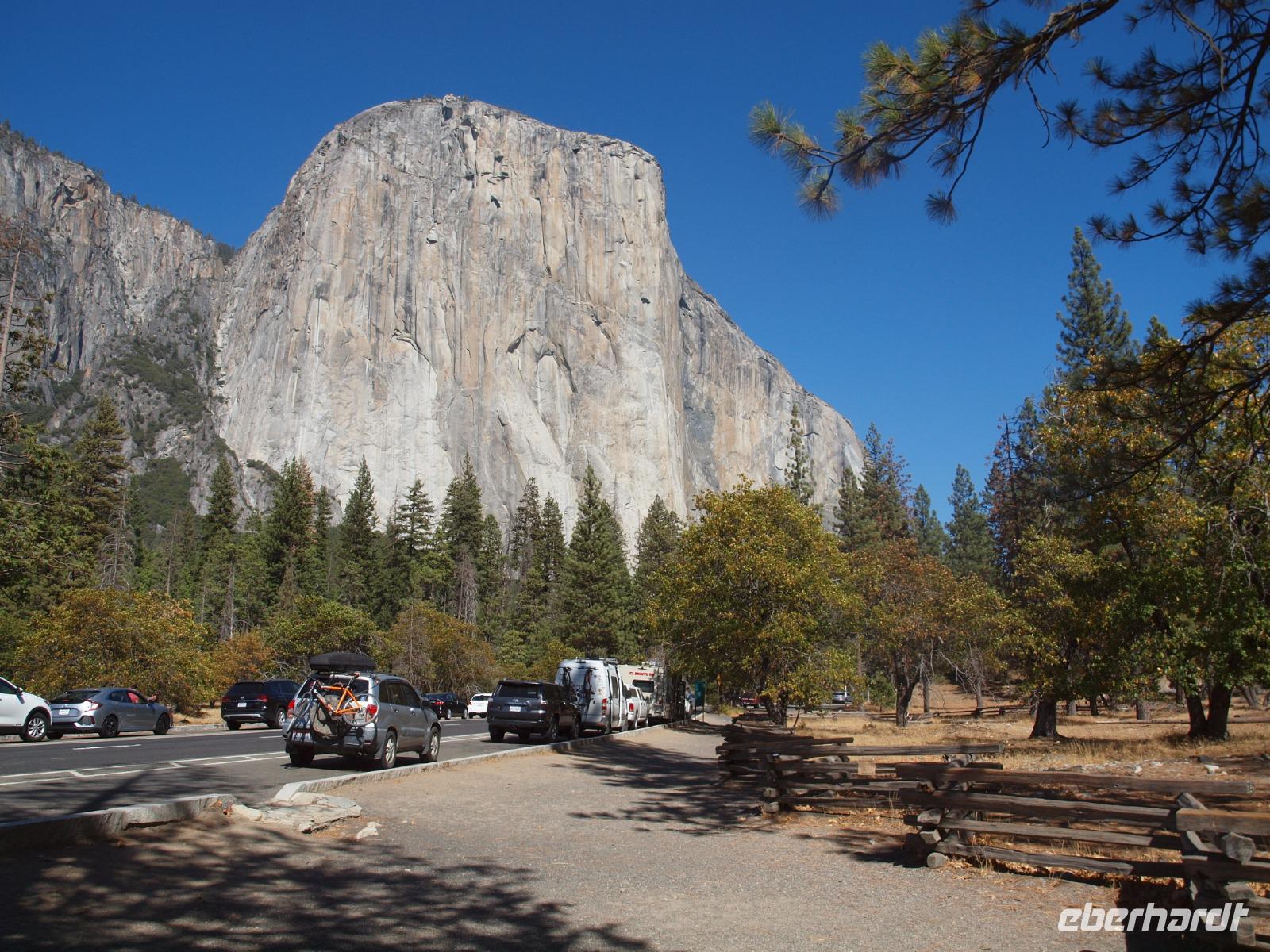 Der Yosemite Nationalpark zieht jährlich ca. 3 Millionen Besucher an, dieses Jahr zählen auch wir dazu. Von Bakersfield aus fahren wir so früh wie möglich los. Unterwegs wird noch alles für ein umfangreiches Picknick eingekauft und dann erreichen wir um die Mittagszeit den Park des großen Bären. Gleich zu Beginn in Wawona richten wir alles für unser Picknick her. Mit Sandwiches, Obst, kleinen Leckereien, Saft, Bier und Wein stärken wir uns bevor wir weiter in den Park hinein fahren. Auf dem Weg zu den Brautschleier-Wasserfällen halten wir an einem Aussichtspunkt mit Blick auf den El Capitan und Half Dome, zwei riesige Granitfelsen die sich über dem Yosemite-Tal auftürmen. Leider merkt man die Trockenheit auch in diesem Park, die sonst so wasserreichen Flüsse und Wasserfälle sind ausgetrocknet oder führen nur noch wenig Wasser. Weiter drinnen im Park sieht man auch noch die Spuren der letzten großen Waldbrände aus diesem Jahr. Der kleine Spaziergang zu den Bridal-Falls zeigt uns schon wie beliebt dieser Park ist und das nicht nur bei den Amerikanern...