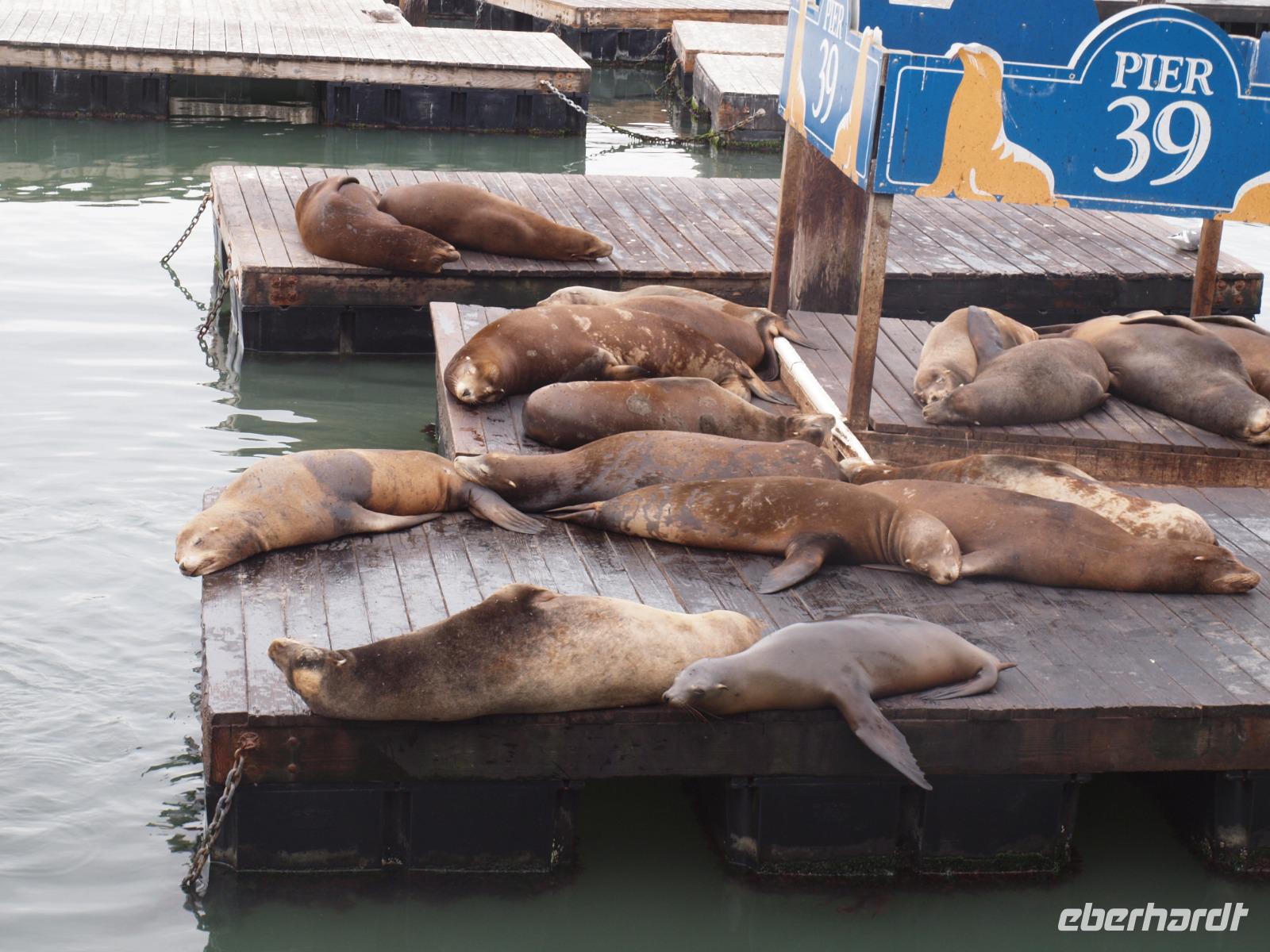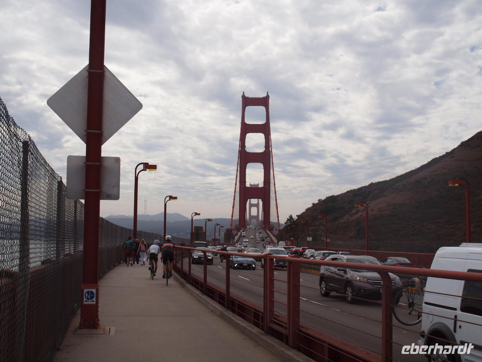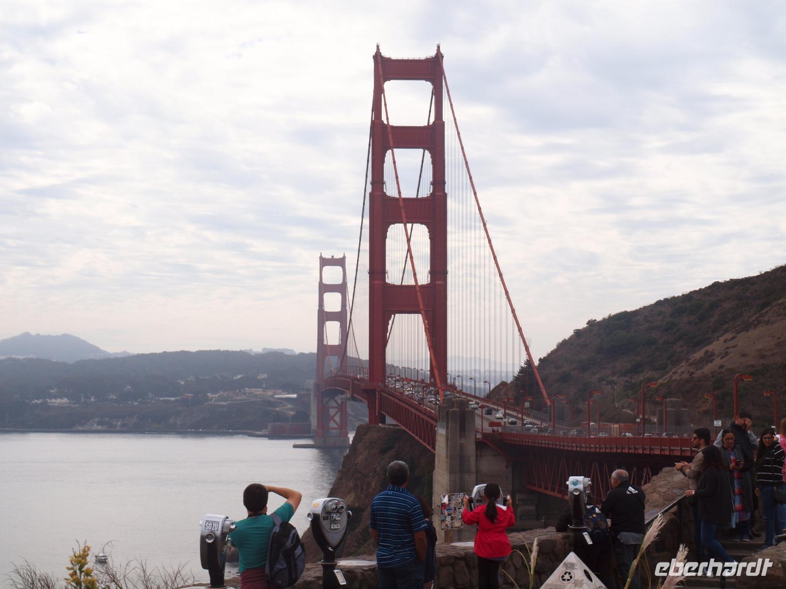 Nach dem Frühstück fahren wir nach Vallejo zur Fähre. Und da wir ganz flott sind, schaffen wir sogar noch eine Verbindung früher, als ursprünglich geplant. Dadurch sind wir natürlich auch wesentlich eher in San Francisco, was uns sehr entgegen kommt. Wir beginnen mit einer kleinen Pause im Hafengebäude, in der Zwischenzeit hat Serge die Stadt auch bereits erreicht und holt uns ab, um uns dann wieder am Pier 39, an der Fisherman's Wharf abzusetzen. Hier statten wir zuerst den Seehunden einen Besuch ab und treffen uns nach einem kurzen Bummel durch die Geschäfte wieder. Nächster Stopp ist die Golden Gate Brücke. Am Lime Point angekommen und nach einem Fotostopp begeben wir uns auf den Weg, die Brücke zu überqueren. Die knapp 2,7km sind zwar sehr laut und auch nicht unbedingt ungefährlich aufgrund der Radfahrer, dennoch aber ein Erlebnis. Und das vor allem, da wir die Brücke ohne Nebelschwaden sehen können. Unser nächster Stopp ist die Lombard Straße, die angeblich kurvenreichste Straße der Welt, aber nicht steilste Straße der Welt... denn die ist wo? Ja, richtig, in Neuseeland ;-)