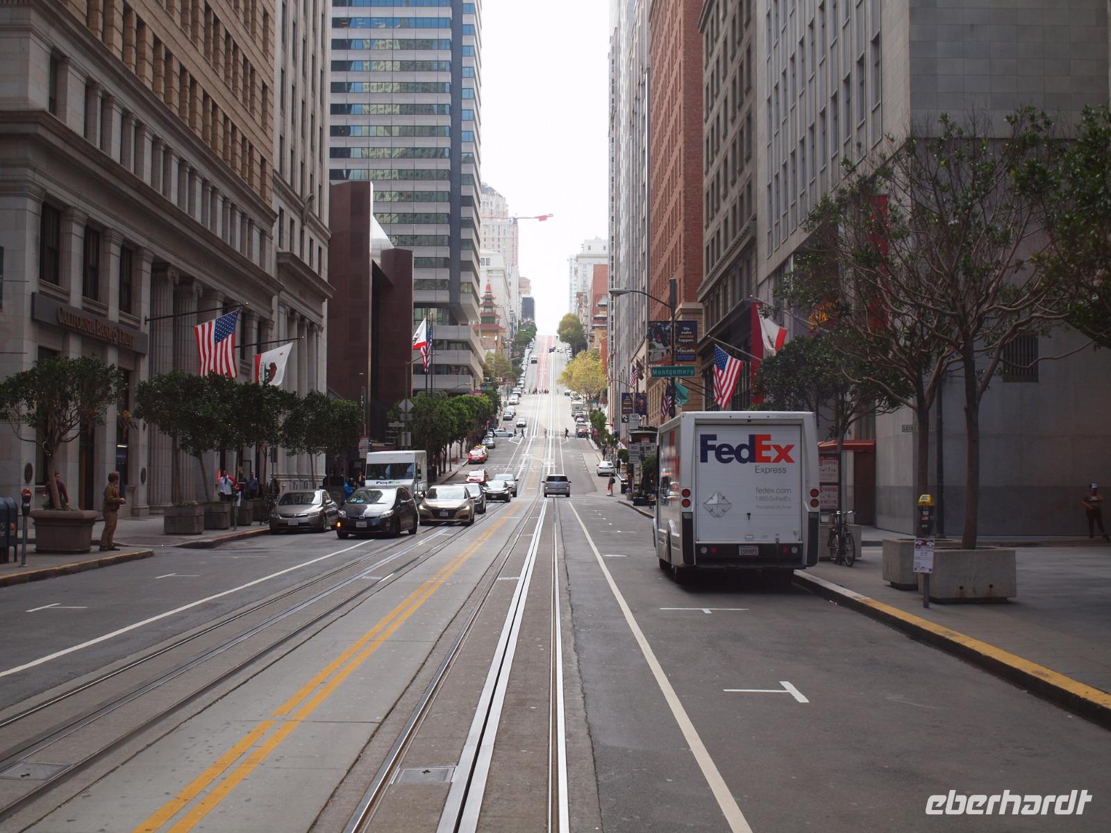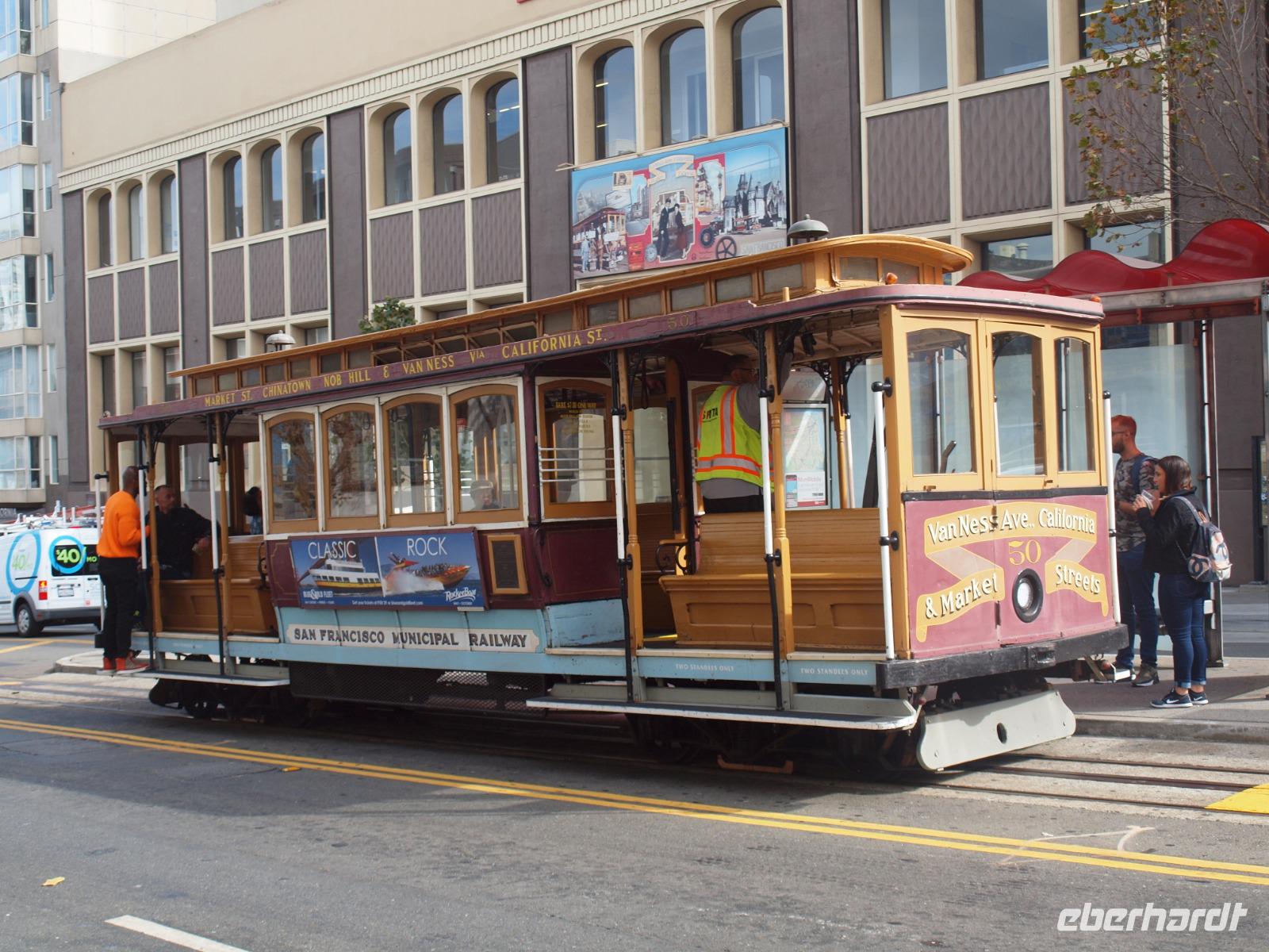Nach diesem kleinen Berg geht es weiter mit unserer Stadtrundfahrt. Zurück an der Fisherman's Wharf legen wir eine kurze Pause für einen Mittagsimbiss ein bevor wir uns zur Abfahrtsstelle der traditionellen Cable Car begeben. Gut, dass Martina genau weiß, wo der Startpunkt ist und somit sind wir auch die ersten in der Schlange. Direkt neben unserem Hotel endet die Fahrt mit der Cable Car, aber unsere Stadtbesichtigung ist noch lange nicht vorbei. Serge steht bereits wieder in den Startlöchern um uns durch die Straßen von San Francisco zu manövrieren. Die Twin Peaks, zwei bekannte Hügel von denen wir eine tolle Sicht über die ganze Stadt haben. Mit einem letzten Stopp im Golden Gate Park beenden wir dann unsere Stadtrundfahrt und fahren zurück ins Hotel. Unseren letzten Abend verbringen wir gemeinsam im Restaurant Hana Zen am Pier 39 mit einem köstlichen Abschlussessen. Um dem ganzen Abend noch eine besondere Note zu verleihen, soll eine Limousine auf uns am Ende des Piers warten. Wir sehen allerdings erst einmal nur junge Marine Offiziere, die sich optimal als Fotomotiv eignen. Wenig später kommt dann auch unsere Limo endlich an. Stilecht mit Champagner beginnt unsere Lichterfahrt. Von Treasure Island aus haben wir einen tollen Blick auf die funkelnde Skyline. Nach einem weiteren Stopp an der Promenade bringt uns der Chauffeur dann auch zum Hotel. Ein fabelhafter Abend geht zu Ende und wird uns mit vielen tollen Bildern in Erinnerung bleiben.