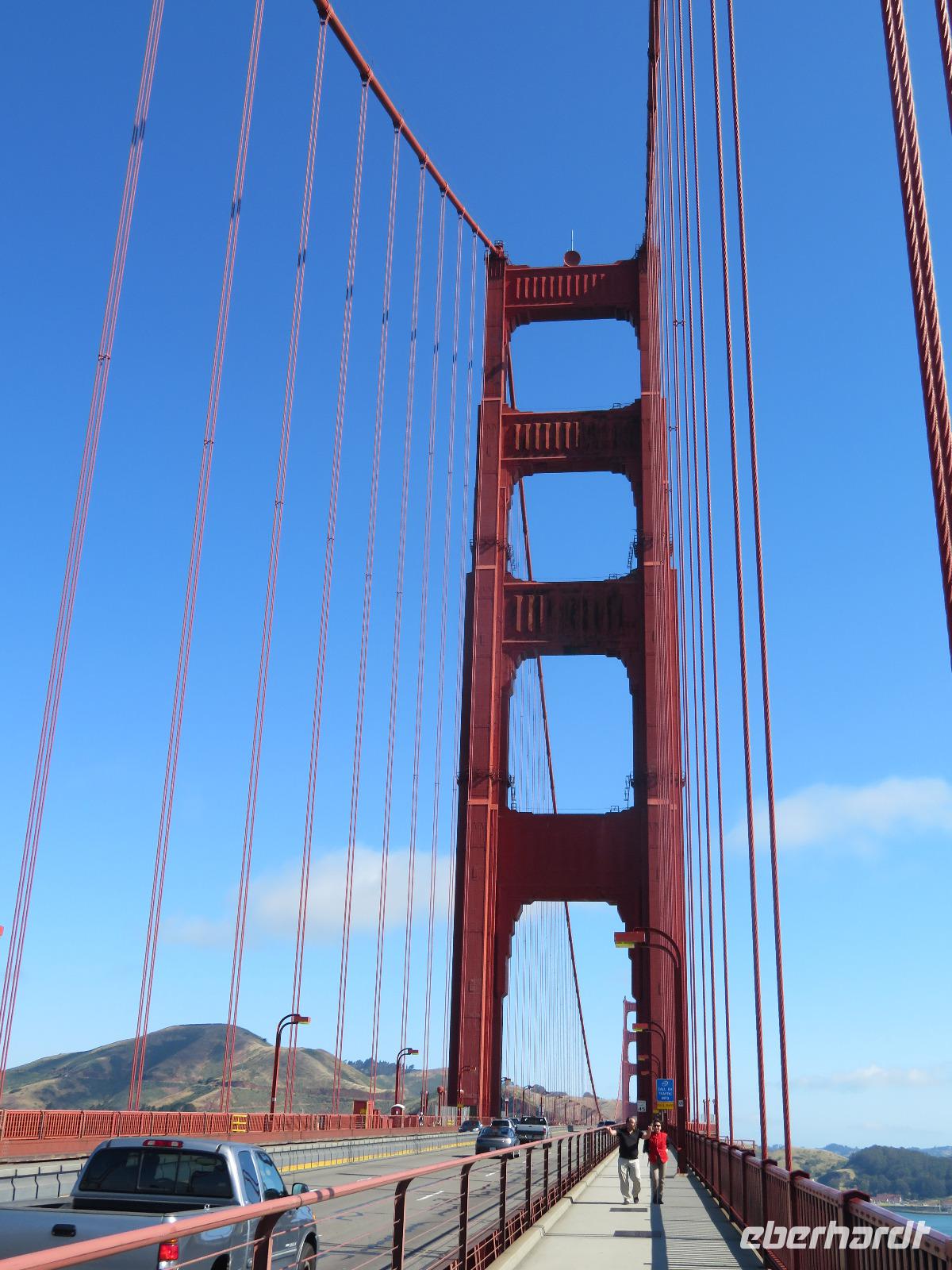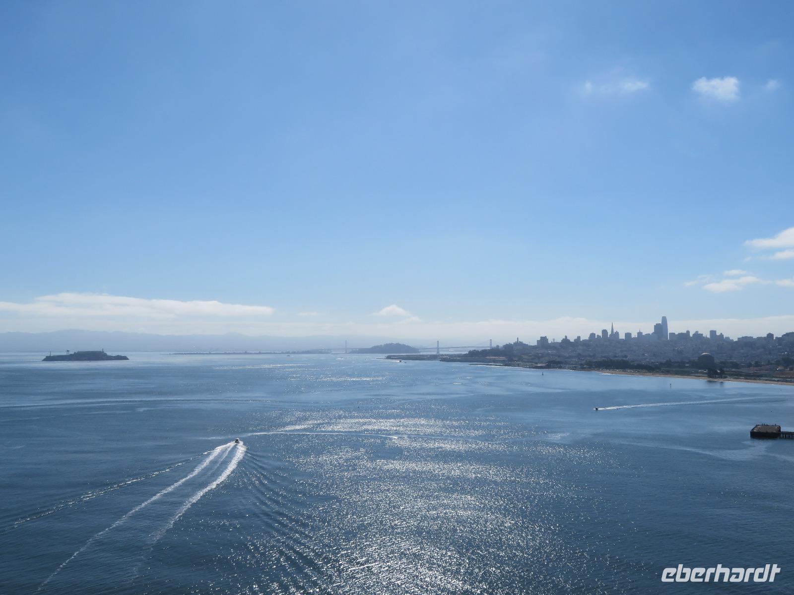 Aufgrund der Wettervorhersagen starteten wir gleich als erstes zur Golden Gate Bridge. Da sich für den Vormittag die Sonne angekündigt hatte, wollten wir dies nutzen und bei strahlendem Wetter die Brücke besuchen. Wir kamen an dem Aussichtspunkt an und hatten Glück. Die Sicht auf die Golden Gate Bridge war klar und einfach umwerfend. Einige der Gäste und die Reisebegleitung nutzten die Gunst der Stunde und machten sich zu Fuß auf den Weg zur anderen Seite. In ca. 45 Minuten waren die knapp 3 km überwunden und am Aussichtspunkt auf der anderen Seite der Bay trafen sich alle wieder und schossen noch einige Fotos von dieser Seite. Anschließend fuhren wir zum kleinen Örtchen Sausalito im Norden von San Francisco. Hier hatten wir die Möglichkeit ein kleines Hausboot des ehemaligen Fischerörtchens zu besuchen, da unsere Reiseleiterin einen der Besitzer kannte. Nach einer kurzen Mittagspause und einem Bummel entlang der Stadtpromenade trafen wir uns am Fährterminal von Sausalito und fuhren zurück nach San Francisco. Während der Überfahrt bot sich uns ein weiterer toller Blick auf die Golden Gate Bridge und die Insel, auf der das ehemalige Gefängnis Alcatraz liegt. Nach der Ankunft am Ferry Building von San Francisco starteten wir zu Fuß die weitere Erkundung der Stadt. Ein kleiner Fußmarsch führte uns zu einer nahegelegenen Station der berühmten Cable Car von San Francisco. Hier fuhren wir bergauf in Richtung unseres Hotels. Der Fahrer der Cable Car machte die Fahrt durch freundliche und nette Unterhaltung zu einem sehr schönen Erlebnis. Später sammelte uns unser Busfahrer ein und brachte uns zu den Twin Peaks, einem Aussichtspunkt von dem man einen einmaligen Blick über die gesamte Stadt, die Golden Gate sowie die Oakland Bay Bridge hat. Unser Abendessen mit Blick auf die San Francisco Bay, direkt am Pier 39 rundete diesen eindrucksvollen Tag ab. Doch er sollte hier noch nicht enden. Da sich alle Gäste für die Nachttour entschieden hatten, fuhren wir noch alle gemeinsam auf die Insel „Treasure Island" welche sich auf halber Strecke zwischen San Francisco und Oakland befindet. Von dieser Insel aus hatten wir einen wundervollen Blick auf die nun beleuchtete Skyline und die Oakland Bay Bridge bei Nacht. Ein toller Abschluss für unsere Zeit in der kalifornischen Küstenstadt.