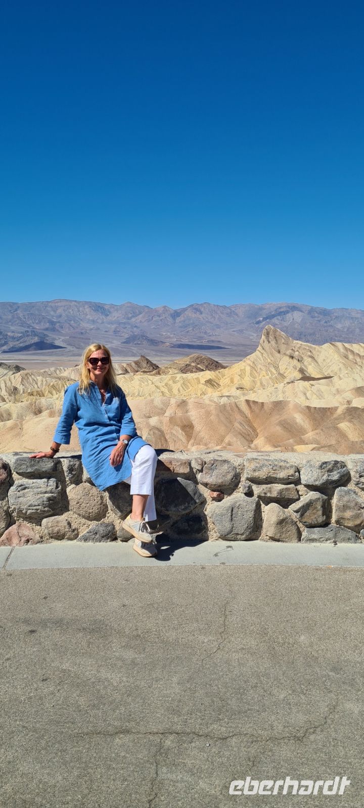 Wir steigen aus, und sind fast alleine. Wir laufen in einem den hohen Temperaturen angepassten Schritt den Hügel steil hoch. Und es bietet sich uns ein einzigartiger Blick auf das unterhalb liegende „Badwater“ und „Artist's Palette“.