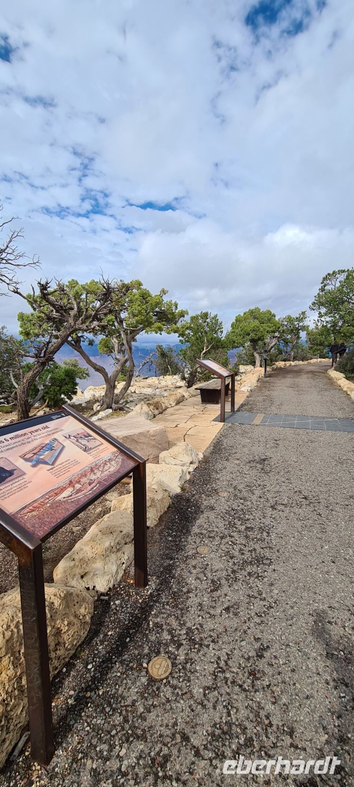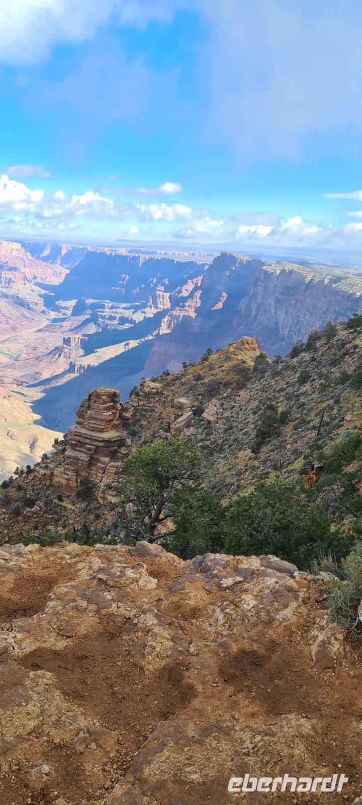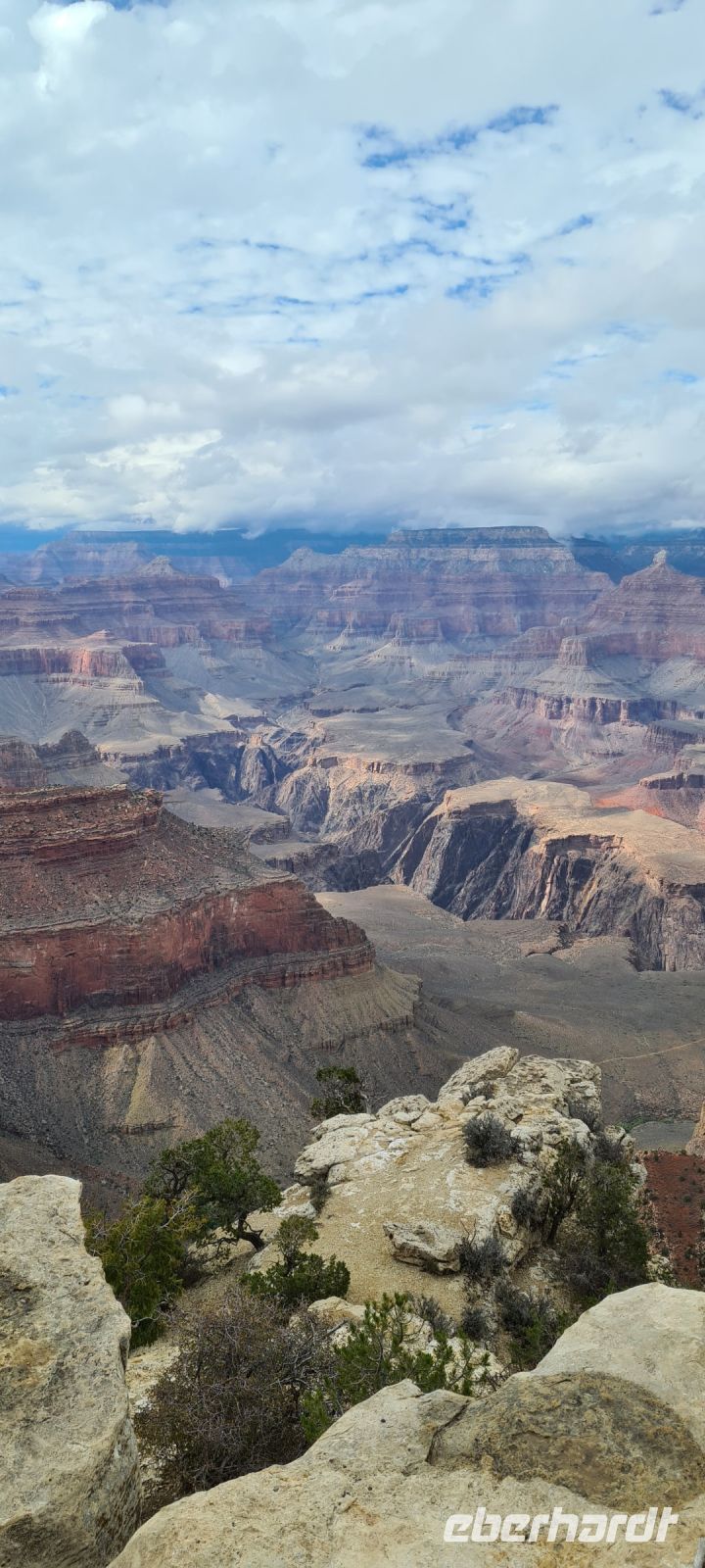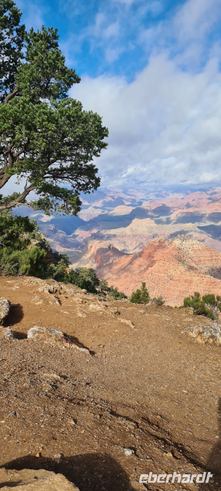 Immer wieder machen wir Pause, immer wieder filmen und fotografieren wir. Wir kriegen einfach nicht genug. Diese Schlucht die sich über rund 450 km zieht und dort wo wir spazieren gehen fast 1,4 km in die Tiefe stürzt. Wir erahnen den Colorado River.