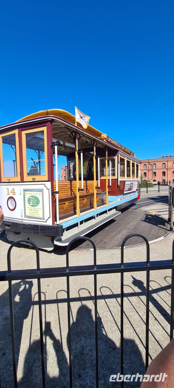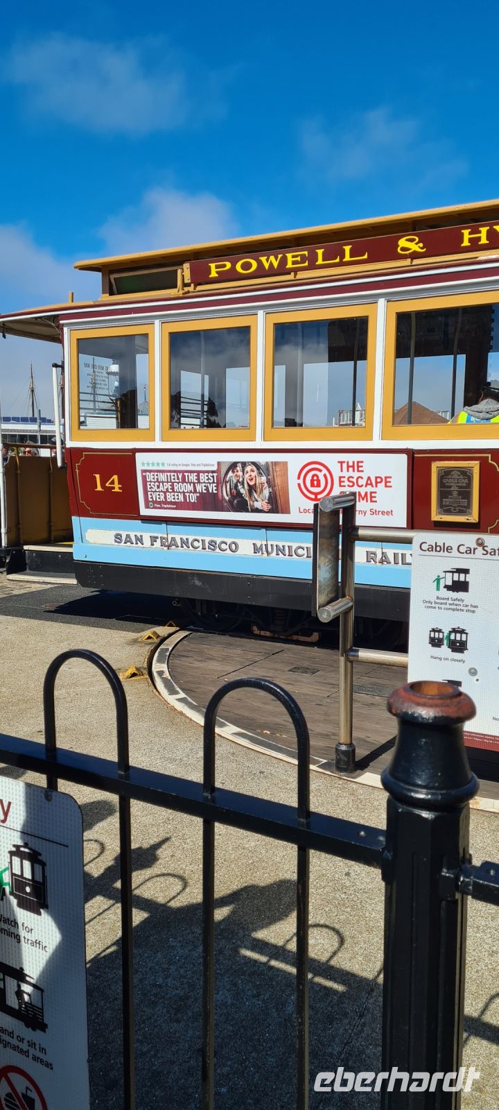 Das ist die, die die schönste Strecke in San Francisco zurücklegt. Gedacht getan, alle sind hellauf begeistert und los geht’s. Die Station ist direkt ums Eck vom Hotel, wir warten ein bisschen und können ganz wunderbar beobachten wie die Technik der Bahn funktioniert, Chris erklärt ins Detail und dann ist es soweit.