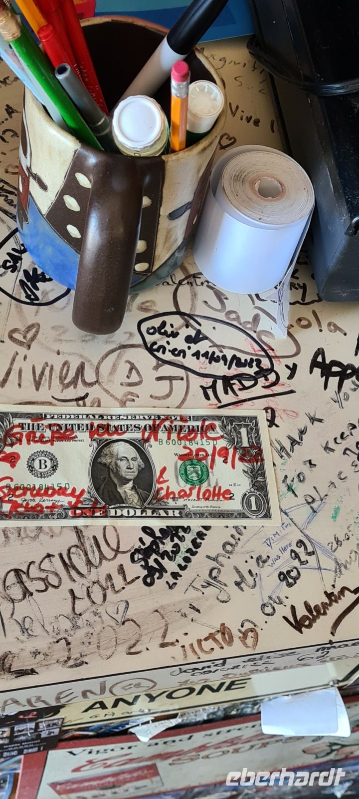 Der Innenraum wie aus einer anderen Zeit, Verewigungen an den Wänden aus aller Welt – jetzt auch von uns - und aus den Lautsprechern tönt immer noch Pink Floyd mit „Wish you were here“.