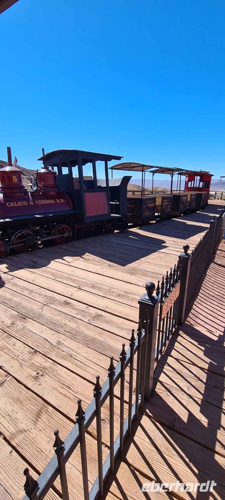 Wir hören Geschichten über den Westen, die Entstehung der Vereinigten Staaten und vieles mehr. Eisenbahnen schlängeln sich mit endlos langen Waggons in endlos langen Schleifen durchs Land und nach ca. 1,5 Stunden erreichen wir die Mojave – Wüste.
