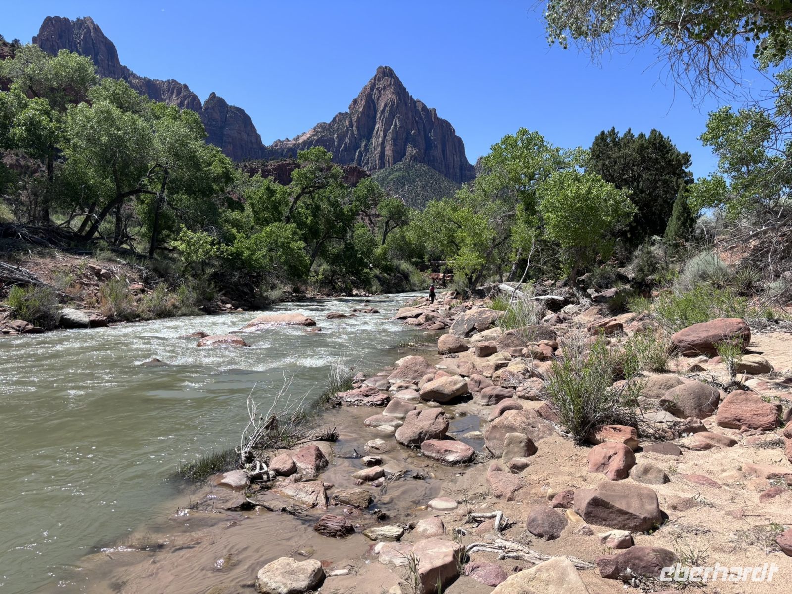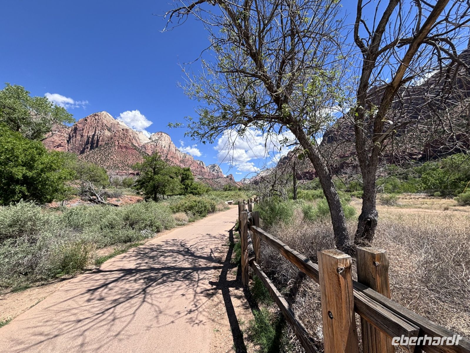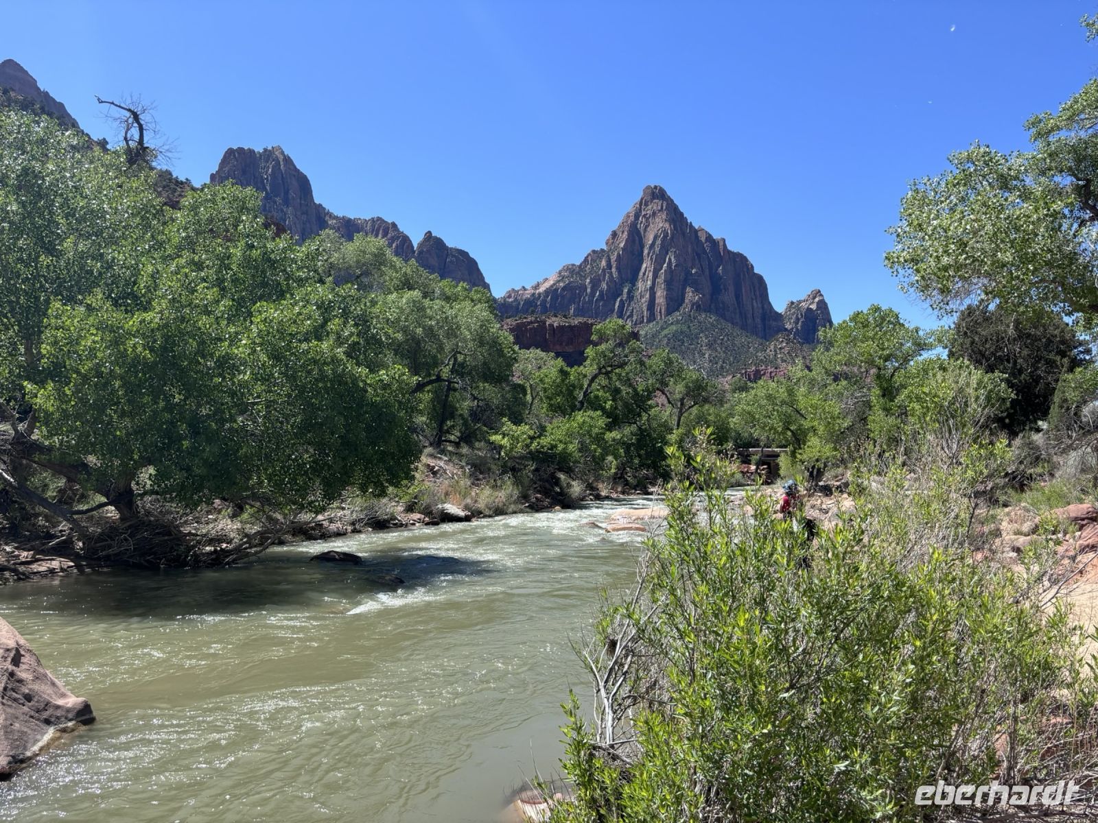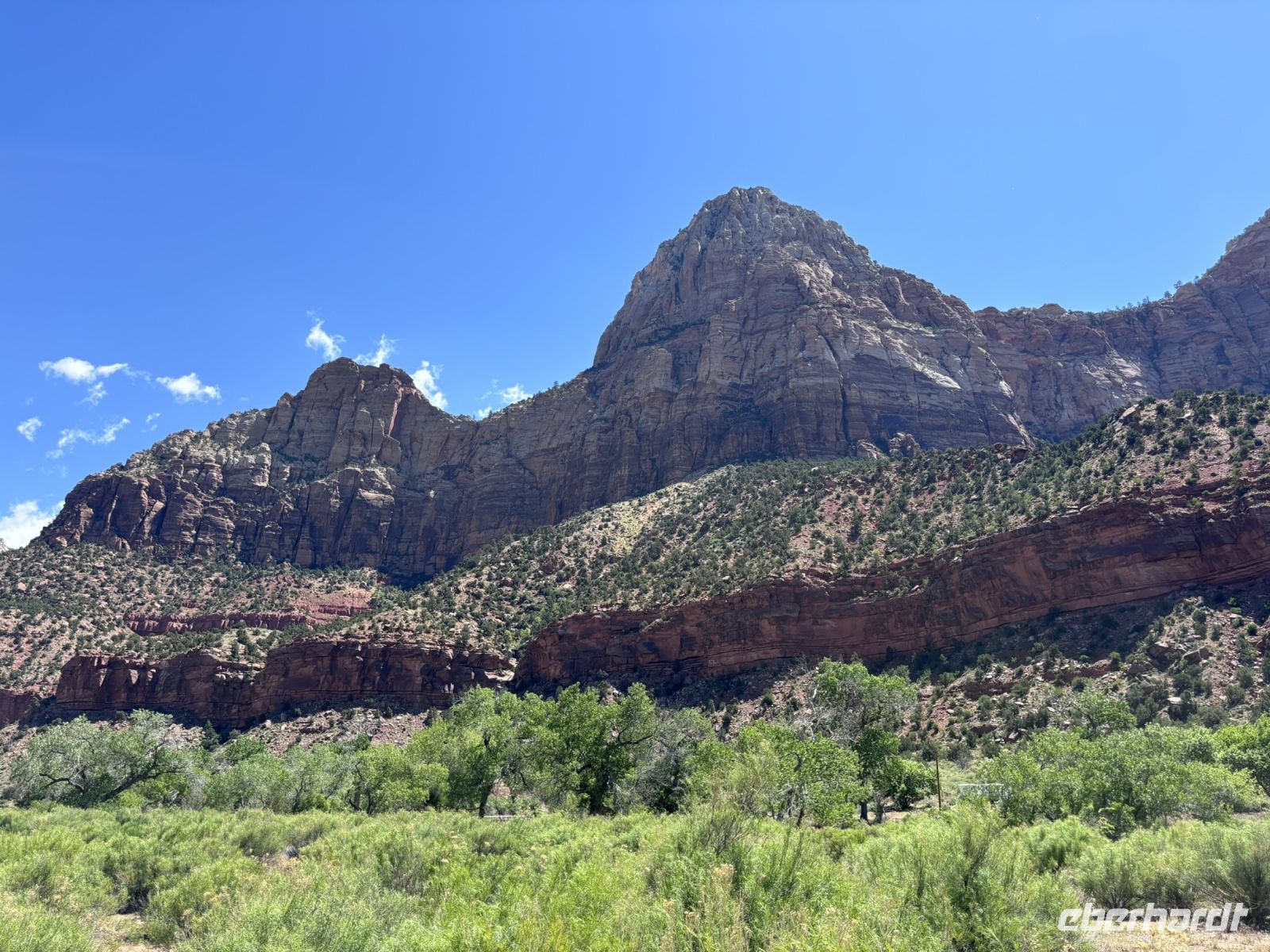 Gegen Mittag erreichten wir das Herz des Zion Nationalparks. Wir hatten ausreichend Zeit für einen Spaziergang und ein Mittagessen. Der Park war wirklich schön, mit seinen hohen Felswänden, den üppigen Grünflächen und dem Virgin River. Für das Mittagessen suchten wir uns ein gemütliches Plätzchen und genossen die mitgebrachten Snacks.
