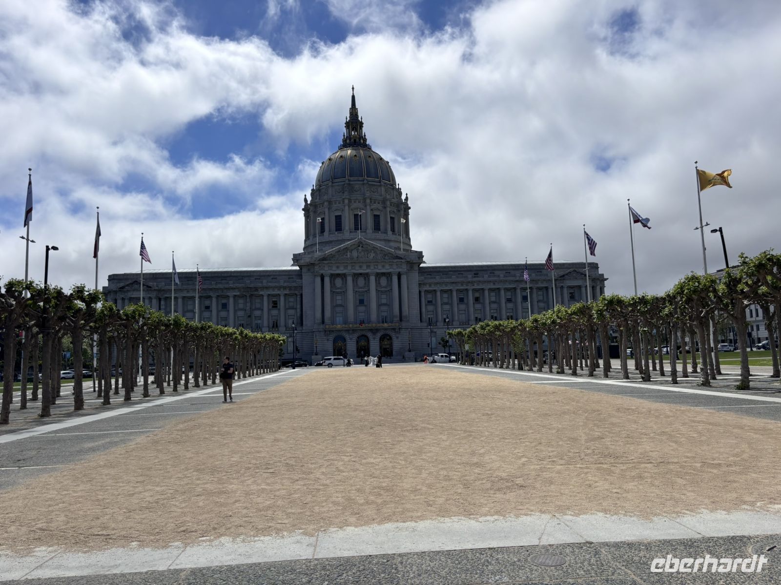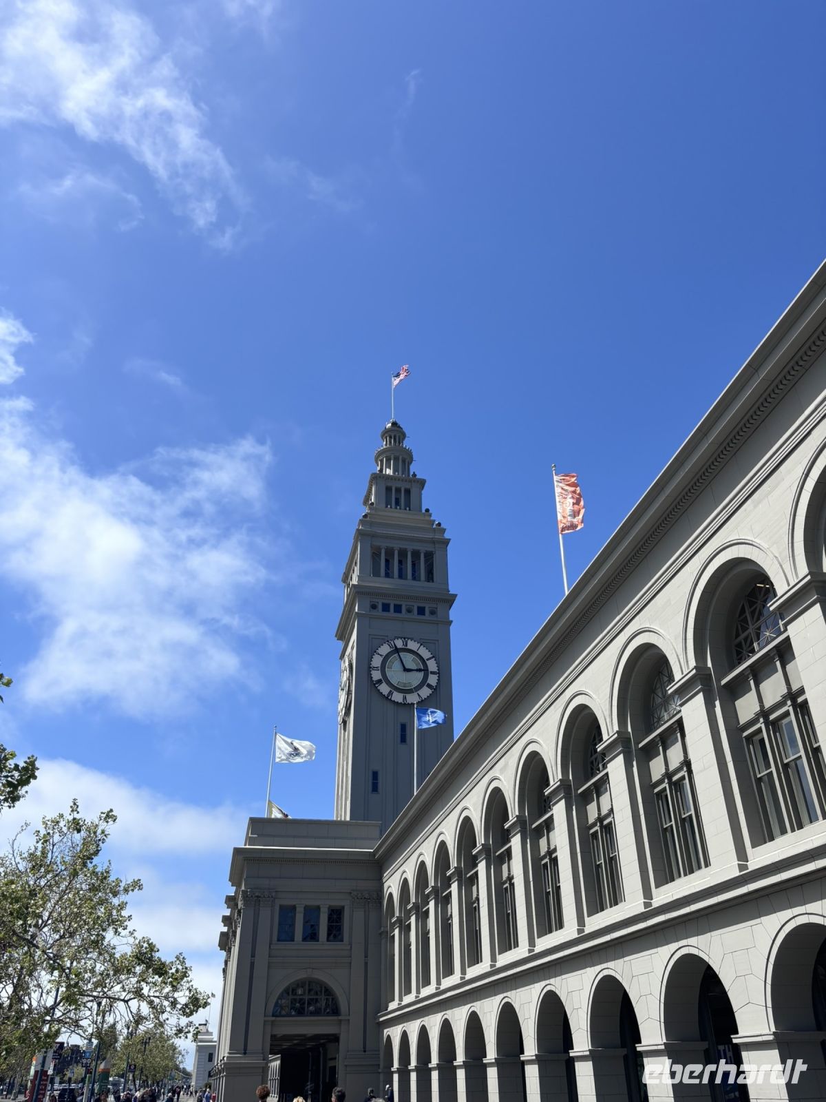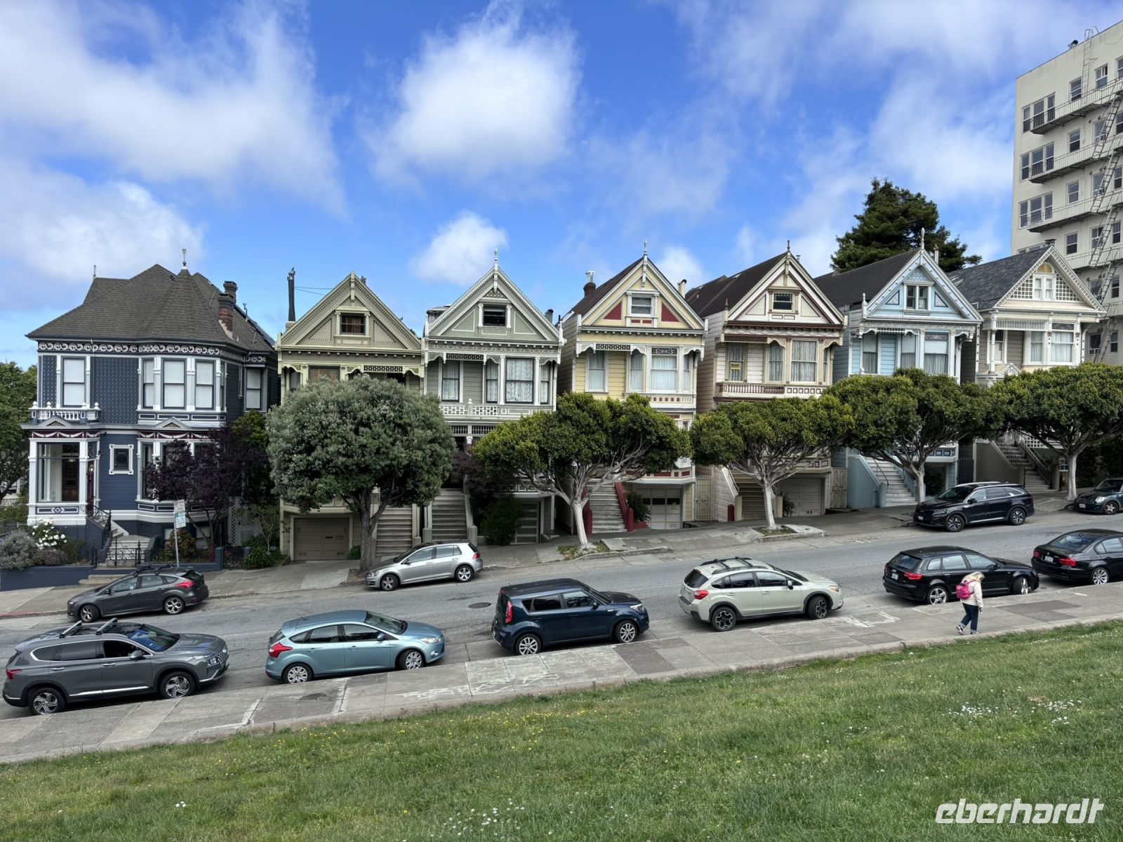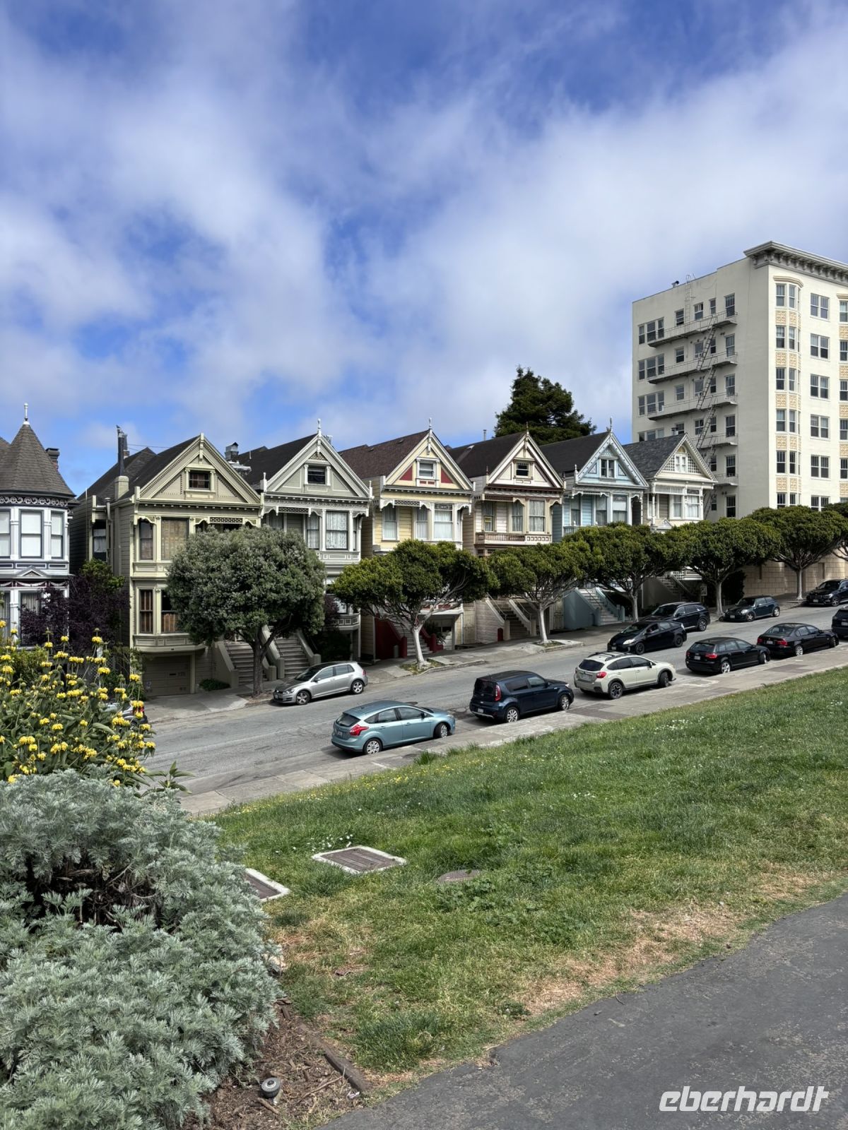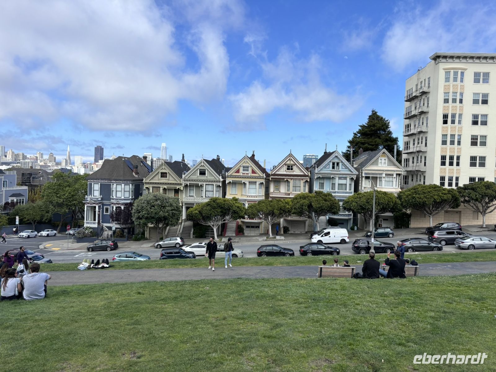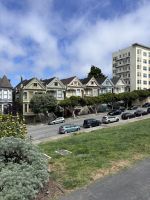 Anschließend nahmen wir die Fähre zurück nach San Francisco, was uns noch einmal tolle Ausblicke auf die Stadt und die Golden Gate Bridge bot. Zurück in San Francisco ging es mit dem Bus weiter zum Civic Center Plaza, wo wir einen kurzen Fotostopp einlegten und dann weiter zum Alamo Square, wo wir die berühmten "Painted Ladies" bewunderten, die viktorianischen Häuser, die in vielen Filmen und Serien zu sehen sind.