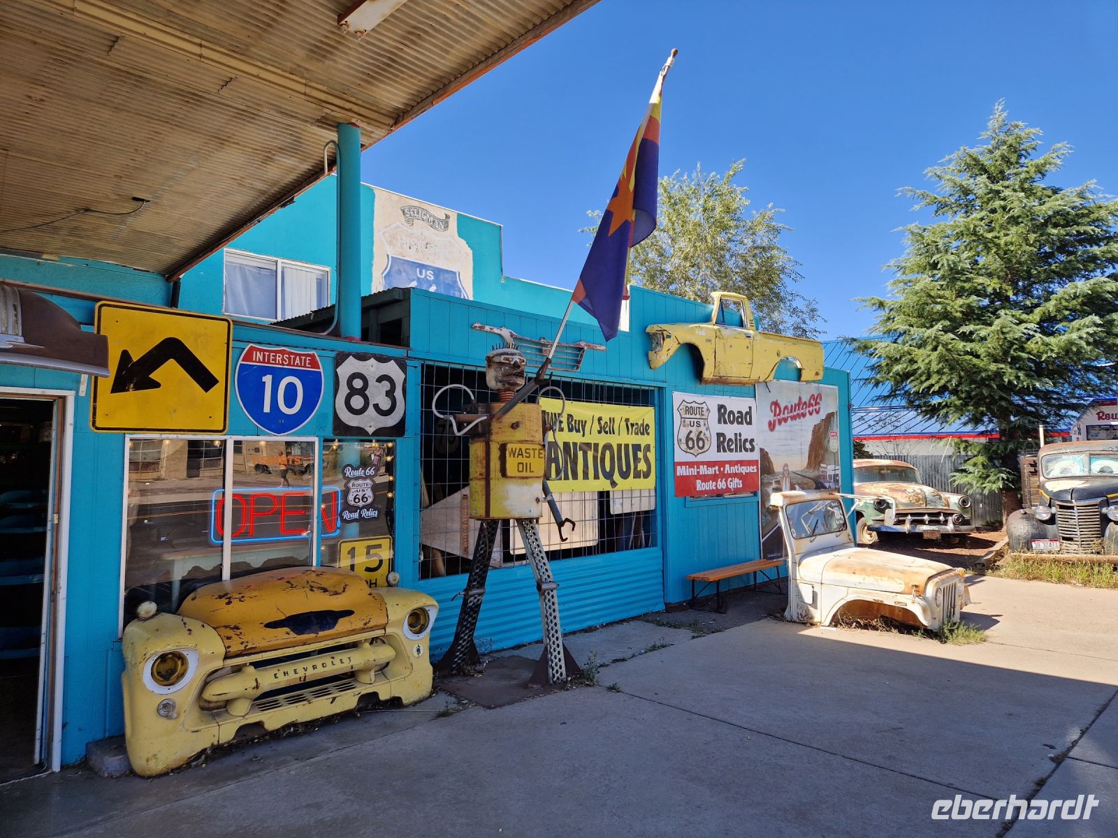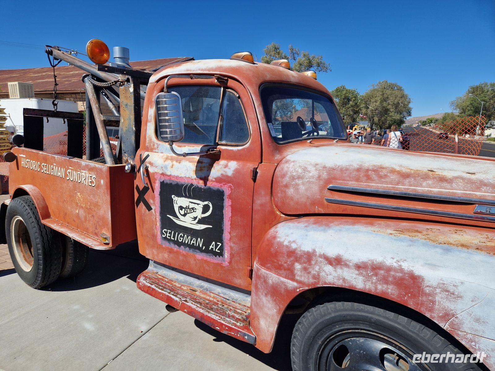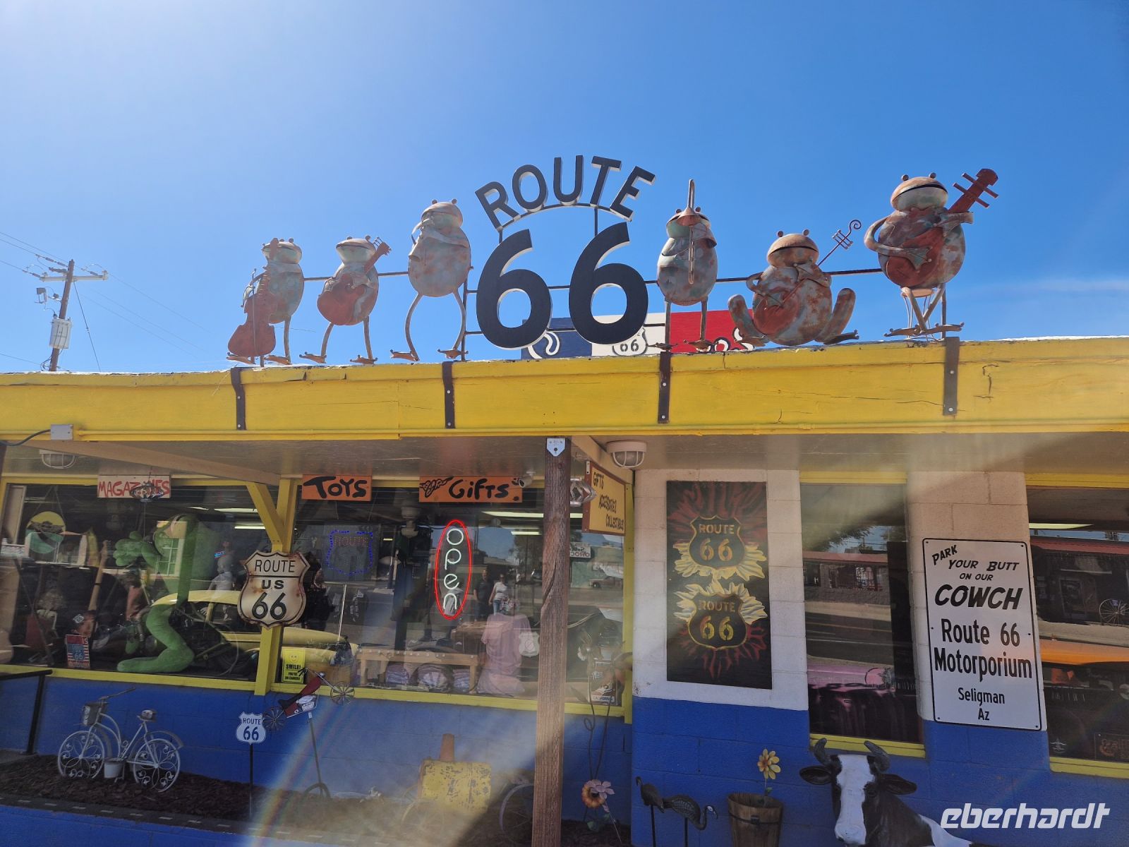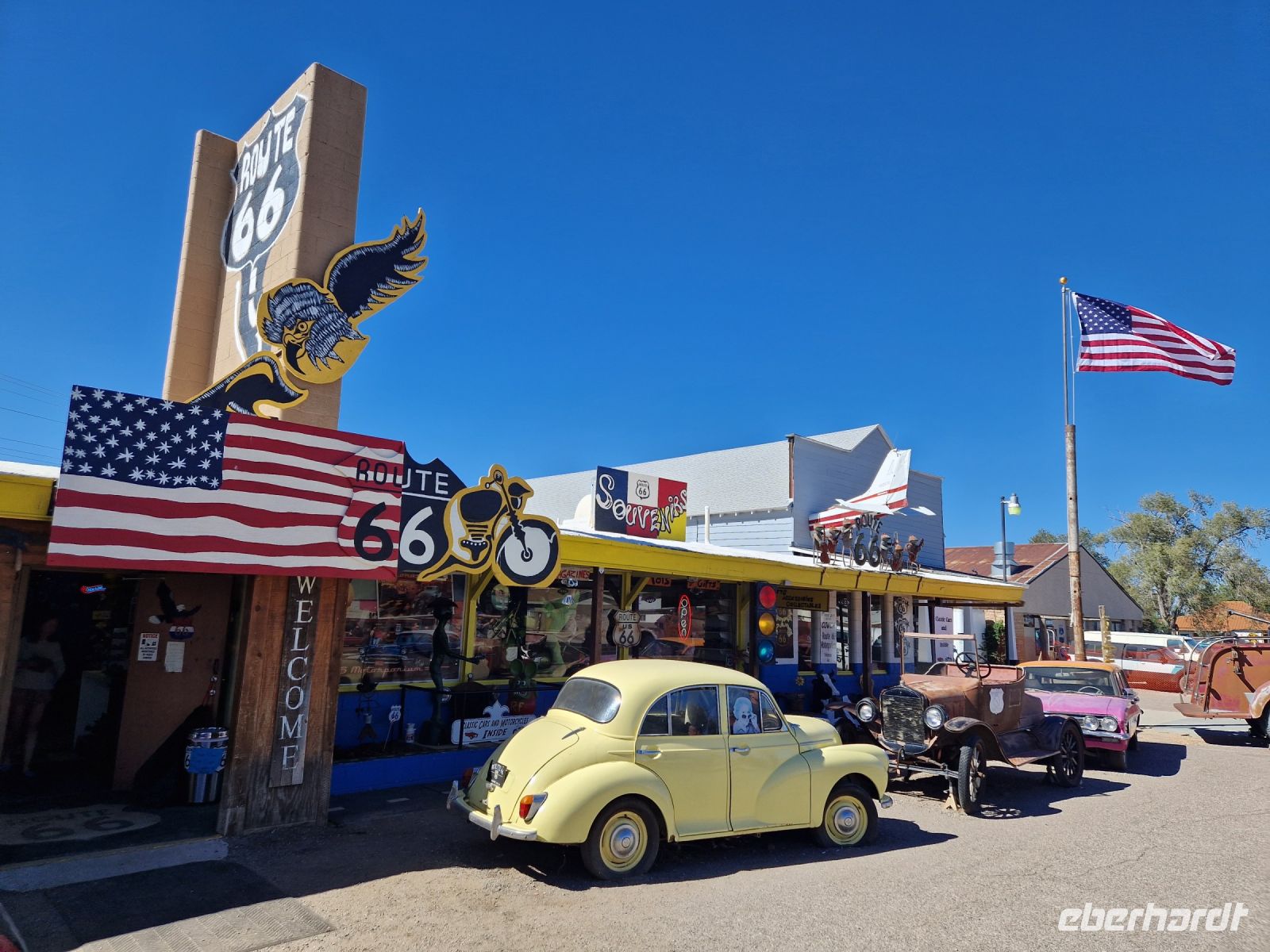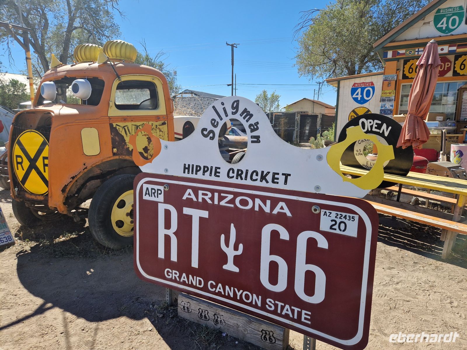 Nach einem reichlichen Frühstück ging es für uns heute weiter ins Landesinnere. Wir erreichten bei der Überquerung des Colorado Rivers den Bundesstaat Arizona. Chris erzählte uns so einiges über dieses Bundesstaat und wir erreichten nach knapp zwei Stunden Seligman. Einen Ort direkt an der Route 66. Hier gab es viele kleine Geschäfte, welche sich natürlich sehr touristisch auf das Motto Route 66 eingestimmt hatten. Überall konnte man Erinnerungen und Andenken kaufen.