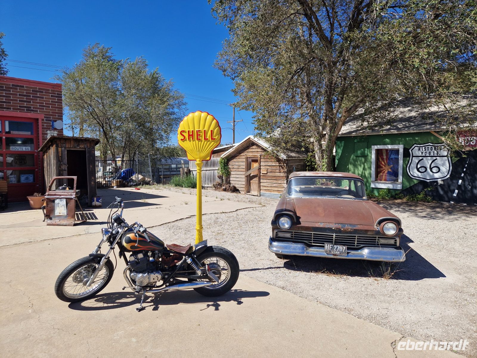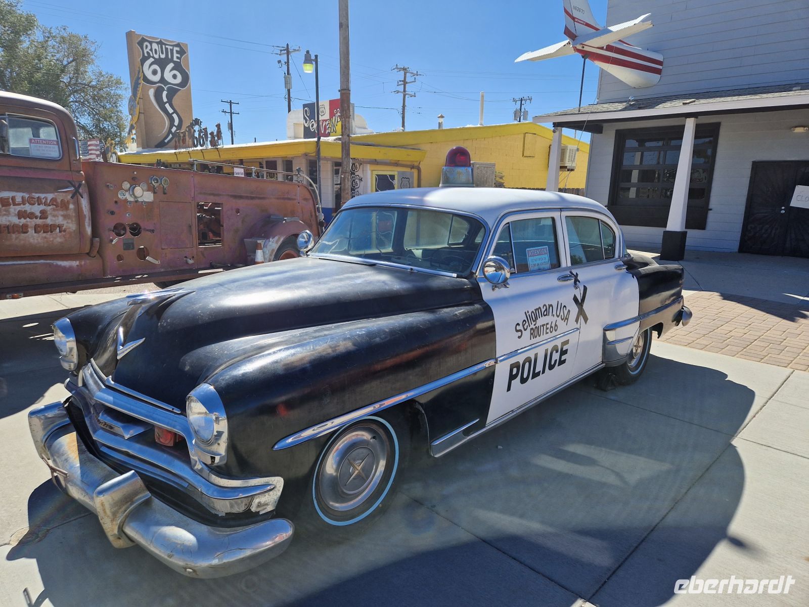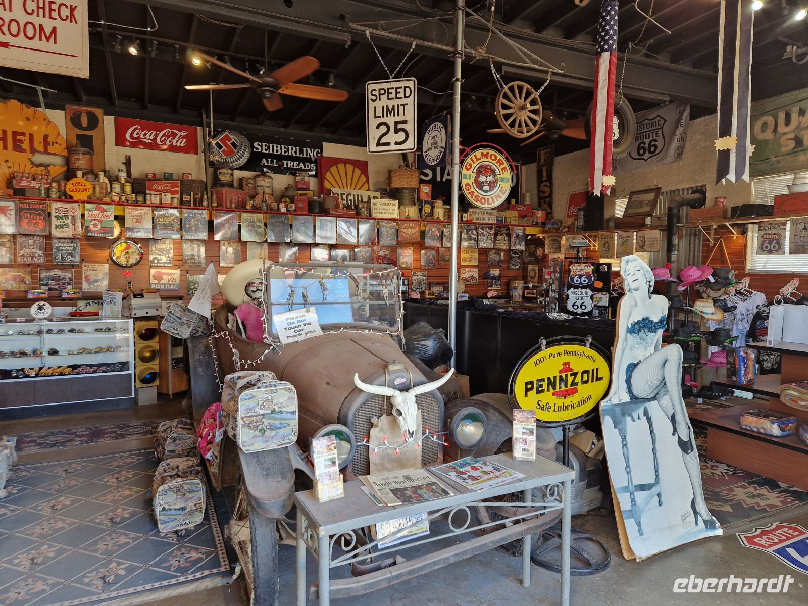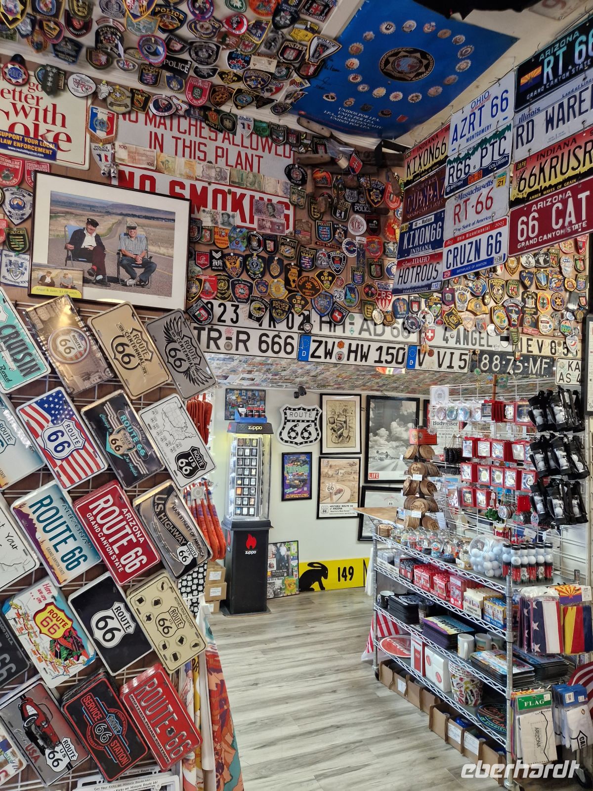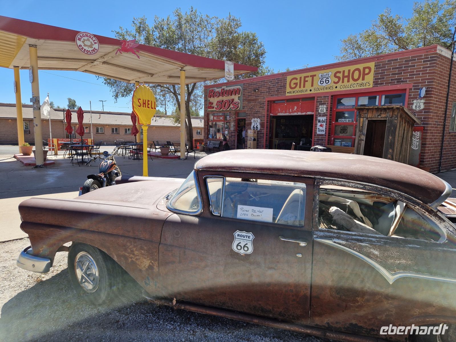 Nach einem reichlichen Frühstück ging es für uns heute weiter ins Landesinnere. Wir erreichten bei der Überquerung des Colorado Rivers den Bundesstaat Arizona. Chris erzählte uns so einiges über dieses Bundesstaat und wir erreichten nach knapp zwei Stunden Seligman. Einen Ort direkt an der Route 66. Hier gab es viele kleine Geschäfte, welche sich natürlich sehr touristisch auf das Motto Route 66 eingestimmt hatten. Überall konnte man Erinnerungen und Andenken kaufen.