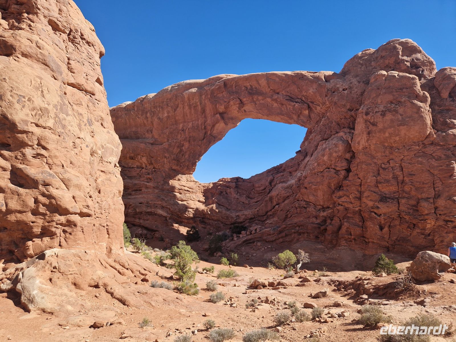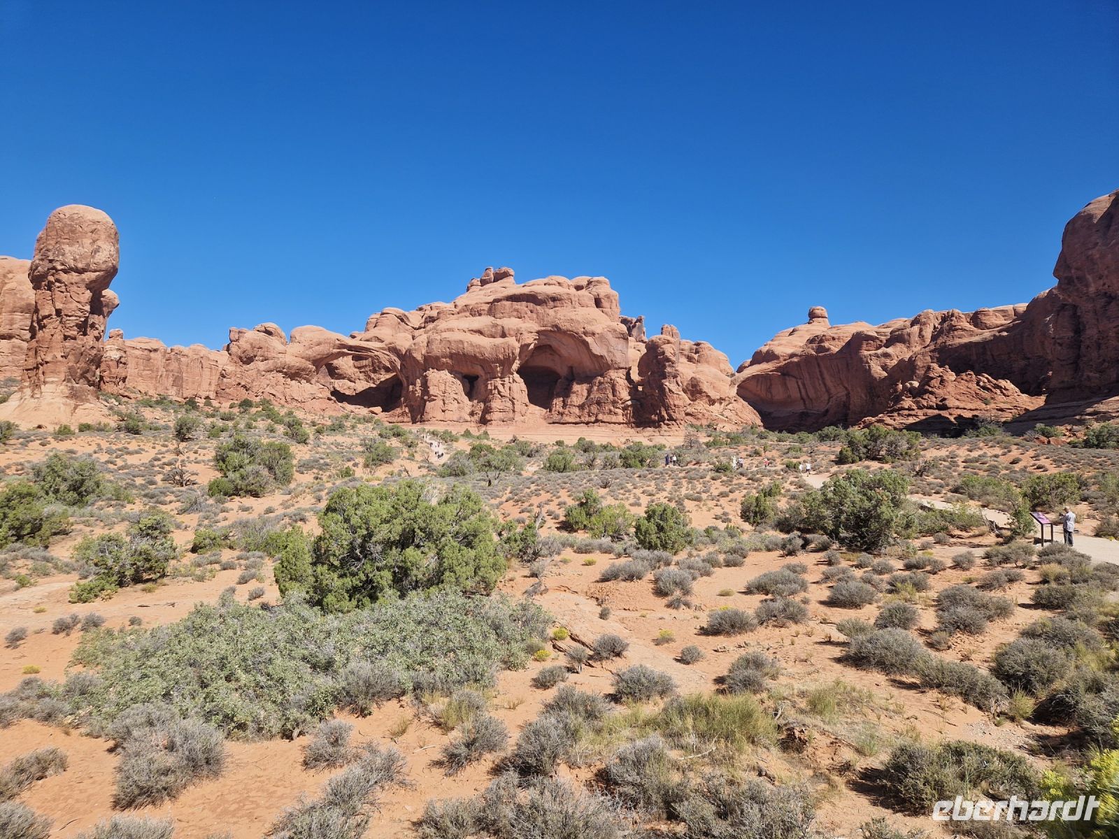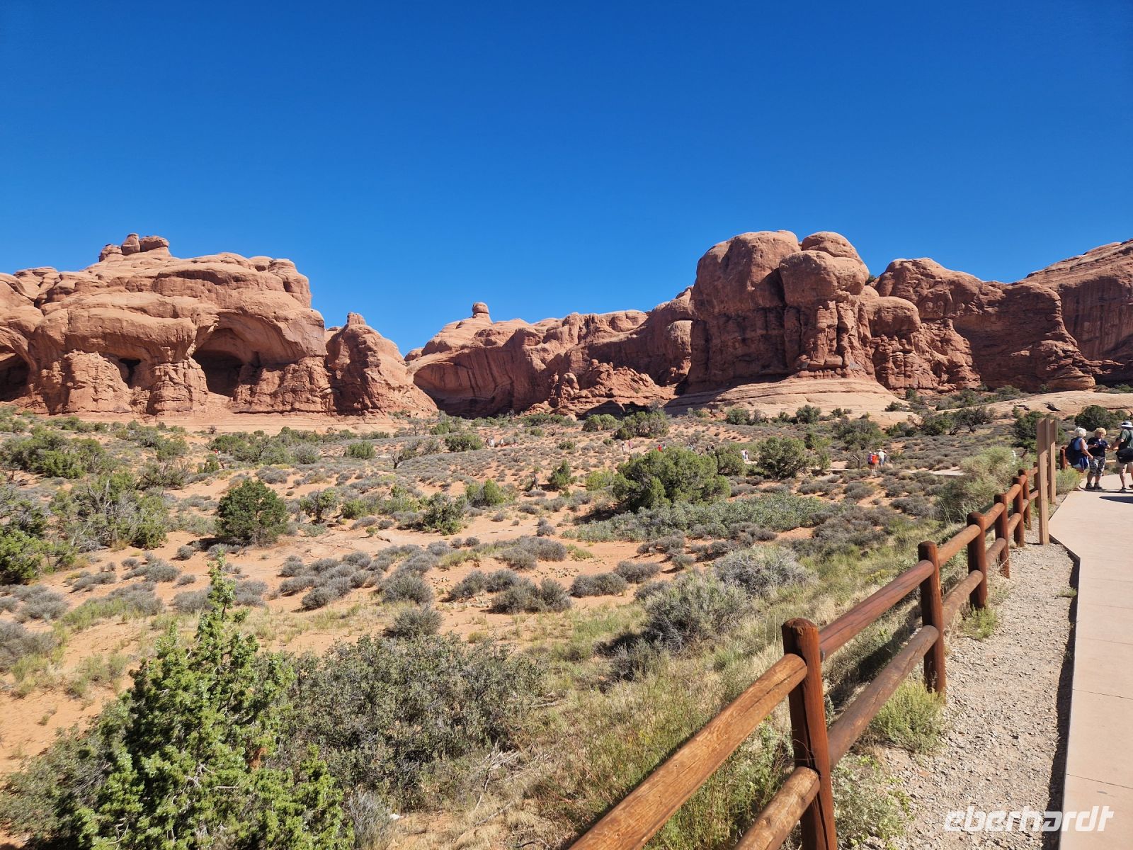 Nach kurzer Fahrtzeit erreichten wir bereits den Arches Nationalpark. Das Wetter war perfekt und ermöglichte uns traumhafte Bilder. Das Blau des Himmels, das rotbraune Gestein und die grünen Gräser und Büsche ergaben ein einzigartiges Farbspiel. Verschiedene Stopps lagen auf unserer Route wie die Park Avenue, der Balanced Rock und natürlich auch North und South Window. Es war unvorstellbar schön genau dort zu sein und diese Naturwunder genießen zu dürfen.