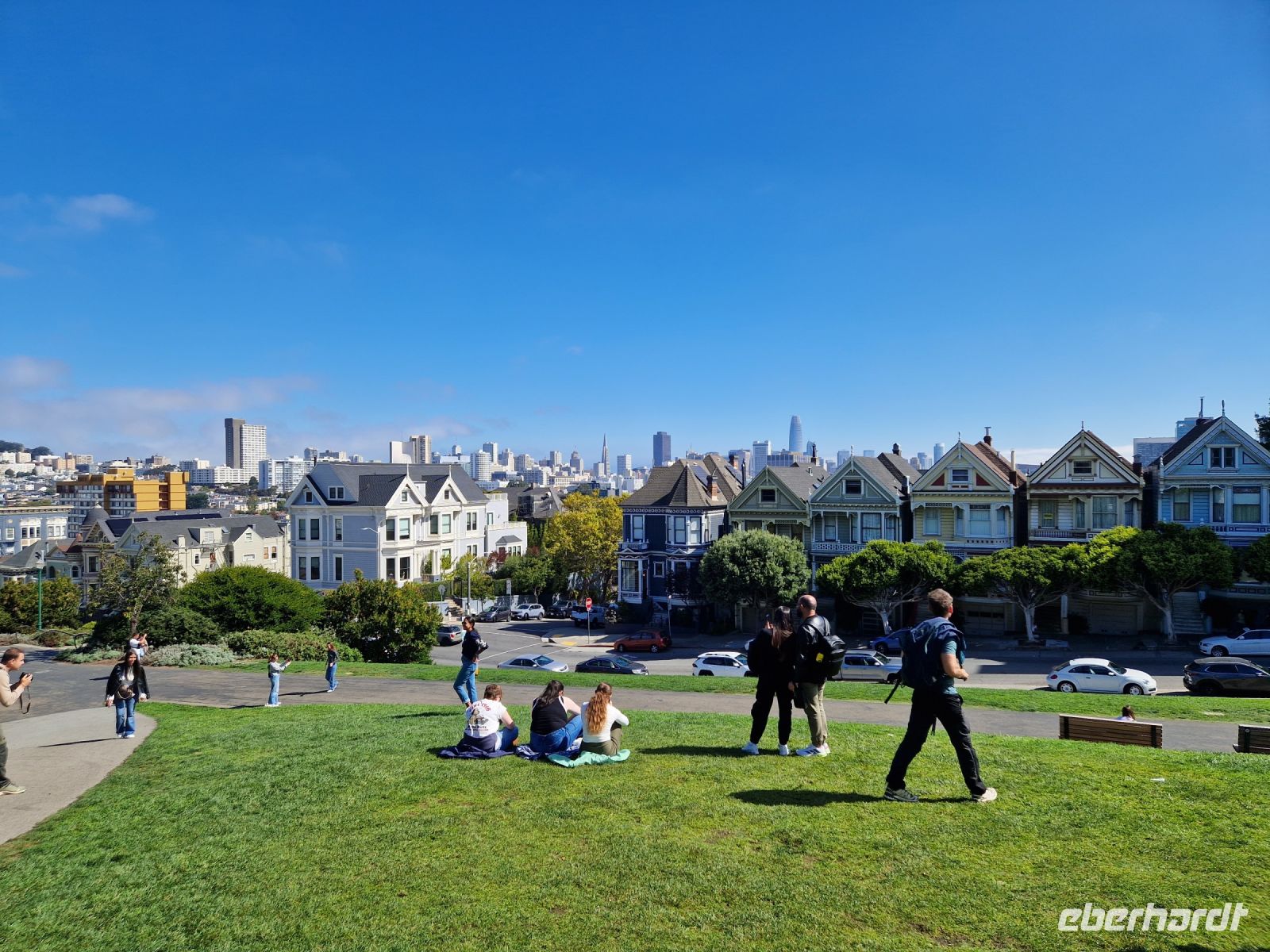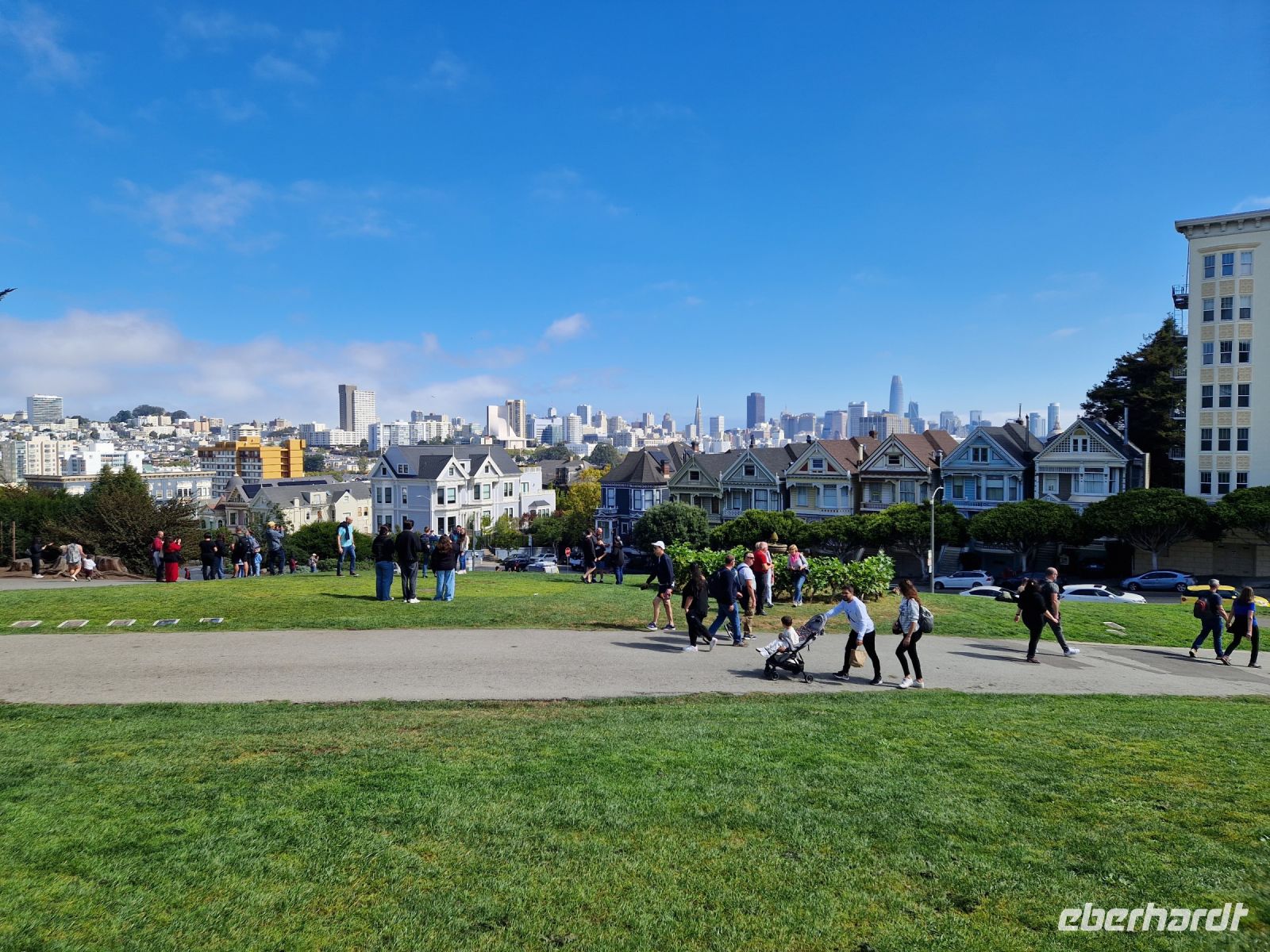 Der Alamo Square durfte bei einer Stadtrundfahrt auch nicht fehlen. Im Park angekommen, erfreuten wir uns an einem wunderschönen Blick auf die Skyline San Franciscos und die sieben viktorianischen Häuser, die Painted Ladies. Nun war komplett blauer Himmel und die Sonne leistete sehr gute Arbeit.