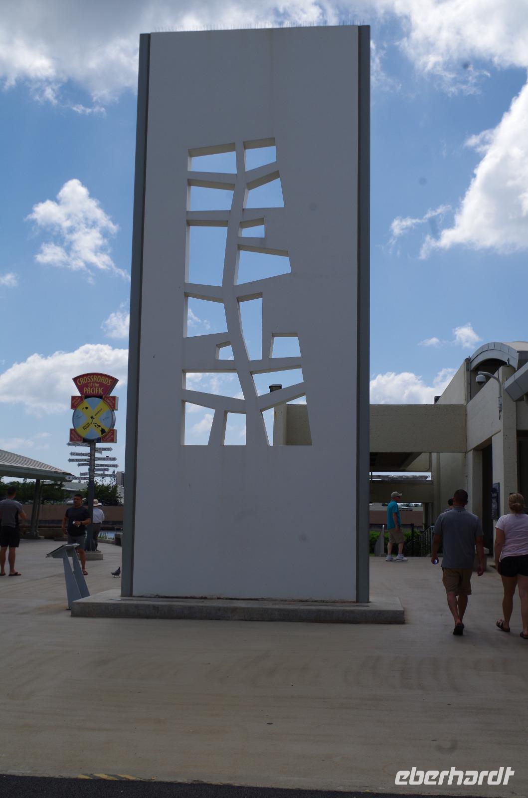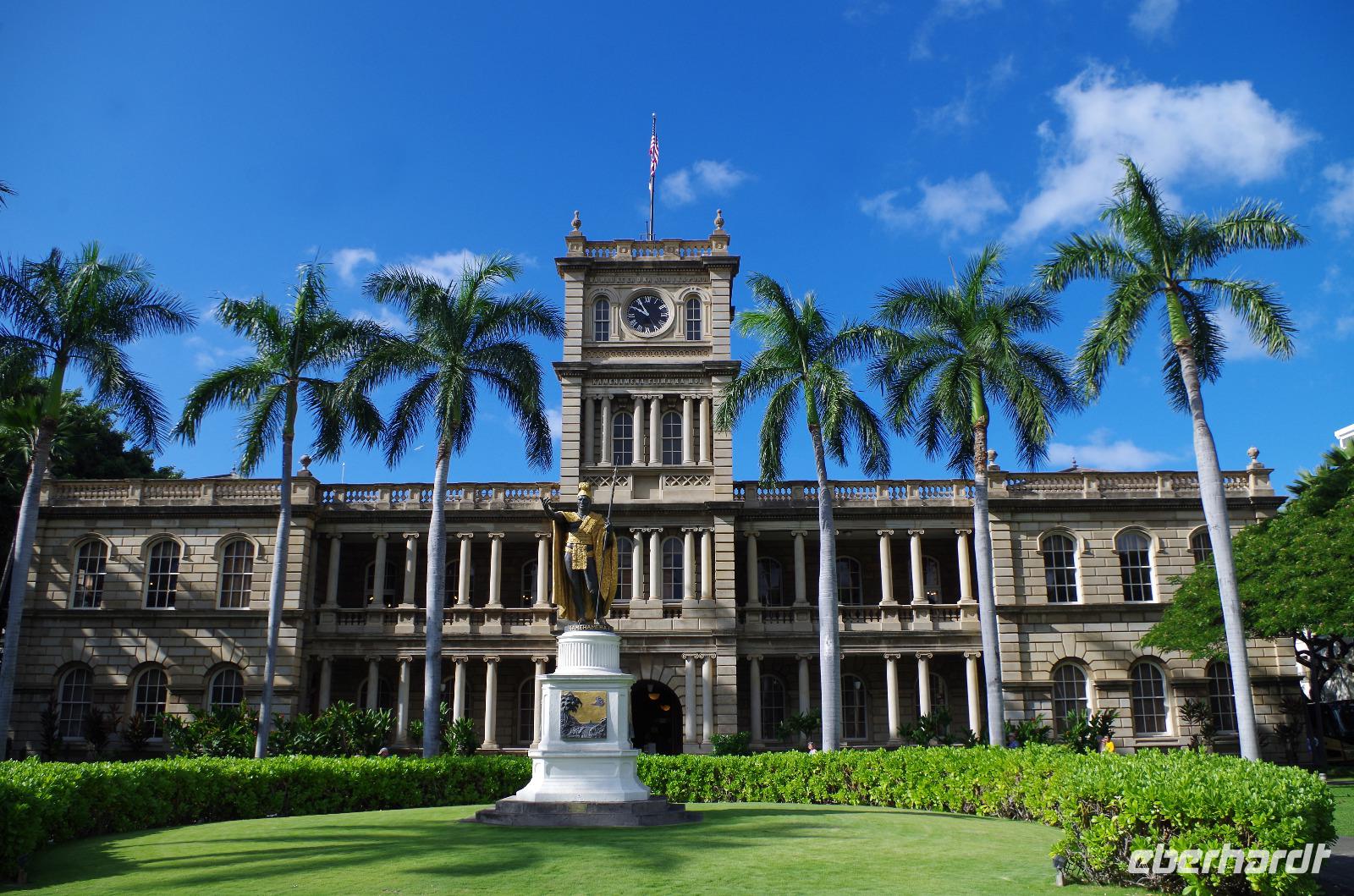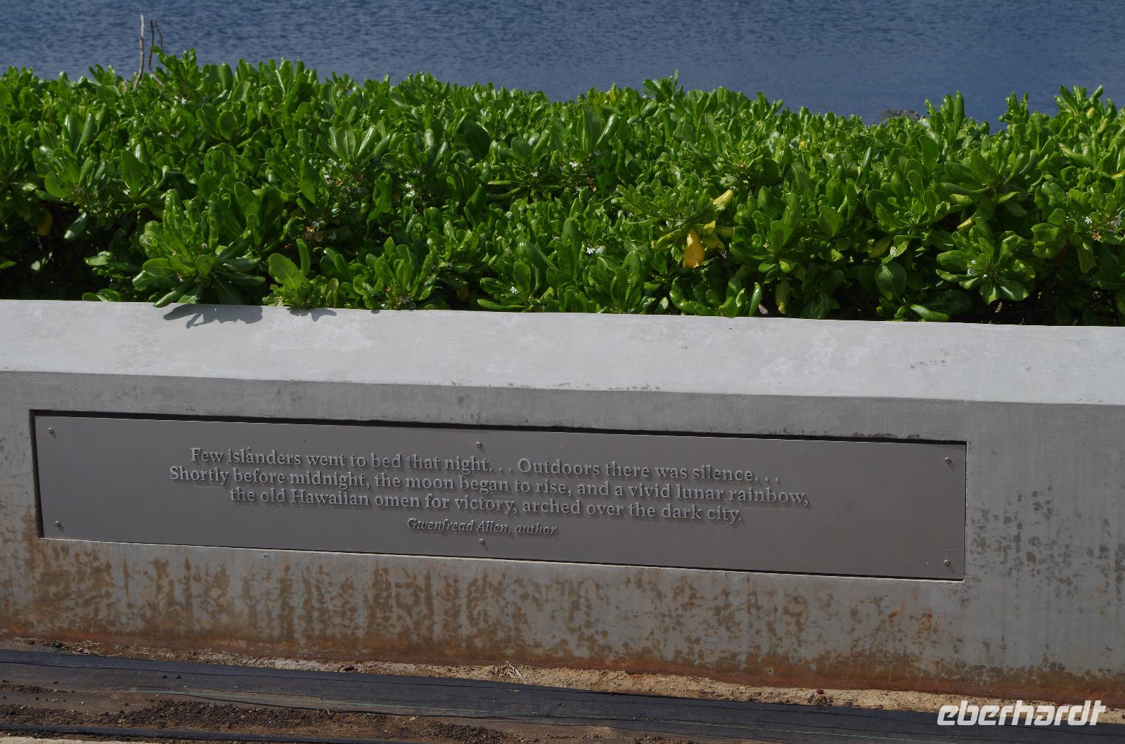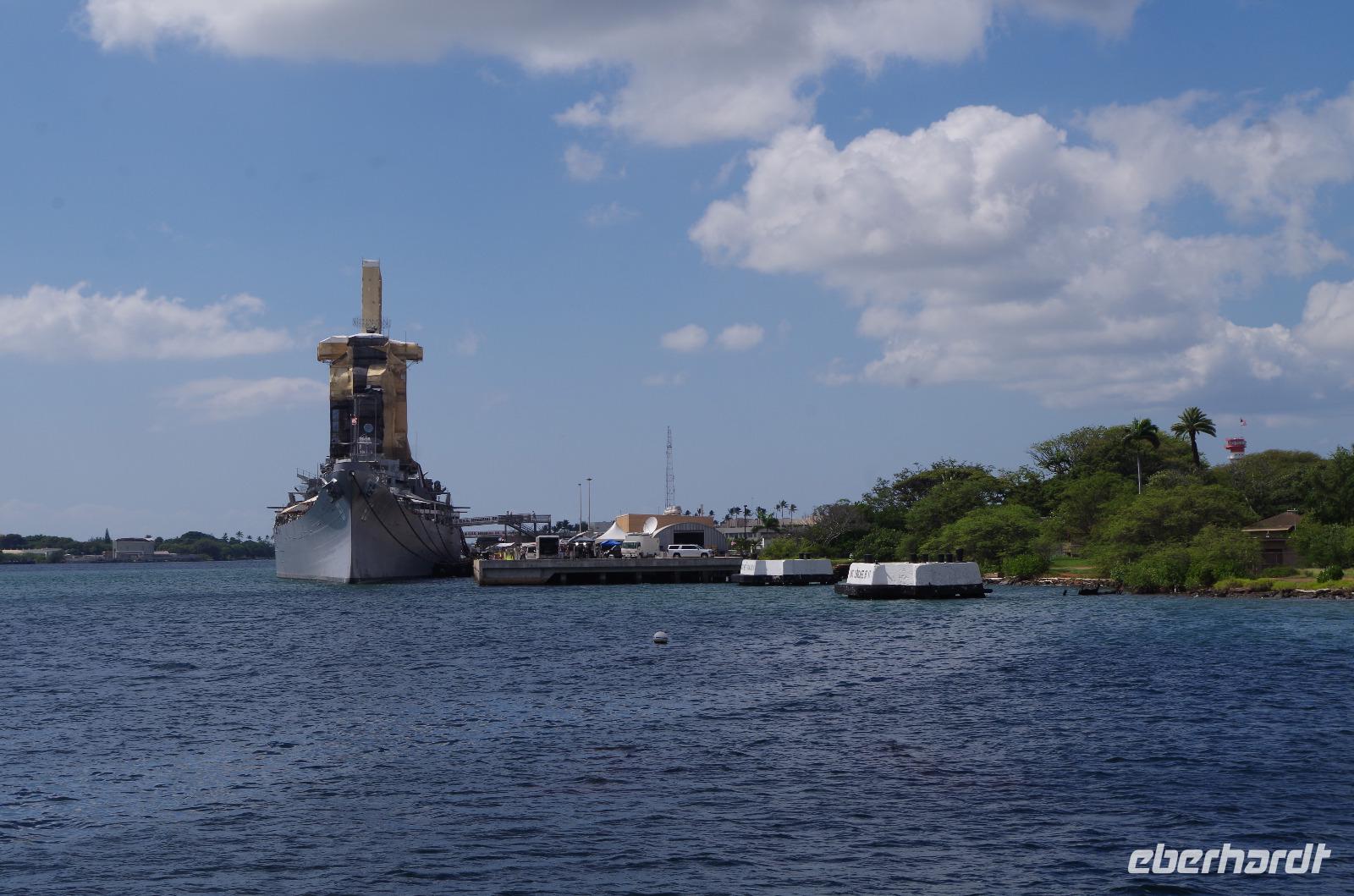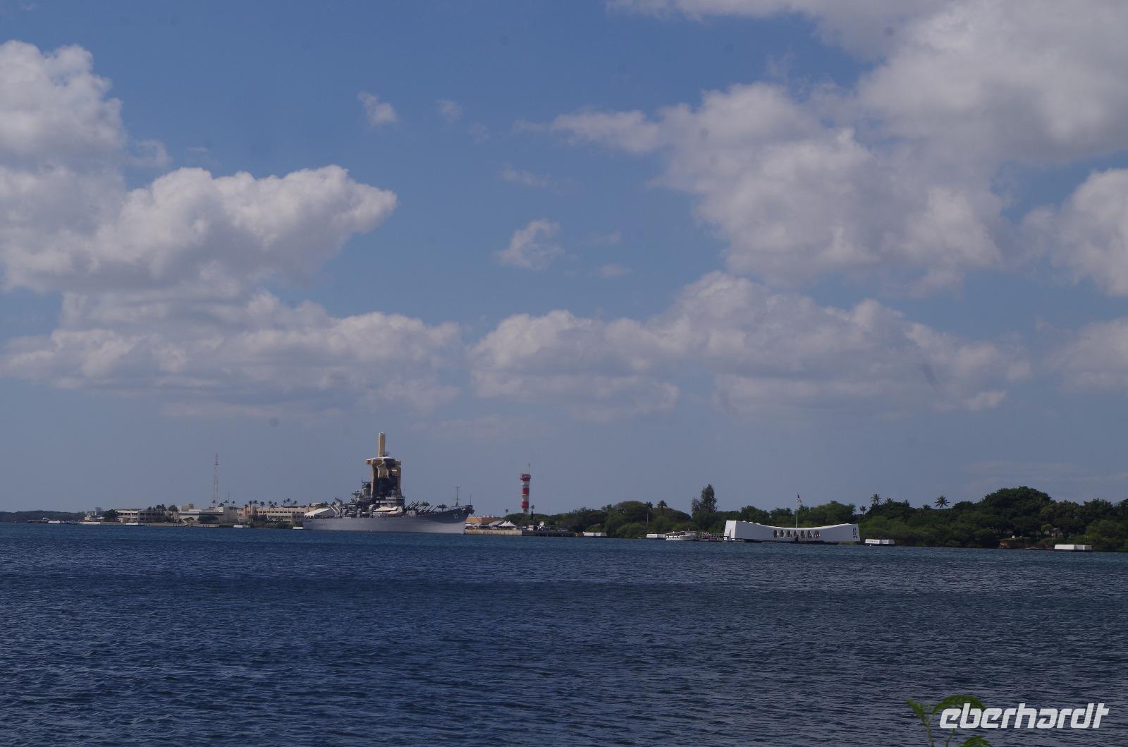 In unserer ersten Nacht auf O'ahu haben wir sehr gut geschlafen und eigentlich steht einem sonnigen und schönen Tag nichts im Weg. Dabei liegt aber die Betonung auf dem Wort 'eigentlich'. Unser Frühstück ist um 07.30 Uhr im Restaurant "Cinnamon's at the 'Ilikai" reserviert. Jedoch gibt es anfangs noch ein kleines Problem bei der Rechnung sowie bei der Essensauswahl. Das Restaurant befindet sich zwar im Hotelgebäudekomplex, es gehört aber nicht zum Hotel dazu. Die Unklarheit können wir aber schnell klären. Wir haben kein Buffet an diesem Morgen, sondern wir werden bedient. Wir können wählen zwischen Toast oder Pancakes, Rührei oder Spiegelei, gebratenem Schinken oder leckerer süßer Ananas. Es werden uns auch verschiedene Marmeladen, Honig und Butter sowie Kaffee oder Tee gereicht. Bei Bedarf können wir "Nachschub" ordern. Bevor wir uns um 08.30 Uhr zur Stadtrundfahrt in der Hotellobby treffen, befindet sich bei den Aufzügen ein wichtige Tagesinformation. Der Präsident der Vereinigten Staaten, Donald Trump, wird auf seiner Asien-Reise heute und morgen einen Zwischenstopp in Honolulu einlegen und Pearl Harbour besuchen. Für uns ist dieser Besuch eher ungünstig, da dadurch auch Straßensperrungen in Honolulu vorgesehen sind und wir uns vorsichtshalber eher als geplant nach Pearl Harbour begeben werden, unsere eigentliche Tour ist für 13.00 Uhr geplant. Dann schauen wir mal, ob wir Donald Trump auch persönlich sehen werden ;-) An diesem sonnigen Tag steht eine Stadtrundfahrt durch Honolulu und die Besichtigung von Pearl Harbour auf unserem Plan, beides 'eigentlich' mit deutschsprachiger Reiseleitung! Hier fällt also schon das erste 'eigentlich' an diesem Tag! Es wird leider auch nicht das letzte Mal sein, dass dieses Wort am heutigem Tag fällt :-( Statt eines deutschsprachigen Reiseleiters haben wir heute einen englischsprechenden "Driverguide", also einen Busfahrer, welcher auch als Guide tätig ist. Unser Busfahrer Ron ist wirklich super, auch wenn er nicht wirklich ein Reiseleiter ist. Dennoch versucht er auf unsere Wünsche einzugehen und auch die Stadtrundfahrt daran anzupassen. Die Fragen zu den verschiedensten Themen der Gäste werden durch die Reisebegleitung übersetzt, unser englischsprachiger Busfahrer versucht diese so gut es ihm möglich ist zu beantworten. Es ist natürlich sehr schade, dass unser heutiger Tag nicht wie geplant verläuft, aber Eberhardt und die Reisebegleitung versprechen, einen deutschsprachigen Reiseleiter für den Abreisetag zu organisieren, an welchem Tag wir wirklich lediglich einen englischsprachigen "Driverguide" gehabt hätten. Das Versprechen wird natürlich auch eingehalten ;o) Dank unseres netten örtlichen Reiseleiters am Abreisetag werden wir noch einen gelungenen Abschied von Honolulu haben, dazu aber später mehr! Um 09.00 Uhr beginnt unsere Stadtrundfahrt. Da die Insel O'ahu oftmals als Versammlungsort genutzt wird, besitzt sie den Beinnamen "The Gathering Place". Seit 1850 ist Honolulu die hawaiianische Hauptstadt. In Honolulu, was mit "Zuflucht oder geschützte Bucht" übersetzt werden kann, leben fast eine Million Menschen. Wir fahren zum Hawaii Capital Historic District und besichtigen Ali'iolani Hale und den Iolani Palace an der South King Street. Im Ali'iolani Hale befindet sich der Oberste Gerichtshof von Hawaii. Davor steht die wohl bekannteste Statue des Königs Kamehameha I., welcher 1810 die Inseln Hawaiis zu einem Königreich vereinigt hatte und als großer Führer, Krieger und Diplomat galt. Der sich direkt gegenüber befindende Iolani Palace ist die ehemalige königliche Residenz. Seit 1978 ist der Iolani Palace ein historisches Museum und für die Öffentlichkeit zugänglich. Im Jahre 1966 wurde die Organisation "The Friends of Iolani Palace" von Lili'uokalani Kawananakoa Morris, eine Großnichte der Königin Kapiolani, ins Leben gerufen. Diese Organisation kümmert sich um den Erhalt, die Restaurierung und die Bekanntgabe der Geschichte des Palastes sowie übernimmt sie die Verwaltung des Gebäudes und auch die Veranstaltung abwechslungsreicher Aktivitäten im und um den Palast herum. Es werden zudem eine Audiotour oder geführte Besichtigungstouren im Palast von Dienstag bis Samstag angeboten. Anschließend fahren wir am berühmten Strand "Waikiki Beach" entlang. Waikiki besteht aus zwei Hauptstraßen. Einerseits ist dies die Kalakaua Avenue mit den luxuriösen Designer-Geschäften und andererseits die Kuhio Avenue mit vielen Cafés, Restaurants und Nachtclubs. Nächster Programmpunkt ist der Punchbowl Crater, wo wir allerdings nur aus dem Bus heraus fotografieren dürfen. Es ist nicht erlaubt, an diesem historischen Denkmal anzuhalten oder auszusteigen. Also fährt uns Ron so langsam wie möglich an der mit fast sieben Millionen Besuchern im Jahr meistbesuchten Touristenattraktion auf O'ahu vorbei. Der Krater ist ein erloschener Vulkan mit hawaiianischen Namen Puowaina, was in Bezug auf die Menschenopfer mit "Hügel des Ablegens" übersetzt werden kann. Der größte hawaiianische Soldatenfriedhof mit fast 37.000 beerdigten amerikanischen Soldaten, das National Memorial of the Pacific, befindet sich inmitten des erloschenen Kraters. Danach fahren wir weiter Richtung Pearl Harbour. An dieser Stelle sei zu erwähnen, dass wir uns in Pearl Harbour auf einem Marinestützpunkt bewegen und es daher strenge Sicherheitsvorschriften gibt. Wir dürfen keine Taschen und Rucksäcke mitnehmen sowie keine Fototasche oder auch größere Gürteltasche. Bestenfalls werden nur die Geldbörse, das Mobilfunkgerät und die Kamera mitgenommen. Die anderen Sachen können wir im Bus liegenlassen, unser Busfahrer bleibt die komplette Zeit unseres Besuches im Bus. Es gibt aber auch die Möglichkeit, die Sachen für 4 USD je Tasche oder Rucksack beim Sicherheitspersonal abzugeben. Schließfächer gibt es keine. Wie bereits erwähnt sollte unsere Tour erst 13.00 Uhr starten, was aber erst in eineinhalb Stunden wäre. Aber dank unseres t