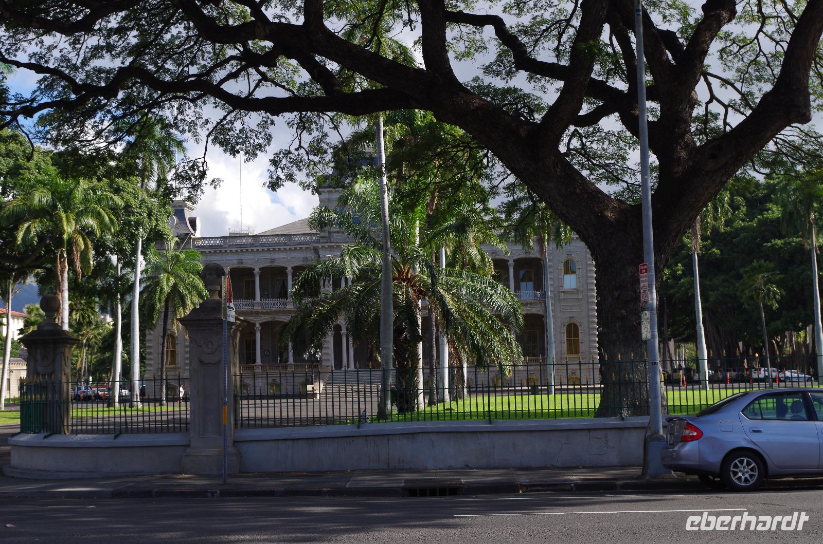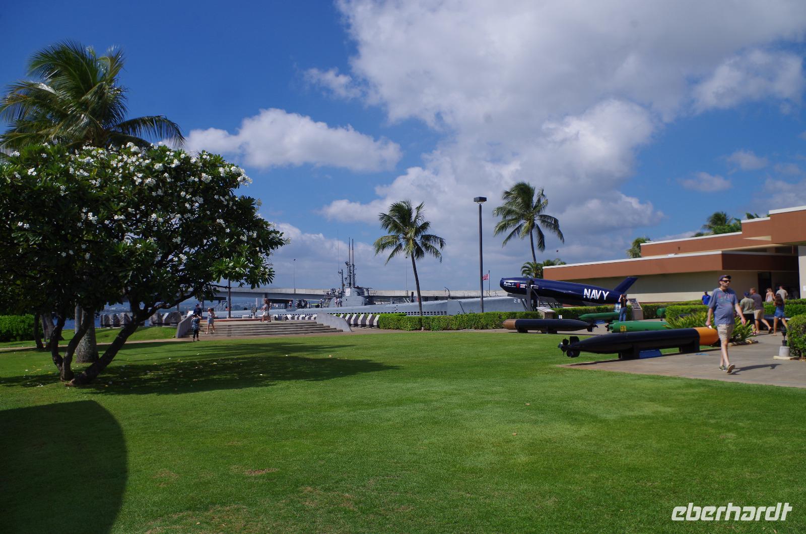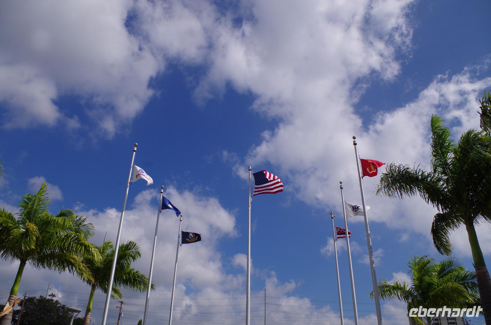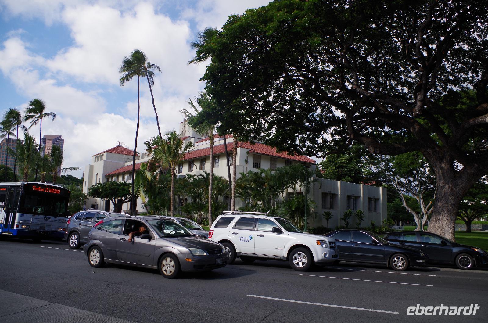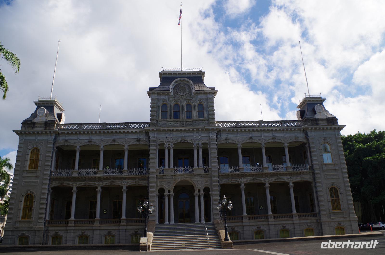 In unserer ersten Nacht auf O'ahu haben wir sehr gut geschlafen und eigentlich steht einem sonnigen und schönen Tag nichts im Weg. Dabei liegt aber die Betonung auf dem Wort 'eigentlich'. Unser Frühstück ist um 07.30 Uhr im Restaurant "Cinnamon's at the 'Ilikai" reserviert. Jedoch gibt es anfangs noch ein kleines Problem bei der Rechnung sowie bei der Essensauswahl. Das Restaurant befindet sich zwar im Hotelgebäudekomplex, es gehört aber nicht zum Hotel dazu. Die Unklarheit können wir aber schnell klären. Wir haben kein Buffet an diesem Morgen, sondern wir werden bedient. Wir können wählen zwischen Toast oder Pancakes, Rührei oder Spiegelei, gebratenem Schinken oder leckerer süßer Ananas. Es werden uns auch verschiedene Marmeladen, Honig und Butter sowie Kaffee oder Tee gereicht. Bei Bedarf können wir "Nachschub" ordern. Bevor wir uns um 08.30 Uhr zur Stadtrundfahrt in der Hotellobby treffen, befindet sich bei den Aufzügen ein wichtige Tagesinformation. Der Präsident der Vereinigten Staaten, Donald Trump, wird auf seiner Asien-Reise heute und morgen einen Zwischenstopp in Honolulu einlegen und Pearl Harbour besuchen. Für uns ist dieser Besuch eher ungünstig, da dadurch auch Straßensperrungen in Honolulu vorgesehen sind und wir uns vorsichtshalber eher als geplant nach Pearl Harbour begeben werden, unsere eigentliche Tour ist für 13.00 Uhr geplant. Dann schauen wir mal, ob wir Donald Trump auch persönlich sehen werden ;-) An diesem sonnigen Tag steht eine Stadtrundfahrt durch Honolulu und die Besichtigung von Pearl Harbour auf unserem Plan, beides 'eigentlich' mit deutschsprachiger Reiseleitung! Hier fällt also schon das erste 'eigentlich' an diesem Tag! Es wird leider auch nicht das letzte Mal sein, dass dieses Wort am heutigem Tag fällt :-( Statt eines deutschsprachigen Reiseleiters haben wir heute einen englischsprechenden "Driverguide", also einen Busfahrer, welcher auch als Guide tätig ist. Unser Busfahrer Ron ist wirklich super, auch wenn er nicht wirklich ein Reiseleiter ist. Dennoch versucht er auf unsere Wünsche einzugehen und auch die Stadtrundfahrt daran anzupassen. Die Fragen zu den verschiedensten Themen der Gäste werden durch die Reisebegleitung übersetzt, unser englischsprachiger Busfahrer versucht diese so gut es ihm möglich ist zu beantworten. Es ist natürlich sehr schade, dass unser heutiger Tag nicht wie geplant verläuft, aber Eberhardt und die Reisebegleitung versprechen, einen deutschsprachigen Reiseleiter für den Abreisetag zu organisieren, an welchem Tag wir wirklich lediglich einen englischsprachigen "Driverguide" gehabt hätten. Das Versprechen wird natürlich auch eingehalten ;o) Dank unseres netten örtlichen Reiseleiters am Abreisetag werden wir noch einen gelungenen Abschied von Honolulu haben, dazu aber später mehr! Um 09.00 Uhr beginnt unsere Stadtrundfahrt. Da die Insel O'ahu oftmals als Versammlungsort genutzt wird, besitzt sie den Beinnamen "The Gathering Place". Seit 1850 ist Honolulu die hawaiianische Hauptstadt. In Honolulu, was mit "Zuflucht oder geschützte Bucht" übersetzt werden kann, leben fast eine Million Menschen. Wir fahren zum Hawaii Capital Historic District und besichtigen Ali'iolani Hale und den Iolani Palace an der South King Street. Im Ali'iolani Hale befindet sich der Oberste Gerichtshof von Hawaii. Davor steht die wohl bekannteste Statue des Königs Kamehameha I., welcher 1810 die Inseln Hawaiis zu einem Königreich vereinigt hatte und als großer Führer, Krieger und Diplomat galt. Der sich direkt gegenüber befindende Iolani Palace ist die ehemalige königliche Residenz. Seit 1978 ist der Iolani Palace ein historisches Museum und für die Öffentlichkeit zugänglich. Im Jahre 1966 wurde die Organisation "The Friends of Iolani Palace" von Lili'uokalani Kawananakoa Morris, eine Großnichte der Königin Kapiolani, ins Leben gerufen. Diese Organisation kümmert sich um den Erhalt, die Restaurierung und die Bekanntgabe der Geschichte des Palastes sowie übernimmt sie die Verwaltung des Gebäudes und auch die Veranstaltung abwechslungsreicher Aktivitäten im und um den Palast herum. Es werden zudem eine Audiotour oder geführte Besichtigungstouren im Palast von Dienstag bis Samstag angeboten. Anschließend fahren wir am berühmten Strand "Waikiki Beach" entlang. Waikiki besteht aus zwei Hauptstraßen. Einerseits ist dies die Kalakaua Avenue mit den luxuriösen Designer-Geschäften und andererseits die Kuhio Avenue mit vielen Cafés, Restaurants und Nachtclubs. Nächster Programmpunkt ist der Punchbowl Crater, wo wir allerdings nur aus dem Bus heraus fotografieren dürfen. Es ist nicht erlaubt, an diesem historischen Denkmal anzuhalten oder auszusteigen. Also fährt uns Ron so langsam wie möglich an der mit fast sieben Millionen Besuchern im Jahr meistbesuchten Touristenattraktion auf O'ahu vorbei. Der Krater ist ein erloschener Vulkan mit hawaiianischen Namen Puowaina, was in Bezug auf die Menschenopfer mit "Hügel des Ablegens" übersetzt werden kann. Der größte hawaiianische Soldatenfriedhof mit fast 37.000 beerdigten amerikanischen Soldaten, das National Memorial of the Pacific, befindet sich inmitten des erloschenen Kraters. Danach fahren wir weiter Richtung Pearl Harbour. An dieser Stelle sei zu erwähnen, dass wir uns in Pearl Harbour auf einem Marinestützpunkt bewegen und es daher strenge Sicherheitsvorschriften gibt. Wir dürfen keine Taschen und Rucksäcke mitnehmen sowie keine Fototasche oder auch größere Gürteltasche. Bestenfalls werden nur die Geldbörse, das Mobilfunkgerät und die Kamera mitgenommen. Die anderen Sachen können wir im Bus liegenlassen, unser Busfahrer bleibt die komplette Zeit unseres Besuches im Bus. Es gibt aber auch die Möglichkeit, die Sachen für 4 USD je Tasche oder Rucksack beim Sicherheitspersonal abzugeben. Schließfächer gibt es keine. Wie bereits erwähnt sollte unsere Tour erst 13.00 Uhr starten, was aber erst in eineinhalb Stunden wäre. Aber dank unseres t