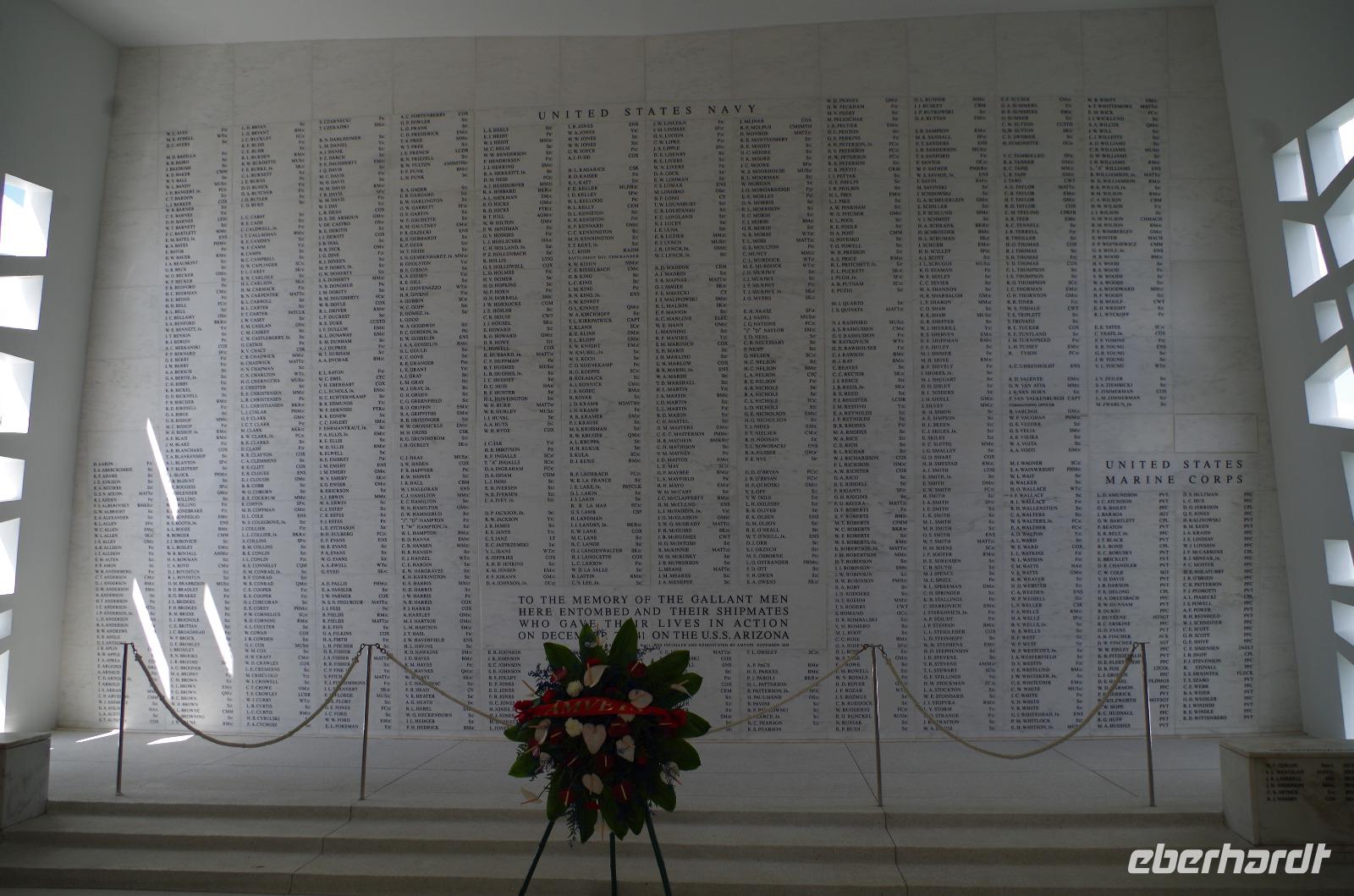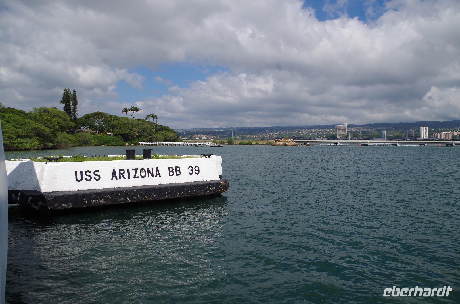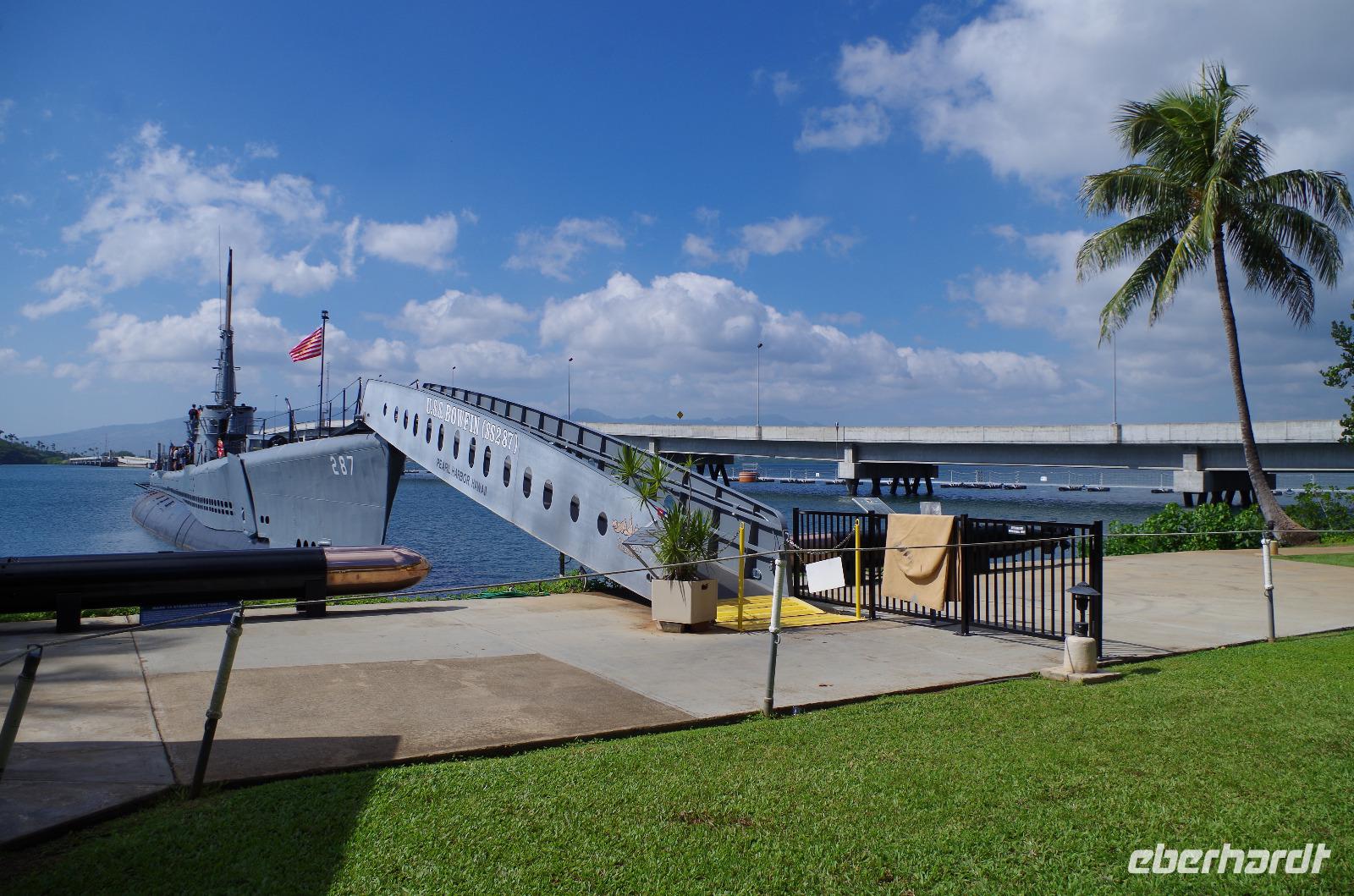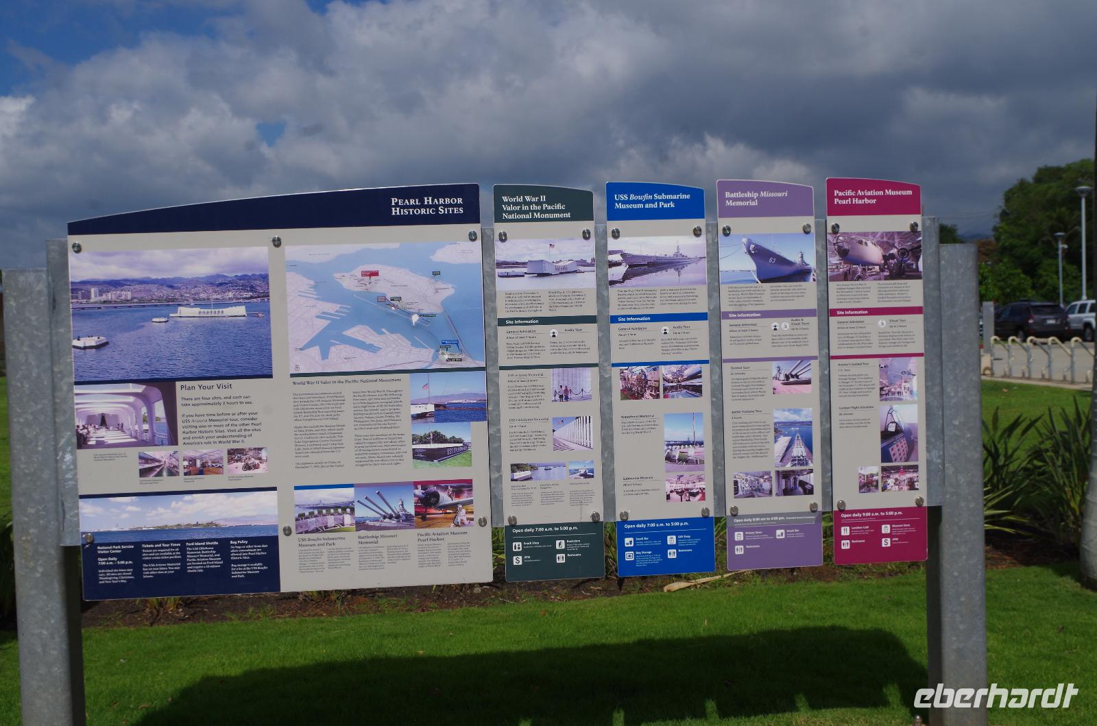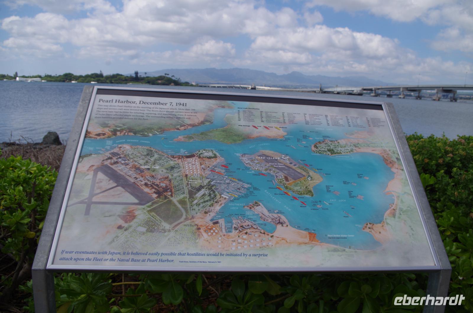 In unserer ersten Nacht auf O'ahu haben wir sehr gut geschlafen und eigentlich steht einem sonnigen und schönen Tag nichts im Weg. Dabei liegt aber die Betonung auf dem Wort 'eigentlich'. Unser Frühstück ist um 07.30 Uhr im Restaurant "Cinnamon's at the 'Ilikai" reserviert. Jedoch gibt es anfangs noch ein kleines Problem bei der Rechnung sowie bei der Essensauswahl. Das Restaurant befindet sich zwar im Hotelgebäudekomplex, es gehört aber nicht zum Hotel dazu. Die Unklarheit können wir aber schnell klären. Wir haben kein Buffet an diesem Morgen, sondern wir werden bedient. Wir können wählen zwischen Toast oder Pancakes, Rührei oder Spiegelei, gebratenem Schinken oder leckerer süßer Ananas. Es werden uns auch verschiedene Marmeladen, Honig und Butter sowie Kaffee oder Tee gereicht. Bei Bedarf können wir "Nachschub" ordern. Bevor wir uns um 08.30 Uhr zur Stadtrundfahrt in der Hotellobby treffen, befindet sich bei den Aufzügen ein wichtige Tagesinformation. Der Präsident der Vereinigten Staaten, Donald Trump, wird auf seiner Asien-Reise heute und morgen einen Zwischenstopp in Honolulu einlegen und Pearl Harbour besuchen. Für uns ist dieser Besuch eher ungünstig, da dadurch auch Straßensperrungen in Honolulu vorgesehen sind und wir uns vorsichtshalber eher als geplant nach Pearl Harbour begeben werden, unsere eigentliche Tour ist für 13.00 Uhr geplant. Dann schauen wir mal, ob wir Donald Trump auch persönlich sehen werden ;-) An diesem sonnigen Tag steht eine Stadtrundfahrt durch Honolulu und die Besichtigung von Pearl Harbour auf unserem Plan, beides 'eigentlich' mit deutschsprachiger Reiseleitung! Hier fällt also schon das erste 'eigentlich' an diesem Tag! Es wird leider auch nicht das letzte Mal sein, dass dieses Wort am heutigem Tag fällt :-( Statt eines deutschsprachigen Reiseleiters haben wir heute einen englischsprechenden "Driverguide", also einen Busfahrer, welcher auch als Guide tätig ist. Unser Busfahrer Ron ist wirklich super, auch wenn er nicht wirklich ein Reiseleiter ist. Dennoch versucht er auf unsere Wünsche einzugehen und auch die Stadtrundfahrt daran anzupassen. Die Fragen zu den verschiedensten Themen der Gäste werden durch die Reisebegleitung übersetzt, unser englischsprachiger Busfahrer versucht diese so gut es ihm möglich ist zu beantworten. Es ist natürlich sehr schade, dass unser heutiger Tag nicht wie geplant verläuft, aber Eberhardt und die Reisebegleitung versprechen, einen deutschsprachigen Reiseleiter für den Abreisetag zu organisieren, an welchem Tag wir wirklich lediglich einen englischsprachigen "Driverguide" gehabt hätten. Das Versprechen wird natürlich auch eingehalten ;o) Dank unseres netten örtlichen Reiseleiters am Abreisetag werden wir noch einen gelungenen Abschied von Honolulu haben, dazu aber später mehr! Um 09.00 Uhr beginnt unsere Stadtrundfahrt. Da die Insel O'ahu oftmals als Versammlungsort genutzt wird, besitzt sie den Beinnamen "The Gathering Place". Seit 1850 ist Honolulu die hawaiianische Hauptstadt. In Honolulu, was mit "Zuflucht oder geschützte Bucht" übersetzt werden kann, leben fast eine Million Menschen. Wir fahren zum Hawaii Capital Historic District und besichtigen Ali'iolani Hale und den Iolani Palace an der South King Street. Im Ali'iolani Hale befindet sich der Oberste Gerichtshof von Hawaii. Davor steht die wohl bekannteste Statue des Königs Kamehameha I., welcher 1810 die Inseln Hawaiis zu einem Königreich vereinigt hatte und als großer Führer, Krieger und Diplomat galt. Der sich direkt gegenüber befindende Iolani Palace ist die ehemalige königliche Residenz. Seit 1978 ist der Iolani Palace ein historisches Museum und für die Öffentlichkeit zugänglich. Im Jahre 1966 wurde die Organisation "The Friends of Iolani Palace" von Lili'uokalani Kawananakoa Morris, eine Großnichte der Königin Kapiolani, ins Leben gerufen. Diese Organisation kümmert sich um den Erhalt, die Restaurierung und die Bekanntgabe der Geschichte des Palastes sowie übernimmt sie die Verwaltung des Gebäudes und auch die Veranstaltung abwechslungsreicher Aktivitäten im und um den Palast herum. Es werden zudem eine Audiotour oder geführte Besichtigungstouren im Palast von Dienstag bis Samstag angeboten. Anschließend fahren wir am berühmten Strand "Waikiki Beach" entlang. Waikiki besteht aus zwei Hauptstraßen. Einerseits ist dies die Kalakaua Avenue mit den luxuriösen Designer-Geschäften und andererseits die Kuhio Avenue mit vielen Cafés, Restaurants und Nachtclubs. Nächster Programmpunkt ist der Punchbowl Crater, wo wir allerdings nur aus dem Bus heraus fotografieren dürfen. Es ist nicht erlaubt, an diesem historischen Denkmal anzuhalten oder auszusteigen. Also fährt uns Ron so langsam wie möglich an der mit fast sieben Millionen Besuchern im Jahr meistbesuchten Touristenattraktion auf O'ahu vorbei. Der Krater ist ein erloschener Vulkan mit hawaiianischen Namen Puowaina, was in Bezug auf die Menschenopfer mit "Hügel des Ablegens" übersetzt werden kann. Der größte hawaiianische Soldatenfriedhof mit fast 37.000 beerdigten amerikanischen Soldaten, das National Memorial of the Pacific, befindet sich inmitten des erloschenen Kraters. Danach fahren wir weiter Richtung Pearl Harbour. An dieser Stelle sei zu erwähnen, dass wir uns in Pearl Harbour auf einem Marinestützpunkt bewegen und es daher strenge Sicherheitsvorschriften gibt. Wir dürfen keine Taschen und Rucksäcke mitnehmen sowie keine Fototasche oder auch größere Gürteltasche. Bestenfalls werden nur die Geldbörse, das Mobilfunkgerät und die Kamera mitgenommen. Die anderen Sachen können wir im Bus liegenlassen, unser Busfahrer bleibt die komplette Zeit unseres Besuches im Bus. Es gibt aber auch die Möglichkeit, die Sachen für 4 USD je Tasche oder Rucksack beim Sicherheitspersonal abzugeben. Schließfächer gibt es keine. Wie bereits erwähnt sollte unsere Tour erst 13.00 Uhr starten, was aber erst in eineinhalb Stunden wäre. Aber dank unseres t