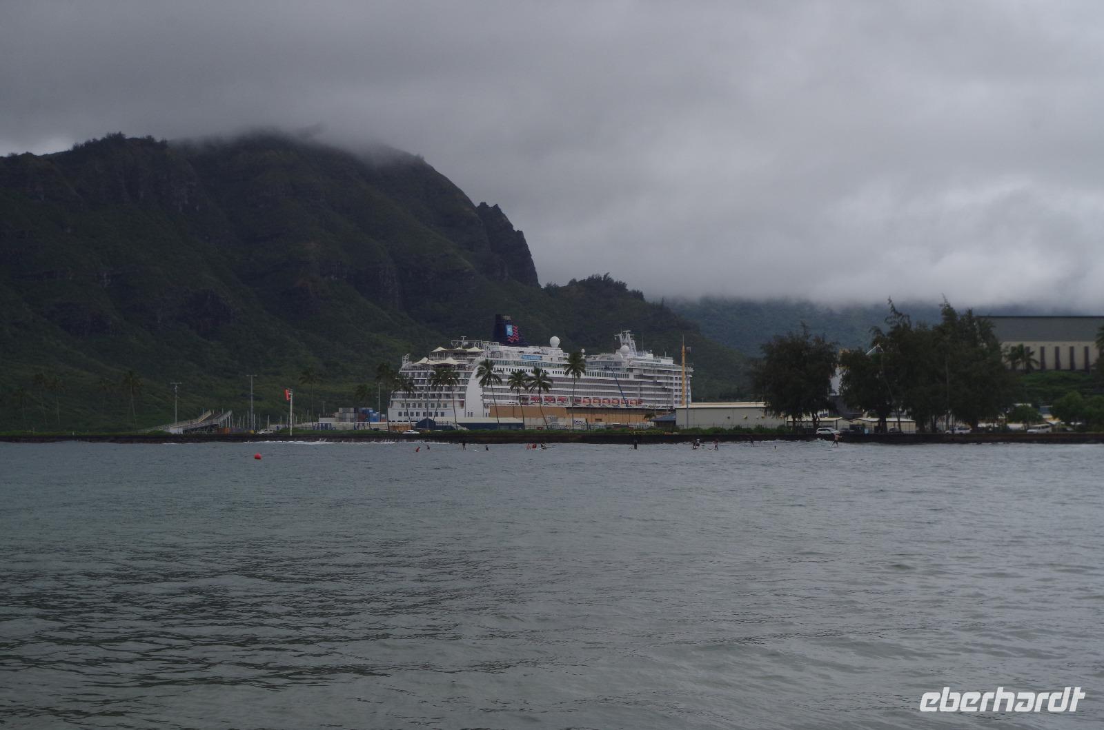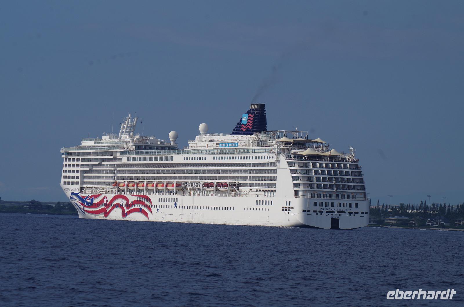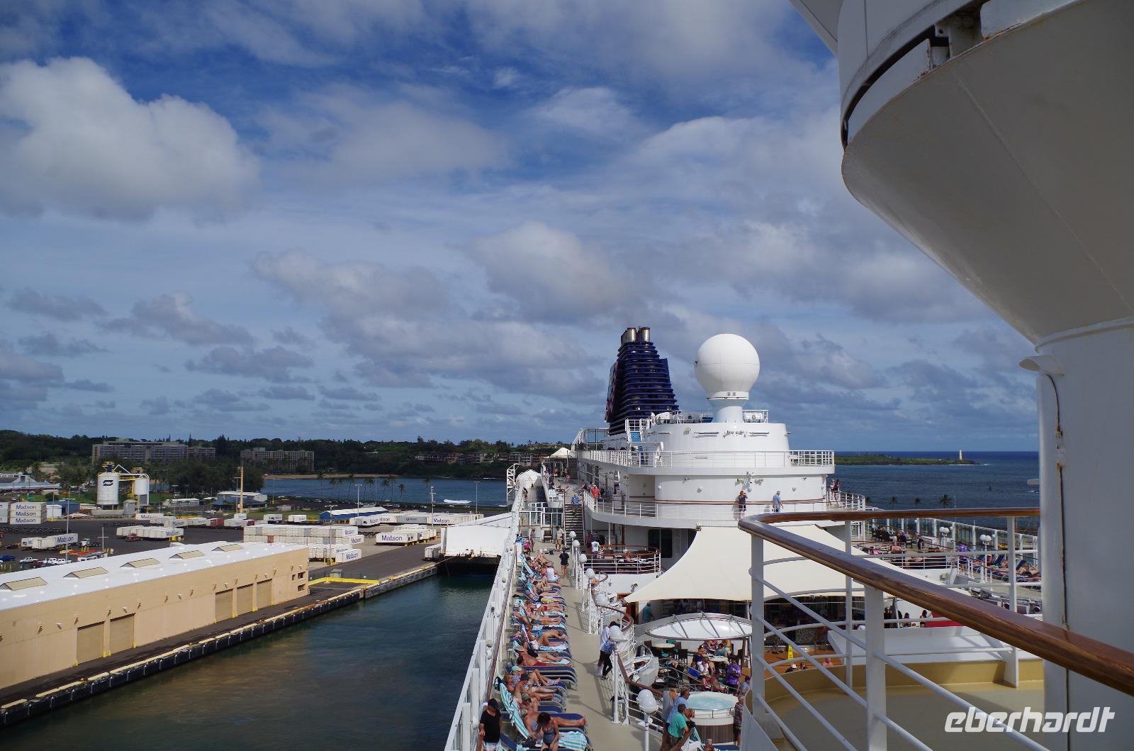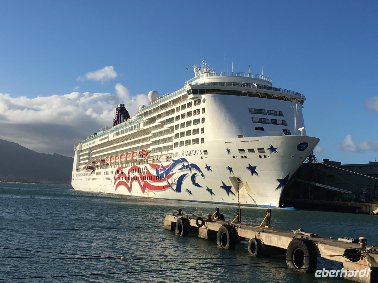Abermals werden wir von warmen Sonnenstrahlen geweckt und treffen uns zwischen 07.30 Uhr und 08.00 Uhr zum Frühstück im Restaurant "Cinnamon's at the 'Ilikai". Es gibt zwar eine bestimmte Frühstückszeit ab 07.30 Uhr von rund einer Stunde für unsere Gruppe, aber die Gäste können ganz in Ruhe bis 09.00 Uhr frühstücken. Nicht so schön sind allerdings die Vögel über unseren Köpfen, welche bereits darauf lauern, etwas von unserem Frühstück abzubekommen. Aber solange sie nur schauen, stört uns das nicht weiter. Uns steht die gleiche Auswahl wie gestern zur Verfügung, zusätzlich erhalten die Gäste heute ein Glas frischgepressten Saft dazu, besonders Grapefruit-, Ananas- und Organgensaft können wir empfehlen. Gegen 09.00 Uhr haben wir ausreichend gefrühstückt und unsere Koffer sind gepackt, der Check-Out funktioniert einwandfrei. Unsere Koffer sind mit den Papier-Kofferanhängern von NCL zu versehen, welche die Gäste circa drei Wochen vor Abreise von Eberhardt TRAVEL erhalten haben. Die Reisebegleitung leiht sich von der Rezeption einen Tacker und Klebeband aus, damit wir die Anhänger gut an unseren Koffern befestigen können. Unser Bus steht bereit und wir fahren gegen 10.35 Uhr vom Hotel zur Anlegestelle der "Pride of America", dem Pier 2 im Hafen von Honolulu. Den Pier erreichen wir rund 25 Minuten später. Unsere Koffer können wir auf zwei verschiedene Art und Weisen aufgeben. Entweder werden sie durch das Personal von NCL verladen oder wir geben sie selbstständig auf. Wir entscheiden uns für die zweite Variante, da wir keine Menschenschlange vor uns haben und es somit schneller geht. Dann muss jeder Reisegast ein Gesundheitsformular ausfüllen, wobei die Reisebegleitung bei der Übersetzung behilflich ist. Für die Sicherheitskontrolle benötigen wir am Eingang unser mit den Reiseunterlagen erhaltenes Kreuzfahrtticket, den Reisepass und das zuvor ausgefüllte Gesundheitsformular. Des Weiteren ist es auf der NCL nicht mehr erlaubt, volle oder halbvoll gefüllte Getränkeflaschen an Bord zu nehmen. Diese Regelung wurde eingeführt, da wohl in der Vergangenheit zu viele Gäste Alkohol in Plastikflaschen an Bord geschmuggelt haben sollen und NCL dies mit der neuen Regelung unterbinden möchte. Demnach dürfen wir nur leere Getränkeflaschen an Bord nehmen. Nach der Sicherheitskontrolle erhalten wir die typischen hawaiianischen Ketten, frische Lei-Blumenketten für die Frauen und Muschelketten für die Männer. Die Lei-Ketten mit den frischen Blumen verwelken in der Regel nach ein bis zwei Tagen, so dass ein gemeinsames Gruppenfoto mit unseren Ketten innerhalb der ersten zwei Tage erfolgen wird :-) Anschließend gehen wir einzeln oder paarweise zum Check-In-Schalter, hinterlegen unsere Kreditkartendaten und erhalten unsere Bordkarte und auch das deutsche Programmheft. Eine Bezahlung mit Bargeld ist ebenso möglich, dies wird aber bei der Rezeption an Bord eingezahlt. Die Summe muss mindestens 300 USD pro Kabine betragen. Dann besteht die Möglichkeit ein Willkommensfoto machen zu lassen, was von uns aber nicht gewünscht ist. Beim Check-In haben wir alle eine sogenannte "Boarding-Nummer" erhalten. Im Wartebereich sind ausreichend Stühle vorhanden, so warten wir gemeinsam bis unsere Nummern 4 und 5 angerufen werden und wir an Bord gehen können. Gegen 12.00 Uhr heißt es dann endlich "Willkommen an Bord!", wobei unsere Freude ein wenig getrübt wird, nachdem wir erfahren, dass die Kabinen noch nicht freigegeben sind und auch die Türen zu den Gängen verschlossen sind. Die Kabinen sind ab 14.00 Uhr etagenweise bezugsfertig. Auf dem Pooldeck 11 sind glücklicherweise genügend Sonnenliegen vorhanden und das Wetter ist traumhaft. Wir wechseln uns mit dem Mittagessen ab, so dass wir nicht das komplette Handgepäck mitnehmen müssen. Mittagessen im Buffetrestaurant "Aloha Café" auf Deck 11 Mitte ist von 11.30 Uhr bis 16.00 Uhr und im "Key West Bar & Grill" auf Deck 12 Bug von 12.00 Uhr bis 16.00 Uhr möglich. Nach und nach sind unsere Kabinen bezugsfertig und die Gänge auf den einzelnen Decks werden geöffnet, dabei wird von oben begonnen, Deck 12 bis 4 abwärts. Die Durchsagen sind anfangs in einem sehr schnellen und schwer verständlichen Englisch, dies bessert sich aber während der Reise. Um 15.15 Uhr findet ein deutsches Informationstreffen mit der internationalen Gästebetreuung an Bord, Edward Brown, im Shuffles auf Deck 6 vorn am Bug auf Steuerbord-Seite statt. Die Gäste können sich entspannen, alle wichtigen Informationen erhalten sie von ihrer Reisebegleitung, welche an diesem Treffen teilnimmt. Um 16.00 Uhr treffen wir uns in der Hotellobby "Capitol Atrium" beim Gästeservice oder auch Rezeption auf Deck 5 Mitte und unternehmen einen kurzen gemeinsamen Rundgang auf dem Schiff. Interessant ist sicher auch, dass es auf dem Schiff kein Kasino gibt und ein Duty Free Shop wird auch nicht angeboten. Es dürfen keine Kasinos und Zollfreiläden angeboten werden, da sich das Schiff die komplette Zeit in hawaiianischen Gewässern befindet. Glücksspiel jeglicher Art sind laut hawaiianischen Rechtsvorschriften gesetzwidrig. Rund 45 Minuten später findet die obligatorische Seenotrettungsübung gemäß dem internationalen Seefahrtsgesetz SOLAS "Safety of Life at Sea" und den Bestimmungen der US Küstenwache an den Sammelstationen auf Deck 5 und 6 statt. Es ertönt ein vom Kapitän angekündigtes aus sieben kurzen und einem langen Ton bestehendes Signal. Dann müssen alle Passagiere zur jeweiligen Sammelstation, auch Musterstation genannt, gehen. Der Stationsbuchstabe steht jeweils auf der Innenseite der Kabinentür, der Schwimmweste und auch auf der Bordkarte. Die Schwimmweste befindet sich in der Kabine im Kleiderschrank. Auf der NCL "Pride of America" benötigen wir für die Sicherheitsübung keine Rettungsweste, also lassen wir diese gleich in der Kabine. Um 17.45 Uhr findet ein Hula-Tanzen auf dem Pooldeck 11 statt und um 18.00 Uhr treffen sich alle Gäste und die R