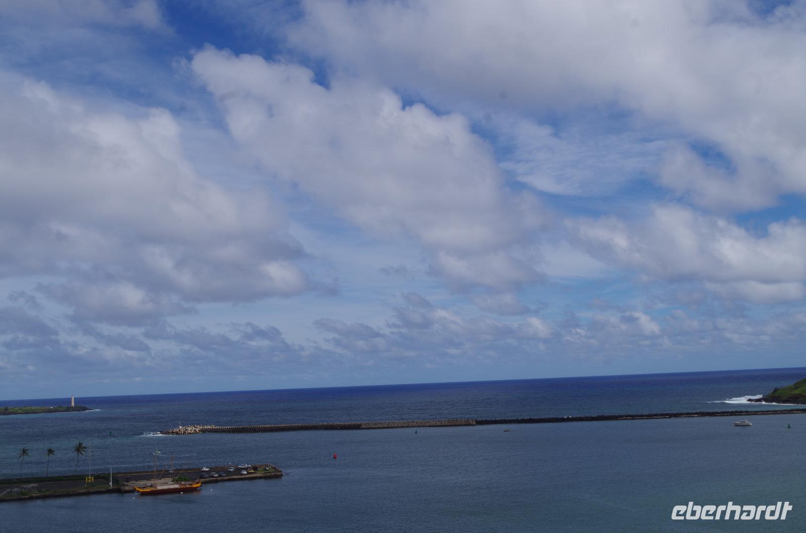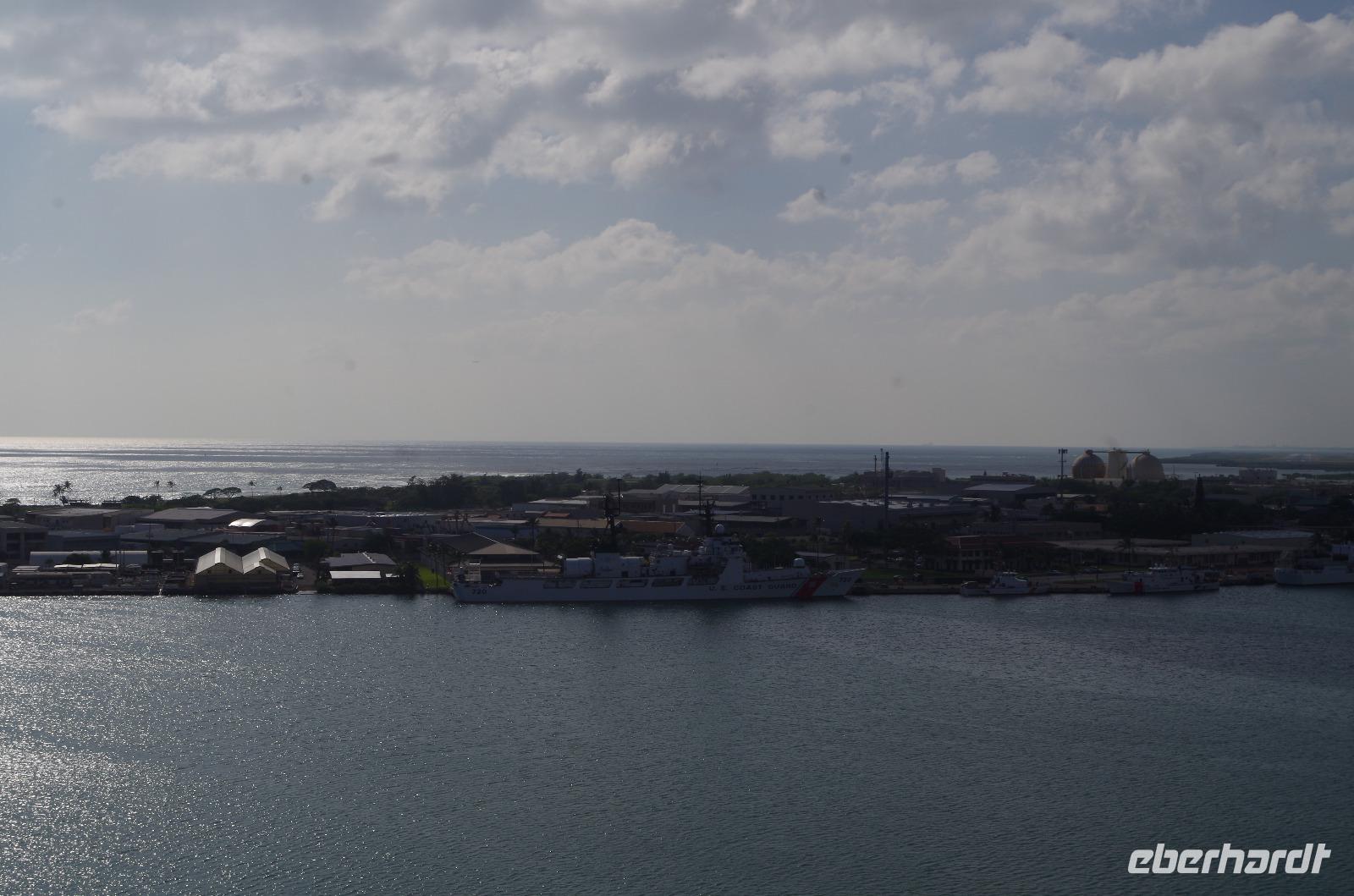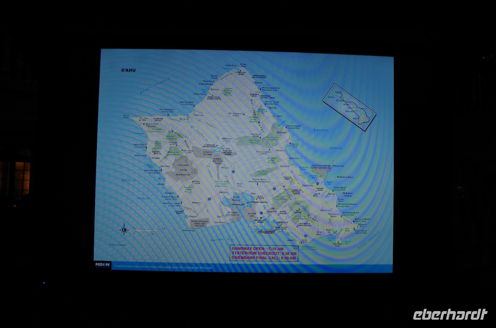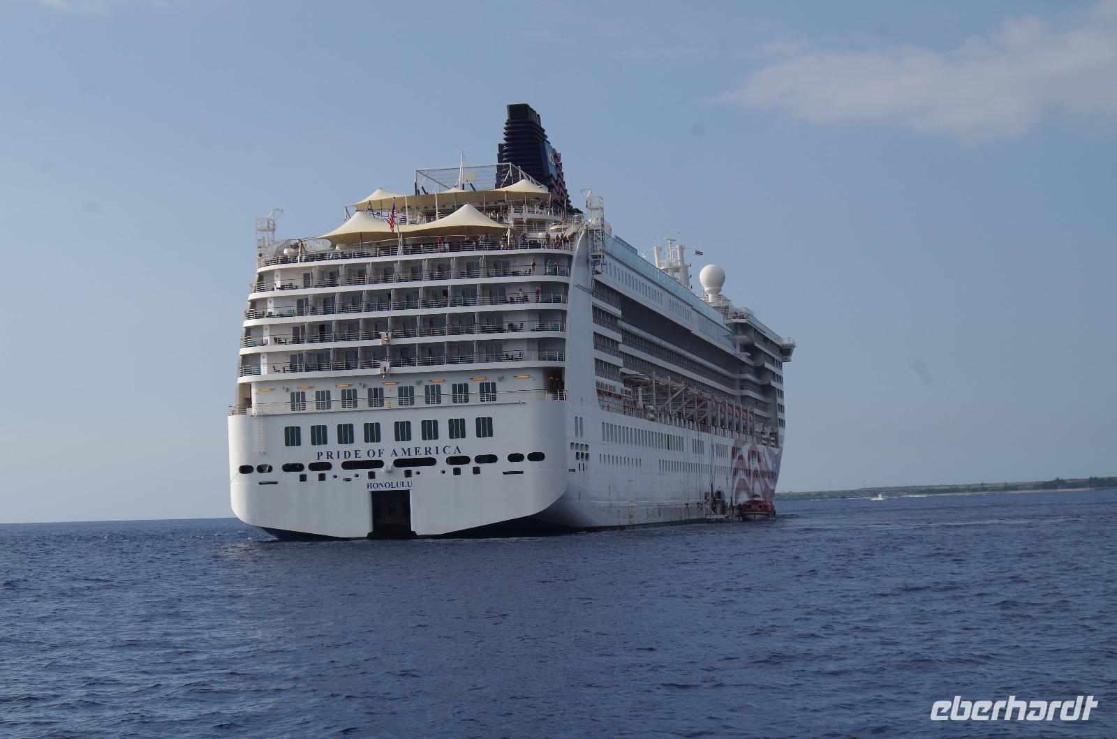 Abermals werden wir von warmen Sonnenstrahlen geweckt und treffen uns zwischen 07.30 Uhr und 08.00 Uhr zum Frühstück im Restaurant "Cinnamon's at the 'Ilikai". Es gibt zwar eine bestimmte Frühstückszeit ab 07.30 Uhr von rund einer Stunde für unsere Gruppe, aber die Gäste können ganz in Ruhe bis 09.00 Uhr frühstücken. Nicht so schön sind allerdings die Vögel über unseren Köpfen, welche bereits darauf lauern, etwas von unserem Frühstück abzubekommen. Aber solange sie nur schauen, stört uns das nicht weiter. Uns steht die gleiche Auswahl wie gestern zur Verfügung, zusätzlich erhalten die Gäste heute ein Glas frischgepressten Saft dazu, besonders Grapefruit-, Ananas- und Organgensaft können wir empfehlen. Gegen 09.00 Uhr haben wir ausreichend gefrühstückt und unsere Koffer sind gepackt, der Check-Out funktioniert einwandfrei. Unsere Koffer sind mit den Papier-Kofferanhängern von NCL zu versehen, welche die Gäste circa drei Wochen vor Abreise von Eberhardt TRAVEL erhalten haben. Die Reisebegleitung leiht sich von der Rezeption einen Tacker und Klebeband aus, damit wir die Anhänger gut an unseren Koffern befestigen können. Unser Bus steht bereit und wir fahren gegen 10.35 Uhr vom Hotel zur Anlegestelle der "Pride of America", dem Pier 2 im Hafen von Honolulu. Den Pier erreichen wir rund 25 Minuten später. Unsere Koffer können wir auf zwei verschiedene Art und Weisen aufgeben. Entweder werden sie durch das Personal von NCL verladen oder wir geben sie selbstständig auf. Wir entscheiden uns für die zweite Variante, da wir keine Menschenschlange vor uns haben und es somit schneller geht. Dann muss jeder Reisegast ein Gesundheitsformular ausfüllen, wobei die Reisebegleitung bei der Übersetzung behilflich ist. Für die Sicherheitskontrolle benötigen wir am Eingang unser mit den Reiseunterlagen erhaltenes Kreuzfahrtticket, den Reisepass und das zuvor ausgefüllte Gesundheitsformular. Des Weiteren ist es auf der NCL nicht mehr erlaubt, volle oder halbvoll gefüllte Getränkeflaschen an Bord zu nehmen. Diese Regelung wurde eingeführt, da wohl in der Vergangenheit zu viele Gäste Alkohol in Plastikflaschen an Bord geschmuggelt haben sollen und NCL dies mit der neuen Regelung unterbinden möchte. Demnach dürfen wir nur leere Getränkeflaschen an Bord nehmen. Nach der Sicherheitskontrolle erhalten wir die typischen hawaiianischen Ketten, frische Lei-Blumenketten für die Frauen und Muschelketten für die Männer. Die Lei-Ketten mit den frischen Blumen verwelken in der Regel nach ein bis zwei Tagen, so dass ein gemeinsames Gruppenfoto mit unseren Ketten innerhalb der ersten zwei Tage erfolgen wird :-) Anschließend gehen wir einzeln oder paarweise zum Check-In-Schalter, hinterlegen unsere Kreditkartendaten und erhalten unsere Bordkarte und auch das deutsche Programmheft. Eine Bezahlung mit Bargeld ist ebenso möglich, dies wird aber bei der Rezeption an Bord eingezahlt. Die Summe muss mindestens 300 USD pro Kabine betragen. Dann besteht die Möglichkeit ein Willkommensfoto machen zu lassen, was von uns aber nicht gewünscht ist. Beim Check-In haben wir alle eine sogenannte "Boarding-Nummer" erhalten. Im Wartebereich sind ausreichend Stühle vorhanden, so warten wir gemeinsam bis unsere Nummern 4 und 5 angerufen werden und wir an Bord gehen können. Gegen 12.00 Uhr heißt es dann endlich "Willkommen an Bord!", wobei unsere Freude ein wenig getrübt wird, nachdem wir erfahren, dass die Kabinen noch nicht freigegeben sind und auch die Türen zu den Gängen verschlossen sind. Die Kabinen sind ab 14.00 Uhr etagenweise bezugsfertig. Auf dem Pooldeck 11 sind glücklicherweise genügend Sonnenliegen vorhanden und das Wetter ist traumhaft. Wir wechseln uns mit dem Mittagessen ab, so dass wir nicht das komplette Handgepäck mitnehmen müssen. Mittagessen im Buffetrestaurant "Aloha Café" auf Deck 11 Mitte ist von 11.30 Uhr bis 16.00 Uhr und im "Key West Bar & Grill" auf Deck 12 Bug von 12.00 Uhr bis 16.00 Uhr möglich. Nach und nach sind unsere Kabinen bezugsfertig und die Gänge auf den einzelnen Decks werden geöffnet, dabei wird von oben begonnen, Deck 12 bis 4 abwärts. Die Durchsagen sind anfangs in einem sehr schnellen und schwer verständlichen Englisch, dies bessert sich aber während der Reise. Um 15.15 Uhr findet ein deutsches Informationstreffen mit der internationalen Gästebetreuung an Bord, Edward Brown, im Shuffles auf Deck 6 vorn am Bug auf Steuerbord-Seite statt. Die Gäste können sich entspannen, alle wichtigen Informationen erhalten sie von ihrer Reisebegleitung, welche an diesem Treffen teilnimmt. Um 16.00 Uhr treffen wir uns in der Hotellobby "Capitol Atrium" beim Gästeservice oder auch Rezeption auf Deck 5 Mitte und unternehmen einen kurzen gemeinsamen Rundgang auf dem Schiff. Interessant ist sicher auch, dass es auf dem Schiff kein Kasino gibt und ein Duty Free Shop wird auch nicht angeboten. Es dürfen keine Kasinos und Zollfreiläden angeboten werden, da sich das Schiff die komplette Zeit in hawaiianischen Gewässern befindet. Glücksspiel jeglicher Art sind laut hawaiianischen Rechtsvorschriften gesetzwidrig. Rund 45 Minuten später findet die obligatorische Seenotrettungsübung gemäß dem internationalen Seefahrtsgesetz SOLAS "Safety of Life at Sea" und den Bestimmungen der US Küstenwache an den Sammelstationen auf Deck 5 und 6 statt. Es ertönt ein vom Kapitän angekündigtes aus sieben kurzen und einem langen Ton bestehendes Signal. Dann müssen alle Passagiere zur jeweiligen Sammelstation, auch Musterstation genannt, gehen. Der Stationsbuchstabe steht jeweils auf der Innenseite der Kabinentür, der Schwimmweste und auch auf der Bordkarte. Die Schwimmweste befindet sich in der Kabine im Kleiderschrank. Auf der NCL "Pride of America" benötigen wir für die Sicherheitsübung keine Rettungsweste, also lassen wir diese gleich in der Kabine. Um 17.45 Uhr findet ein Hula-Tanzen auf dem Pooldeck 11 statt und um 18.00 Uhr treffen sich alle Gäste und die R