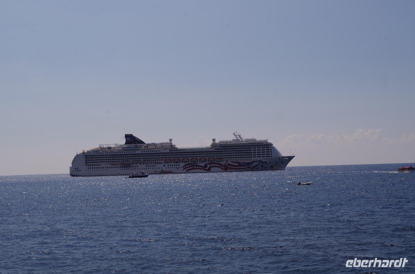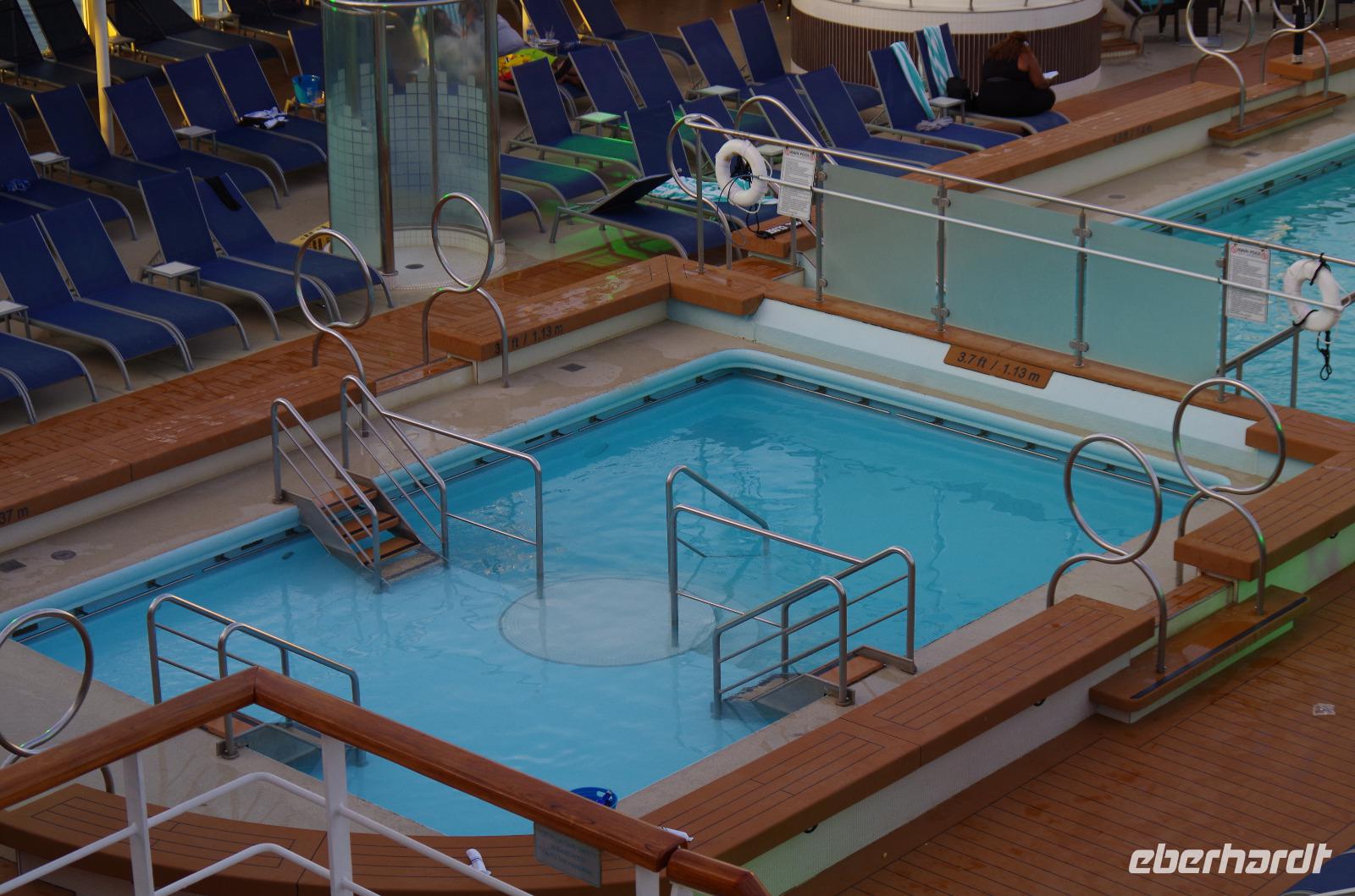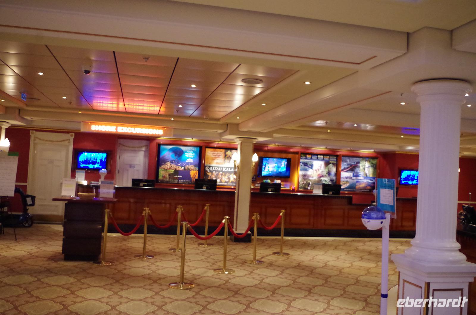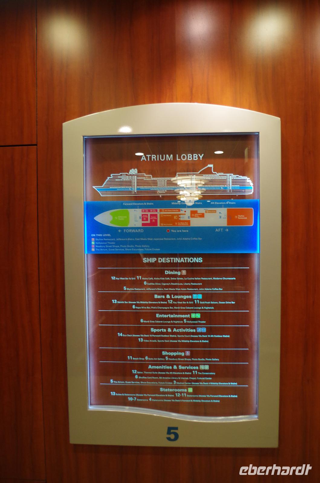 Abermals werden wir von warmen Sonnenstrahlen geweckt und treffen uns zwischen 07.30 Uhr und 08.00 Uhr zum Frühstück im Restaurant "Cinnamon's at the 'Ilikai". Es gibt zwar eine bestimmte Frühstückszeit ab 07.30 Uhr von rund einer Stunde für unsere Gruppe, aber die Gäste können ganz in Ruhe bis 09.00 Uhr frühstücken. Nicht so schön sind allerdings die Vögel über unseren Köpfen, welche bereits darauf lauern, etwas von unserem Frühstück abzubekommen. Aber solange sie nur schauen, stört uns das nicht weiter. Uns steht die gleiche Auswahl wie gestern zur Verfügung, zusätzlich erhalten die Gäste heute ein Glas frischgepressten Saft dazu, besonders Grapefruit-, Ananas- und Organgensaft können wir empfehlen. Gegen 09.00 Uhr haben wir ausreichend gefrühstückt und unsere Koffer sind gepackt, der Check-Out funktioniert einwandfrei. Unsere Koffer sind mit den Papier-Kofferanhängern von NCL zu versehen, welche die Gäste circa drei Wochen vor Abreise von Eberhardt TRAVEL erhalten haben. Die Reisebegleitung leiht sich von der Rezeption einen Tacker und Klebeband aus, damit wir die Anhänger gut an unseren Koffern befestigen können. Unser Bus steht bereit und wir fahren gegen 10.35 Uhr vom Hotel zur Anlegestelle der "Pride of America", dem Pier 2 im Hafen von Honolulu. Den Pier erreichen wir rund 25 Minuten später. Unsere Koffer können wir auf zwei verschiedene Art und Weisen aufgeben. Entweder werden sie durch das Personal von NCL verladen oder wir geben sie selbstständig auf. Wir entscheiden uns für die zweite Variante, da wir keine Menschenschlange vor uns haben und es somit schneller geht. Dann muss jeder Reisegast ein Gesundheitsformular ausfüllen, wobei die Reisebegleitung bei der Übersetzung behilflich ist. Für die Sicherheitskontrolle benötigen wir am Eingang unser mit den Reiseunterlagen erhaltenes Kreuzfahrtticket, den Reisepass und das zuvor ausgefüllte Gesundheitsformular. Des Weiteren ist es auf der NCL nicht mehr erlaubt, volle oder halbvoll gefüllte Getränkeflaschen an Bord zu nehmen. Diese Regelung wurde eingeführt, da wohl in der Vergangenheit zu viele Gäste Alkohol in Plastikflaschen an Bord geschmuggelt haben sollen und NCL dies mit der neuen Regelung unterbinden möchte. Demnach dürfen wir nur leere Getränkeflaschen an Bord nehmen. Nach der Sicherheitskontrolle erhalten wir die typischen hawaiianischen Ketten, frische Lei-Blumenketten für die Frauen und Muschelketten für die Männer. Die Lei-Ketten mit den frischen Blumen verwelken in der Regel nach ein bis zwei Tagen, so dass ein gemeinsames Gruppenfoto mit unseren Ketten innerhalb der ersten zwei Tage erfolgen wird :-) Anschließend gehen wir einzeln oder paarweise zum Check-In-Schalter, hinterlegen unsere Kreditkartendaten und erhalten unsere Bordkarte und auch das deutsche Programmheft. Eine Bezahlung mit Bargeld ist ebenso möglich, dies wird aber bei der Rezeption an Bord eingezahlt. Die Summe muss mindestens 300 USD pro Kabine betragen. Dann besteht die Möglichkeit ein Willkommensfoto machen zu lassen, was von uns aber nicht gewünscht ist. Beim Check-In haben wir alle eine sogenannte "Boarding-Nummer" erhalten. Im Wartebereich sind ausreichend Stühle vorhanden, so warten wir gemeinsam bis unsere Nummern 4 und 5 angerufen werden und wir an Bord gehen können. Gegen 12.00 Uhr heißt es dann endlich "Willkommen an Bord!", wobei unsere Freude ein wenig getrübt wird, nachdem wir erfahren, dass die Kabinen noch nicht freigegeben sind und auch die Türen zu den Gängen verschlossen sind. Die Kabinen sind ab 14.00 Uhr etagenweise bezugsfertig. Auf dem Pooldeck 11 sind glücklicherweise genügend Sonnenliegen vorhanden und das Wetter ist traumhaft. Wir wechseln uns mit dem Mittagessen ab, so dass wir nicht das komplette Handgepäck mitnehmen müssen. Mittagessen im Buffetrestaurant "Aloha Café" auf Deck 11 Mitte ist von 11.30 Uhr bis 16.00 Uhr und im "Key West Bar & Grill" auf Deck 12 Bug von 12.00 Uhr bis 16.00 Uhr möglich. Nach und nach sind unsere Kabinen bezugsfertig und die Gänge auf den einzelnen Decks werden geöffnet, dabei wird von oben begonnen, Deck 12 bis 4 abwärts. Die Durchsagen sind anfangs in einem sehr schnellen und schwer verständlichen Englisch, dies bessert sich aber während der Reise. Um 15.15 Uhr findet ein deutsches Informationstreffen mit der internationalen Gästebetreuung an Bord, Edward Brown, im Shuffles auf Deck 6 vorn am Bug auf Steuerbord-Seite statt. Die Gäste können sich entspannen, alle wichtigen Informationen erhalten sie von ihrer Reisebegleitung, welche an diesem Treffen teilnimmt. Um 16.00 Uhr treffen wir uns in der Hotellobby "Capitol Atrium" beim Gästeservice oder auch Rezeption auf Deck 5 Mitte und unternehmen einen kurzen gemeinsamen Rundgang auf dem Schiff. Interessant ist sicher auch, dass es auf dem Schiff kein Kasino gibt und ein Duty Free Shop wird auch nicht angeboten. Es dürfen keine Kasinos und Zollfreiläden angeboten werden, da sich das Schiff die komplette Zeit in hawaiianischen Gewässern befindet. Glücksspiel jeglicher Art sind laut hawaiianischen Rechtsvorschriften gesetzwidrig. Rund 45 Minuten später findet die obligatorische Seenotrettungsübung gemäß dem internationalen Seefahrtsgesetz SOLAS "Safety of Life at Sea" und den Bestimmungen der US Küstenwache an den Sammelstationen auf Deck 5 und 6 statt. Es ertönt ein vom Kapitän angekündigtes aus sieben kurzen und einem langen Ton bestehendes Signal. Dann müssen alle Passagiere zur jeweiligen Sammelstation, auch Musterstation genannt, gehen. Der Stationsbuchstabe steht jeweils auf der Innenseite der Kabinentür, der Schwimmweste und auch auf der Bordkarte. Die Schwimmweste befindet sich in der Kabine im Kleiderschrank. Auf der NCL "Pride of America" benötigen wir für die Sicherheitsübung keine Rettungsweste, also lassen wir diese gleich in der Kabine. Um 17.45 Uhr findet ein Hula-Tanzen auf dem Pooldeck 11 statt und um 18.00 Uhr treffen sich alle Gäste und die R