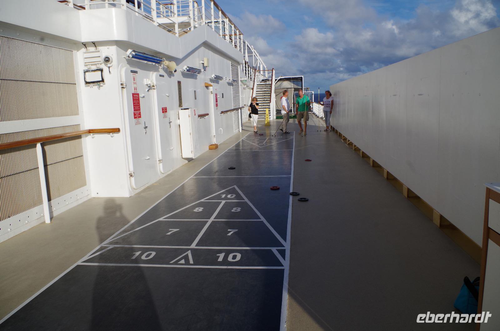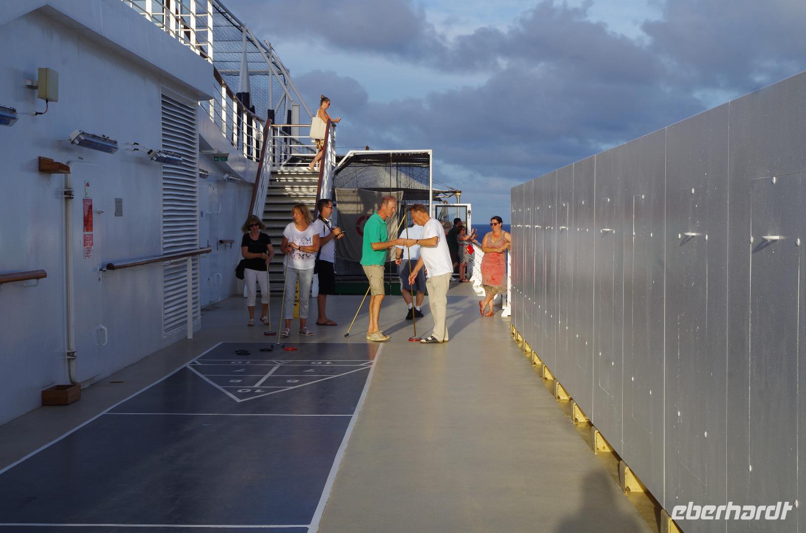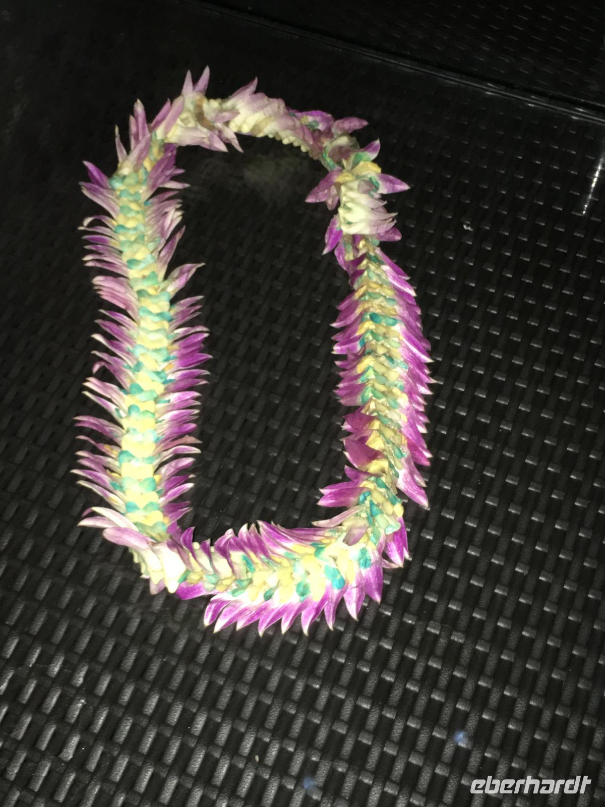 Während wir die vergangenen Tage von der Sonne verwöhnt wurden, scheint sie zu wissen, dass wir bald Hawaii verlassen werden. Der Himmel ist bedeckt und Regen liegt in der Luft. Das Frühstück genießen wir heute im Restaurant statt im Außenbereich. Um 09.00 Uhr treffen sich sieben Gäste und die Reisebegleitung am bekannten Ort, um gemeinsam zum Strand "Kalapaki Beach" zu laufen. Wir haben zwar leichten Sprühregen, aber dies macht sowohl der Reisebegleitung als auch den Gästen nicht wirklich etwas aus, da es sehr doch schwül-heiß ist und wir sowieso im Meer schwimmen gehen möchten. Während wir im Wasser sind, klart der Himmel langsam auf. Es regnet ab und zu, dennoch genießen wir das bis zu 25 Grad warme Wasser. Kostenfreies unbegrenztes WLAN kann beim Marriott's Kaua'i Beach Club empfangen werden, beim Anchor Cove Shopping Center rund zehn Gehminuten vom Schiff entfernt ist das kostenfreie WLAN auf 60 Minuten begrenzt. Gegen 11.30 Uhr spazieren wir wieder zum Schiff zurück. Wer möchte, kann sich um 12.00 Uhr hawaiianische Musik mit Lei Aloha im Capitol Atrium anhören. Um 12.15 Uhr findet die letzte hawaiianische Hula-Tanzstunde in der Mardi Gras Lounge in Vorbereitung auf die Pau Hana Hawaiianische Hula-Abschlussfeier im Capitol Atrium um 13.15 Uhr statt. Ein letztes Mal auf dieser Kreuzfahrt versuchen wir uns im Hula-Tanz und tanzen die Chorographie zu den Liedern in folgender Reihenfolge (1) "Thats's how we do the hula", (2) "Little grass shack" und (3) "Hukilau" zusammen mit unserem Tanzlehrer Kaulana Bucasas. Wer sich gern zuhause im Hula-Tanzen probieren möchte, kann gern zu diesen Liedern tanzen oder auf Empfehlung unseres Tanzlehrers auch zu den folgenden Titeln "That's the Hawaiian in me", Pearly shells", "Lovely hula hands", "Sophisticated Hula" oder "Puamana" (in Hawaiian). Alle an Bord heißt es 13.30 Uhr, so dass wir pünktlich um 14.00 Uhr von Nawiliwili, Kauai nach Honolulu, O'ahu starten können. Die Fahrt beträgt rund 345,4 Kilometer. Zum Nachmittag bietet die Reisebegleitung an, eine Runde Shuffleboard auf Deck 13 zu spielen. Wir sind fünf Personen, wobei die Frauen gegen die Männer antreten. Rund eine Stunde später gewinnen die Männer knapp mit 71 zu 63 Punkten. Die Frauen sind aber fairer Verliererinnen und gönnen den Männern ihren engen Sieg, aber nur ausnahmsweise *grins* Wir fahren am heutigen Tag gegen 17.15 Uhr an der Na Pali Küste entlang. Während wir die tolle Landschaft bestaunen, erleben wir auch einen wunderschönen Sonnenuntergang. Heute genießen wir ein letztes Mal ein köstliches Abendessen um 18.00 Uhr im Restaurant "Skyline" auf Deck 5 Heck. Wir verabschieden uns freundlich von unserem Kellner und danken ihm für eine schöne Zeit. Die Reisegäste haben heute noch eine besondere Einladung von Eberhardt erhalten. Wir treffen uns um 20.00 Uhr in der Napa Wine Bar auf Deck 6 zur Ausreiseinformation mit allen wichtigen Informationen für den morgigen Tag und der Verteilung der Kofferanhänger. Die Gäste sind zum Abschied auf ein Glas Sekt eingeladen und so stoßen wir gemeinsam auf eine wunderbare Reise an. Um 21.00 Uhr wird im Hollywood Theater "Vegas! Die Show" zum Abschluss gezeigt. Danach wird der ein oder andere Gast seinen Koffer zu Ende packen oder bereits schlafen gehen, Die Koffer sind mit den Kofferanhänger zu versehen und bis 00.00 Uhr vor die Kabinentür zu stellen. Wir gönnen uns eine entspannte Nacht bevor wir gefühlt die nächsten zwei Tage viel Zeit im Flugzeug verbringen werden.