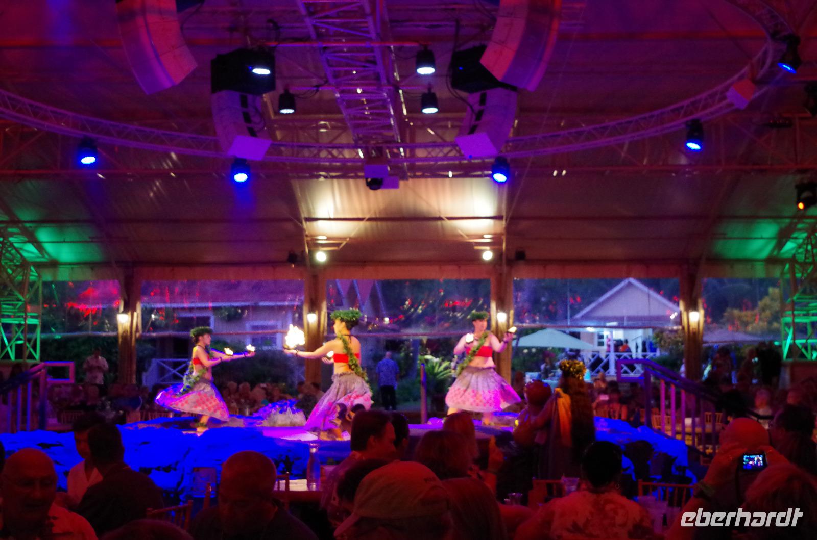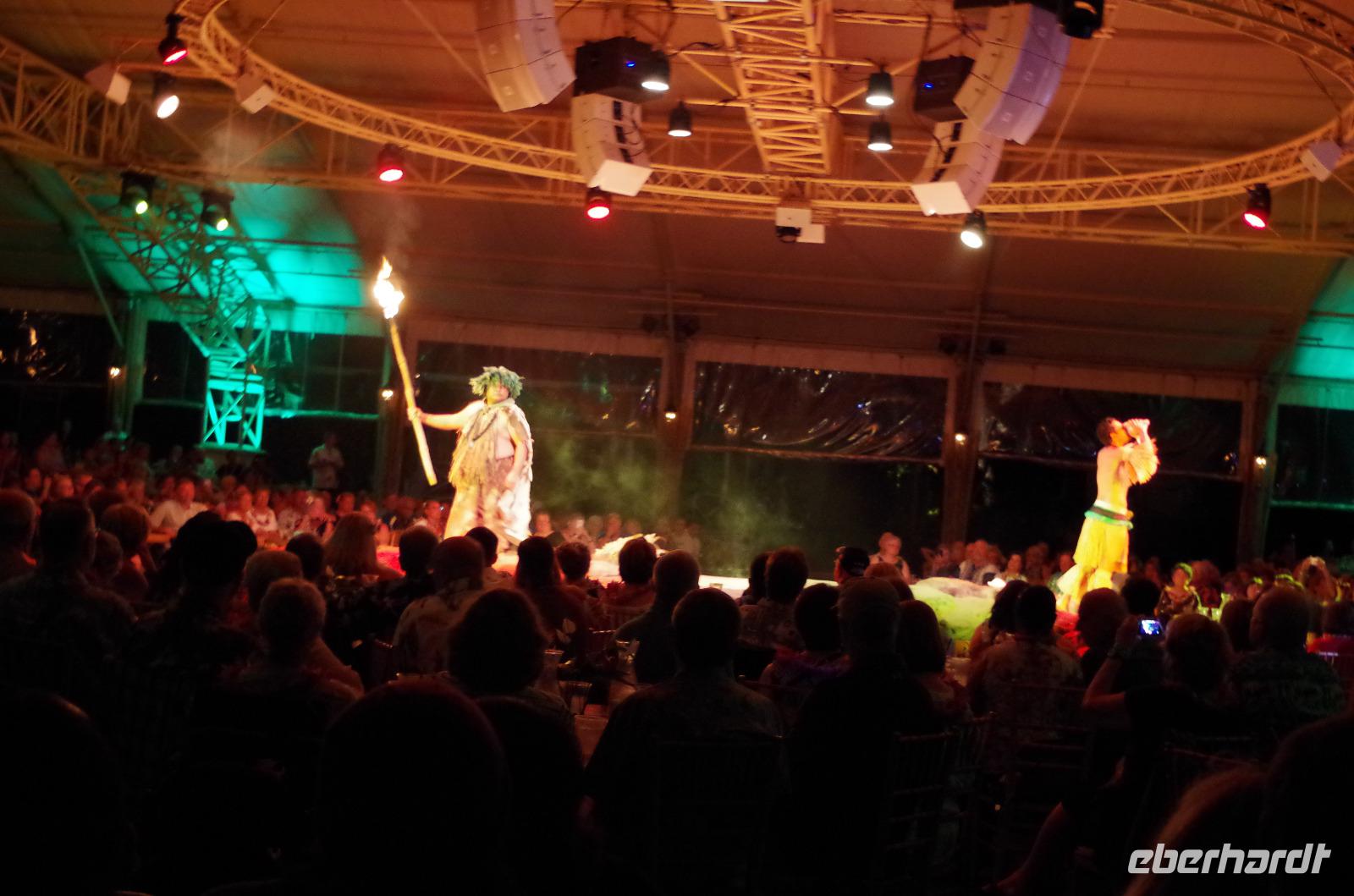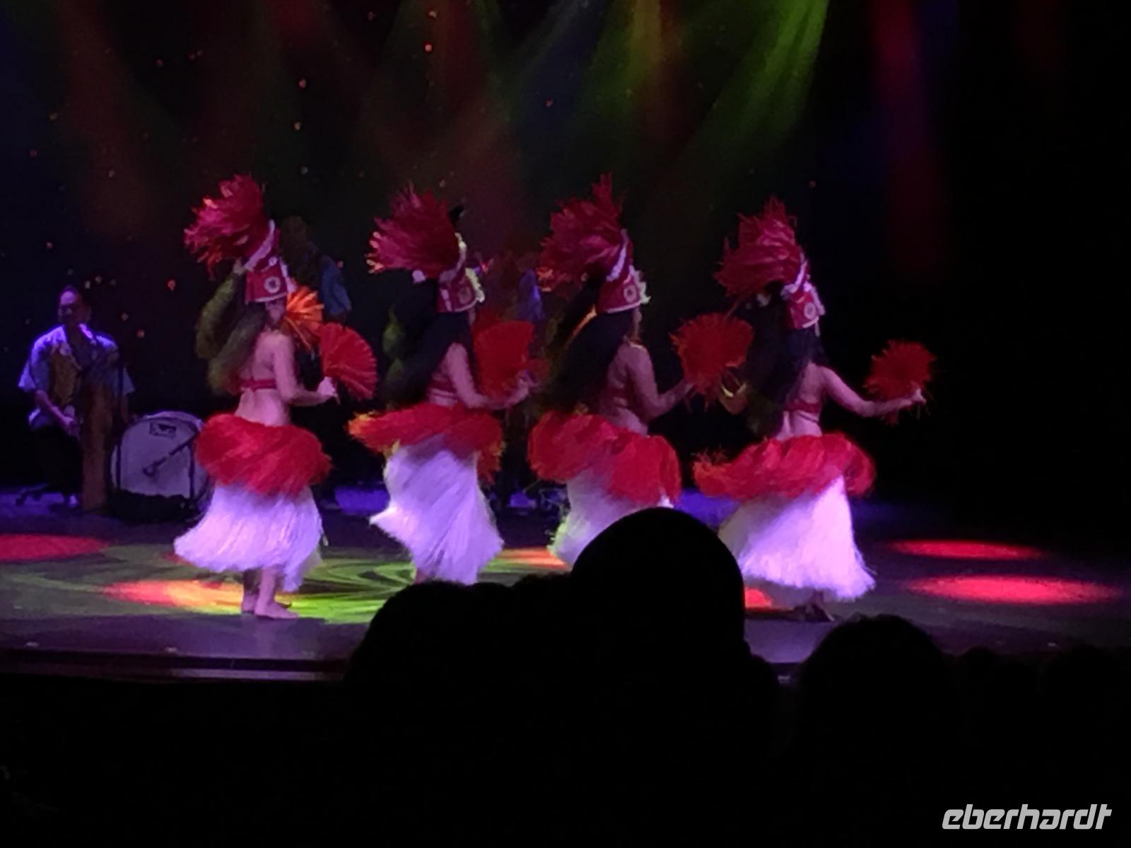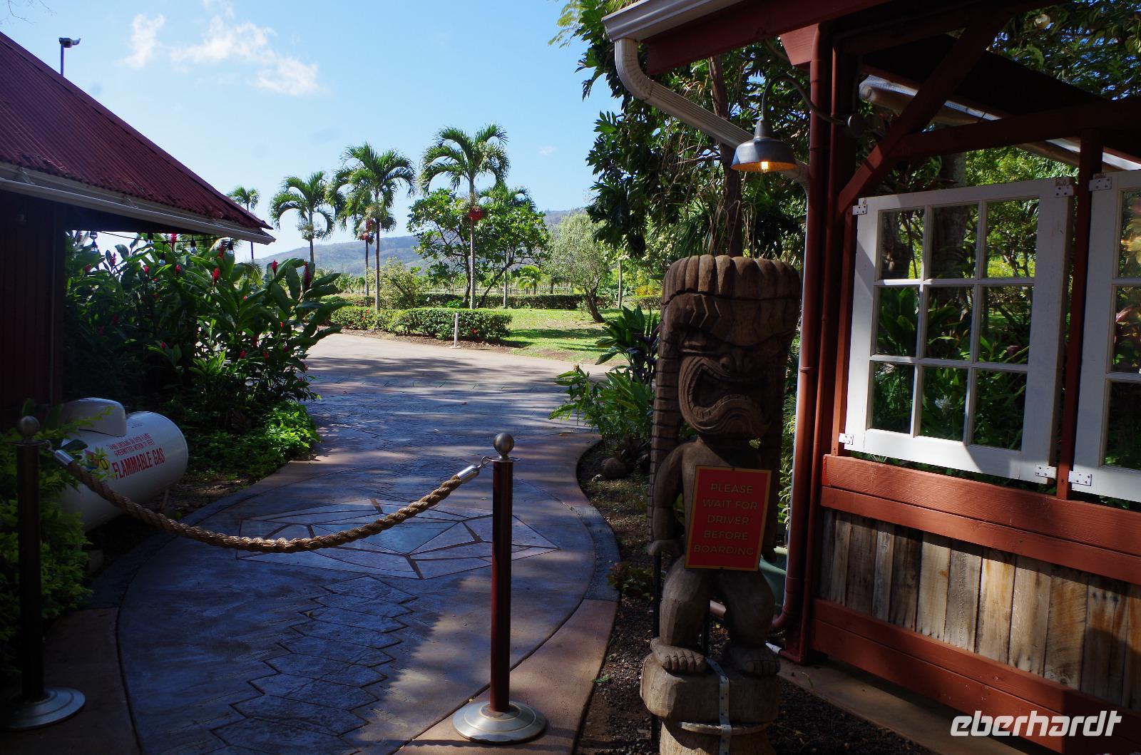 Pünktlich um 08.00 Uhr erreichen wir das touristische Städtchen Nawiliwili auf Kauai. Die Sonne lacht und es verspricht ein wunderbarer Tag zu werden. Kauai wird auch als Garteninsel bezeichnet, da sie mit üppigen Wäldern und vielen verschiedenen Laubbäumen versehen ist. Die Küste ist rund 1.776 Kilometer lang, wovon circa 50 Prozent Sandstrand sind. Die Insel Kauai ist bereits 5,8 Millionen Jahr alt und somit die älteste der größeren Inseln auf Hawaii. Wir genießen ein leckeres Frühstück im Buffetrestaurant und im Hauptrestaurant. Um 10.00 Uhr treffen sich fünf Gäste und die Reisebegleitung in der Hotellobby "Capitol Atrium", um gemeinsam von Bord zu gehen und in einem Großraumtaxi für bis zu sechs Personen eine individuelle Rundfahrt auf Kauai zum Weimea Canyon Lookout zu unternehmen. Die Preise sind ähnlich wie auf Maui, das Trinkgeld können die Gäste abermals selbst bestimmen und eine Ausflugsdauer von vier Stunden ist zu empfehlen. Das Taxi wurde bei Ankunft auf Kauai durch die Reisebegleitung organisiert, im Hafengelände stehen wie auf Maui verschiedene Taxiunternehmen für eine individuelle Tour auf Anfrage zur Verfügung. Unterwegs zum Weimea Canyon Lookout legen wir gegen 10.45 Uhr einen Foto-Stopp und Harmoniepause am "Russian Fort Elizabeth" ein. Die Fahrt im Taxi ist wieder sehr angenehm in bequemen Sitzen. Auf dem Weg zum Canyon erwarten uns viele Kurven und eine Serpentinenstraße, da fahren wir lieber zu sechst im Taxi statt mit rund 50 Gästen im Reisebus! Gegen 11.30 Uhr genießen wir einen tollen Blick auf den Weimea Canyon und die atemberaubende Landschaft. Auf der Rückfahrt legen wir mehrere kurze Foto-Stopps ein. Um 14.10 Uhr sind wir wieder im Hafen von Nawiliwili, Kauai zurück und verabschieden uns freundlich von unserem netten Taxifahrer. Zurück an Bord haben wir gar nicht viel Zeit, da sich alle Gäste und die Reisebegleitung um 15.30 Uhr in der Hotellobby "Capitol Atrium" zum heute gebuchten NCL-Ausflug NWK18 "Luau Kalamaku & Plantagenzug" trifft. Wir gehen gemeinsam ins Hollywood Theater auf Deck 5, wo wir ein grünes Papierarmband für den Eintritt zur Show und zum Essen erhalten. Auf Nachfrage beim NCL Personal können wir als Gruppe noch vor den NCL-Gästen von Bord gehen und bereits im Hafengelände warten. Wir erhalten zudem die wichtige Mitteilung, dass wir uns um 16.30 Uhr an der Zugstation der Plantage "Kilohana" einfinden müssen, um mit dem Plantagenzug zu fahren. Verpassen wir die für uns festgelegte Uhrzeit um 16.45 Uhr, dann können wir nicht mit dem Zug fahren. Aber unsere Eberhardt-Reisegruppe ist immer pünktlich, so dass wir auch in diesem Fall zur richtigen Zeit am Bahnhof stehen werden. Bereits ein paar Tage vor dem Ausflug haben wir einen Zettel auf die Kabine erhalten, auf welchen wir angeben sollten, mit wem wir während der Veranstaltung zusammensitzen möchten. Die Tischreservierung hat die Reisebegleitung für alle Gäste vorgenommen und wir werden am Tisch 214 platziert. Pünktlich um 16.00 Uhr beginnt der NCL-Ausflug NWK18 "Luau Kalamaku & Plantagenzug". Mit dem Bus fahren wir vom Hafen aus rund fünf bis zehn Minuten zur Plantage "Kilohana". Wir werden herzlich mit frischen Lei-Ketten für die Damen und Muschelketten für die Herren empfangen. Direkt am kleinen Bahnhof erhalten wir zwei Getränke-Tickets für zwei kostenfreie Getränke. Wir können sowohl alkoholische als auch nicht-alkoholische Getränke bestellen. Zu beachten ist allerdings, dass pro Person nur ein alkoholisches Getränk bestellt werden kann. Alle Personen unter 30 Jahren müssen zudem den Reisepass bei der Bestellung alkoholischer Getränke vorlegen. Neben den zwei kostenfreien Drinks können gegen Aufpreis von 2 USD weitere alkoholfreie und für 3 USD alkoholhaltige Getränke bestellt werden. Wir besichtigen aber zunächst den kleinen Bahnhof und Warten dann bis zur Abfahrt mit dem Plantagezug, welcher sich um fünfzehn Minuten verspätet. Um 17.00 Uhr fahren wir im Zug rund 30 Minuten rundherum um die Plantage. Die Erklärungen zu den Pflanzen und Tieren sind zwar auf Englisch, aber oftmals haben wir die Pflanzen bereits auf Hawaii gesehen, so dass sie uns schon bekannt sind. Eventuelle Übersetzungen werden auf Wunsch im Nachhinein von der Reisebegleitung vorgenommen. Nach der Fahrt finden wir uns gegen 17.30 Uhr an unserem reservierten Tisch 214 ein, holen gegen Abgabe der Tickets unsere Getränke an der Bar und warten auf die Eröffnung des Buffets. Das Buffet ist zwar ab 18.30 Uhr eröffnet, aber damit nicht gefühlt 500 Personen auf einmal zu den drei aufgebauten Buffets stürmen, werden die Gäste staffel-und tischweise vom Personal "aufgerufen". Salat und kleine Vorspeisen werden an den Tisch gebracht, die Hauptspeisen und der Nachtisch holen wir uns vom Buffet. Die Auswahl und das Essen sehr traditionell und schmecken uns. Unsere Getränketickets sind bis Showbeginn einzulösen, während und nach der Show ist dies nicht mehr möglich. Um 19.15 Uhr beginnt die Show von rund einer Stunde. Die Handlung hat die Reisebegleitung beim Warten auf die Fahrt mit dem Plantagenzug am Bahnhof den Gästen bereits zusammengefasst. Wir erleben eine tolle Unterhaltungsshow mit interessanten Tanzeinlagen und einer großartigen Feuerdarbietung. Um 20.15 Uhr ist die Veranstaltung zu Ende und wir begeben uns zum Bus. Wir müssen lediglich zehn Minuten warten und fahren dann zurück zum Schiff. Gegen 20.30 Uhr erreichen wir den Hafen und gehen an Bord. In der Hotellobby "Capitol Atrium" entsteht ein weiteres tolles Gruppenfoto mit hawaiianischen Ketten auf der Treppe. Wir sind gespannt, welche Erlebnisse morgen auf uns warten!