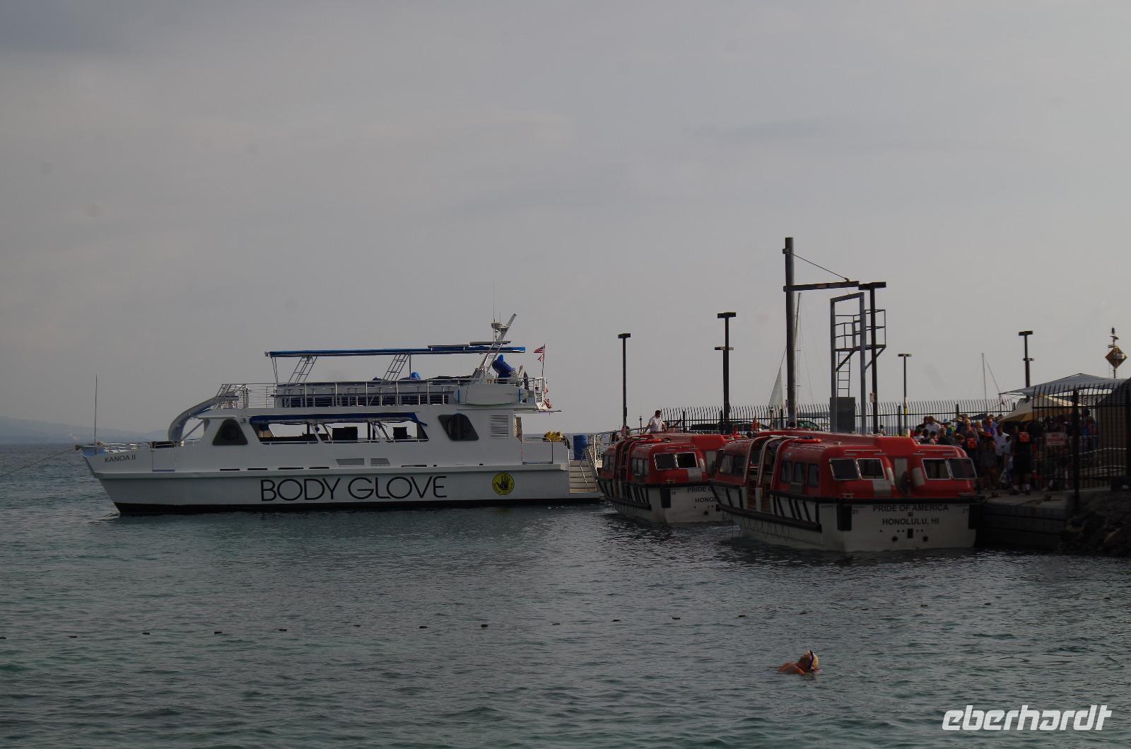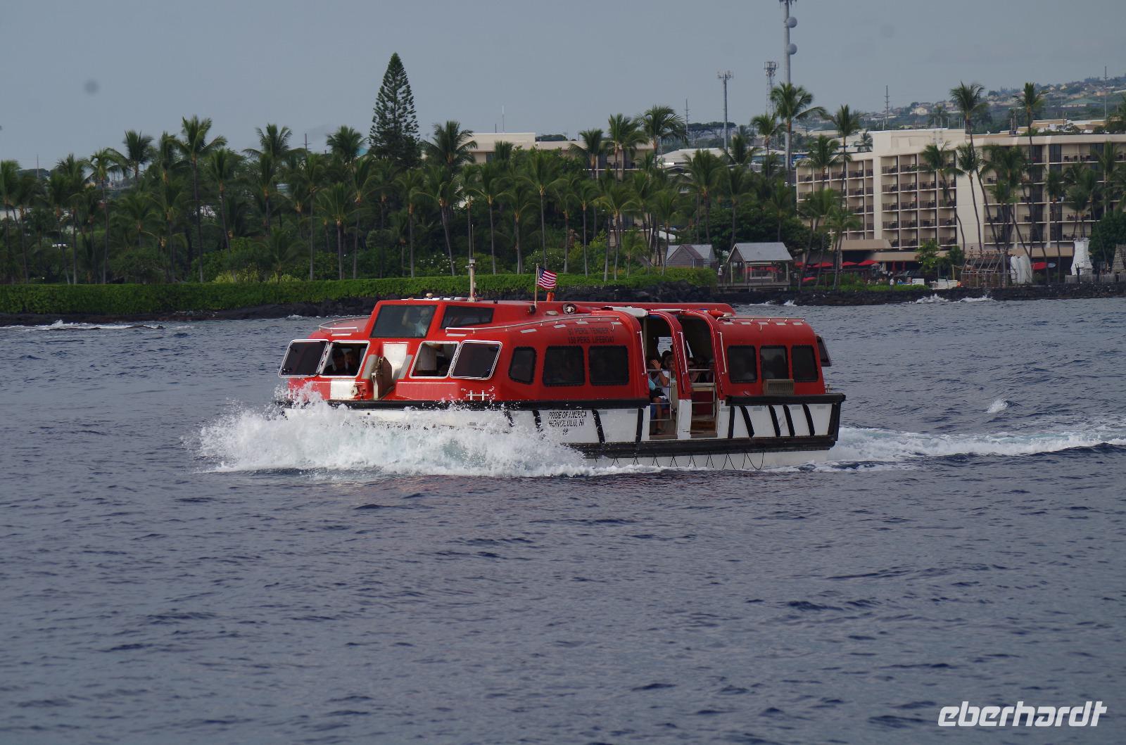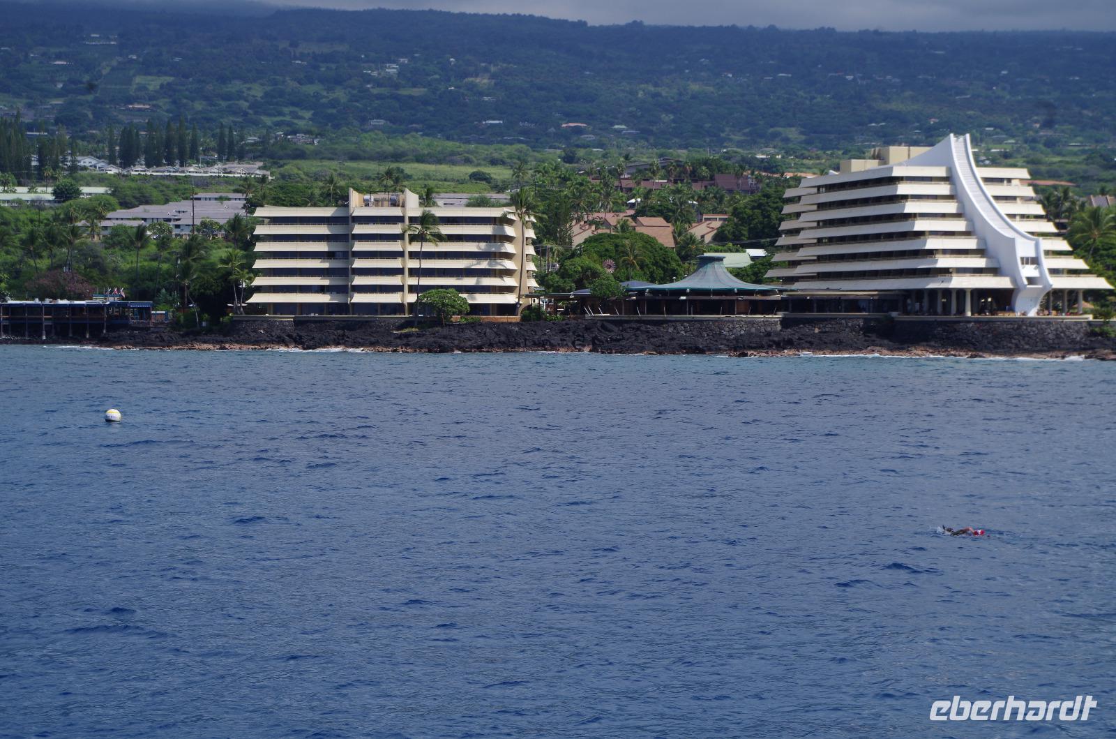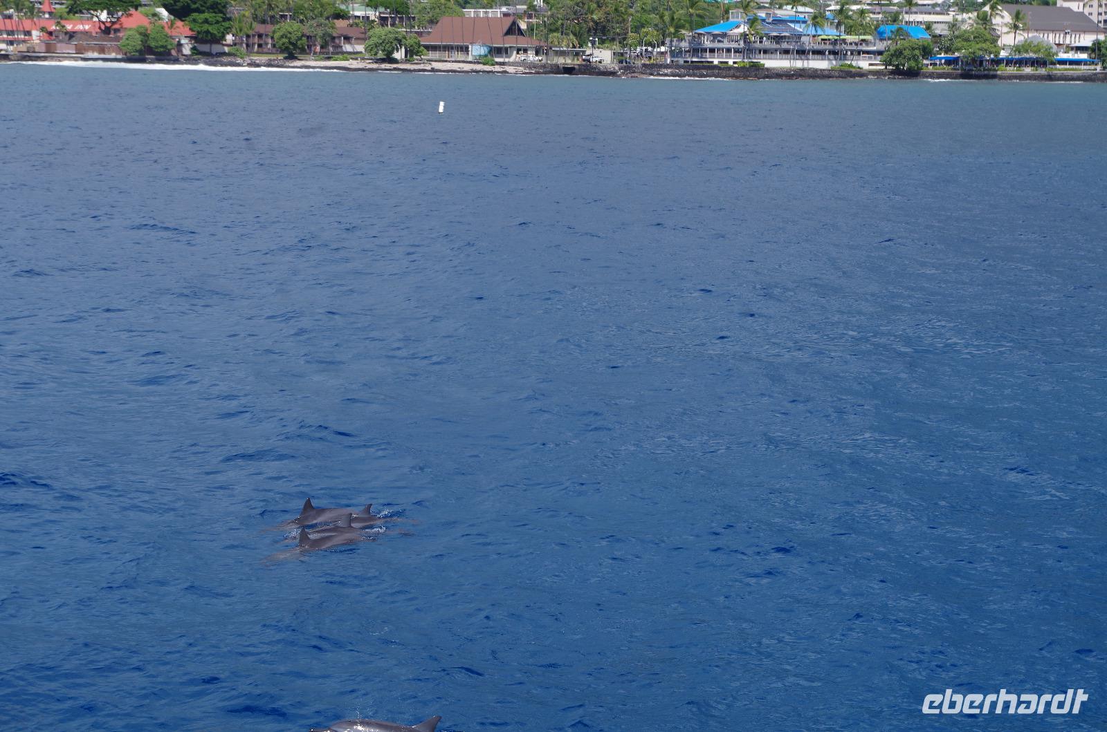 Wie könnte eine Tag besser starten als mit traumhaften Wetter und einem reichhaltigen Frühstück? Gut gestärkt treffen sich acht Reisegäste um 08.30 Uhr in der Hotellobby "Capitol Atrium" auf Deck 5 Mitte. Heute heißt es "Tendern", so dass wir nicht individuell von Bord gehen werden, sondern zum auf unserem Ticket des Ausflugs KOA45 "Kona zu Land und zu Wasser" hinterlegten Treffpunkt, das Hollywood Theater auf Deck 5, laufen. Wir starten gemeinsam mit den anderen NCL-Gästen zum Ausflug. Unsere Sitzplätze in der ersten Reihe tauschen wir heute ausnahmsweise gegen die Sitzplätze im hinteren Bereich des Busses, da wir aber nur am Vormittag mit dem Bus fahren, sind die Sitzplätze für uns in Ordnung. Das Lunchpaket unseres achtstündigen Ausflugs erhalten wir erst zur Bootsfahrt am frühen Nachmittag. Gegen 08.45 Uhr startet unsere "Tender-Fahrt" zum Hafen von Kona. Die Fahrt dauert rund zehn Minuten, mit Warten und Anstehen sind rund 30 Minuten einzuplanen. Um 09.15 Uhr beginnt der NCL-Ausflug ITO03 KOA45 "Kona zu Land und zu Wasser" mit natürlich singendem Busfahrer. Die hawaiianischen Busfahrer haben scheinbar alle eine gute Gesangsstimme, muss wohl an den Genen liegen *grins* Während wir gestern in Hilo gehört haben, dass es auf dieser Seite von Big Island an fast 250 Tagen im Jahr regnen soll, ist dies in Kona nicht der Fall. Insgesamt ist Big Island rund 10.473 Quadratkilometer groß mit einer Nord-Süd-Ausdehnung von circa 149 Kilometern und etwa 122 Kilometer breit von Ost nach West. Die gesamte Insel zählt circa 200.000 Einwohner, während ungefähr 70.000 Menschen in Hilo und rund 60.000 Personen in Kona leben. Zuerst schauen wir um 09.45 Uhr im Besucherzentrum "Royal Kona Coffee - Mill & Museum" vorbei, wo wir eine Harmoniepause einlegen und den für diese Stadt bekannten Kona-Kaffee probieren können. Unter Umständen wird der ein oder andere Reisegast womöglich durchaus stärkeren Kaffee zuhause gewohnt sein, aber probieren wir selbst! Im Souvenirladen kann der Kona-Kaffee und weitere Andenken gekauft werden. Nächster Programmpunkt ist der Besuch der St. Benedict Roman Catholic Church in Honaunau auf Big Island. Eine Erklärung in Englisch zu Hawaiis erster im Inneren nach hawaiianischer Art bemalter Kirche erfolgt durch eine charmante Kirchenmitarbeiterin. Die Malereien erzählen die Geschichte des Pfarrers Damien, wie er 1864 nach Hawaii gekommen ist. Die zusammenfasste Übersetzung erfolgt durch die Reisebegleitung. Anschließend fahren wir um 10.50 Uhr zum Nationalpark "Pu'uhonua o Honaunau", welchen wir rund 25 Minuten später besuchen. Vom Busfahrer erhalten wir eine englische Beschreibung, im Besucherzentrum den Plan vom Nationalpark mit Erklärung der sechszehn Stationen in Deutsch. Am Eingang sehen wir einen Nonibaum (Morinda citrifolia), dessen Früchte als Medizin bei Hautverletzungen verwendet werden. Gegen 12.00 Uhr fahren wir wieder zum Hafen zurück, wo wir gegen 13.00 Uhr angekommen. Nur fünfzehn Minuten später beginnt unsere dreistündige Bootsfahrt mit dem Katamaran der Firma "Body Glove". Bereits kurz nach Abfahrt erhalten wir unser Lunchpaket, bestehend aus einer Art Nudelsalat in einem kleinen Becher, einer kleinen Chips-Tüte und einem Burger. Die Getränke können entweder selbst an der Bar geholt werden oder das Bordpersonal serviert sie den Gästen. Alkoholfreie Getränke sind kostenfrei, Drinks mit Alkohol können die Gäste an der Bar gegen Aufpreis bestellen. Wir haben sonniges Traumwetter und erhalten zudem von einer englischsprachigen Historikerin an Bord viele weitere Erzählungen zur Geschichte Hawaiis. Begleitet werden wir von einer Vielzahl an Delphinen, welche sehr nah an das Boot herankommen. Zum Nachmittag werden uns noch Schokoladenkekse gereicht. Wir fahren rund eineinhalb Stunden bis zum Kapitän Thomas Cook Denkmal für einen Foto-Stopp und zur Delphin-Beobachtung. Anschließend geht es auf der gleichen Strecke wieder zum Hafen zurück. Um 16.00 Uhr erreichen wir den Hafen und unternehmen einen kurzen Spaziergang am Wasser entlang. Beim Hotel Courtyard by Marriott King Kamehameha's Kona Beach Hotel kann kostenfreies unbegrenztes WLAN empfangen werden. Wir fahren im "Tender-Boot" um 16.30 Uhr zurück zum Schiff, das letzte Tender-Boot soll um 17.00 Uhr starten. Um 17.30 Uhr ist die Abfahrt der "Pride of America" von Kano, Big Island nach Nawiliwili, Kauai, die Fahrt beträgt rund 438,1 Kilometer. Wir treffen uns zur gewohnten Uhrzeit um 18.00 Uhr im uns bereits bestens bekannten Restaurant "Skyline" auf Deck 5 Heck und genießen ein köstliches Abendessen. Um 21.00 Uhr findet die Show "Tenors of Rock" im Hollywood Theater auf Deck 5 statt. Die Musik ist allerdings viel zu laut, so dass wir das Theater bereits nach wenigen Minuten wieder verlassen und uns auf die Kabinen zurückziehen. Wir wünschen eine gute Nacht und freuen uns schon auf die kommenden spannenden Abenteuer auf Kauai.