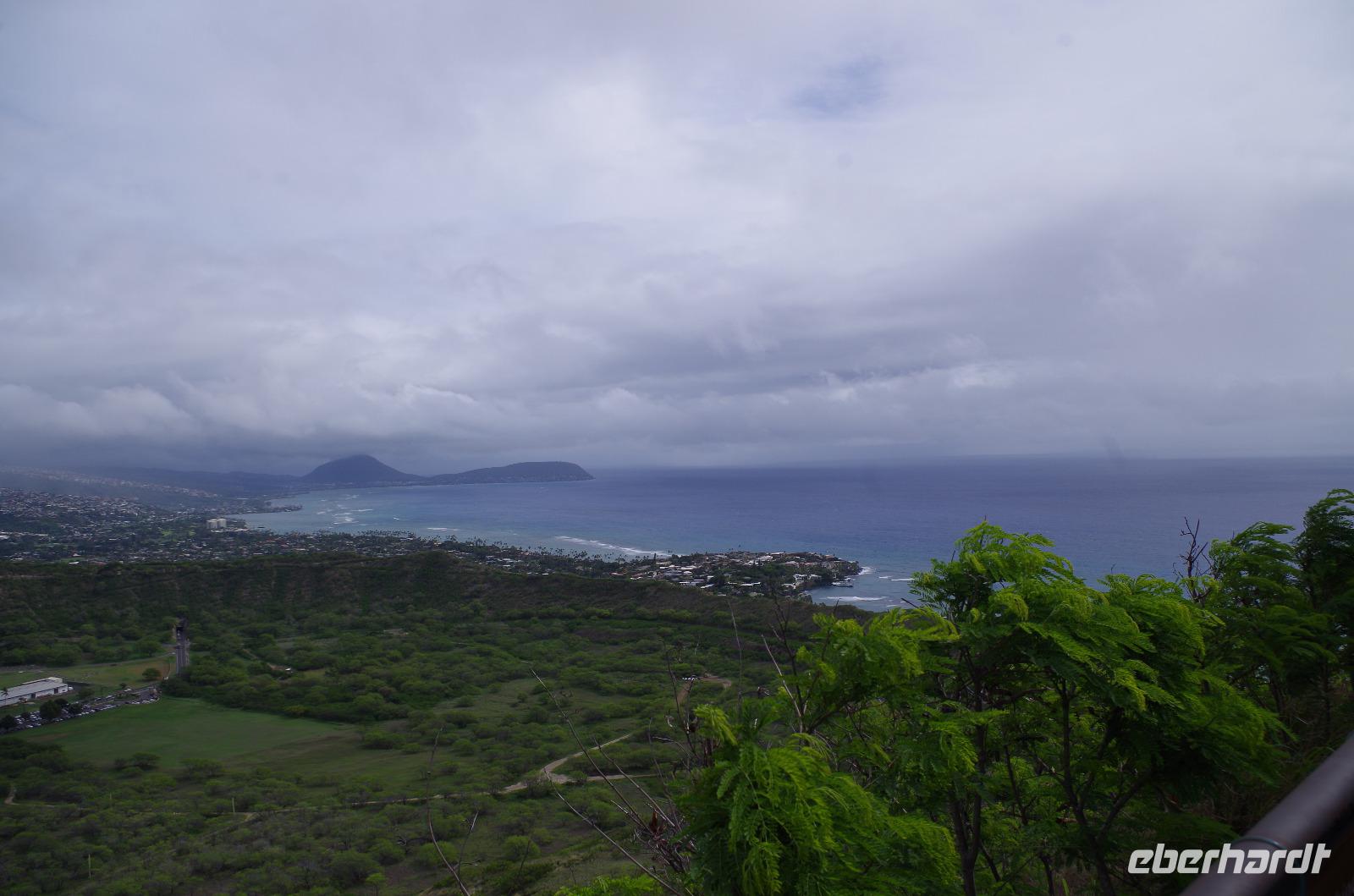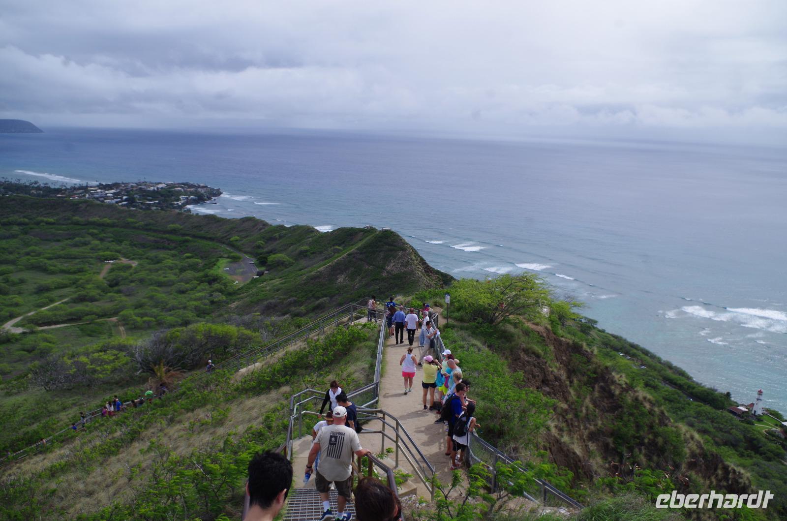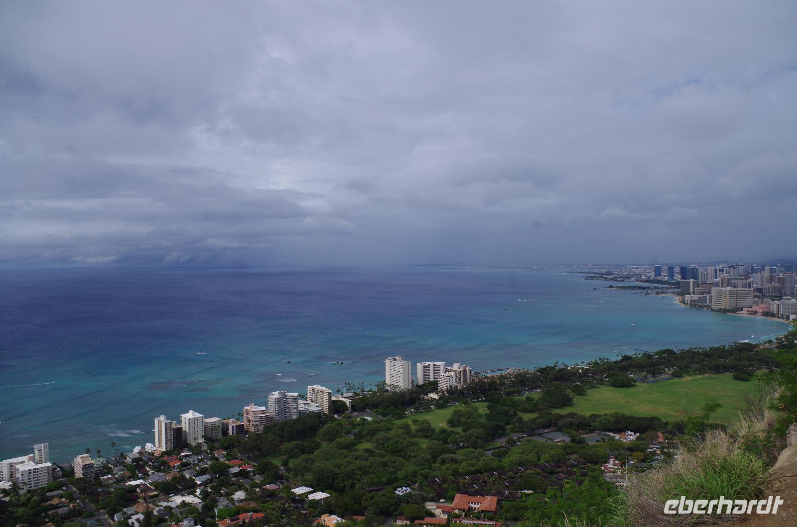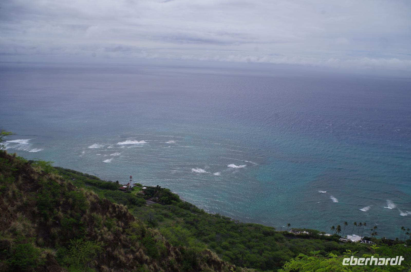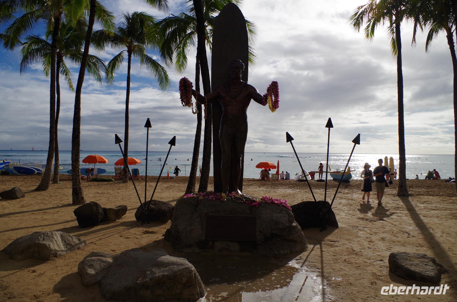 Bei strahlendem Sonnenschein erreichen wir Honolulu nachdem wir insgesamt rund 1.583 Kilometer vom 04.11.2017 bis 11.11.2017 gefahren sind. Wir gönnen uns noch ein leckeres Abschiedsfrühstück auf der NCL "Pride of America". Interessant ist vielleicht auch, was so auf der wöchentlichen Einkaufsliste des Küchenchefs steht. Darauf steht unter anderem rund 50.000 Eier, 12.684 Kilogramm Geflügel, 659 Liter Sahneeis, 8.154 Kilogramm Obst, 12.684 Kilogramm Gemüse, 408 Laibe geschnittenes Brot und 2.918 Liter Milch für die bis zu 2.450 Passagiere. Der durchschnittliche Treibstoffverbrauch liegt bei 400 Tonnen und der durchschnittliche Wasserverbrauch bei 26 bis 27 Millionen Litern. Um 08.30 Uhr sind die Kabinen zu verlassen und um 09.00 Uhr treffen wir uns in der Hotellobby "Capitol Atrium". Wir gehen gemeinsam von Bord und holen unsere Koffer in der Hafenhalle ab. Dann treffen wir am Pier 2 zuerst auf unseren örtlichen Reiseleiter Dominik aus Österreich. Der Check-Out hat sehr gut funktioniert, so dass wir eher als geplant am Treffpunkt sind und noch ein wenig auf den Bus warten werden. Es ist wirklich sehr heiß und schwül-warm, so dass wir im Hafengebäude warten. Um 10.00 Uhr verladen wir unsere Koffer in einem Kleinbus von Bassett Transportation für bis zu vierzehn Personen und starten unsere heutige Tagestour. Wir fahren am Waikiki Beach entlang zum Wahrzeichen Diamond Head, einen inaktiven Vulkankrater, welchen wir gegen 10.30 Uhr erreichen. Während drei Gäste und die Reisebegleitung eine Wanderung zum Aussichtpunkt vornehmen, verweilen die Gäste im Schatten auf Holzbänken zusammen mit dem örtlichen Reiseleiter Dominik am Ausgangspunkt unserer Wanderung. Für die Wanderung zur Aussichtsplattform mit traumhaften Blick über Honolulu benötigen wir rund 45 Minuten, der Rückweg auf der gleichen Serpentinenstrecke dauert circa 35 Minuten. Um 12.00 Uhr fahren wir weiter an der Küste entlang in Richtung des Tempels Byodo-In. Aber das Wetter meint es nicht gut mit uns oder besser gesagt, der Himmel "weint", da dies unser letzter Tag auf Hawaii ist. Das Wetter wird immer schlechter sowie ein leicht unangenehmer, anhaltender Dauerregen setzt ein. Wir legen unterwegs keinen Foto-Stopp ein, sondern fotografieren nur aus dem Bus heraus. Um 13.00 Uhr erreichen wir den Tempel Byodo-In, aber aufgrund des Dauerregens ist an ein Aussteigen nicht zu denken. Die Strecke vom Busparkplatz zum Tempel ist zwar nicht lang, dennoch wären wir komplett durchgeweicht ehe wir überhaupt am Eingang ankommen würde. Wir entscheiden uns als Gruppe, den Tempel nicht wie geplant zu besuchen, sondern weiterzufahren. Eintritt müssen wir dafür auch nicht zahlen. Unsere Fahrt führt uns weiter zu einer Macadamia-Nuss-Farm mit Souvenirladen und kostenfreiem Kaffee zum Probieren, wobei uns dieser Kaffee dank des zusätzlichen Nussgeschmacks wesentlich besser schmeckt als in Kona. Die Gäste kaufen im Souvenirladen das ein oder andere Souvenir für ihre lieben Daheimgebliebenen. Gegen 15.00 Uhr fahren wir zum Zentrum von Honolulu zurück und zum Waikiki Beach, genauer gesagt zum Kuhio Beach, wo uns die Statue eines des besten Wassersportlers der Welt, die Statue des Duke Kahanamoku, mit offenen Armen empfängt. Das Wetter hat sich ebenso verbessert, es regnet wesentlich weniger als noch vor einer Stunde. Am Wikiki Beach haben wir Zeit für einen kleinen Imbiss, zum Fotografieren oder zum Kauf von Souvenirs. Dann fahren wir um 16.30 Uhr zum nationalen Flughafen von Honolulu an den United Schalter. Den Daniel K. Inouye International Airport erreichen wir rund 30 Minuten später und wir verabschieden uns freundlich von unserem Reiseleiter Dominik. Wir suchen uns einen Sitzplatz am Flughafen, um unsere Koffer zu öffnen und uns umzuziehen. Die Reisebegleitung hat eine kleine Überraschung für die Gäste, indem sie ihnen ein kleines Abschiedsgeschenk im Namen von Eberhardt überreicht. Wir wechseln unsere sommerliche Kleidung gegen Strickjacke, lange Hose oder Pullover und verzehren unser vom Frühstück mitgenommenes Obst, da wir dieses nicht mit an Bord nehmen dürfen. Anschließend sind wir verpflichtet, unser Gepäck durchleuchten zu lassen, damit wir auch ja kein frisches Obst oder Gemüse sowie lebendige Tier mitführen. Dann begeben wir uns zum Check-In-Schalter von United, wo uns eine weniger gute Nachricht erreicht. Die Koffer sind am Automaten einzuchecken, was 'eigentlich' kein Problem sein sollte. Aber an dieser Stelle fällt wieder einmal das Wort 'eigentlich'. Die Automaten lesen keinen der deutschen Pässe ein und die Passdaten jeden einzelnen Gastes und der Reisebegleitung sind mit Hand einzugeben. Dies übernimmt natürlich die Reisebegleitung, aber die Prozedur nimmt schon eine Menge Zeit in Anspruch und beansprucht die Nerven aller Beteiligten. Das Servicepersonal von United ist bedauerlicherweise auch nicht wirklich eine Hilfe. Die Sitzplätze sind teilweise wieder durcheinander, ein Umsetzen ist abermals erst an Bord möglich. Eine erfreuliche Nachricht gibt es dennoch, denn unser Gepäck wird trotz der zwei bis drei Zwischenlandungen bis zum Endzielflughafen München, Berlin-Tegel, Stuttgart oder Dresden durchgecheckt. Gegen 19.00 Uhr passieren wir die Sicherheitskontrolle ohne Schwierigkeiten und Laufen gemeinsam zum Gate 24. Am Abfluggate erhalten die Gäste den von Eberhardt TRAVEL versprochenen Cocktail für die improvisierte Stadtrundfahrt an unserem zweiten Tag in Honolulu. Unseren leckeren "Abschiedsdrink" Bier oder Softgetränke genießen wir im Food Court. Am Flughafen haben sowohl die Geschäfte als auch die Souvenirläden und Kosmetikgeschäfte bis circa 20.00 Uhr geöffnet. Kostenfreies WLAN ist nicht wirklich vorhanden, ein schwaches Signal findet sich bei Starbucks. Pünktlich um 21.05 Uhr beginnt das Boarding unseres Fluges von Honolulu nach Los Angeles. Wir sind abermals in einer "Boarding-Gruppe" 3 oder 4 eingeteilt. Je nach Sitzplatz und Sitzreihe passieren wir den Eingan