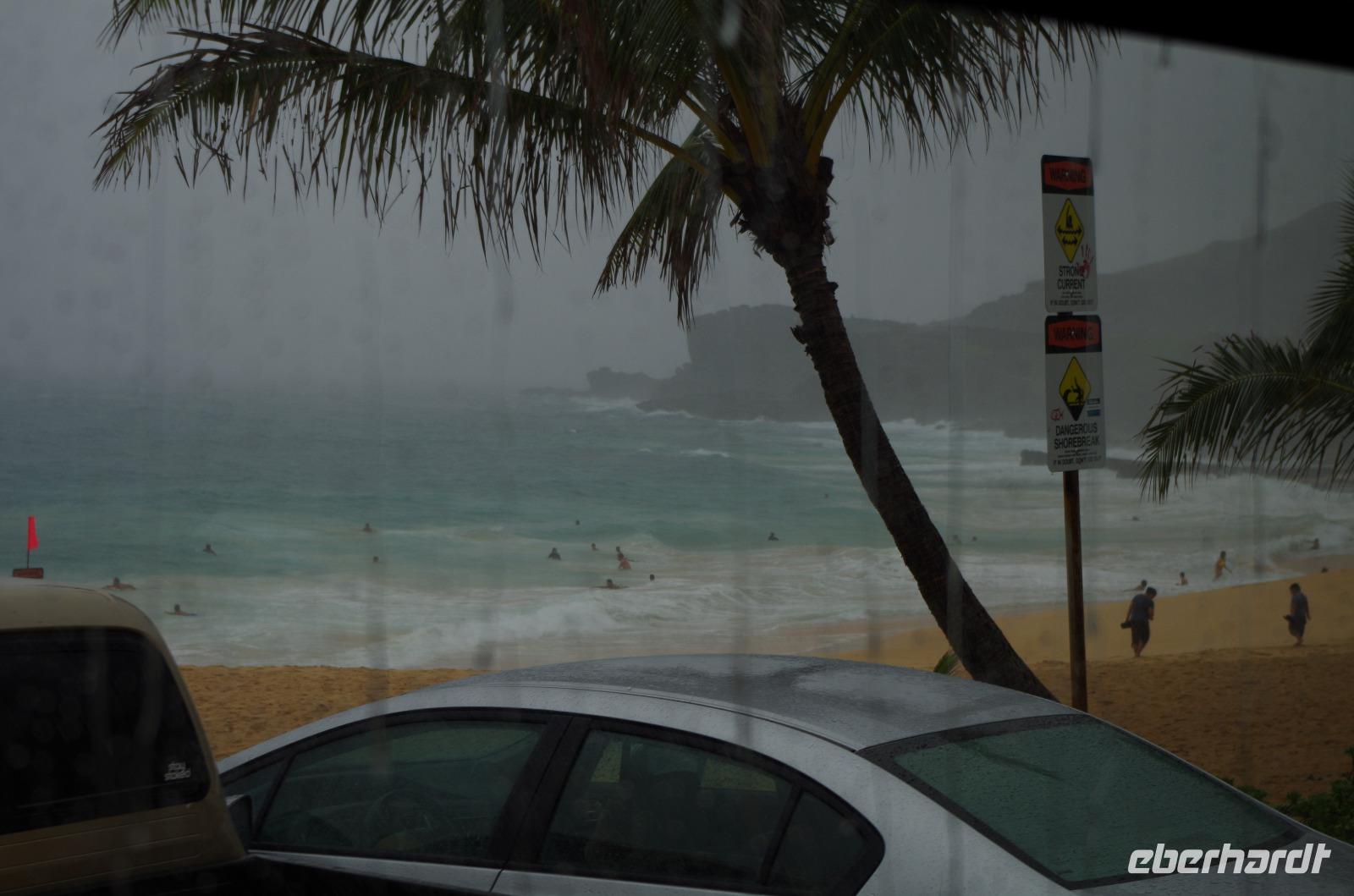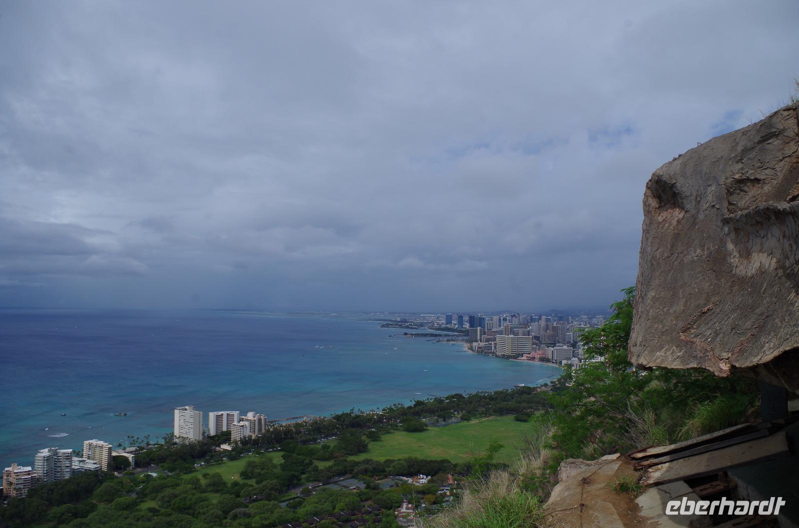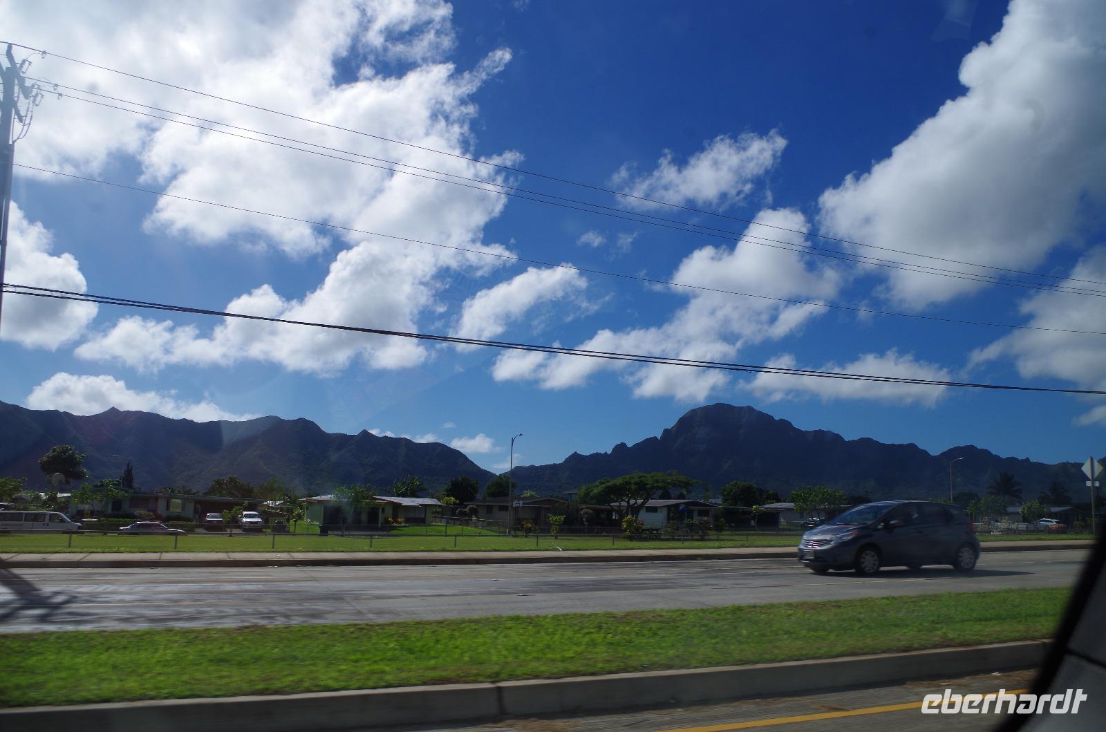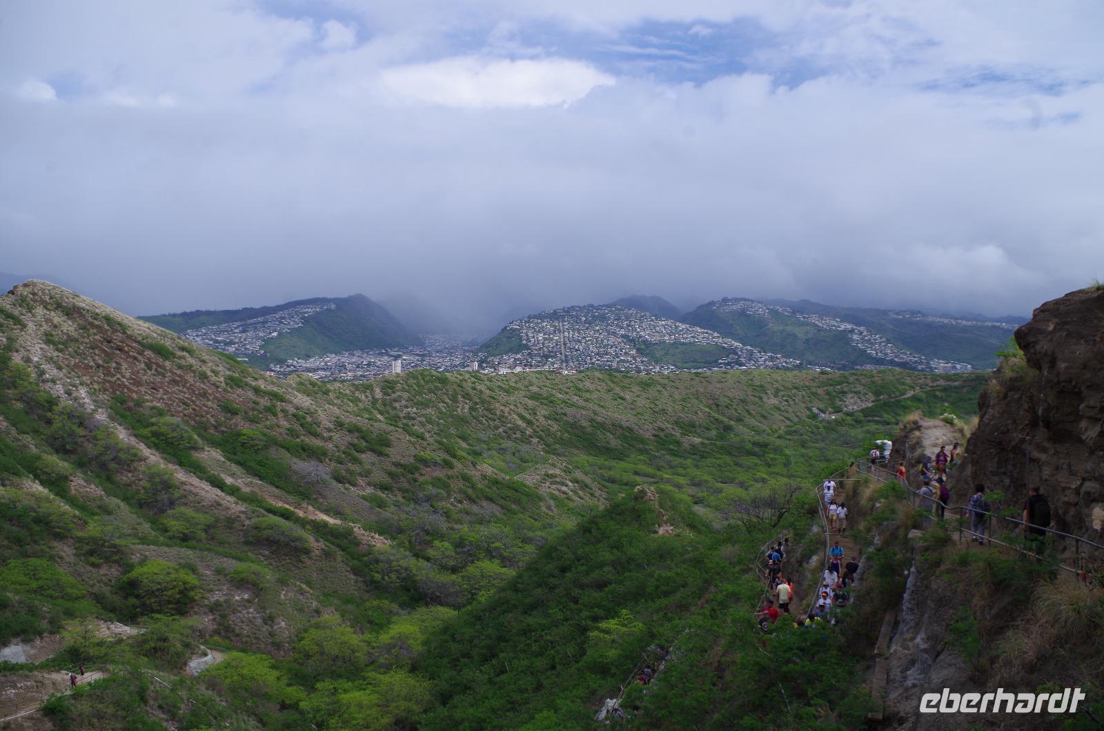 Bei strahlendem Sonnenschein erreichen wir Honolulu nachdem wir insgesamt rund 1.583 Kilometer vom 04.11.2017 bis 11.11.2017 gefahren sind. Wir gönnen uns noch ein leckeres Abschiedsfrühstück auf der NCL "Pride of America". Interessant ist vielleicht auch, was so auf der wöchentlichen Einkaufsliste des Küchenchefs steht. Darauf steht unter anderem rund 50.000 Eier, 12.684 Kilogramm Geflügel, 659 Liter Sahneeis, 8.154 Kilogramm Obst, 12.684 Kilogramm Gemüse, 408 Laibe geschnittenes Brot und 2.918 Liter Milch für die bis zu 2.450 Passagiere. Der durchschnittliche Treibstoffverbrauch liegt bei 400 Tonnen und der durchschnittliche Wasserverbrauch bei 26 bis 27 Millionen Litern. Um 08.30 Uhr sind die Kabinen zu verlassen und um 09.00 Uhr treffen wir uns in der Hotellobby "Capitol Atrium". Wir gehen gemeinsam von Bord und holen unsere Koffer in der Hafenhalle ab. Dann treffen wir am Pier 2 zuerst auf unseren örtlichen Reiseleiter Dominik aus Österreich. Der Check-Out hat sehr gut funktioniert, so dass wir eher als geplant am Treffpunkt sind und noch ein wenig auf den Bus warten werden. Es ist wirklich sehr heiß und schwül-warm, so dass wir im Hafengebäude warten. Um 10.00 Uhr verladen wir unsere Koffer in einem Kleinbus von Bassett Transportation für bis zu vierzehn Personen und starten unsere heutige Tagestour. Wir fahren am Waikiki Beach entlang zum Wahrzeichen Diamond Head, einen inaktiven Vulkankrater, welchen wir gegen 10.30 Uhr erreichen. Während drei Gäste und die Reisebegleitung eine Wanderung zum Aussichtpunkt vornehmen, verweilen die Gäste im Schatten auf Holzbänken zusammen mit dem örtlichen Reiseleiter Dominik am Ausgangspunkt unserer Wanderung. Für die Wanderung zur Aussichtsplattform mit traumhaften Blick über Honolulu benötigen wir rund 45 Minuten, der Rückweg auf der gleichen Serpentinenstrecke dauert circa 35 Minuten. Um 12.00 Uhr fahren wir weiter an der Küste entlang in Richtung des Tempels Byodo-In. Aber das Wetter meint es nicht gut mit uns oder besser gesagt, der Himmel "weint", da dies unser letzter Tag auf Hawaii ist. Das Wetter wird immer schlechter sowie ein leicht unangenehmer, anhaltender Dauerregen setzt ein. Wir legen unterwegs keinen Foto-Stopp ein, sondern fotografieren nur aus dem Bus heraus. Um 13.00 Uhr erreichen wir den Tempel Byodo-In, aber aufgrund des Dauerregens ist an ein Aussteigen nicht zu denken. Die Strecke vom Busparkplatz zum Tempel ist zwar nicht lang, dennoch wären wir komplett durchgeweicht ehe wir überhaupt am Eingang ankommen würde. Wir entscheiden uns als Gruppe, den Tempel nicht wie geplant zu besuchen, sondern weiterzufahren. Eintritt müssen wir dafür auch nicht zahlen. Unsere Fahrt führt uns weiter zu einer Macadamia-Nuss-Farm mit Souvenirladen und kostenfreiem Kaffee zum Probieren, wobei uns dieser Kaffee dank des zusätzlichen Nussgeschmacks wesentlich besser schmeckt als in Kona. Die Gäste kaufen im Souvenirladen das ein oder andere Souvenir für ihre lieben Daheimgebliebenen. Gegen 15.00 Uhr fahren wir zum Zentrum von Honolulu zurück und zum Waikiki Beach, genauer gesagt zum Kuhio Beach, wo uns die Statue eines des besten Wassersportlers der Welt, die Statue des Duke Kahanamoku, mit offenen Armen empfängt. Das Wetter hat sich ebenso verbessert, es regnet wesentlich weniger als noch vor einer Stunde. Am Wikiki Beach haben wir Zeit für einen kleinen Imbiss, zum Fotografieren oder zum Kauf von Souvenirs. Dann fahren wir um 16.30 Uhr zum nationalen Flughafen von Honolulu an den United Schalter. Den Daniel K. Inouye International Airport erreichen wir rund 30 Minuten später und wir verabschieden uns freundlich von unserem Reiseleiter Dominik. Wir suchen uns einen Sitzplatz am Flughafen, um unsere Koffer zu öffnen und uns umzuziehen. Die Reisebegleitung hat eine kleine Überraschung für die Gäste, indem sie ihnen ein kleines Abschiedsgeschenk im Namen von Eberhardt überreicht. Wir wechseln unsere sommerliche Kleidung gegen Strickjacke, lange Hose oder Pullover und verzehren unser vom Frühstück mitgenommenes Obst, da wir dieses nicht mit an Bord nehmen dürfen. Anschließend sind wir verpflichtet, unser Gepäck durchleuchten zu lassen, damit wir auch ja kein frisches Obst oder Gemüse sowie lebendige Tier mitführen. Dann begeben wir uns zum Check-In-Schalter von United, wo uns eine weniger gute Nachricht erreicht. Die Koffer sind am Automaten einzuchecken, was 'eigentlich' kein Problem sein sollte. Aber an dieser Stelle fällt wieder einmal das Wort 'eigentlich'. Die Automaten lesen keinen der deutschen Pässe ein und die Passdaten jeden einzelnen Gastes und der Reisebegleitung sind mit Hand einzugeben. Dies übernimmt natürlich die Reisebegleitung, aber die Prozedur nimmt schon eine Menge Zeit in Anspruch und beansprucht die Nerven aller Beteiligten. Das Servicepersonal von United ist bedauerlicherweise auch nicht wirklich eine Hilfe. Die Sitzplätze sind teilweise wieder durcheinander, ein Umsetzen ist abermals erst an Bord möglich. Eine erfreuliche Nachricht gibt es dennoch, denn unser Gepäck wird trotz der zwei bis drei Zwischenlandungen bis zum Endzielflughafen München, Berlin-Tegel, Stuttgart oder Dresden durchgecheckt. Gegen 19.00 Uhr passieren wir die Sicherheitskontrolle ohne Schwierigkeiten und Laufen gemeinsam zum Gate 24. Am Abfluggate erhalten die Gäste den von Eberhardt TRAVEL versprochenen Cocktail für die improvisierte Stadtrundfahrt an unserem zweiten Tag in Honolulu. Unseren leckeren "Abschiedsdrink" Bier oder Softgetränke genießen wir im Food Court. Am Flughafen haben sowohl die Geschäfte als auch die Souvenirläden und Kosmetikgeschäfte bis circa 20.00 Uhr geöffnet. Kostenfreies WLAN ist nicht wirklich vorhanden, ein schwaches Signal findet sich bei Starbucks. Pünktlich um 21.05 Uhr beginnt das Boarding unseres Fluges von Honolulu nach Los Angeles. Wir sind abermals in einer "Boarding-Gruppe" 3 oder 4 eingeteilt. Je nach Sitzplatz und Sitzreihe passieren wir den Eingan