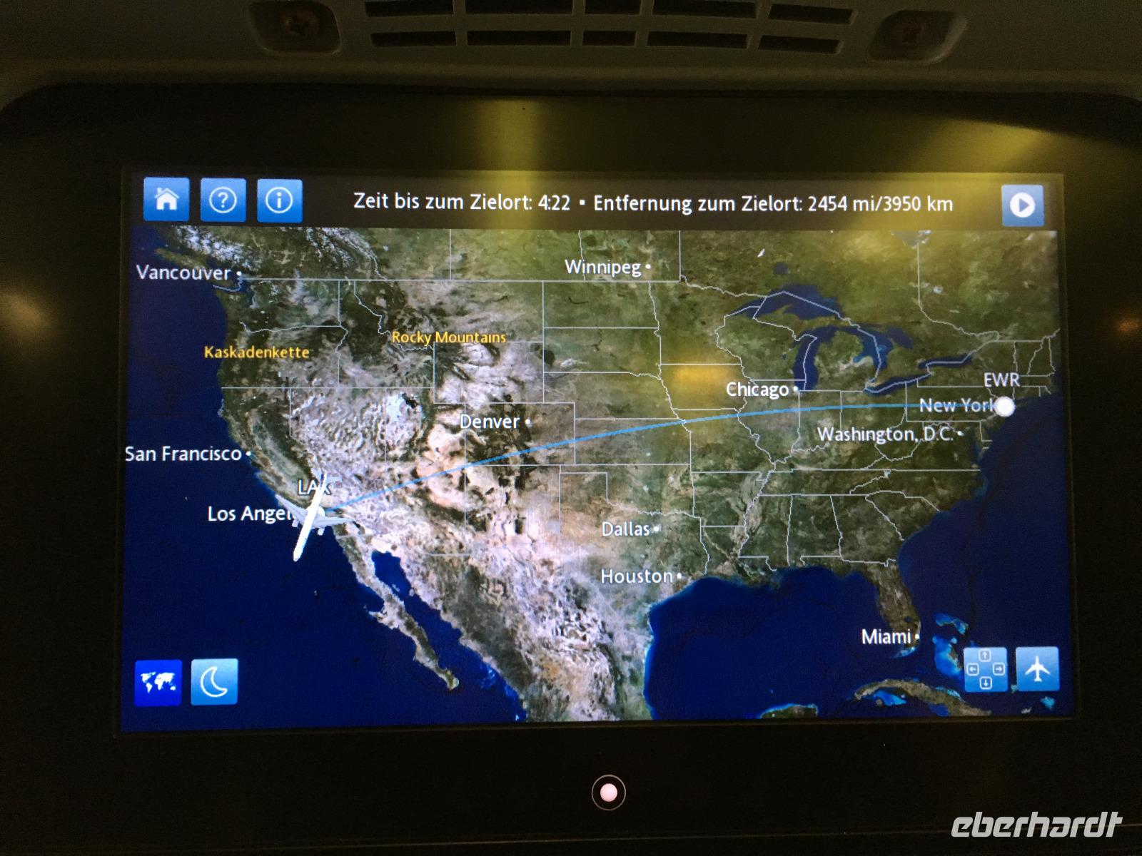Pünktlich erreichen wir gegen 04.57 Uhr den nationalen Flughafen von Los Angeles. Das Ankunftsgate ist nur wenige Gehminuten vom Weiterfluggate 73 entfernt. Am Flughafen haben wir für eine Stunde kostenfreies WLAN. Die Gäste gönnen sich ein gutes Frühstück in einem der Bistros in der Nähe des Gates 73. Pünktlich um 07.00 Uhr beginnt das Boarding des Fluges von Los Angeles nach New York/Newark, New Jersey. Wir sind abermals in "Boarding-Gruppe" 3 und 4 eingeteilt. Hier beginnt bereits die erste große Verabschiedung der Gäste untereinander, da einige Gäste am Flughafen in Newark eine Umsteigezeit von unter zwei Stunden haben, was in den USA unter Umständen mit langen Wegen zum nächsten Gate verbunden ist. Überpünktlich um 07.45 Uhr startet unser United-Flug UA1640 nach New York/Newark, New Jersey. Wie bei unserem vorhergehenden Flug mit der gleichen Airline sind Wasser, Kaffee, Tee und Softdrinks an Bord kostenfrei, die Mahlzeiten müssen bezahlt werden. Aber wir haben dieses Mal einen eigenen Flatscreen mit teilweise deutschen Unterhaltungsprogramm an jedem Sitzplatz. Die Flugzeit beträgt abermals mehr als fünf Stunden und die Luftlinie von Los Angeles nach Newark circa 3.922,82 Kilometer. Um 15.45 Uhr landen wir überpünktlich am Flughafen Newark Liberty International Airport. Hier verabschieden wir uns herzlich ein weiteres Mal voneinander. Die Gäste mit Direktflug nach Berlin-Tegel oder München sowie die Gäste mit Flug nach Stuttgart über Frankfurt/Main bleiben im gleichen Terminal, wo wir angekommen sind. Die Gäste mit Weiterflug über Frankfurt/Main nach Dresden müssen das Terminal wechseln. Uns stehen zwei Möglichkeiten zur Auswahl. Einerseits können wir mit dem Zug fahren, da müssten wir aber nochmals eine Sicherheitskontrolle passieren. Die andere Möglichkeit ist die Fahrt mit dem Bus, wo wir jedoch den Vorteil haben, keine Sicherheitskontrolle passieren zu müssen. Folglich entscheiden wir uns für Variante B und fahren mit dem Bus. Die Dauer mit Einsteigen und Fahrtzeit beträgt insgesamt lediglich rund 15 bis 20 Minuten. Wir haben eine kurze Umsteigezeit, so dass es ein Glück für uns ist, dass wir auch früher als geplant gelandet sind. Wir gehen dann gemeinsam zum Abfluggate B62. Die Zeit bis zum Abflug vertreiben wir uns mit kostenfreien WLAN von rund 60 Minuten am Flughafen, mit einem kleinen Imbiss zum Abend sowie dem Kauf von letzten Andenken. Wir sind bis hierher durch mehrere Zeitzonen gereist. Von Honolulu nach Los Angeles verkürzt sich die Zeitverschiebung zu Deutschland um zwei Stunden auf neun Stunden, von Los Angeles nach Newark um weitere drei Stunden auf sechs Stunden. Da sind wir wirklich gespannt, wie wir den Jetlag die nächsten Tage überstehen werden! Das Boarding unseres Fluges von New York/Newark, New Jersey nach Frankfurt/Main startet pünktlich um 17.45 Uhr genauso wie der Flug mit Lufthansa LH403 um 18.15 Uhr. Die Getränke sowie zwei Mahlzeiten sind auf dem Langstreckenflug inklusive. Dank des Unterhaltungsprogramms vergehen die restlichen rund 7,5 Stunden Flugzeit bei einer Luftlinie von rund 6.207,97 Kilometern "wie im Flug".