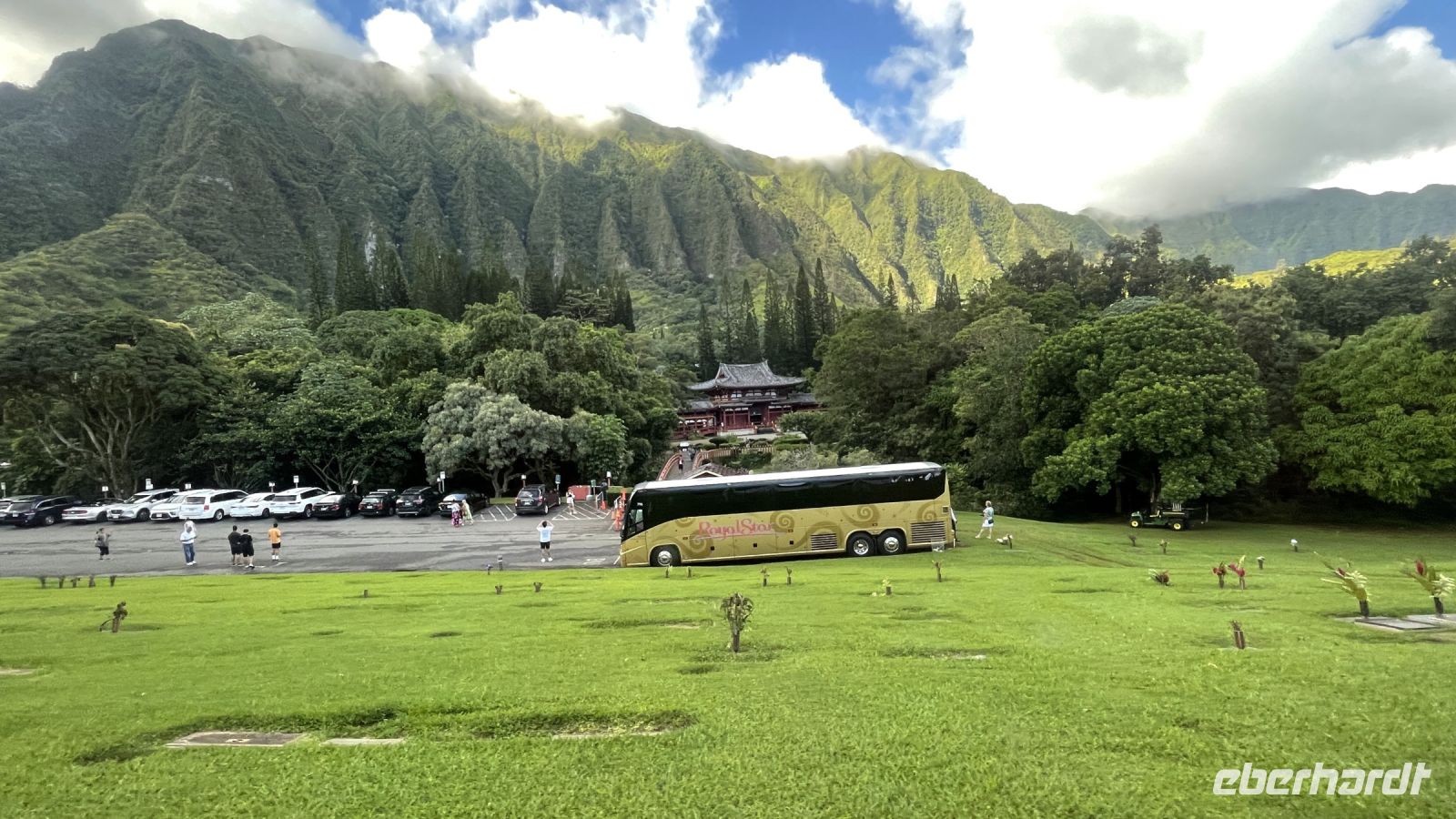 An unserem ersten Tag auf Hawaii wollen wir eine ausführliche Inselrundfahrt unternehmen. Gemeinsam starten wir mit Reiseleiter Pepi, über den Waikiki Beach in Richtung Osten der Insel. Vorbei am Sandy Beach und durch die Ortschaft Kaula, stoppen wir am Pali Lockout, wo wir einen tollen Blick über einen Teil der Insel haben. Unterwegs erfahren wir viel Wissenwertes über Land&Leute. Unser nächster Halt ist der Byodo-In-Tempel, ein buddhistischer Tempel der von den japanischen Einwanderern errichtet wurde. Hier unternehmen wir einen kleinen Rundgang und bestaunen die übergroßen Koifische im Teich. Weiter geht es zu einer Macadamia Nussfarm, wo sich außerdem ein Verkaufsladen befindet, hier kann man alle Nüsse in verschiedenen Geschmacksrichtungen verkosten und es gibt gratis Macadamia Nuss Kaffee. Also ein Pflichtstopp! Die Nüsse schmecken so gut, dass sich viele ein paar Packungen als Mitbringsel für Zuhause mitnehmen. Weiter geht es zur Kualoa Ranch – eines der Drehorte von Jurrasic Park. Hier legen wir eine kleine Mittagspause ein und sehen auf einer Tafel, welche Hollywood Filme hier außerdem alle gedreht wurden. Weiter geht es entlang der Waimea Bucht zurück nach Honolulu. Hier stoppen wir noch für ausgiebige Fotopausen am Königs Palast und Parlament, bevor wir schließlich wieder unser Hotel erreichen. Dort angekommen bedanken wir uns bei Reiseleiter Pepi für die schöne Inselrundfahrt mit einem kleinen Trinkgeld, wir verabschieden uns und sagen bis bald… denn wir werden ihn am Ender der Reise wiedersehen. Im Hotel angekommen genießen wir etwas Freizeit und treffen uns um 18:45Uhr wieder zum gemeinsamen Abendessen in ein Restaurant ganz in der Nähe. Gemeinsam lassen wir den Tag Revue passieren und freuen uns auf unsere bevorstehende Kreuzfahrt.