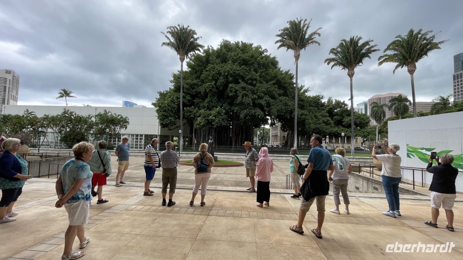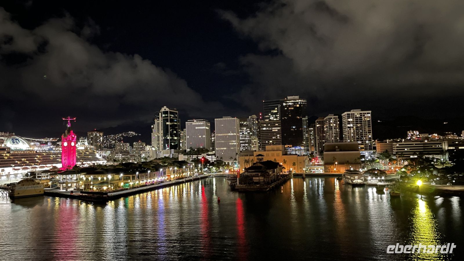 Zurück in Honolulu! Nach dem Frühstück gehen wir selbstständig mit unseren Koffern von Bord. Am Hafengebäude nimmt uns Reiseleiter Pepi wieder in Empfang. Gemeinsam fahren wir zum Hotel, geben unsere Koffer ab und kurze Zeit später geht es in Richtung Pearl Harbour. Dort unternehmen wir einen ausführlichen Rundgang durch die verschiedenen Museen und dem USS Arizona Memorial. Danach geht es mit Reiseleiter Pepi wieder zurück zum Hotel, wir bedanken uns nochmals mit einem Trinkgeld bei ihm. Nun bleibt noch ausreichend Zeit zum Baden am Waikiki Beach. Zum Abendessen treffen wir uns alle im Moani Restaurant um die Ecke vom Hotel wieder. Zum Abschluss genießen wir noch einen Absacker-Cocktail in der Skybar Top of Waikiki mit Blick über die Stadt.