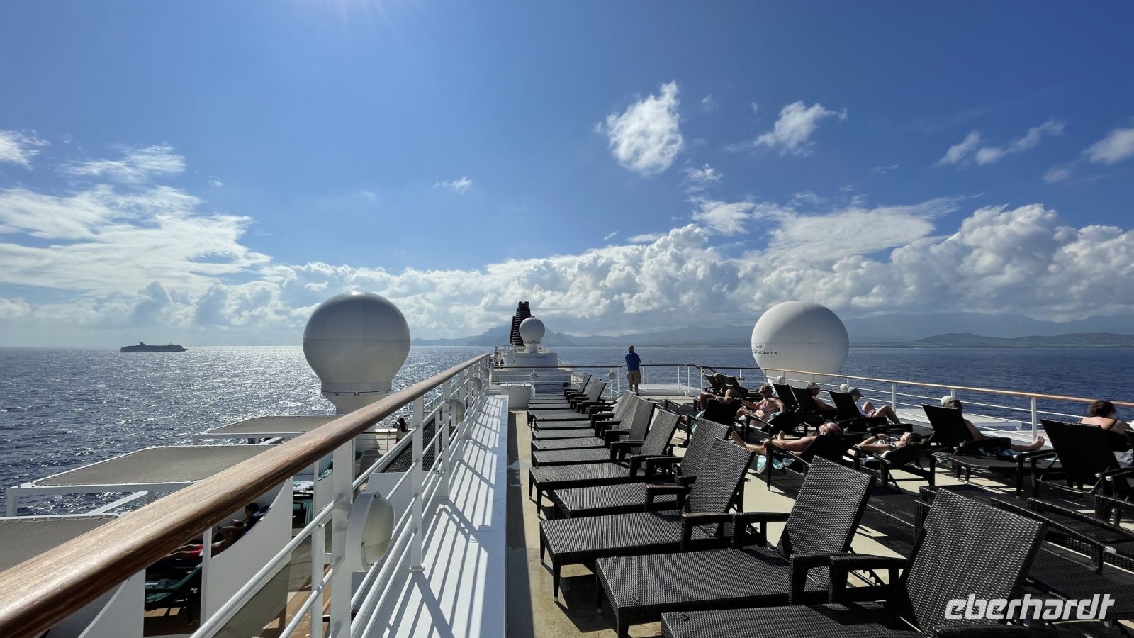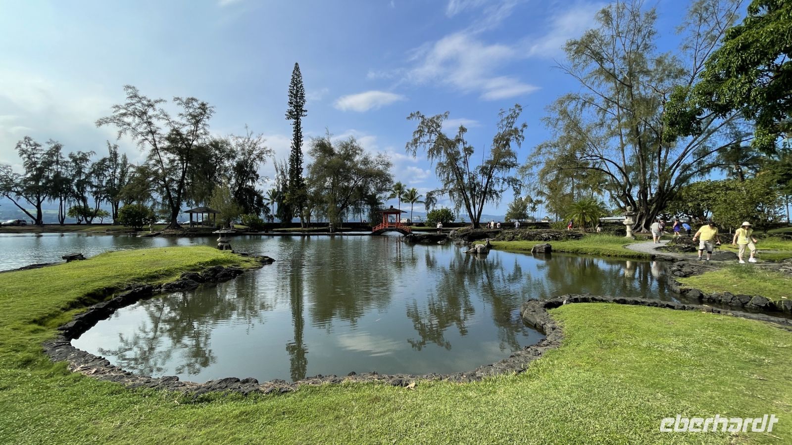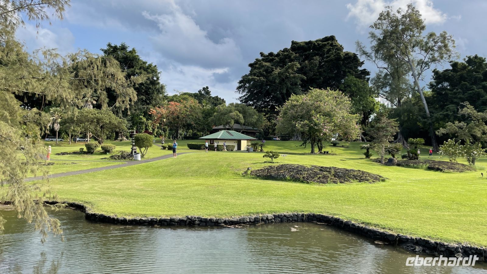 Wir erreichen die Nächste Insel - Big Island. Auch wir unternehme ich wieder mit den Reisegästen eine Inselrundfahrt. Diesmal sind wir 12 Gäste und haben einen kleinen Tourbus mit einem Driverguide gemietet. Wir fahren ca. 1,5 Stunden zum Kilauea Krater und dem gleichnamigen Visitor Center. Hier befinden sich nicht nur Toiletten, sondern auch auch ein kleines Informationszentrum über den Vulkan. Kurze Zeit später erreichen den ersten Teil vom Kraterrand, wo wir ins Kraterinnere hineinblicken und die dampfende Löcher und Lava erahnen können. Unser Driverguide erklärt uns, dass man nachts die leuchtende Lava sehen kann… tagsüber leider nicht. Danach geht es weiter zum zweiten Lockout wo sich dampfende Löcher befinden… ähnlich wie auf Island brodelt und dampft es hier aus allen Ecken der Erde. Wir setzen unsere Rundfahrt fort und unternehmen einen kleinen Spaziergang durch den Dschungel und durch einen erkalteten Lavatunnel. Danach geht es wieder talabwärts in Richtung Hilo. Dort besuchen wir die Rainbow Wasserfälle und danach stoppen wir an einem Candyshop, für eine kleine Verkostung und es gibt wieder einmal gratis Kaffee. Unser letzter Programmpunkt für heute ist der japanischen Garten von Hilo, wo wir ebenfalls einen kurzen Rundgang einlegen. Danach geht es zurück zum Schiff. Beim Abendessen werten wir den heutigen Tag aus und entspannen zum Schluss im Theater.