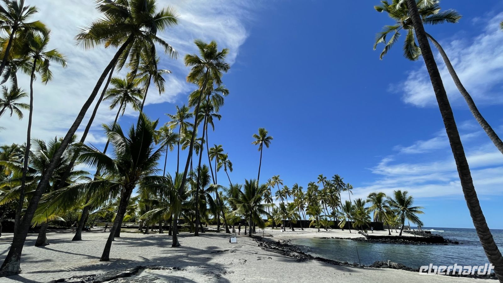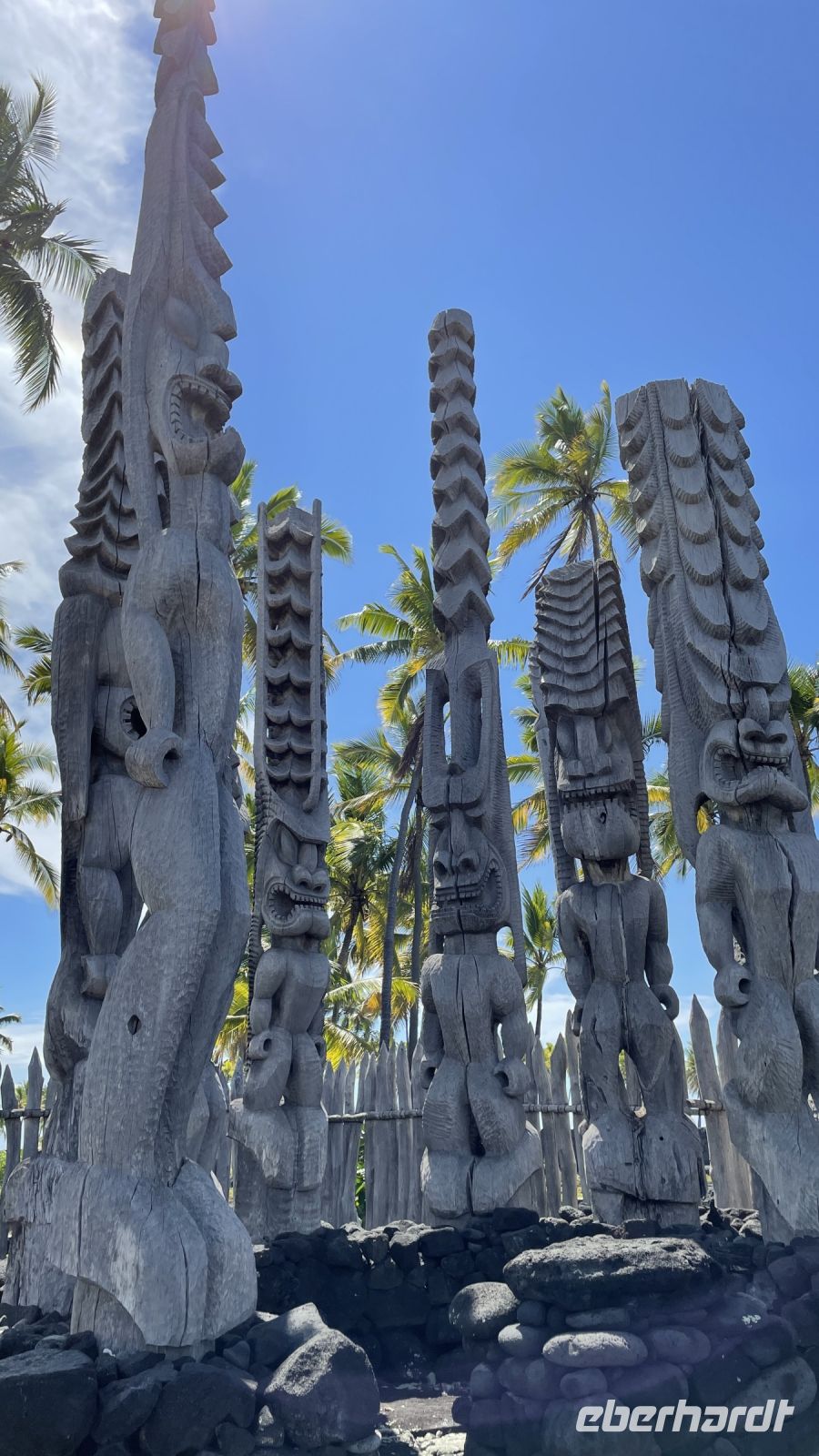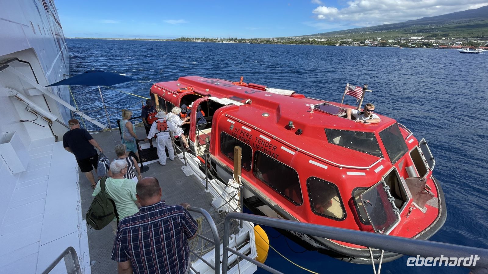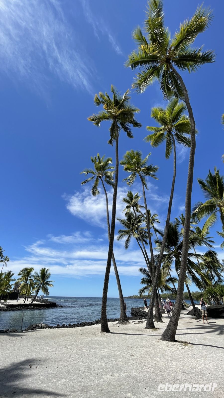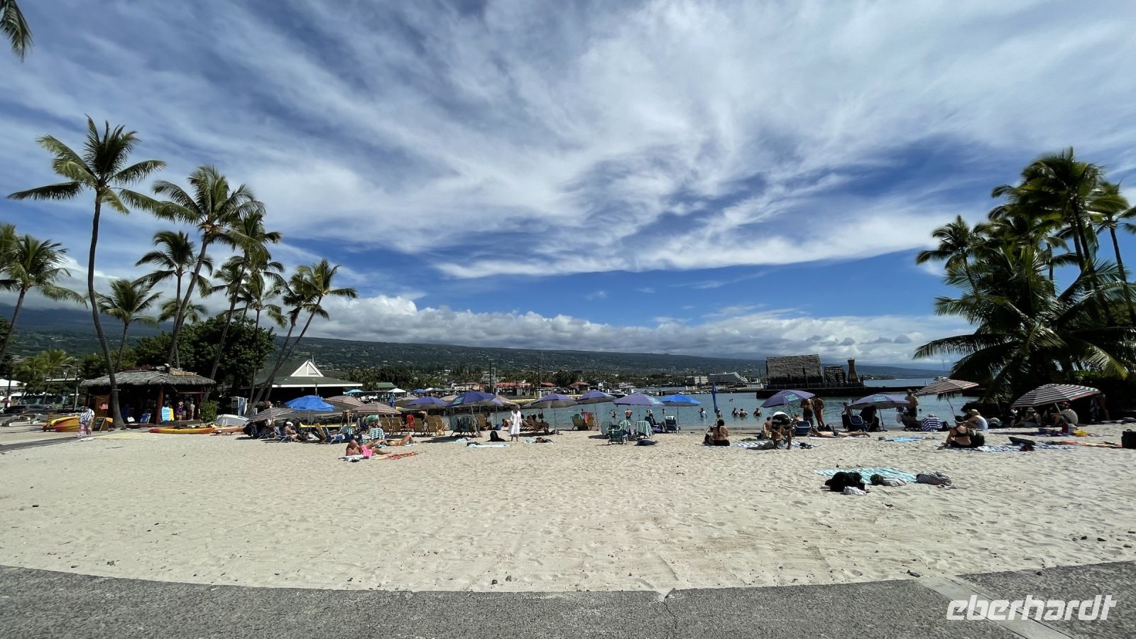 Tag 2 Auf Big Island. Da der Hafen von Kona zu klein ist, müssen wir die Tenderboote nehmen und relativ lange anstehen. Auf der Insel angekommen, fahren wir mit 3 Taxen zum Heritage Village „Puuhonua o Honaunau“ ca 30min. Dort angekommen unternehmen wir einen kleinen Rundgang durch das südseeanische Museum. Die Tempelanlage diente als Zufluchtsort und königliche Hofanlage und gewährt interessante Einblicke in die hawaiianische Kultur. Manchmal kann man am Strand sogar Meeresschildkröten sehen. Zurück geht es wieder mit unseren 3 Taxen und am Hafen wieder angekommen, nutzen die meisten die restliche Freizeit für ein ausgiebiges Band am schönen Sandstrand von Kona. Gegen 16:30Uhr fahren die letzten mit mir zum Schiff zurück. Unser Abendessen findet heute wieder im Aloha Restaurant statt.