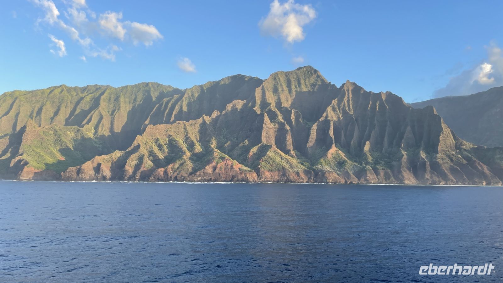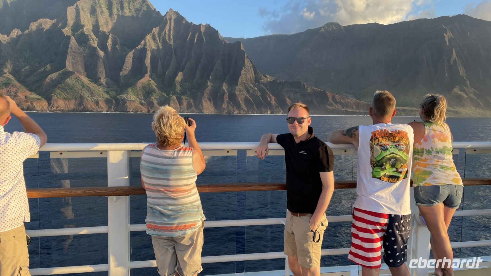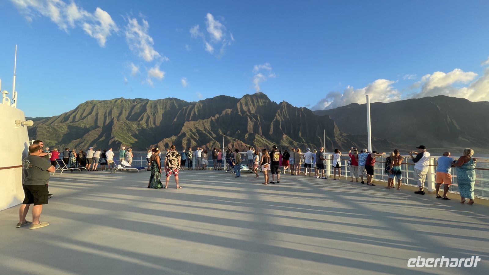 Nun erreichen wir Kauai – die Garteninsel und vielleicht schönste Insel von Hawaii. Hier unternehmen wir auch wieder eine kleine Rundfahrt mit 3 Taxen zum Waimea Canyon. Wir stoppen an verschiedenen Aussichtpunkten, doch leider sehen wir beiden letzten beiden nicht mehr viel, aufgrund von Nebel. Somit stoppen wir auf dem Rückweg noch am Visitorcenter, einer Kaffeeplantage mit Verkostung und am Harley-Davidson Shop. Am späten Nachmittag erreichen wir wieder unser Schiff. Zum Abendessen treffen sich heute die meisten Gäste im französischen Spezialitäten Restaurant Bistro. Das Essen schmeckt sehr gut, jedoch müssen wir teilweise sehr lange warten. Danach lassen wir den Abend bei einem Drink ausklingen und hoffen auf besseres Wetter am morgigen Tag.