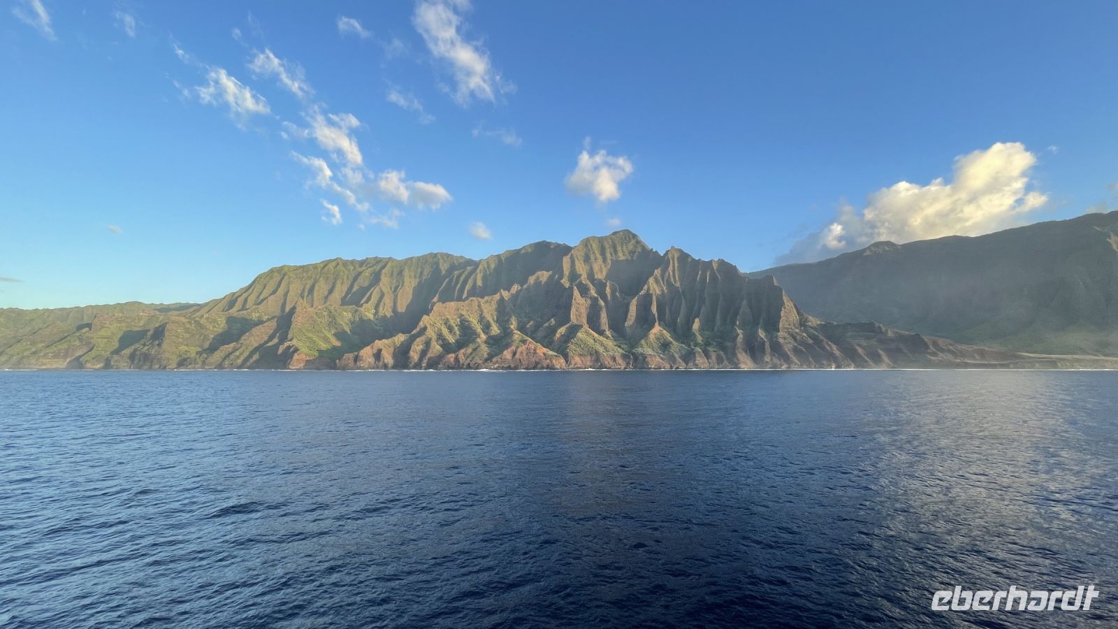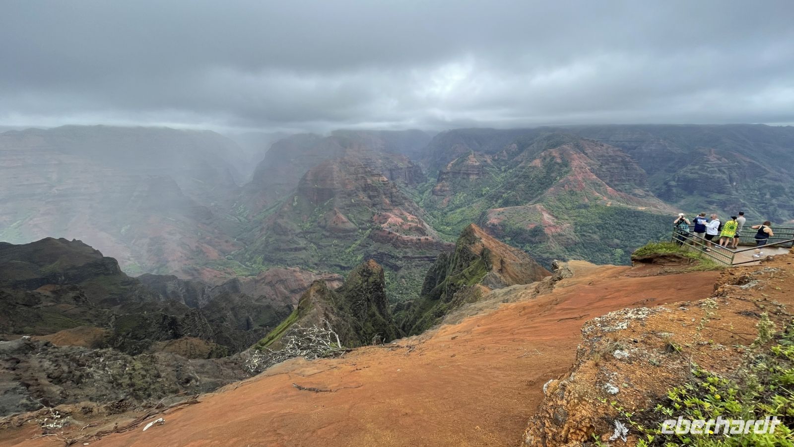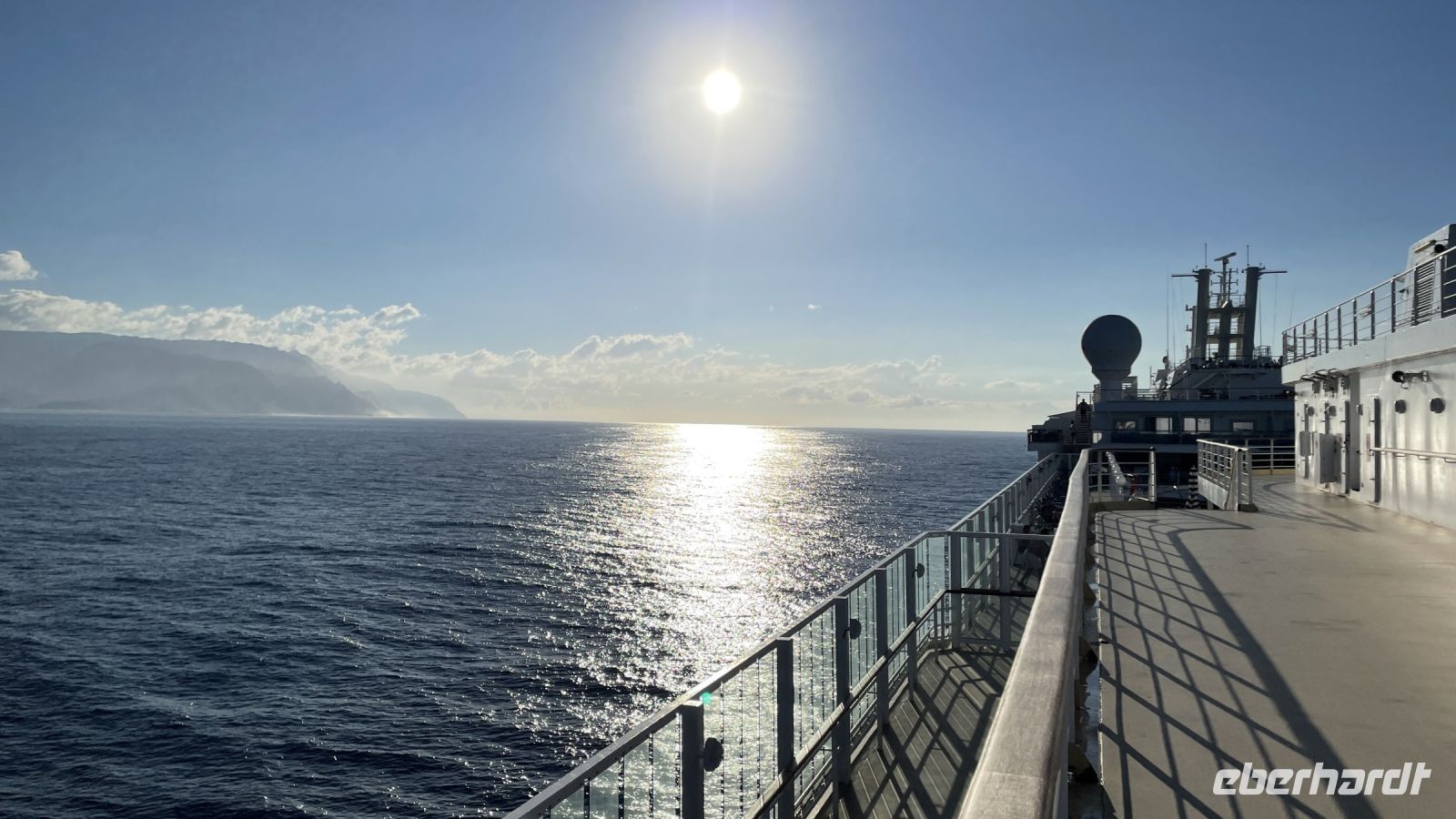 Nun erreichen wir Kauai – die Garteninsel und vielleicht schönste Insel von Hawaii. Hier unternehmen wir auch wieder eine kleine Rundfahrt mit 3 Taxen zum Waimea Canyon. Wir stoppen an verschiedenen Aussichtpunkten, doch leider sehen wir beiden letzten beiden nicht mehr viel, aufgrund von Nebel. Somit stoppen wir auf dem Rückweg noch am Visitorcenter, einer Kaffeeplantage mit Verkostung und am Harley-Davidson Shop. Am späten Nachmittag erreichen wir wieder unser Schiff. Zum Abendessen treffen sich heute die meisten Gäste im französischen Spezialitäten Restaurant Bistro. Das Essen schmeckt sehr gut, jedoch müssen wir teilweise sehr lange warten. Danach lassen wir den Abend bei einem Drink ausklingen und hoffen auf besseres Wetter am morgigen Tag.