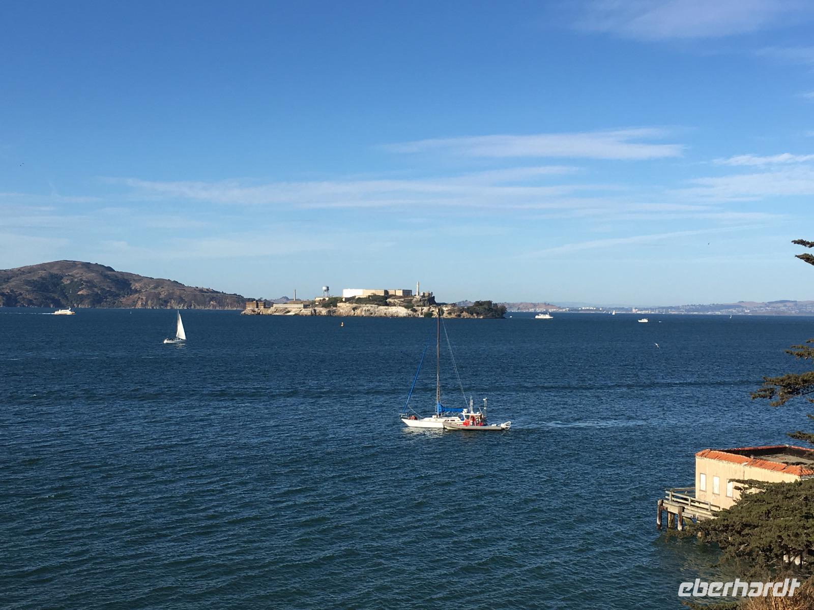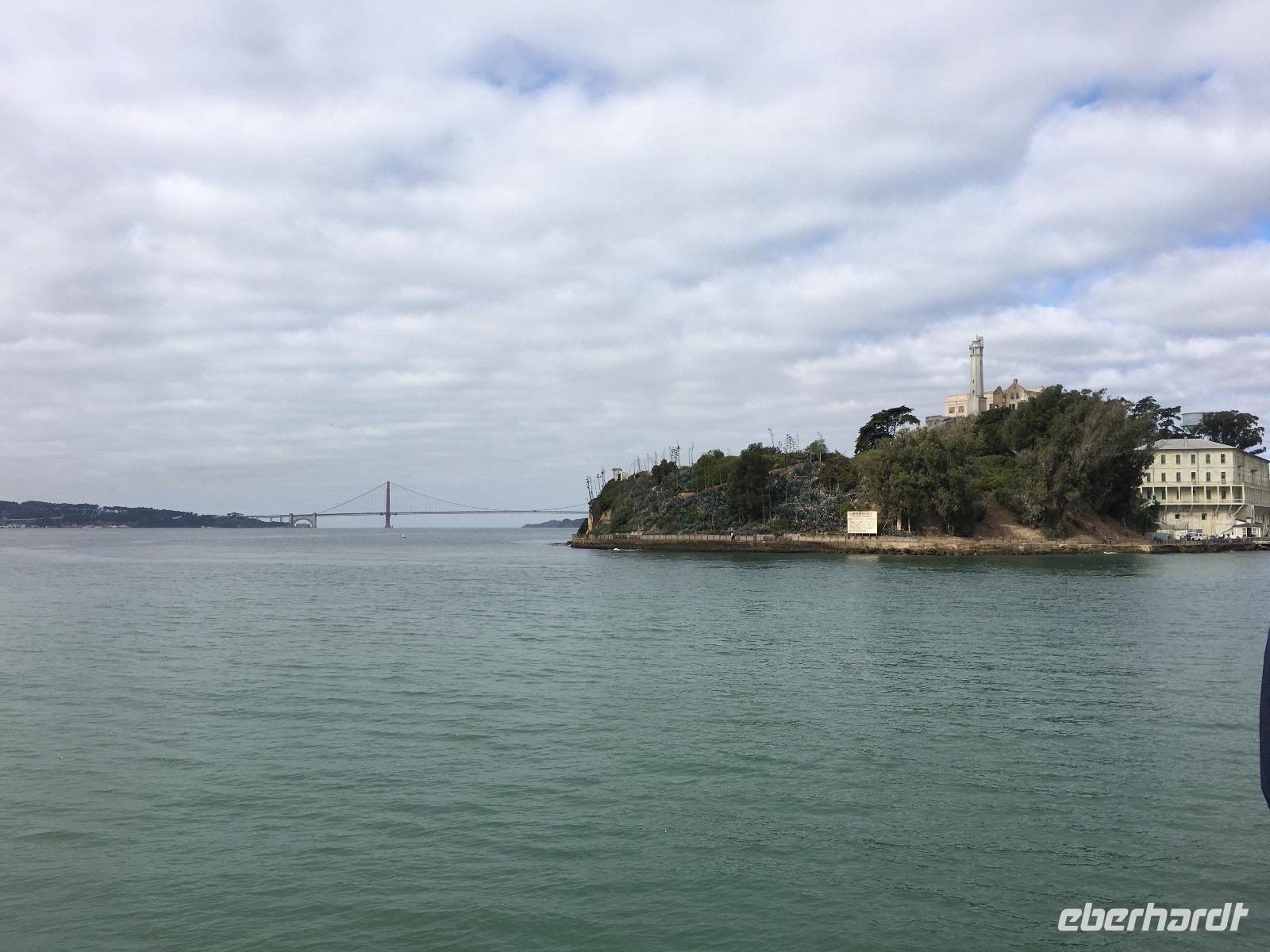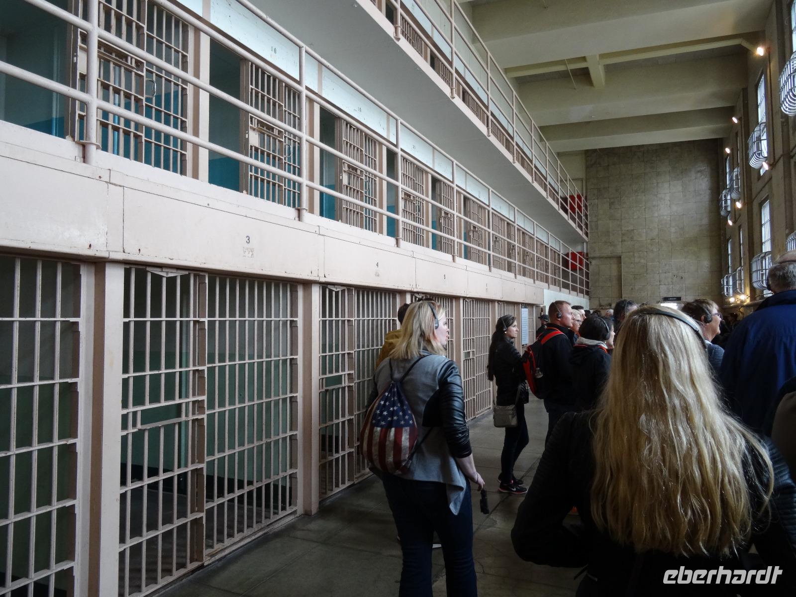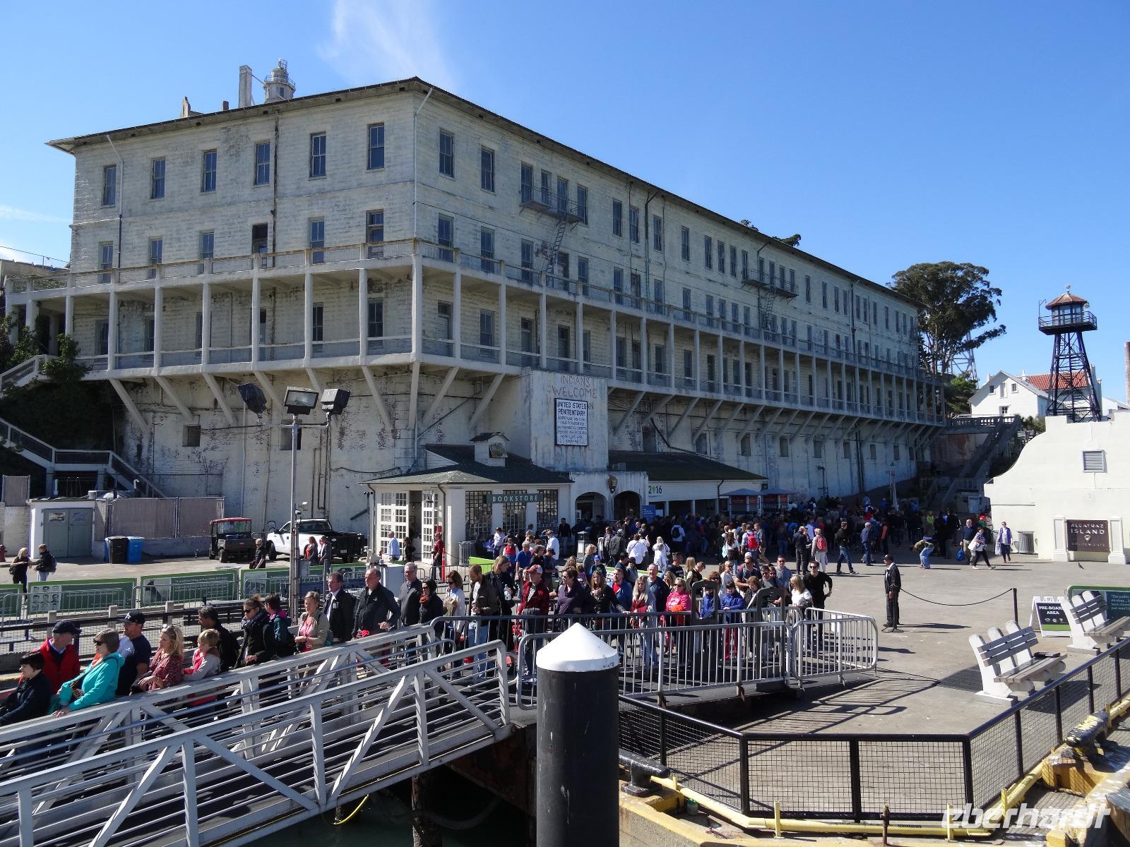 Der heutige Tag versprach mit dem Besuch der Gefängnisinsel Alcatraz einen weiteren Höhepunkt unserer Besichtigungen in der Bay-Area. Sätze wie dieser: "Brich die Regeln und du gehst ins Gefängnis, brich die Gefängnisregeln und du gehst nach Alcatraz" machten seit jeher den morbiden Charme und die Faszination der ehemaligen Gefängnisinsel aus. Jeder Besucher will erfahren, wo und wie einst Al Capone eingesessen hat und warum dieses Gefängnis als absolut ausbruchssicher galt. Mit der California Cable Car Linie fuhren wir bis zur Drumm Street, um von da aus den Weg zum Pier 33, von wo aus die Fähre nach Alcatraz übersetzt, zu Fuß zu gehen. Es war wieder ein schöner Tag und die Vorfreude beschleunigte unsere Schritte. Nach zahlreichen einleitenden und belehrenden Worten durch die Security am Pier 33, was man darf und vor allem nicht darf auf "The Rock", der Insel der Schwerstverbrecher, ging es in knapp zwanzigminütiger Fahrt mit einer Fähre hinüber. Hier angekommen, erklärte ein Parkranger nochmals den Ablauf der Besichtigung und tat Informationen und Hintergründe zum Gefängnis kund. The Rock erkundet man mittels einer Audio-Guided-Tour, welche akustisch sehr anschaulich, realitätsnah und inhaltlich ansprechend gemacht ist. Dabei wurde man durch den Sprecher sukzessive durch die Räumlichkeiten des Gefängnisses geleitet und mit besonderen Ereignissen konfrontiert, so dass man selbst ein beklemmendes Gefühl für die damaligen Bedingungen und die herrschenden Umstände entwickeln konnte. Nach kurzweiligen zwei Stunden waren uns die Namen Alvin "Creepy" Karpis, Robert "The Birdman" Stroud oder auch die von Bernard Coy und Joe Cretzer, zwei Initiatoren der sogenannten "Schlacht von Alcatraz", nicht mehr unbekannt. Trotzdem gelüstete uns nach so viel Gefängnisluft wieder nach freiheitlicher Weite und so verließen wir die Insel am frühen Nachmittag wieder auf demselben Weg wie wir hergekommen waren. Um die "wiedergewonnene" Freiheit richtig auskosten zu können, gab es kein weiteres bindendes Tagesprogramm, sondern jeder konnte nach Gutdünken und Interesse die nächsten Stunden in der Stadt genießen. Ein Teil der Gruppe spazierte bis zur Bay Street/ Ecke Taylor, um von hier aus mit einem Cable Car der Linie Powell-Mason quer durch Downtown zur Market Street zu fahren. Die quietschende, ratternde und manchmal auch unbequeme Fahrt mit einem Cable Car ist sicherlich eines der länger in Erinnerung bleibenden Dinge, die man als Tourist auf seinen Reisen unternehmen kann. Wo sonst kann man bei heutigem Straßenverkehr noch längsseits aus "der Bahn hängen", ohne dafür mit empfindlichen Strafen rechnen zu müssen? Ja, sicher, in Indien und im Herzen Afrikas mag das noch der Fall sein, aber für uns urbanisierte, paragraphenkonforme Wohlstandskosmopoliten war das eine Sensation! Und das auf einer richtigen Berg- und Talfahrt mit einem hundert Jahre alten Vehikel im Herzen der Zukunftsmetropole. Wo um die Ecke Google und Uber an selbstfahrenden Autos forschen und irgendwann von hier aus die Nachricht in die Welt dringen wird, dass Autos, Handys und ein eigener Wille ab sofort obsolet sind. Wir beamen uns fort, hyperkommunizieren und lassen denken. Aber so lange wir diese Stufe (glücklicherweise) nicht erreicht haben, fahren wir Cable Car! Und machten Macy's und ein paar tolle Geschäfte am Union Square unsicher, bevor wir pflastermüde in unser Heim auf Zeit an der Van Ness Avenue zurückkehrten. Nicht ohne noch Geld in diversen Restaurationen über die Stadt verteilt zu hinterlassen. Denn Hunger wird wahrscheinlich nie obsolet...