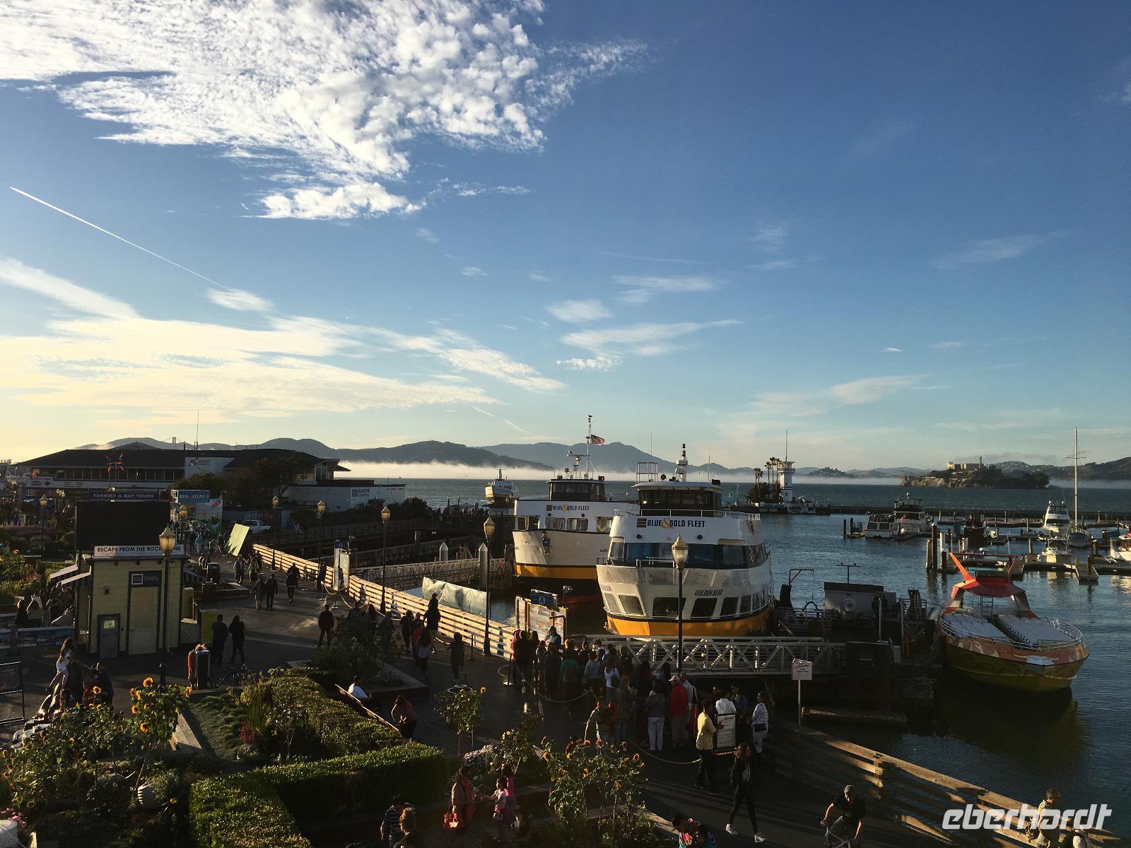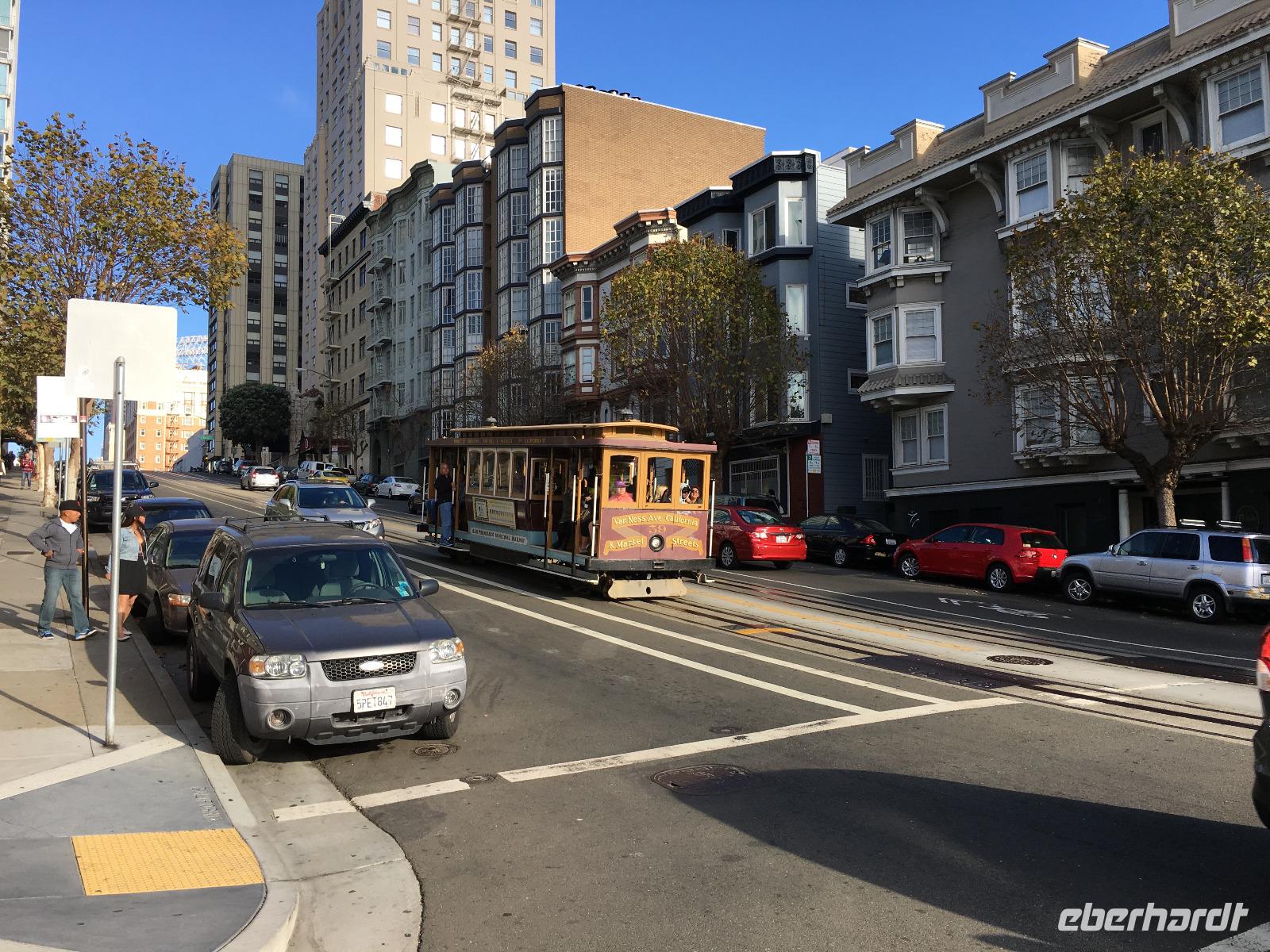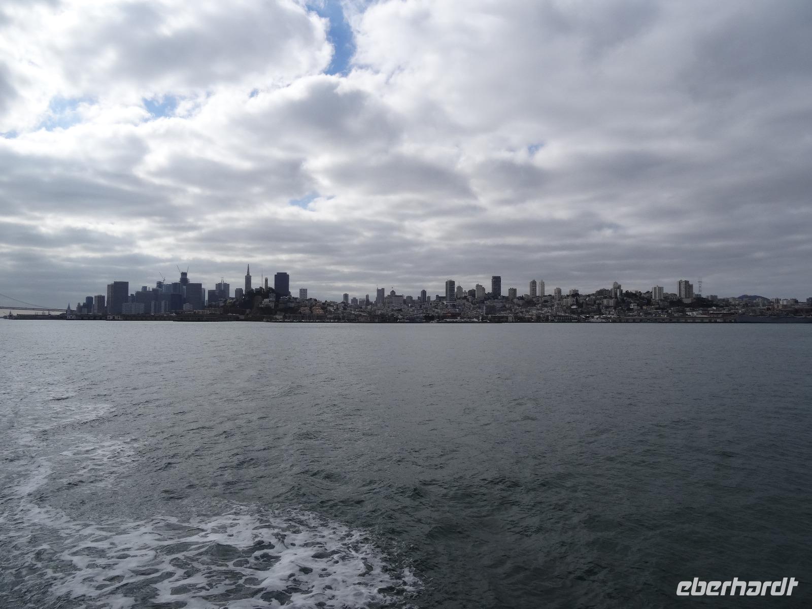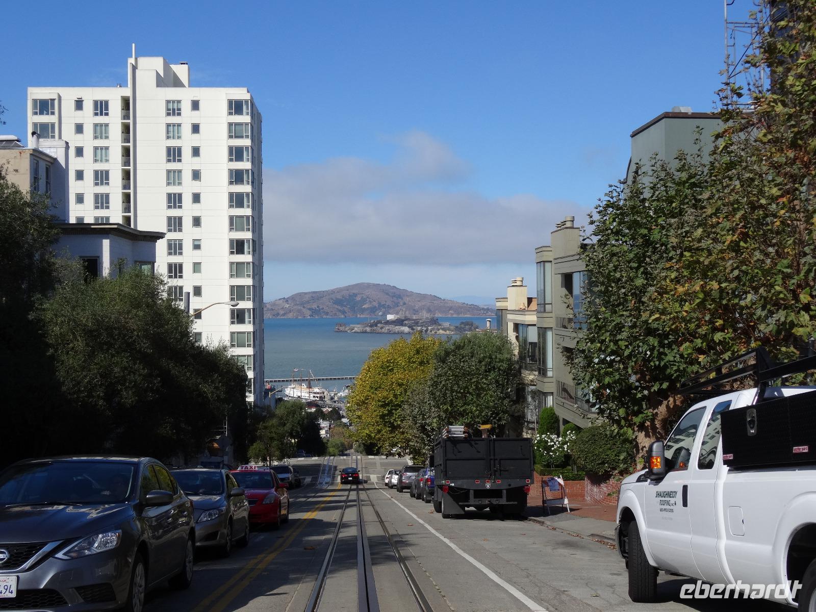 Der heutige Tag versprach mit dem Besuch der Gefängnisinsel Alcatraz einen weiteren Höhepunkt unserer Besichtigungen in der Bay-Area. Sätze wie dieser: "Brich die Regeln und du gehst ins Gefängnis, brich die Gefängnisregeln und du gehst nach Alcatraz" machten seit jeher den morbiden Charme und die Faszination der ehemaligen Gefängnisinsel aus. Jeder Besucher will erfahren, wo und wie einst Al Capone eingesessen hat und warum dieses Gefängnis als absolut ausbruchssicher galt. Mit der California Cable Car Linie fuhren wir bis zur Drumm Street, um von da aus den Weg zum Pier 33, von wo aus die Fähre nach Alcatraz übersetzt, zu Fuß zu gehen. Es war wieder ein schöner Tag und die Vorfreude beschleunigte unsere Schritte. Nach zahlreichen einleitenden und belehrenden Worten durch die Security am Pier 33, was man darf und vor allem nicht darf auf "The Rock", der Insel der Schwerstverbrecher, ging es in knapp zwanzigminütiger Fahrt mit einer Fähre hinüber. Hier angekommen, erklärte ein Parkranger nochmals den Ablauf der Besichtigung und tat Informationen und Hintergründe zum Gefängnis kund. The Rock erkundet man mittels einer Audio-Guided-Tour, welche akustisch sehr anschaulich, realitätsnah und inhaltlich ansprechend gemacht ist. Dabei wurde man durch den Sprecher sukzessive durch die Räumlichkeiten des Gefängnisses geleitet und mit besonderen Ereignissen konfrontiert, so dass man selbst ein beklemmendes Gefühl für die damaligen Bedingungen und die herrschenden Umstände entwickeln konnte. Nach kurzweiligen zwei Stunden waren uns die Namen Alvin "Creepy" Karpis, Robert "The Birdman" Stroud oder auch die von Bernard Coy und Joe Cretzer, zwei Initiatoren der sogenannten "Schlacht von Alcatraz", nicht mehr unbekannt. Trotzdem gelüstete uns nach so viel Gefängnisluft wieder nach freiheitlicher Weite und so verließen wir die Insel am frühen Nachmittag wieder auf demselben Weg wie wir hergekommen waren. Um die "wiedergewonnene" Freiheit richtig auskosten zu können, gab es kein weiteres bindendes Tagesprogramm, sondern jeder konnte nach Gutdünken und Interesse die nächsten Stunden in der Stadt genießen. Ein Teil der Gruppe spazierte bis zur Bay Street/ Ecke Taylor, um von hier aus mit einem Cable Car der Linie Powell-Mason quer durch Downtown zur Market Street zu fahren. Die quietschende, ratternde und manchmal auch unbequeme Fahrt mit einem Cable Car ist sicherlich eines der länger in Erinnerung bleibenden Dinge, die man als Tourist auf seinen Reisen unternehmen kann. Wo sonst kann man bei heutigem Straßenverkehr noch längsseits aus "der Bahn hängen", ohne dafür mit empfindlichen Strafen rechnen zu müssen? Ja, sicher, in Indien und im Herzen Afrikas mag das noch der Fall sein, aber für uns urbanisierte, paragraphenkonforme Wohlstandskosmopoliten war das eine Sensation! Und das auf einer richtigen Berg- und Talfahrt mit einem hundert Jahre alten Vehikel im Herzen der Zukunftsmetropole. Wo um die Ecke Google und Uber an selbstfahrenden Autos forschen und irgendwann von hier aus die Nachricht in die Welt dringen wird, dass Autos, Handys und ein eigener Wille ab sofort obsolet sind. Wir beamen uns fort, hyperkommunizieren und lassen denken. Aber so lange wir diese Stufe (glücklicherweise) nicht erreicht haben, fahren wir Cable Car! Und machten Macy's und ein paar tolle Geschäfte am Union Square unsicher, bevor wir pflastermüde in unser Heim auf Zeit an der Van Ness Avenue zurückkehrten. Nicht ohne noch Geld in diversen Restaurationen über die Stadt verteilt zu hinterlassen. Denn Hunger wird wahrscheinlich nie obsolet...