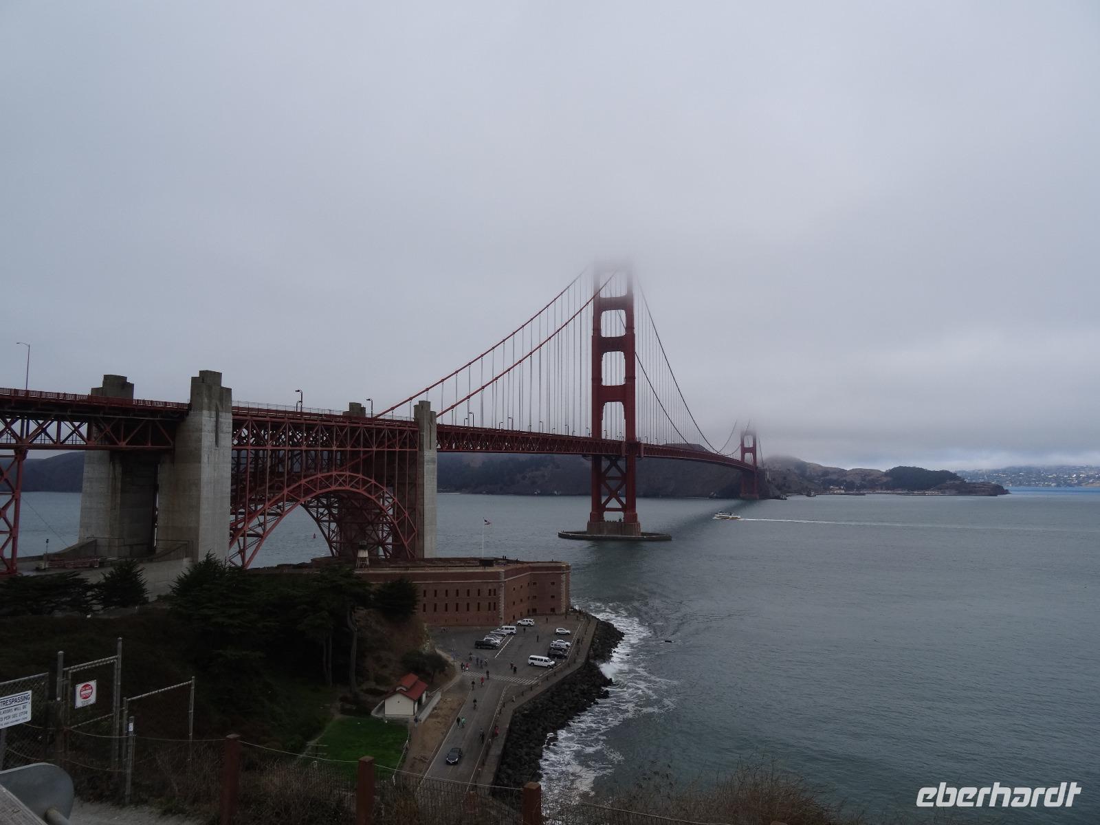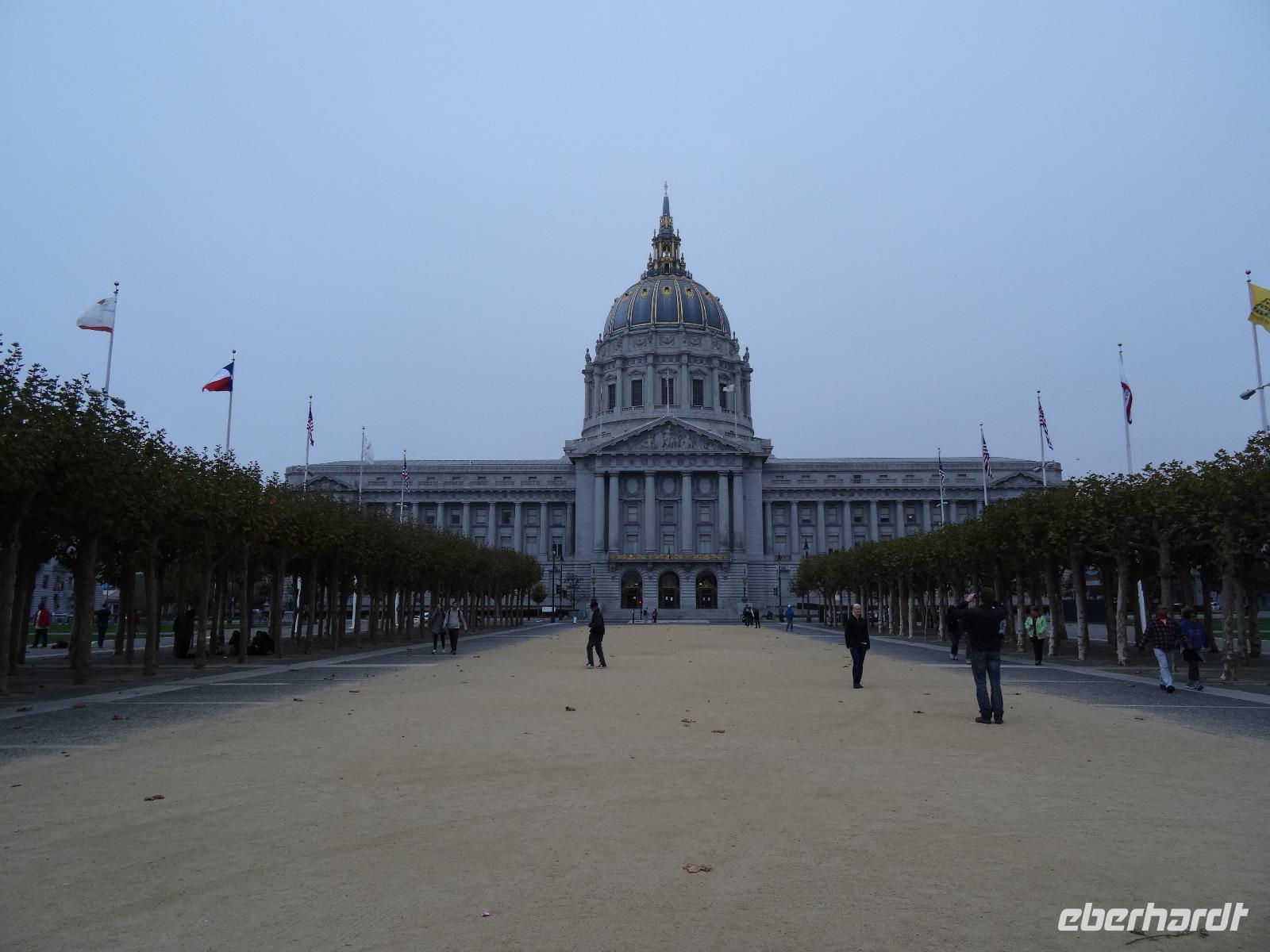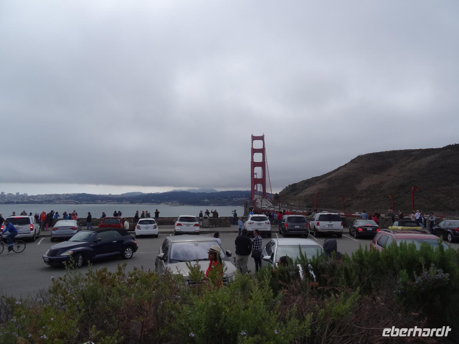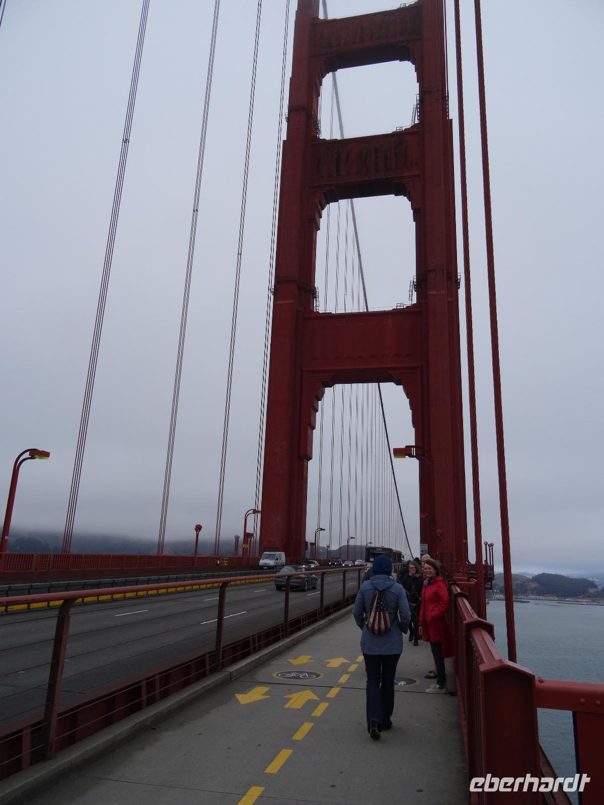 Nach ein paar Stunden erholsamen Schlafes und einem guten Frühstück ging es auf große Stadtrundfahrt. Wir alle waren gespannt auf die bekannten Sehenswürdigkeiten, die wir schon oft auf Bildern bewundern konnten und jetzt endlich in Natura erleben durften. Wir fuhren nordwärts durch Russian Hill, wo man während des Goldrauschs die Gräber russischer Trapper fand, an der bekannten Lombard Street vorbei, danach über Telegraph Hill und Chinatown in Richtung Süden, wo unser erster Stopp am Civic Center erfolgte. Wir stiegen aus und bewunderten die dem Petersdom nachempfundene City Hall, das Rathaus der Stadt, bevor wir unseren Weg mit dem Bus zum Alamo Square fortsetzten, um die wunderbar bunten viktorianischen Häuser, die Painted Ladies, anzuschauen. Leider waren hier größere Baumaßnahmen in der Durchführung, so dass das weithin bekannte Motiv nicht sehr fotogen rüberkam. Nächster Stopp war die architektonisch beeindruckende St. Marys Cathedrale, die in ihrem Inneren bis zu 2500 Menschen Platz gewähren kann. Nicht fehlen darf natürlich das älteste Gebäude San Franciscos, die 1776 gegründete spanische Mission Dolores, die im Laufe ihrer Geschichte so manches Erdbeben überstanden hat. Anschließend passierten wir die Viertel Castro und Heights Ashbury, die vor allem Aufgrund ihrer schwul-lesbischen Community bzw. ihrer Hippivergangenheit Bekanntheit erlangt haben. Wir fuhren in den Golden Gate Park ein, die grüne Oase in der Stadt und pausierten für 20 Minuten am Concourse, wo diverse Spielmannszüge ihre kurzen Auftritte hinlegten. Sehr zur Freude und unter dem Applaus des Publikums. Über Ocean Beach, dem "Surferstrand" der Stadt, ging es am Lincoln Park und dem Presidio vorbei zur Golden Gate Bridge, wo wir unseren Bus verließen und das wahrscheinlich wichtigste Bauwerk San Franciscos zu Fuß überquerten. Weithin leuchtend im Farbton "International Orange" brauchten wir eine gute Stunde, um das 2,8 Kilometer lange Wahrzeichen gemächlichen Schrittes zu überqueren. Dabei nahm weniger die tolle Aussicht unsere permanente Aufmerksamkeit in Anspruch, sondern die scheinbar militant-vorfahrtsbeanspruchenden Radfahrer, die einen trillerpfeifend mit beinahe Tour-de-France-Geschwindigkeit waghalsig überholten. Am anderen Ende im Marin County stiegen wir wieder in unseren Bus und durchfuhren das kleine, beschauliche Städtchen Sausolito, welches seinen Bewohnern eine großstadtnahe, aber durchaus kleinbürgerlich-elitäre Idylle bieten kann. Wieder in der Stadt zurück passierten wir Pacific Heights, bevor wir am Fisherman's Wharf, genauer gesagt am Pier 39, eine kleine Mittagspause einlegten. Hier gab es so ziemlich alles, was der moderne Tourist zur schnellen Sättigung von Augen, Ohren und vor allem Magen normalerweise sucht. Inklusive einer kleinen Seelöwenkolonie, die sich hier auf hölzernen Pontons häuslich niedergelassen hat. Derart gestärkt an Leib und Seele setzten wir unsere Stadterkundung fort und begaben uns erneut zur Lombard-Street, um diese jetzt auf dem berühmten, gewundenen Teilstück zu Fuß zu erkunden. Wieder im Bus, machten wir dem Embarcadero unsere Aufwartung und fuhrnierten (mein persönlicher Beitrag zum Kunstwort des Jahres: eine Mischung aus fahren und flanieren) gemächlich zwischen Fishermann's Wharf und dem Ferry Building entlang, immer die auffällig bunt lackierten alten Trambahnen im Blick. Zum Abschluss unserer heutigen Tour durchquerten wir South Beach und South of Market mit den emporspringenden Neubauten im Safer-Earthquake-Style, bevor wir über den Financial District, Nob Hill und Japantown zum Hotel zurückfuhren. Eine wunderbare Fahrt durch eine wunderbare Stadt an einem wunderbaren Tag (Columbus-Day) nahm damit ihr Ende.