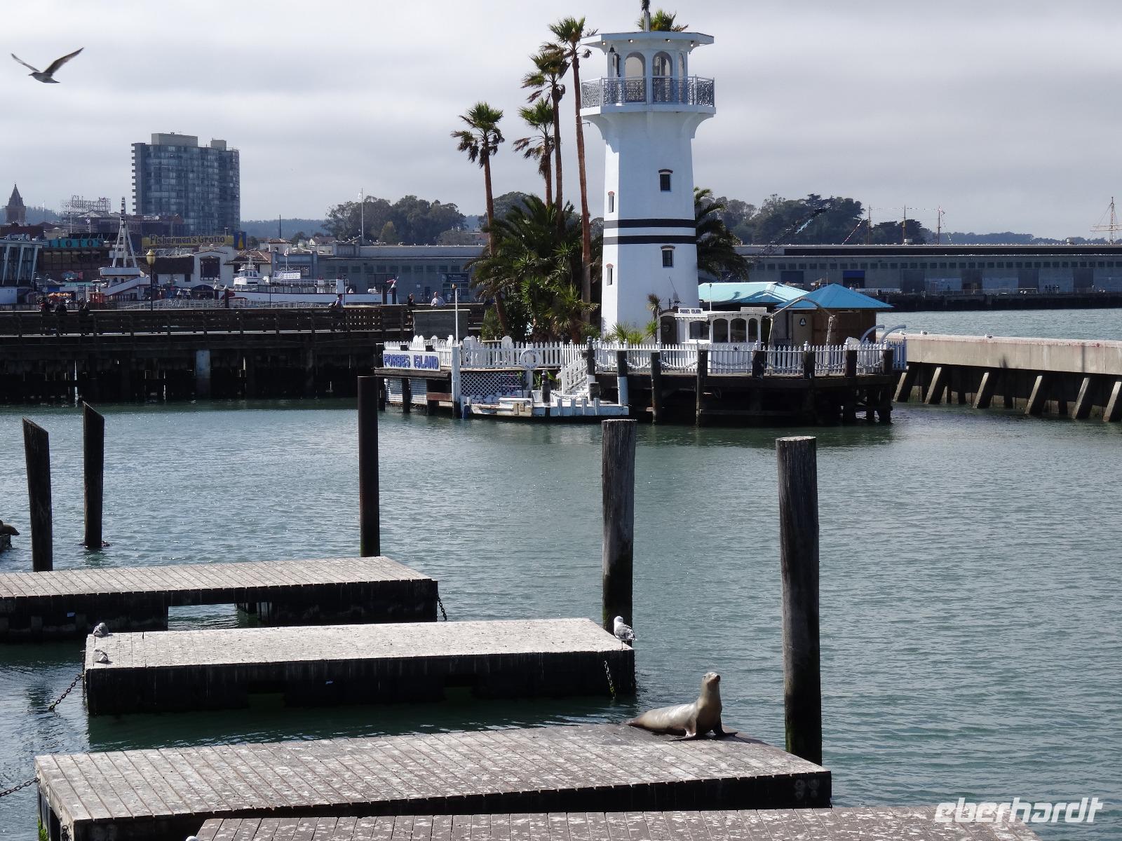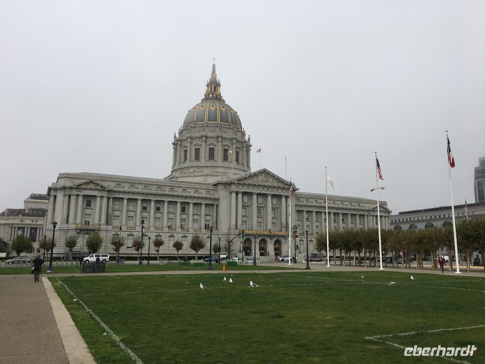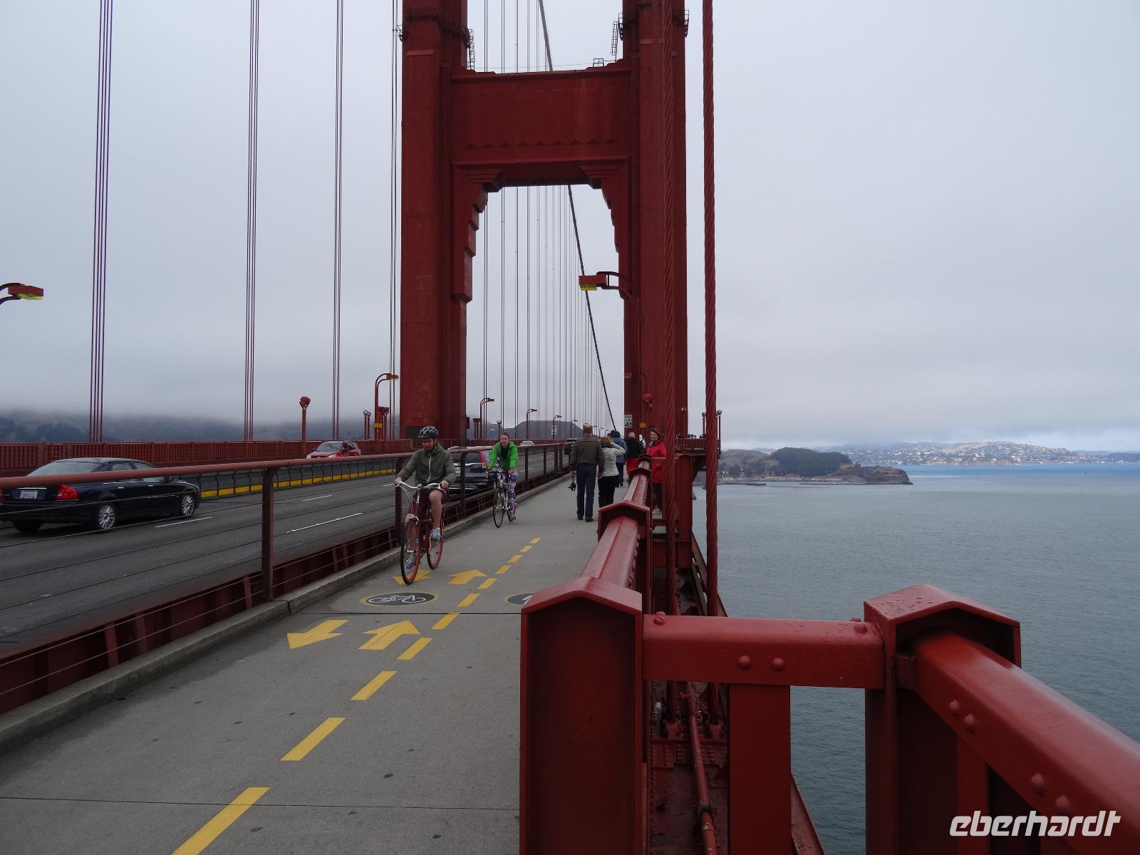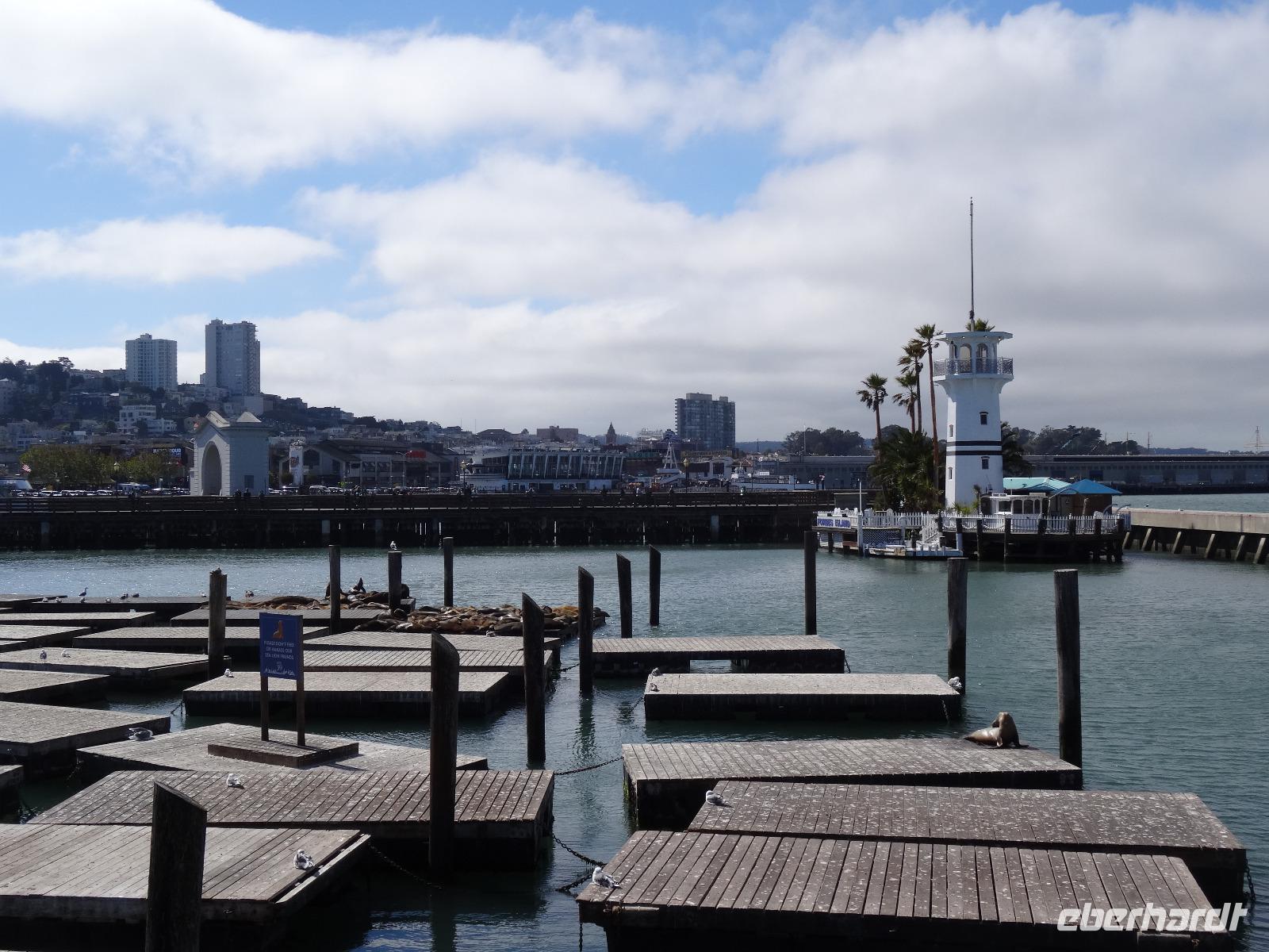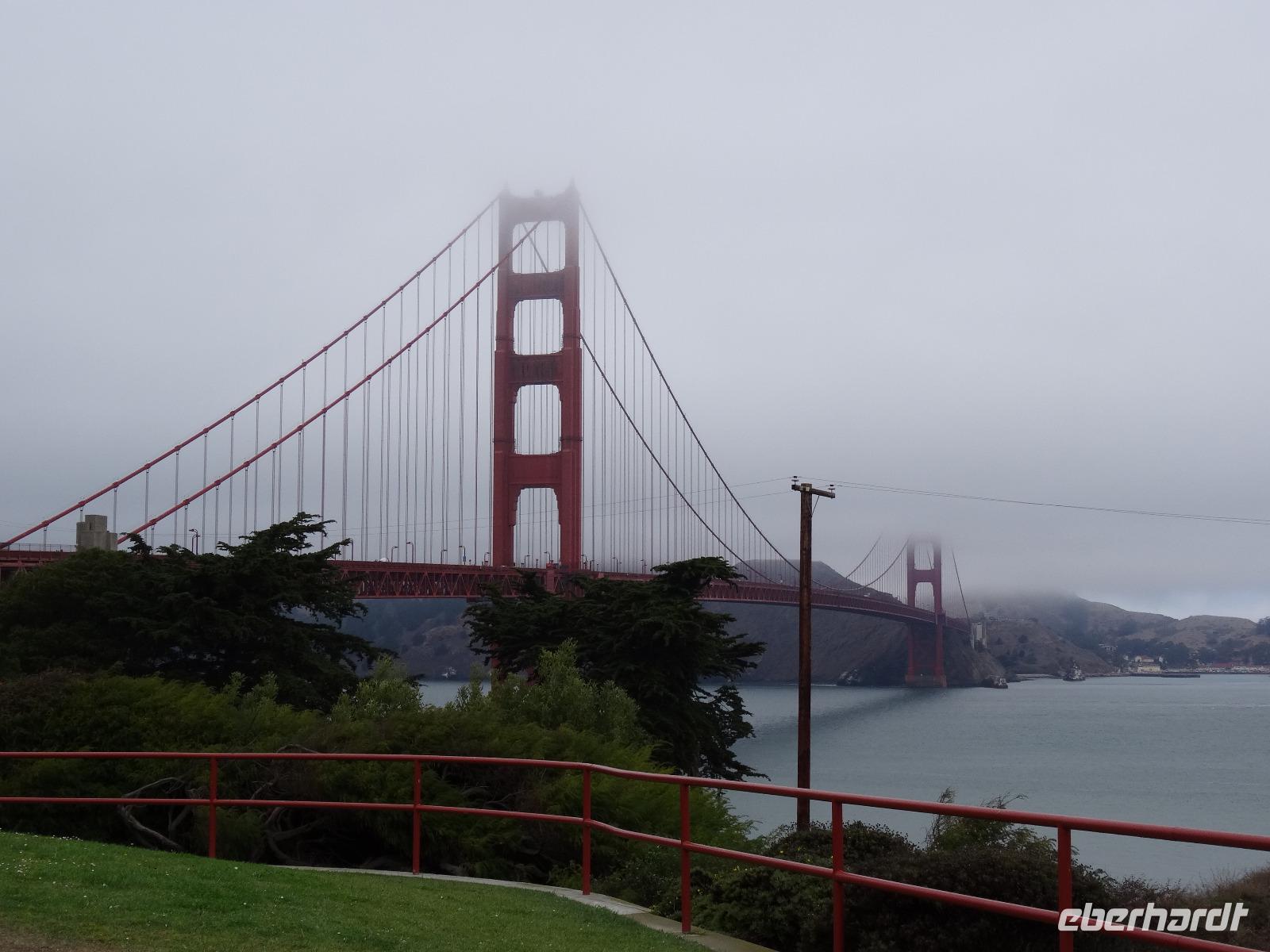 Nach ein paar Stunden erholsamen Schlafes und einem guten Frühstück ging es auf große Stadtrundfahrt. Wir alle waren gespannt auf die bekannten Sehenswürdigkeiten, die wir schon oft auf Bildern bewundern konnten und jetzt endlich in Natura erleben durften. Wir fuhren nordwärts durch Russian Hill, wo man während des Goldrauschs die Gräber russischer Trapper fand, an der bekannten Lombard Street vorbei, danach über Telegraph Hill und Chinatown in Richtung Süden, wo unser erster Stopp am Civic Center erfolgte. Wir stiegen aus und bewunderten die dem Petersdom nachempfundene City Hall, das Rathaus der Stadt, bevor wir unseren Weg mit dem Bus zum Alamo Square fortsetzten, um die wunderbar bunten viktorianischen Häuser, die Painted Ladies, anzuschauen. Leider waren hier größere Baumaßnahmen in der Durchführung, so dass das weithin bekannte Motiv nicht sehr fotogen rüberkam. Nächster Stopp war die architektonisch beeindruckende St. Marys Cathedrale, die in ihrem Inneren bis zu 2500 Menschen Platz gewähren kann. Nicht fehlen darf natürlich das älteste Gebäude San Franciscos, die 1776 gegründete spanische Mission Dolores, die im Laufe ihrer Geschichte so manches Erdbeben überstanden hat. Anschließend passierten wir die Viertel Castro und Heights Ashbury, die vor allem Aufgrund ihrer schwul-lesbischen Community bzw. ihrer Hippivergangenheit Bekanntheit erlangt haben. Wir fuhren in den Golden Gate Park ein, die grüne Oase in der Stadt und pausierten für 20 Minuten am Concourse, wo diverse Spielmannszüge ihre kurzen Auftritte hinlegten. Sehr zur Freude und unter dem Applaus des Publikums. Über Ocean Beach, dem "Surferstrand" der Stadt, ging es am Lincoln Park und dem Presidio vorbei zur Golden Gate Bridge, wo wir unseren Bus verließen und das wahrscheinlich wichtigste Bauwerk San Franciscos zu Fuß überquerten. Weithin leuchtend im Farbton "International Orange" brauchten wir eine gute Stunde, um das 2,8 Kilometer lange Wahrzeichen gemächlichen Schrittes zu überqueren. Dabei nahm weniger die tolle Aussicht unsere permanente Aufmerksamkeit in Anspruch, sondern die scheinbar militant-vorfahrtsbeanspruchenden Radfahrer, die einen trillerpfeifend mit beinahe Tour-de-France-Geschwindigkeit waghalsig überholten. Am anderen Ende im Marin County stiegen wir wieder in unseren Bus und durchfuhren das kleine, beschauliche Städtchen Sausolito, welches seinen Bewohnern eine großstadtnahe, aber durchaus kleinbürgerlich-elitäre Idylle bieten kann. Wieder in der Stadt zurück passierten wir Pacific Heights, bevor wir am Fisherman's Wharf, genauer gesagt am Pier 39, eine kleine Mittagspause einlegten. Hier gab es so ziemlich alles, was der moderne Tourist zur schnellen Sättigung von Augen, Ohren und vor allem Magen normalerweise sucht. Inklusive einer kleinen Seelöwenkolonie, die sich hier auf hölzernen Pontons häuslich niedergelassen hat. Derart gestärkt an Leib und Seele setzten wir unsere Stadterkundung fort und begaben uns erneut zur Lombard-Street, um diese jetzt auf dem berühmten, gewundenen Teilstück zu Fuß zu erkunden. Wieder im Bus, machten wir dem Embarcadero unsere Aufwartung und fuhrnierten (mein persönlicher Beitrag zum Kunstwort des Jahres: eine Mischung aus fahren und flanieren) gemächlich zwischen Fishermann's Wharf und dem Ferry Building entlang, immer die auffällig bunt lackierten alten Trambahnen im Blick. Zum Abschluss unserer heutigen Tour durchquerten wir South Beach und South of Market mit den emporspringenden Neubauten im Safer-Earthquake-Style, bevor wir über den Financial District, Nob Hill und Japantown zum Hotel zurückfuhren. Eine wunderbare Fahrt durch eine wunderbare Stadt an einem wunderbaren Tag (Columbus-Day) nahm damit ihr Ende.