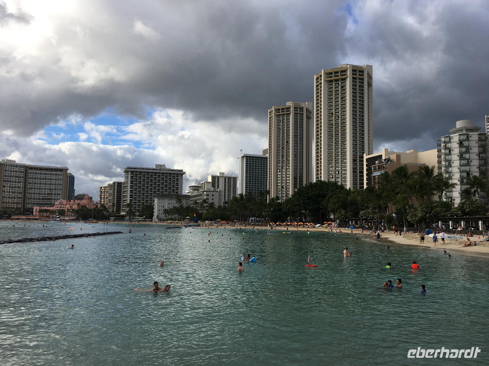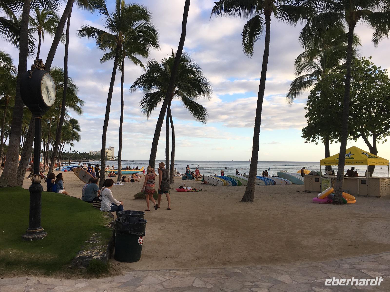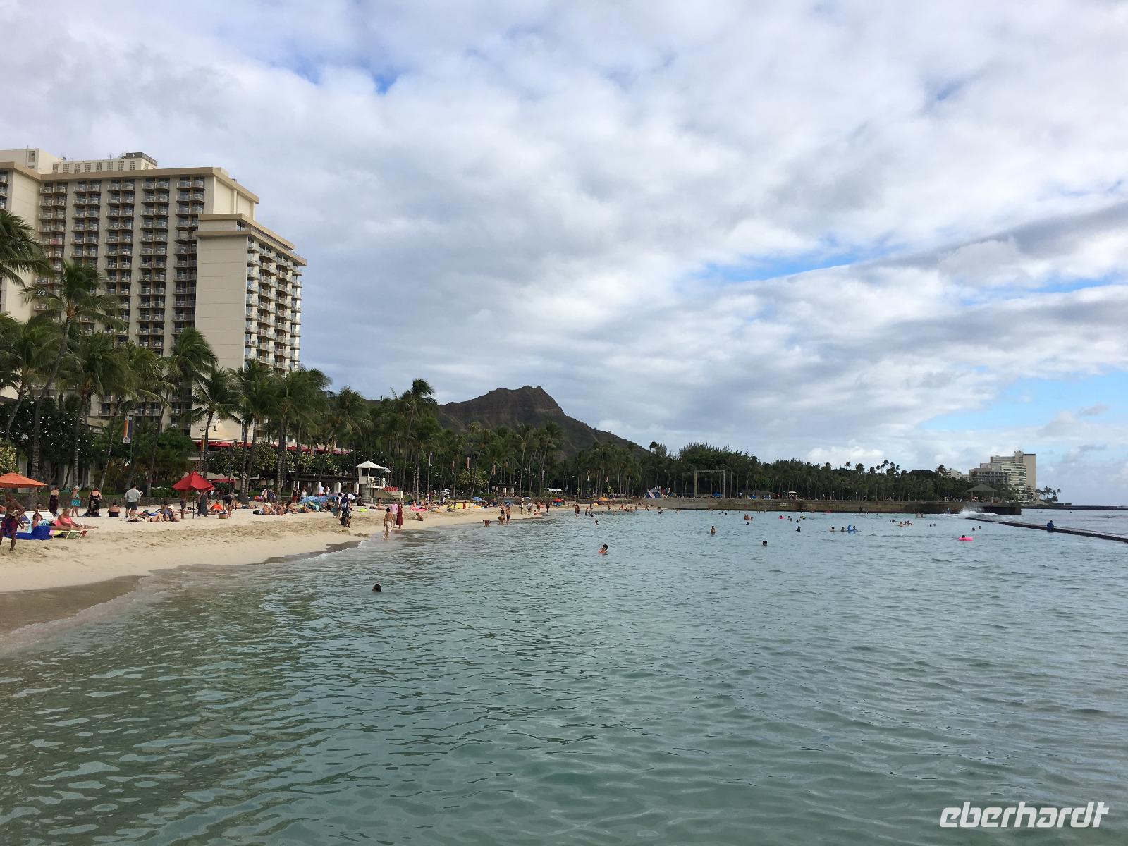 Heute verabschiedeten wir uns vom amerikanischen Festland und begaben uns auf einen Flug ins 3800 Kilometer entfernte polynesische Kleinod Hawaii. Innerhalb von knapp fünf Stunden wechselten wir vom Golden State in den Aloha State, von 19 Grad nach 29 Grad, von "Den Innovativen gehört die Welt" nach "Hang Loose". Und das alles ziemlich schmerzfrei. Einem ereignislosen Flug über die pazifische Unendlichkeit stand ein herzlicher Empfang am Flughafen von Honolulu gegenüber. Man begrüßte uns mit einem herzlichen „Aloha" und lavendelfarbenen Leis, bunten Blumenketten, die man als Zeichen des Willkommens um den Hals gelegt bekam. Der relativ übersichtliche Flughafen entließ sowohl uns als auch unser Gepäck schon nach kurzer Zeit, so dass wir geradewegs zu unserem Hotel in den in Urlauberohren verheißungsvoll klingenden Stadtteil Waikiki fahren konnten. Sah man von einigen regionalen Besonderheiten ab, die Südseeinseln vielleicht so mit sich bringen, war man doch unzweifelhaft im Einfluss des amerikanischen Geschmacks und Lebensstils geblieben. Honolulu unterscheidet sich nur unwesentlich von anderen amerikanischen Großstädten, allein die topographischen Gegebenheiten machen es einzigartig. Wir checkten schnell in unserem Hotel ein, bevor es zum Abendessen ging, welches wir in einem schönen Restaurant mit direktem Blick auf Waikiki Beach zu uns nahmen. Obwohl es noch zeitig am Abend war, mussten wir heute wieder eine Zeitverschiebung "wegstecken", dieses Mal drei Stunden. Und so bummelten wir alsbald an der belebten und schön beleuchteten Strandpromenade zurück zum Hotel, um uns zur Ruhe zu betten und von den kommenden Südseeabenteuern zu träumen.