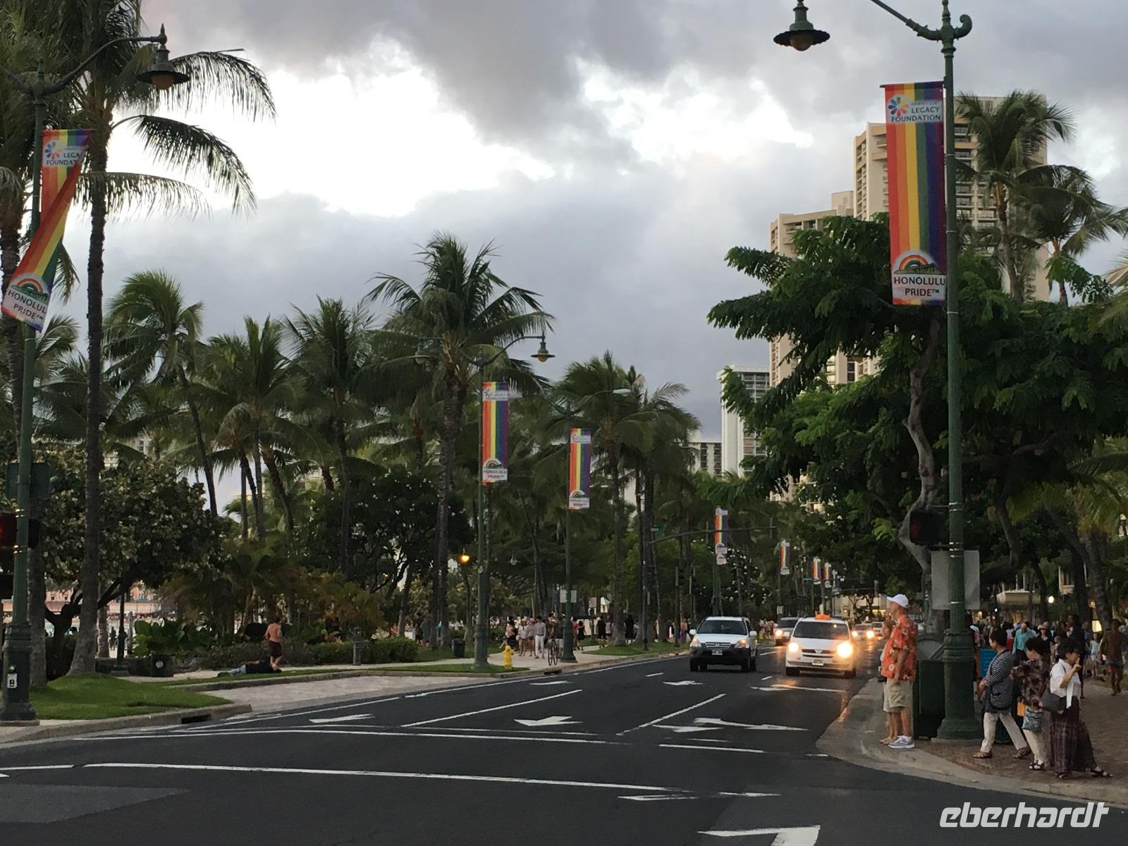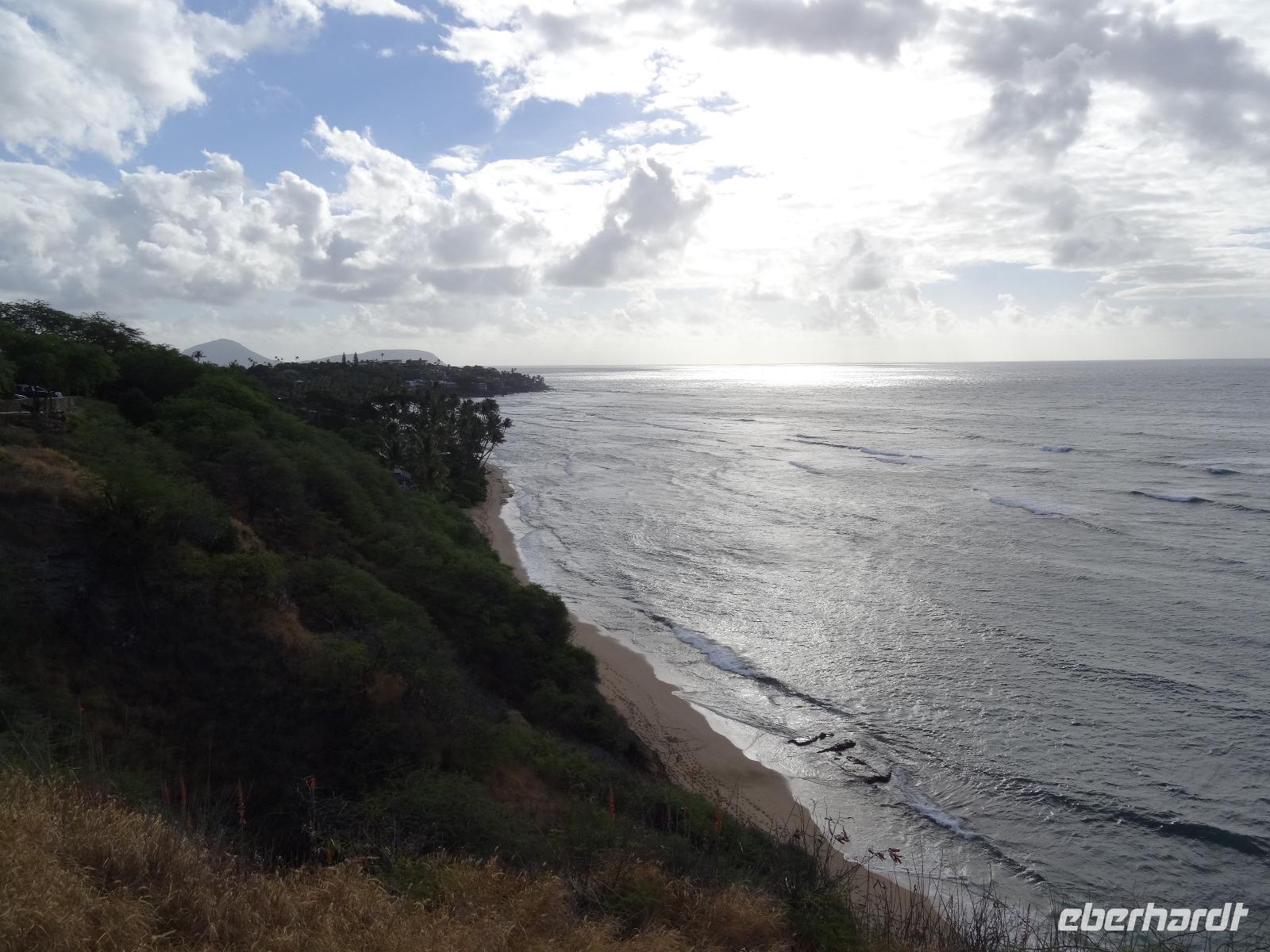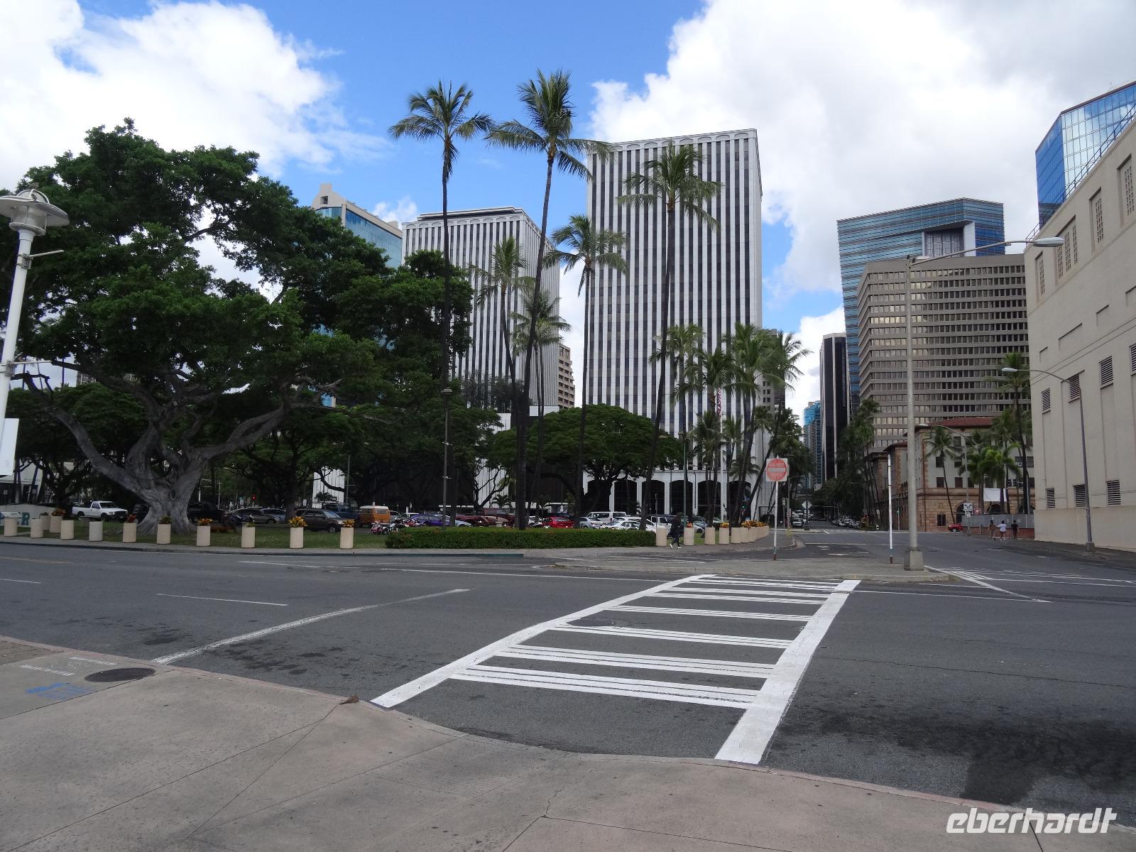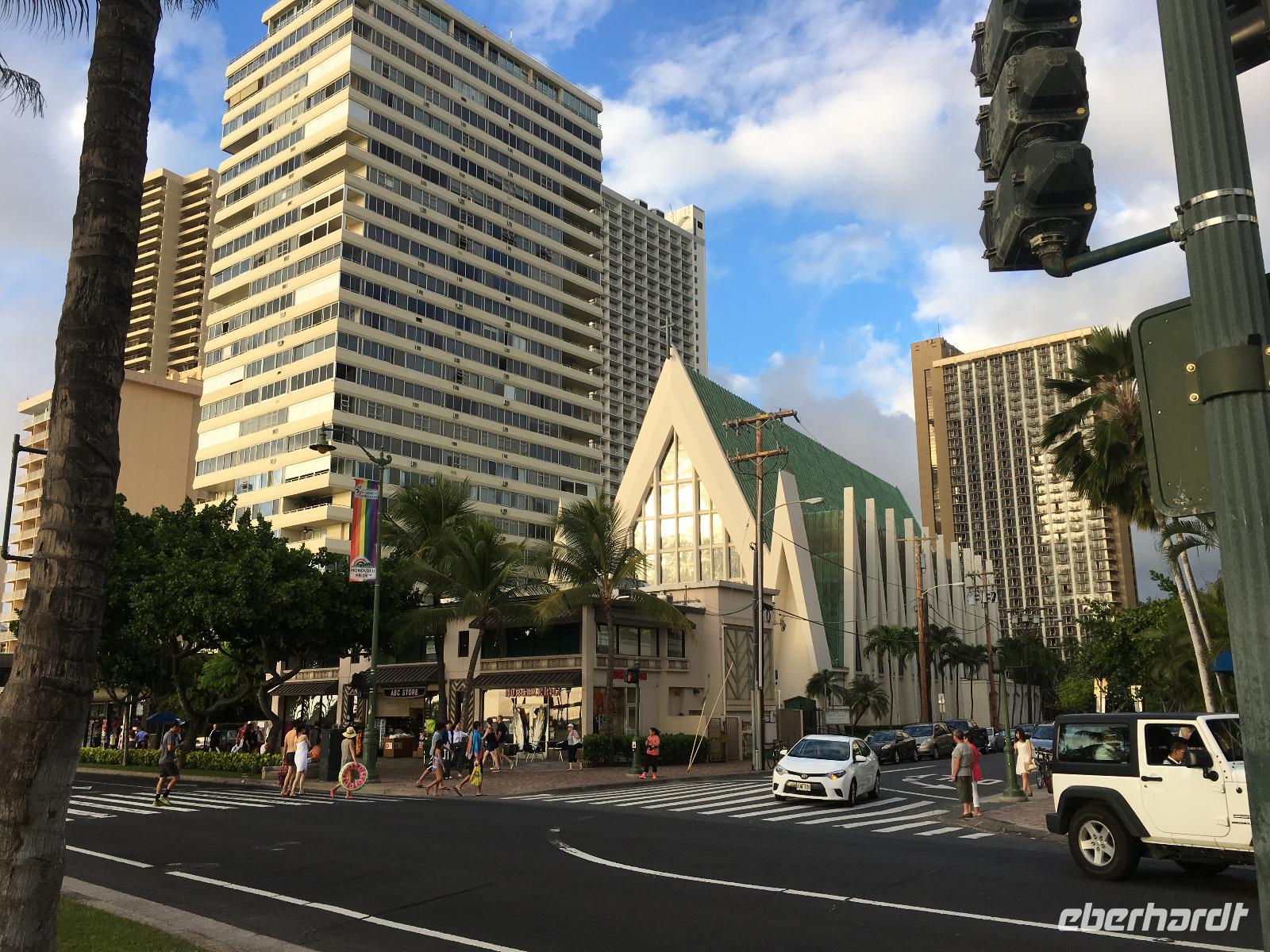 Heute verabschiedeten wir uns vom amerikanischen Festland und begaben uns auf einen Flug ins 3800 Kilometer entfernte polynesische Kleinod Hawaii. Innerhalb von knapp fünf Stunden wechselten wir vom Golden State in den Aloha State, von 19 Grad nach 29 Grad, von "Den Innovativen gehört die Welt" nach "Hang Loose". Und das alles ziemlich schmerzfrei. Einem ereignislosen Flug über die pazifische Unendlichkeit stand ein herzlicher Empfang am Flughafen von Honolulu gegenüber. Man begrüßte uns mit einem herzlichen „Aloha" und lavendelfarbenen Leis, bunten Blumenketten, die man als Zeichen des Willkommens um den Hals gelegt bekam. Der relativ übersichtliche Flughafen entließ sowohl uns als auch unser Gepäck schon nach kurzer Zeit, so dass wir geradewegs zu unserem Hotel in den in Urlauberohren verheißungsvoll klingenden Stadtteil Waikiki fahren konnten. Sah man von einigen regionalen Besonderheiten ab, die Südseeinseln vielleicht so mit sich bringen, war man doch unzweifelhaft im Einfluss des amerikanischen Geschmacks und Lebensstils geblieben. Honolulu unterscheidet sich nur unwesentlich von anderen amerikanischen Großstädten, allein die topographischen Gegebenheiten machen es einzigartig. Wir checkten schnell in unserem Hotel ein, bevor es zum Abendessen ging, welches wir in einem schönen Restaurant mit direktem Blick auf Waikiki Beach zu uns nahmen. Obwohl es noch zeitig am Abend war, mussten wir heute wieder eine Zeitverschiebung "wegstecken", dieses Mal drei Stunden. Und so bummelten wir alsbald an der belebten und schön beleuchteten Strandpromenade zurück zum Hotel, um uns zur Ruhe zu betten und von den kommenden Südseeabenteuern zu träumen.
