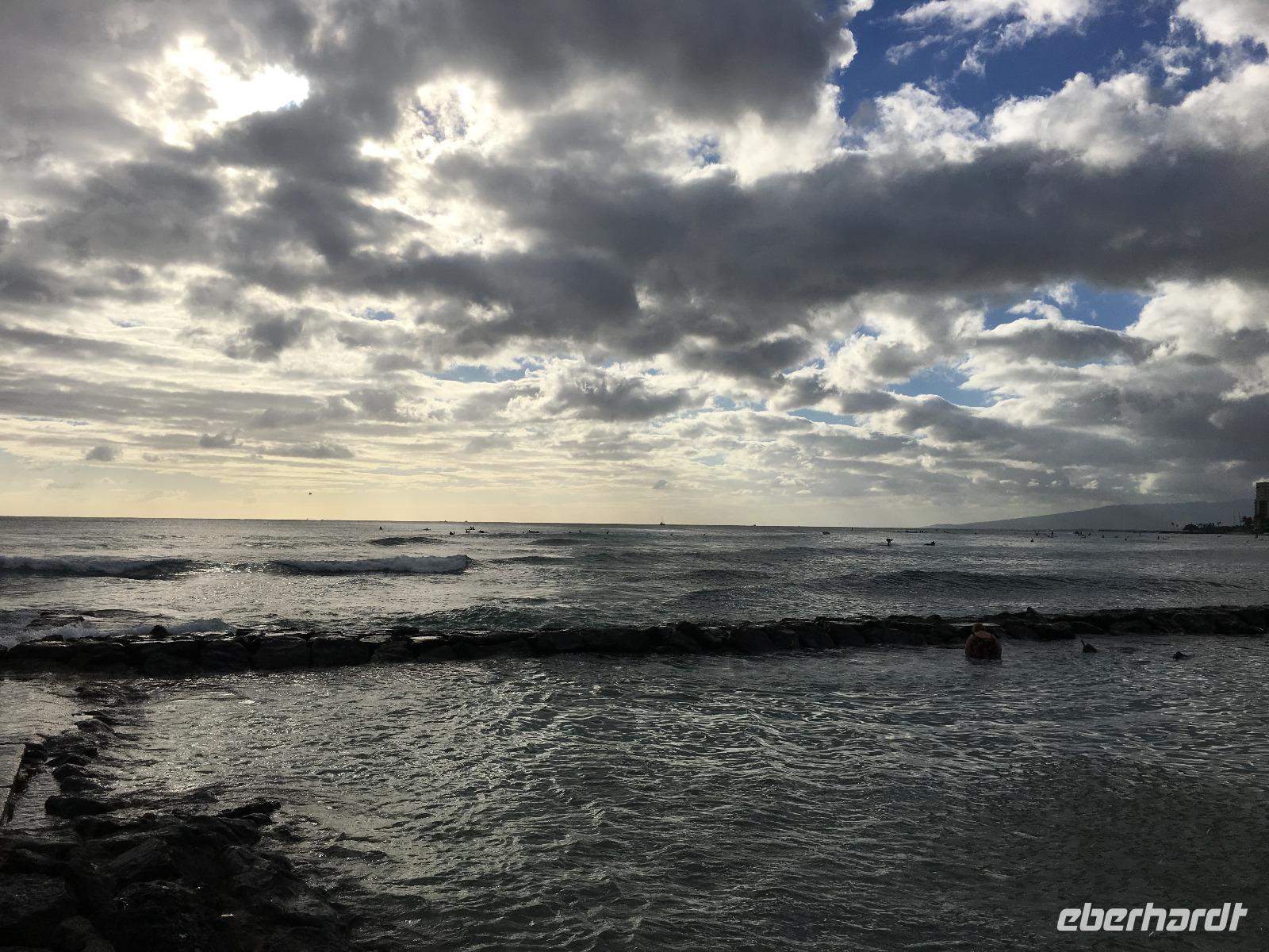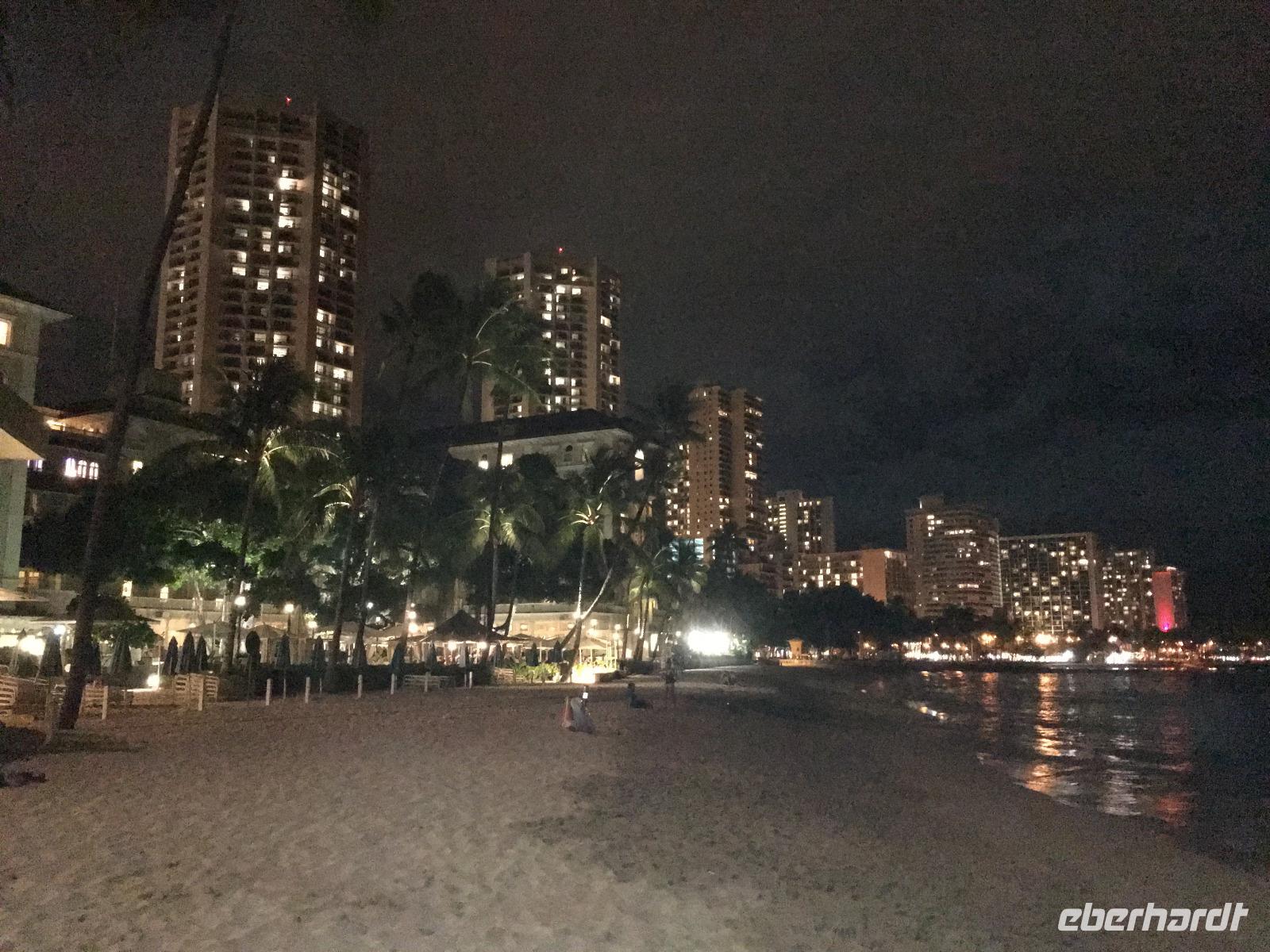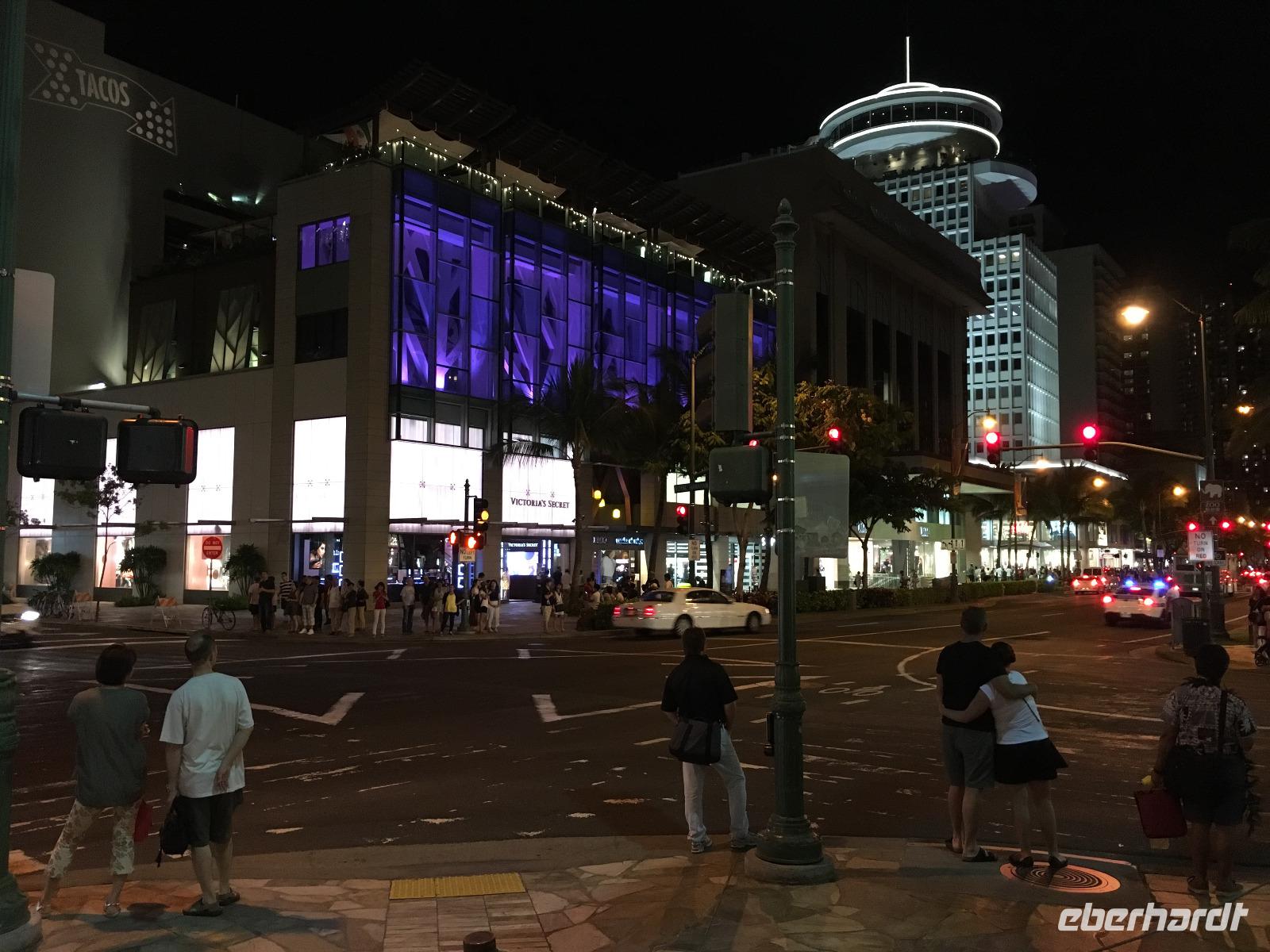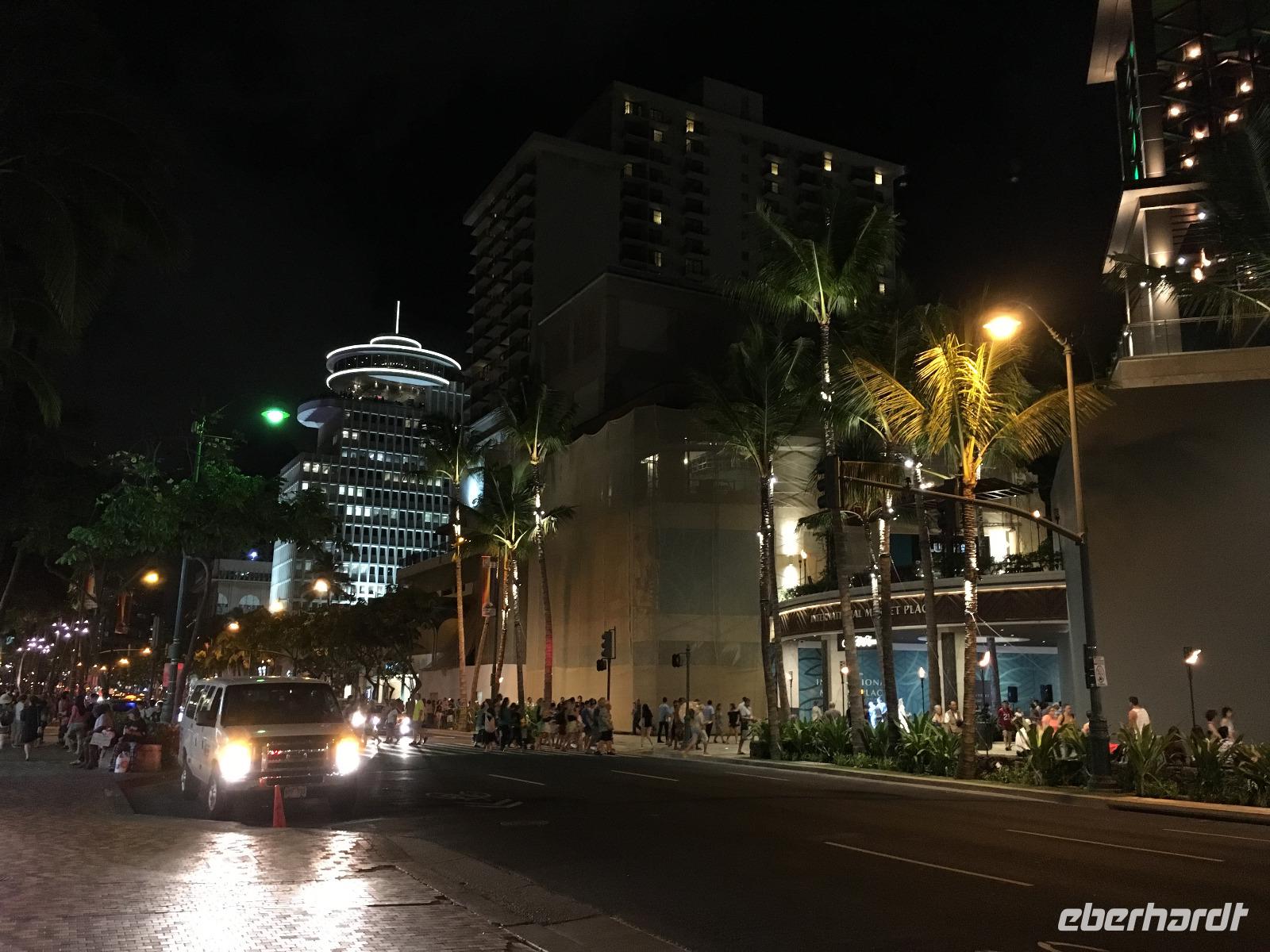 Da Waikiki nicht umsonst ein weltweiter Touristenmagnet ist, konnte man hier jetzt noch diversen Aktivitäten frönen, die einen Urlaub auch ausmachen. Meistens begann es mit einem Sprung ins 26 Grad warme Wasser, daran anschließend ein Bummel an den verlockenden Auslagen der Geschäfte entlang oder ein schönes Abendessen mit Blick auf das Meer und den tollen, wenn auch kurzen Sonnenuntergang. Wer zur rechten Zeit da war, konnte an diesem Abend auch ein kleines Feuerwerk erleben oder einer Hula-Show im polynesischen Kulturzentrum beiwohnen. Möglichkeiten gab es deren viele, so dass jeder auf seine Art und Weise einen schönen Tagesabschluss verbringen konnte.