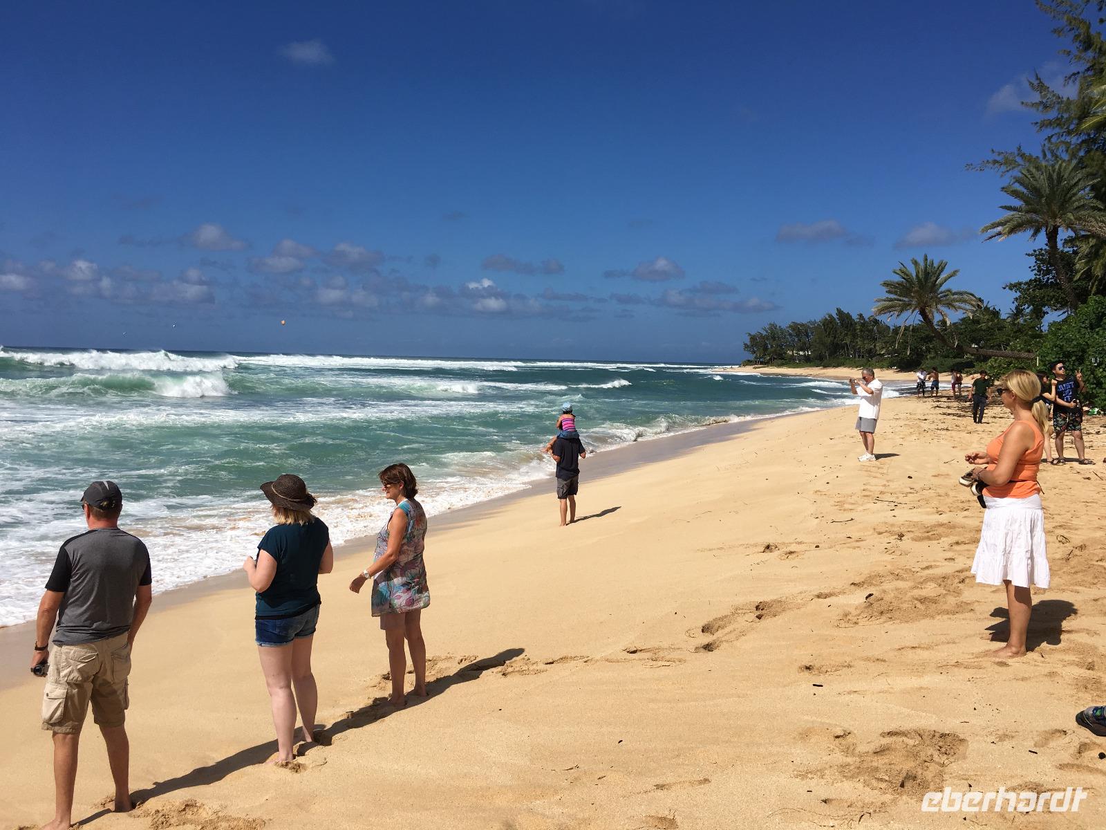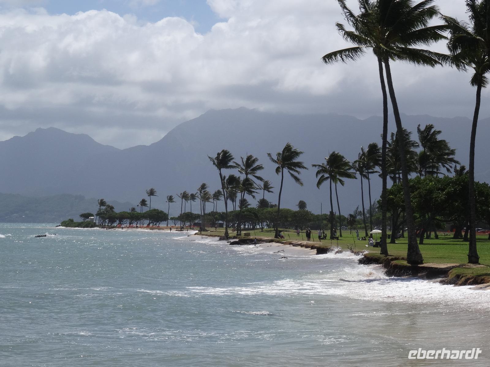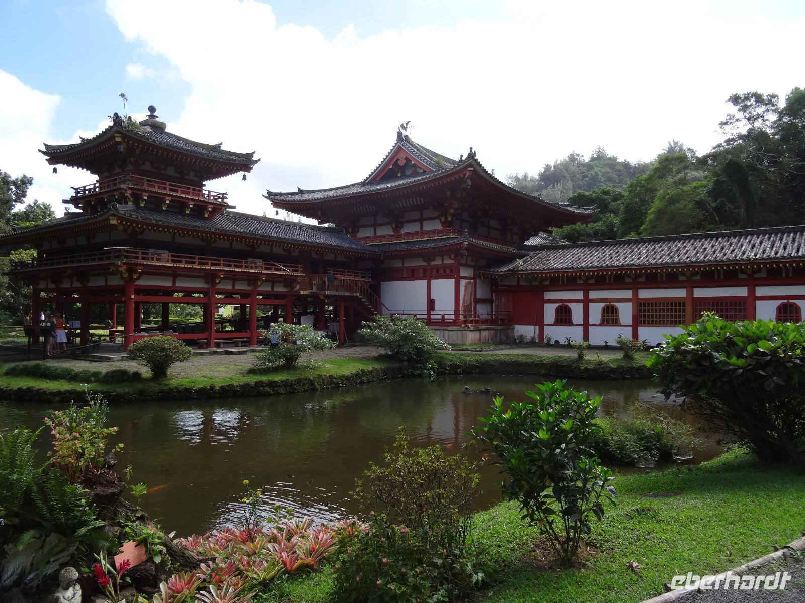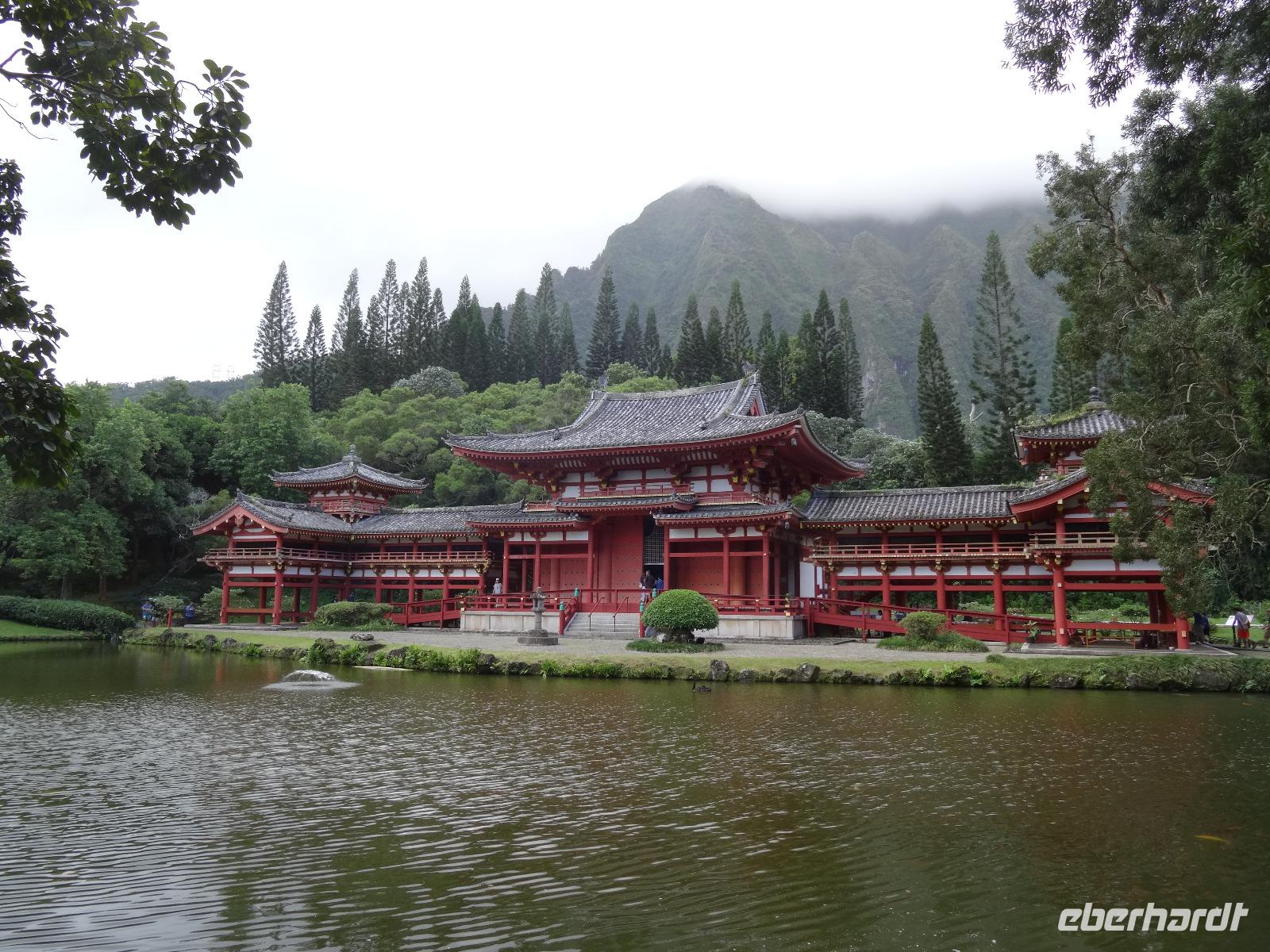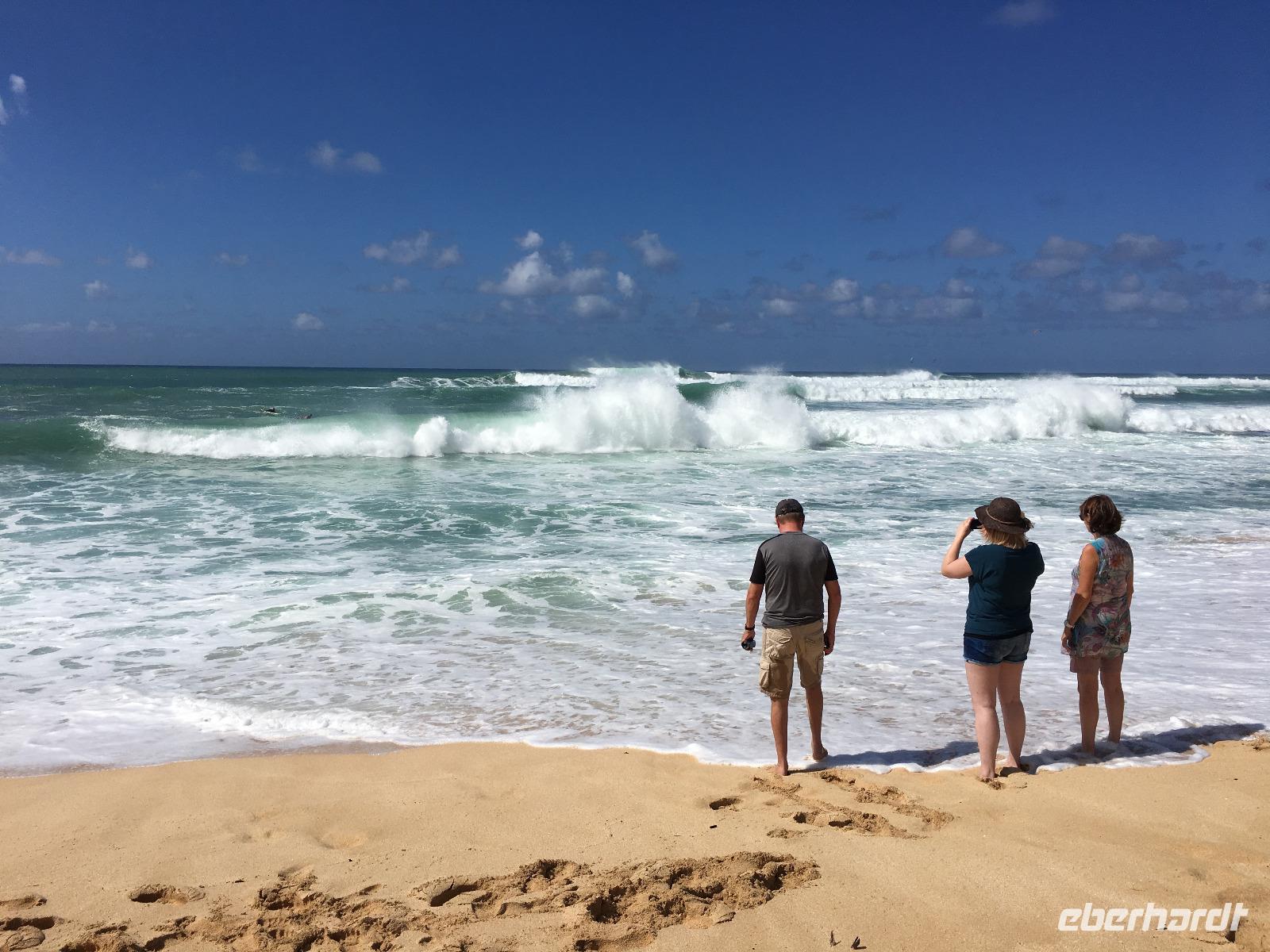 Unser erster Tag im "far, far away from the next civilisation" führte uns über die Insel Oahu, mit knapp einer Million Einwohnern das bevölkerungsreichste Eiland der Inselkette. Mit unserer Reiseleiterin Brigitte verließen wir Waikiki und fuhren in südöstlicher Richtung zum Amelia Earheart Lookout, wo wir unseren ersten kurzen Stopp hatten. Von hier aus hat man einen guten Blick auf den Diamond Head, das Wahrzeichen von Honolulu, die steil abfallende Küste und die Gedenktafel von Amelia Earhart, der ersten Person, die allein von Hawaii nach Nordamerika geflogen ist. Weiter ging es vorbei an gepflegten Häusern und noblen Golfplätzen zur Hanauma Bay, einem erloschenen Vulkankrater, der vielen Fischarten eine relativ geschützte Heimstatt bietet. Da wir immer an der Küste blieben, bot sich uns nach jeder Kurve und hinter jedem Felsvorsprung ein herrlicher Blick auf traumhafte Strände und bizarre Felsformationen. So auch bei unserem nächsten Stopp, den wir am Halona Blowhole einlegten, wo mit etwas Glück Gischtfontänen zu bewundern sind, die bis zu sechs Meter in die Höhe schießen. So hoch ging es während unseres Aufenthaltes nicht, beeindruckend war die Symbiose aus löchrigem Tuffstein und unter Druck stehendem Wasser allemal. Sandy Beach und Makapu'u Point hießen die weiteren sehenswerten Küstenformationen, bevor wir ins Tempeltal einfuhren, um den Byodo-In Tempel zu besichtigen. Das kleinere Replikat des vor 950 Jahren in Uji, Japan, erbauten Originals gefällt durch seine Architektur und Anmut. Auch die gestalterisch korrespondierenden Gartenanlagen wähnen den Besucher in Japan, nicht auf Hawaii. Obwohl die Geschichte Hawaiis und die Bevölkerungsstruktur eng mit Japan verbunden ist. Bevor wir ein stärkendes Mittagessen in der landschaftlich schön gelegenen Kualoa Ranch zu uns nahmen, kosteten wir auf einer Macadamia-Plantage die gehaltvollen Nüsse in verschiedenen Geschmacksrichtungen. Die Auswahl reichte von Karamell-, über Kaffee- bis hin zu Zwiebel/Knoblauchgeschmack. Egal für was man sich entschied, lecker waren sie alle. Ein kleiner Strandspaziergang mit Blick auf den Chinesenhut half anschließend der Verdauung auf die Beine. In Laie sahen wir das Polynesian Cultur Center, die Mormonen-Universität und den Mormonen-Tempel. Die namensgebenden Turtles an der Turtle Bay ließen sich leider nicht blicken, so dass wir stattdessen eine Fahrtunterbrechung am Sunset Beach machten, wo uns die Wellen ihre arglistige Seite zeigten (oder wir Ihnen unsere unvorsichtige...). Aber was sind schon nasse Hosen gegen die faszinierenden Kräfte der Natur, im wütenden Anrennen gegen die unvermeidlichen Surfer, wagemutig und arrogant zugleich. Über den Kamehameha Highway gelangten wir später zur Dole Plantage, wo wir uns ein wahrhaft exquisites Ananaseis gönnten. An Pearl City vorbei ging es schlussendlich durch die Berge zum Nu'uanu Pali Aussichtspunkt, welcher einen atemberaubenden Blick über die Landschaft bot, wenngleich der Wind hier orkanartige Böen mitbrachte, die einem den Fotoapparate beinahe aus der Hand zu reißen drohte. Zurück im Bus ging es dann nach Waikiki, wo sich ein weiterer Tag voller schöner Erlebnisse seinem Ende zu neigte. Wer wollte, stürzte sich noch in die 26 Grad warmen Fluten am Waikiki-Beach oder unternahm einen Shopping-Streifzug durch die Boutiquen und Geschäfte der meist internationalen Label. Das eine oder andere Hawaii-Andenken wechselte dabei ganz sicher seinen Besitzer. Oft auch in Form eines bunten Hemdes....