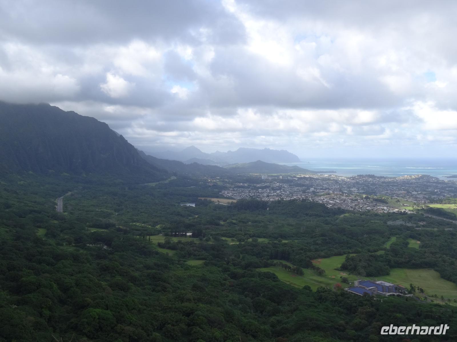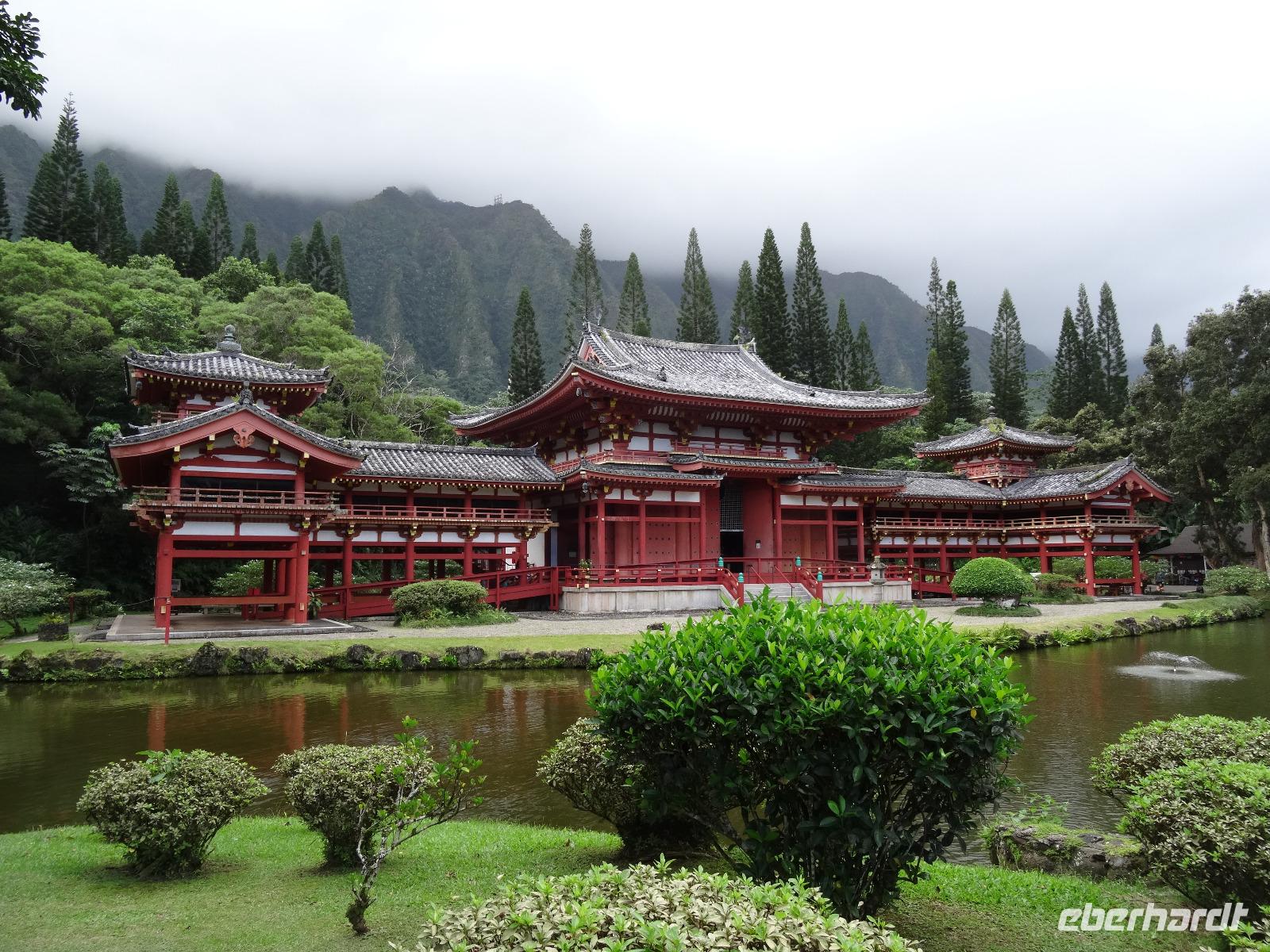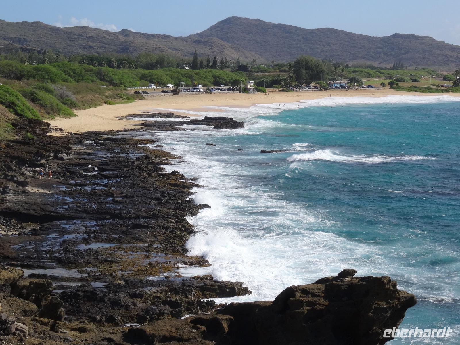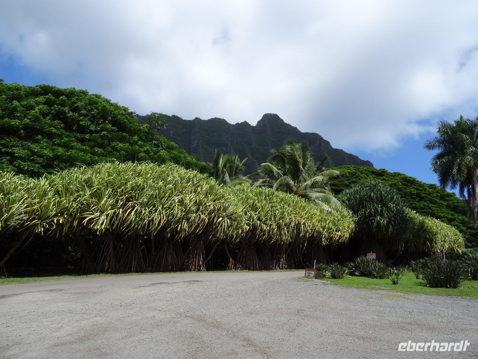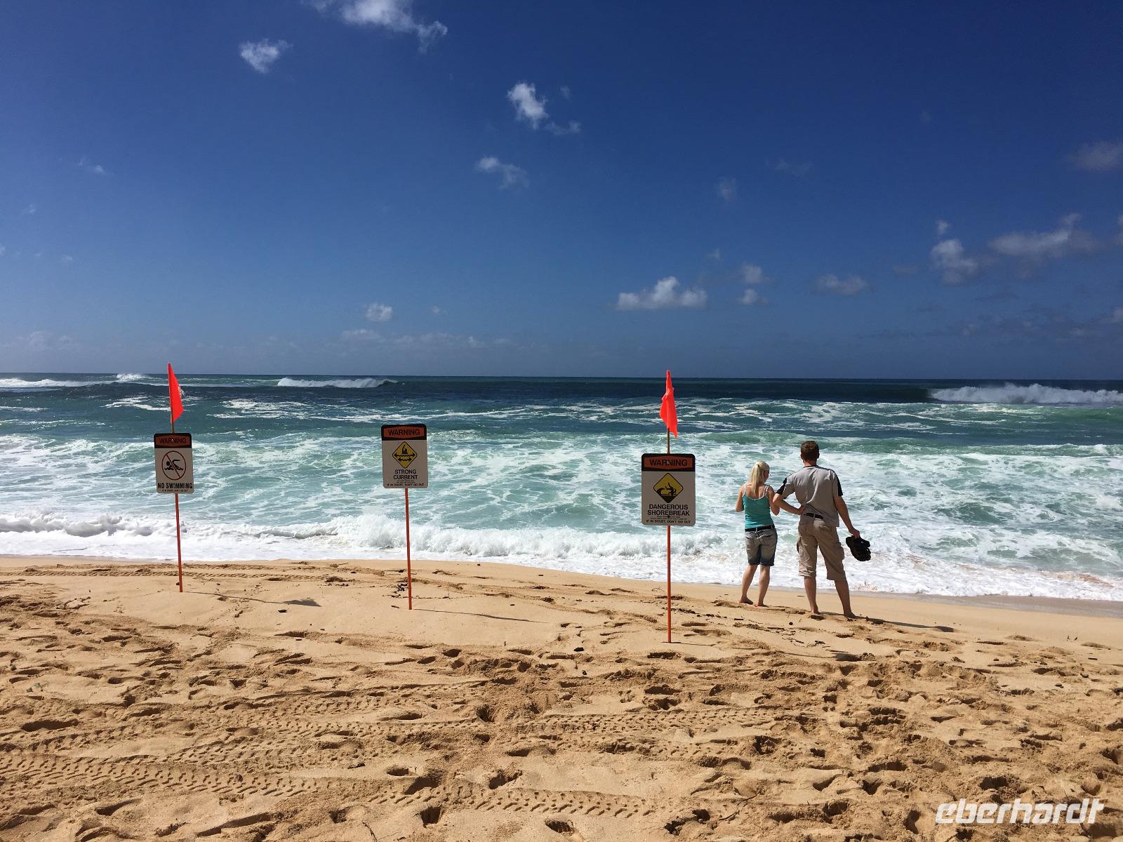Unser erster Tag im "far, far away from the next civilisation" führte uns über die Insel Oahu, mit knapp einer Million Einwohnern das bevölkerungsreichste Eiland der Inselkette. Mit unserer Reiseleiterin Brigitte verließen wir Waikiki und fuhren in südöstlicher Richtung zum Amelia Earheart Lookout, wo wir unseren ersten kurzen Stopp hatten. Von hier aus hat man einen guten Blick auf den Diamond Head, das Wahrzeichen von Honolulu, die steil abfallende Küste und die Gedenktafel von Amelia Earhart, der ersten Person, die allein von Hawaii nach Nordamerika geflogen ist. Weiter ging es vorbei an gepflegten Häusern und noblen Golfplätzen zur Hanauma Bay, einem erloschenen Vulkankrater, der vielen Fischarten eine relativ geschützte Heimstatt bietet. Da wir immer an der Küste blieben, bot sich uns nach jeder Kurve und hinter jedem Felsvorsprung ein herrlicher Blick auf traumhafte Strände und bizarre Felsformationen. So auch bei unserem nächsten Stopp, den wir am Halona Blowhole einlegten, wo mit etwas Glück Gischtfontänen zu bewundern sind, die bis zu sechs Meter in die Höhe schießen. So hoch ging es während unseres Aufenthaltes nicht, beeindruckend war die Symbiose aus löchrigem Tuffstein und unter Druck stehendem Wasser allemal. Sandy Beach und Makapu'u Point hießen die weiteren sehenswerten Küstenformationen, bevor wir ins Tempeltal einfuhren, um den Byodo-In Tempel zu besichtigen. Das kleinere Replikat des vor 950 Jahren in Uji, Japan, erbauten Originals gefällt durch seine Architektur und Anmut. Auch die gestalterisch korrespondierenden Gartenanlagen wähnen den Besucher in Japan, nicht auf Hawaii. Obwohl die Geschichte Hawaiis und die Bevölkerungsstruktur eng mit Japan verbunden ist. Bevor wir ein stärkendes Mittagessen in der landschaftlich schön gelegenen Kualoa Ranch zu uns nahmen, kosteten wir auf einer Macadamia-Plantage die gehaltvollen Nüsse in verschiedenen Geschmacksrichtungen. Die Auswahl reichte von Karamell-, über Kaffee- bis hin zu Zwiebel/Knoblauchgeschmack. Egal für was man sich entschied, lecker waren sie alle. Ein kleiner Strandspaziergang mit Blick auf den Chinesenhut half anschließend der Verdauung auf die Beine. In Laie sahen wir das Polynesian Cultur Center, die Mormonen-Universität und den Mormonen-Tempel. Die namensgebenden Turtles an der Turtle Bay ließen sich leider nicht blicken, so dass wir stattdessen eine Fahrtunterbrechung am Sunset Beach machten, wo uns die Wellen ihre arglistige Seite zeigten (oder wir Ihnen unsere unvorsichtige...). Aber was sind schon nasse Hosen gegen die faszinierenden Kräfte der Natur, im wütenden Anrennen gegen die unvermeidlichen Surfer, wagemutig und arrogant zugleich. Über den Kamehameha Highway gelangten wir später zur Dole Plantage, wo wir uns ein wahrhaft exquisites Ananaseis gönnten. An Pearl City vorbei ging es schlussendlich durch die Berge zum Nu'uanu Pali Aussichtspunkt, welcher einen atemberaubenden Blick über die Landschaft bot, wenngleich der Wind hier orkanartige Böen mitbrachte, die einem den Fotoapparate beinahe aus der Hand zu reißen drohte. Zurück im Bus ging es dann nach Waikiki, wo sich ein weiterer Tag voller schöner Erlebnisse seinem Ende zu neigte. Wer wollte, stürzte sich noch in die 26 Grad warmen Fluten am Waikiki-Beach oder unternahm einen Shopping-Streifzug durch die Boutiquen und Geschäfte der meist internationalen Label. Das eine oder andere Hawaii-Andenken wechselte dabei ganz sicher seinen Besitzer. Oft auch in Form eines bunten Hemdes....