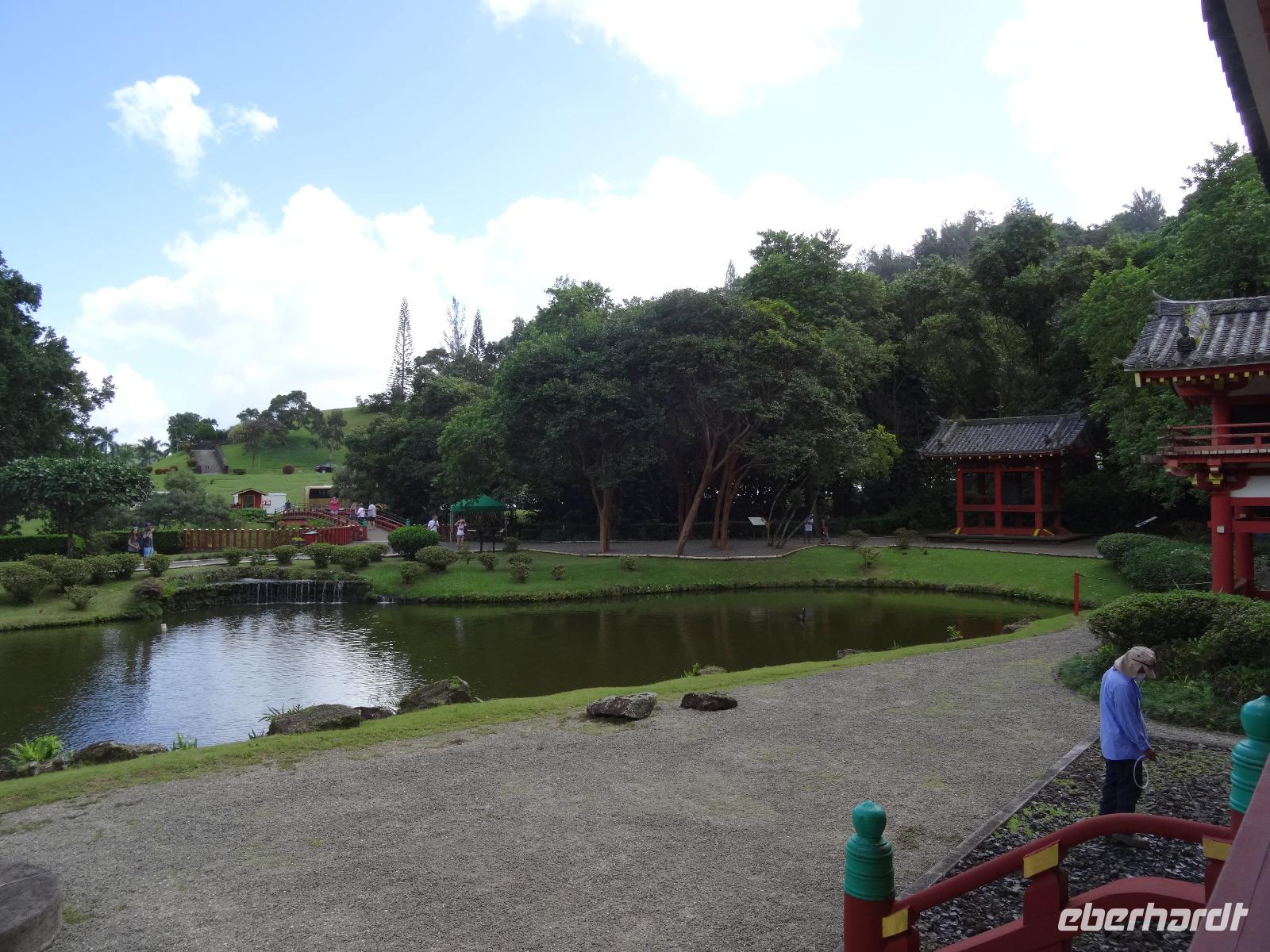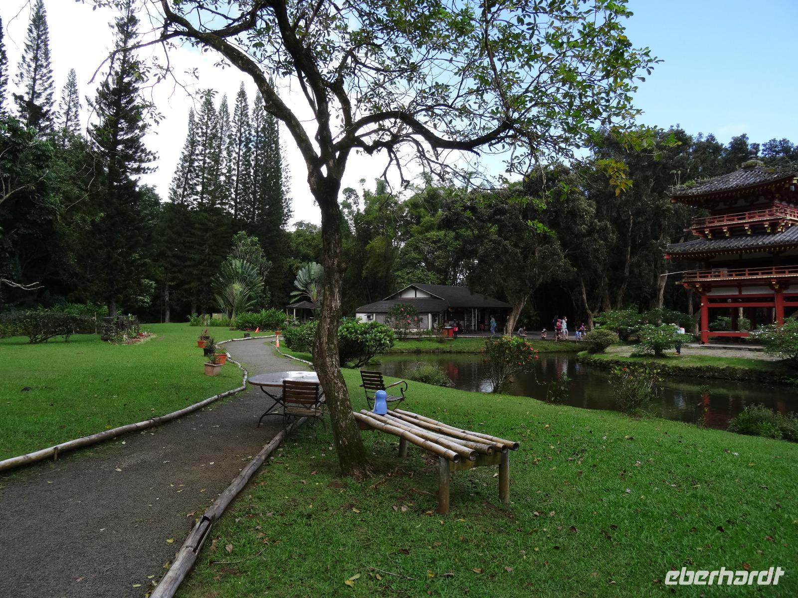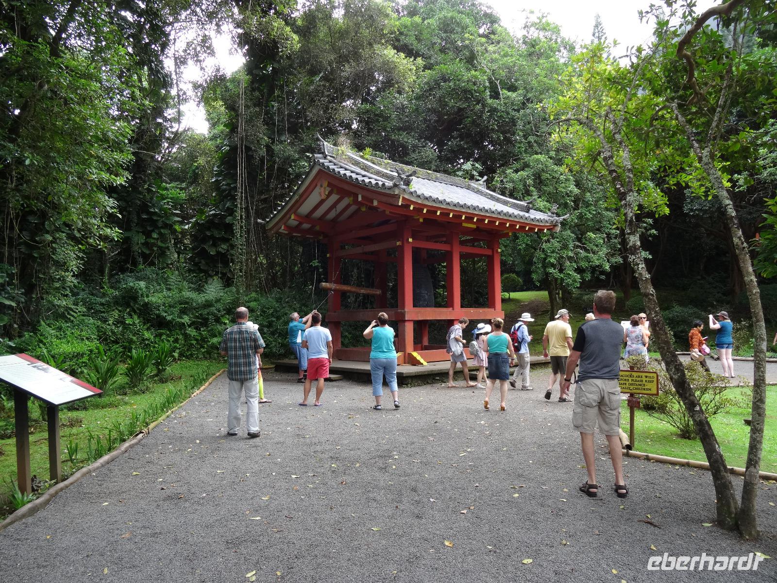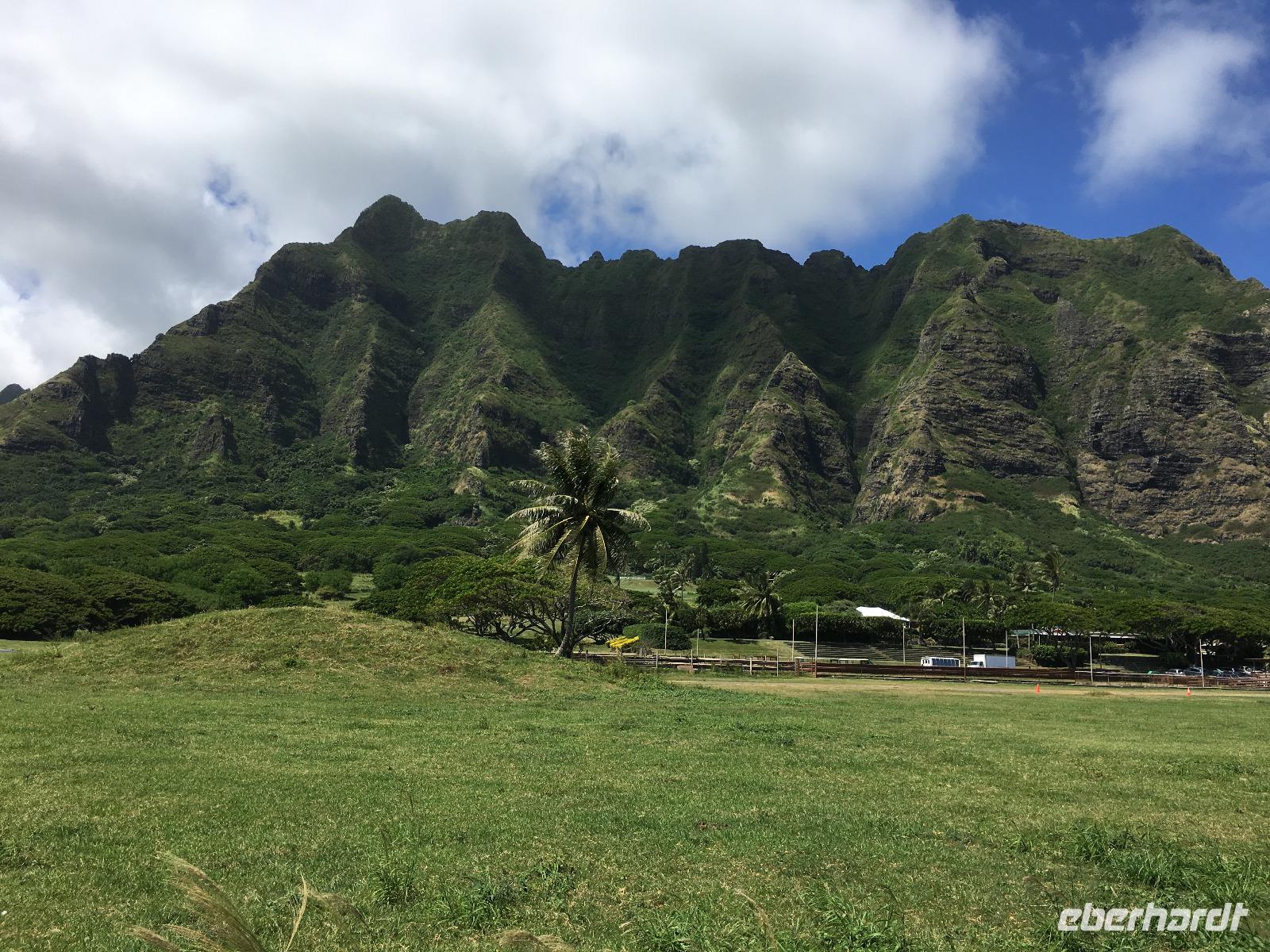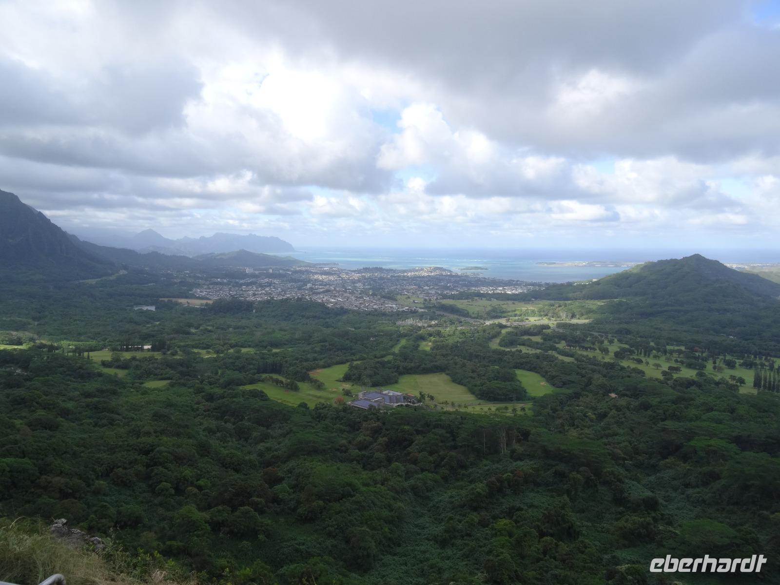 Unser erster Tag im "far, far away from the next civilisation" führte uns über die Insel Oahu, mit knapp einer Million Einwohnern das bevölkerungsreichste Eiland der Inselkette. Mit unserer Reiseleiterin Brigitte verließen wir Waikiki und fuhren in südöstlicher Richtung zum Amelia Earheart Lookout, wo wir unseren ersten kurzen Stopp hatten. Von hier aus hat man einen guten Blick auf den Diamond Head, das Wahrzeichen von Honolulu, die steil abfallende Küste und die Gedenktafel von Amelia Earhart, der ersten Person, die allein von Hawaii nach Nordamerika geflogen ist. Weiter ging es vorbei an gepflegten Häusern und noblen Golfplätzen zur Hanauma Bay, einem erloschenen Vulkankrater, der vielen Fischarten eine relativ geschützte Heimstatt bietet. Da wir immer an der Küste blieben, bot sich uns nach jeder Kurve und hinter jedem Felsvorsprung ein herrlicher Blick auf traumhafte Strände und bizarre Felsformationen. So auch bei unserem nächsten Stopp, den wir am Halona Blowhole einlegten, wo mit etwas Glück Gischtfontänen zu bewundern sind, die bis zu sechs Meter in die Höhe schießen. So hoch ging es während unseres Aufenthaltes nicht, beeindruckend war die Symbiose aus löchrigem Tuffstein und unter Druck stehendem Wasser allemal. Sandy Beach und Makapu'u Point hießen die weiteren sehenswerten Küstenformationen, bevor wir ins Tempeltal einfuhren, um den Byodo-In Tempel zu besichtigen. Das kleinere Replikat des vor 950 Jahren in Uji, Japan, erbauten Originals gefällt durch seine Architektur und Anmut. Auch die gestalterisch korrespondierenden Gartenanlagen wähnen den Besucher in Japan, nicht auf Hawaii. Obwohl die Geschichte Hawaiis und die Bevölkerungsstruktur eng mit Japan verbunden ist. Bevor wir ein stärkendes Mittagessen in der landschaftlich schön gelegenen Kualoa Ranch zu uns nahmen, kosteten wir auf einer Macadamia-Plantage die gehaltvollen Nüsse in verschiedenen Geschmacksrichtungen. Die Auswahl reichte von Karamell-, über Kaffee- bis hin zu Zwiebel/Knoblauchgeschmack. Egal für was man sich entschied, lecker waren sie alle. Ein kleiner Strandspaziergang mit Blick auf den Chinesenhut half anschließend der Verdauung auf die Beine. In Laie sahen wir das Polynesian Cultur Center, die Mormonen-Universität und den Mormonen-Tempel. Die namensgebenden Turtles an der Turtle Bay ließen sich leider nicht blicken, so dass wir stattdessen eine Fahrtunterbrechung am Sunset Beach machten, wo uns die Wellen ihre arglistige Seite zeigten (oder wir Ihnen unsere unvorsichtige...). Aber was sind schon nasse Hosen gegen die faszinierenden Kräfte der Natur, im wütenden Anrennen gegen die unvermeidlichen Surfer, wagemutig und arrogant zugleich. Über den Kamehameha Highway gelangten wir später zur Dole Plantage, wo wir uns ein wahrhaft exquisites Ananaseis gönnten. An Pearl City vorbei ging es schlussendlich durch die Berge zum Nu'uanu Pali Aussichtspunkt, welcher einen atemberaubenden Blick über die Landschaft bot, wenngleich der Wind hier orkanartige Böen mitbrachte, die einem den Fotoapparate beinahe aus der Hand zu reißen drohte. Zurück im Bus ging es dann nach Waikiki, wo sich ein weiterer Tag voller schöner Erlebnisse seinem Ende zu neigte. Wer wollte, stürzte sich noch in die 26 Grad warmen Fluten am Waikiki-Beach oder unternahm einen Shopping-Streifzug durch die Boutiquen und Geschäfte der meist internationalen Label. Das eine oder andere Hawaii-Andenken wechselte dabei ganz sicher seinen Besitzer. Oft auch in Form eines bunten Hemdes....
