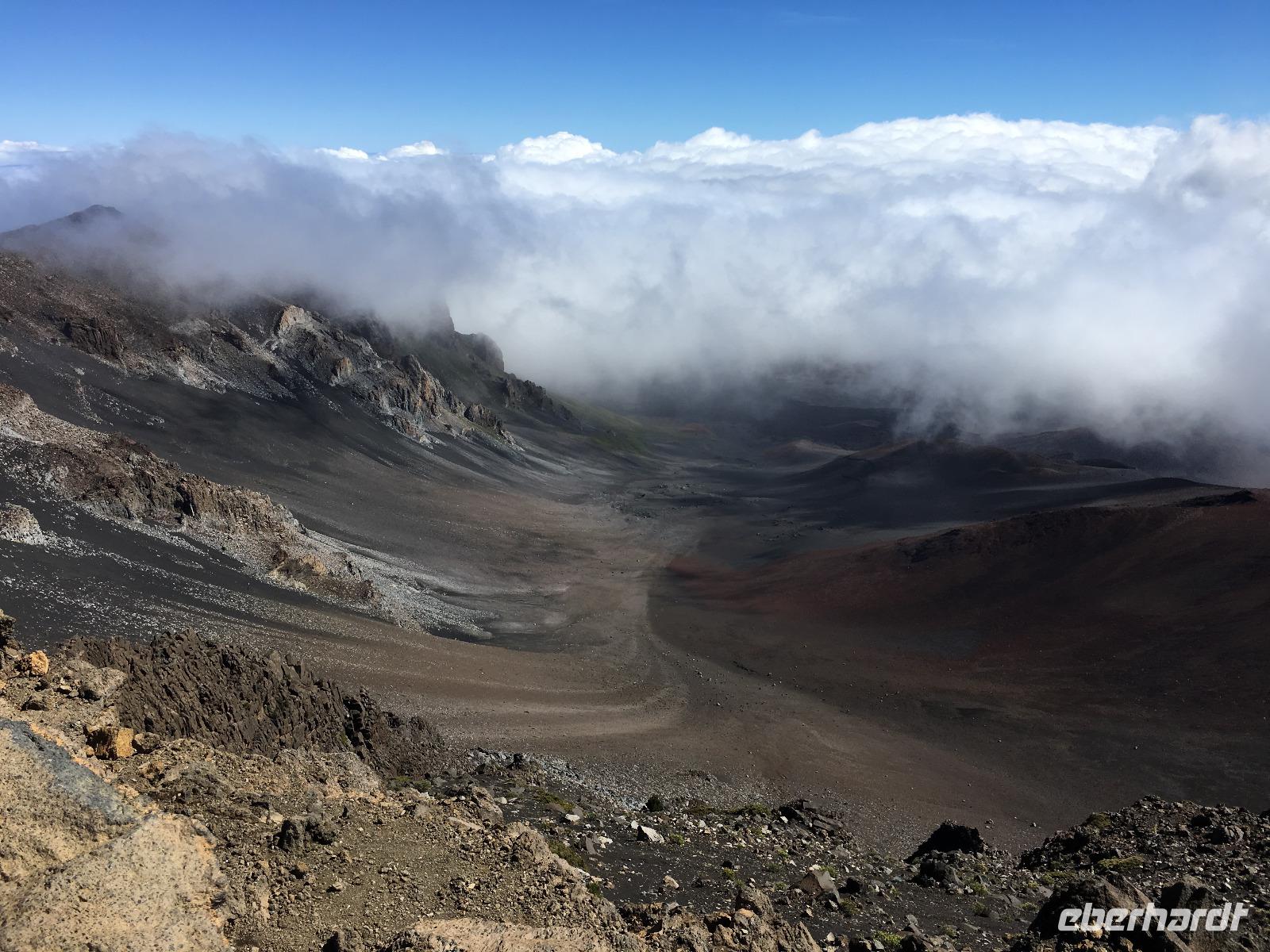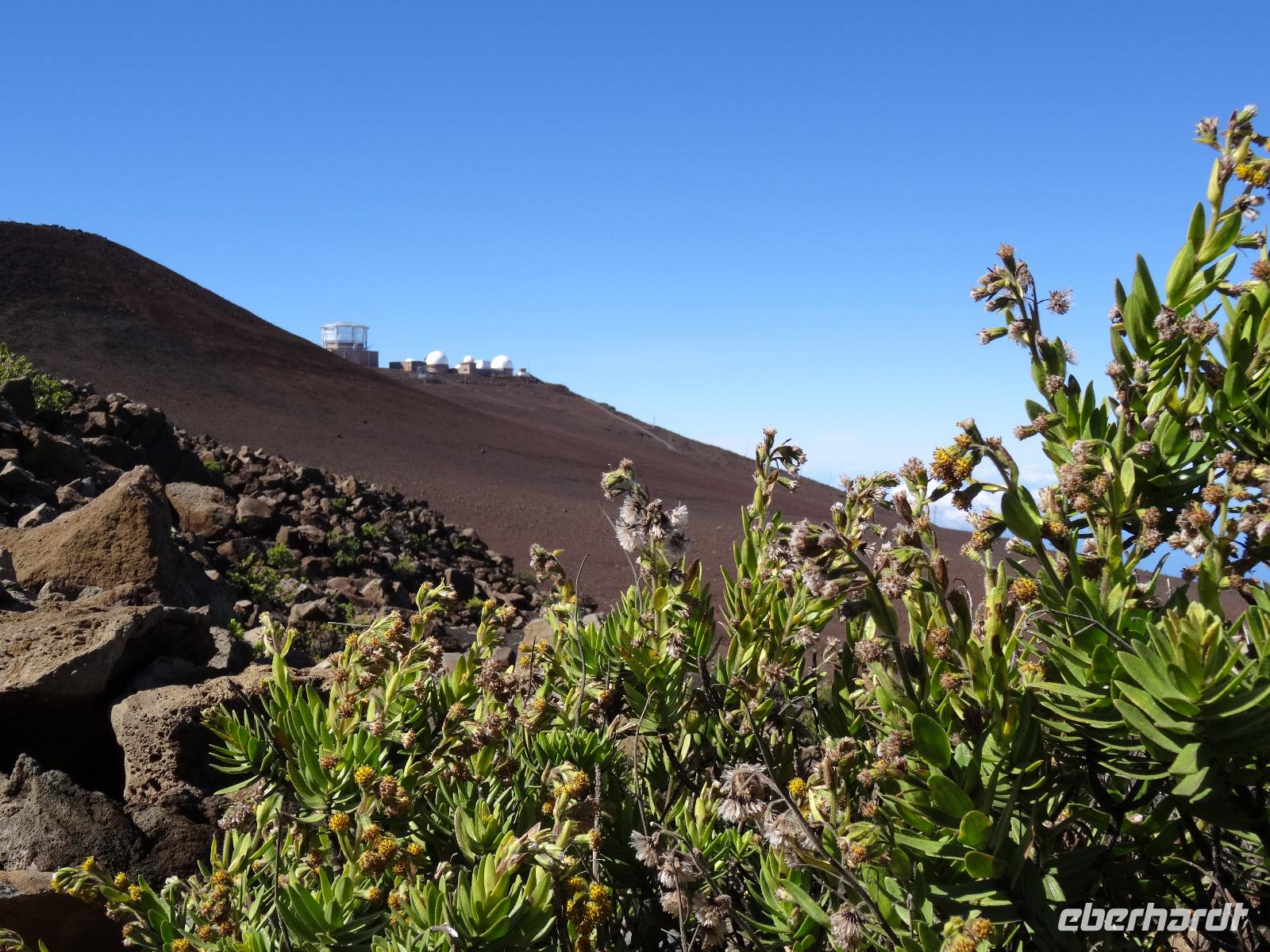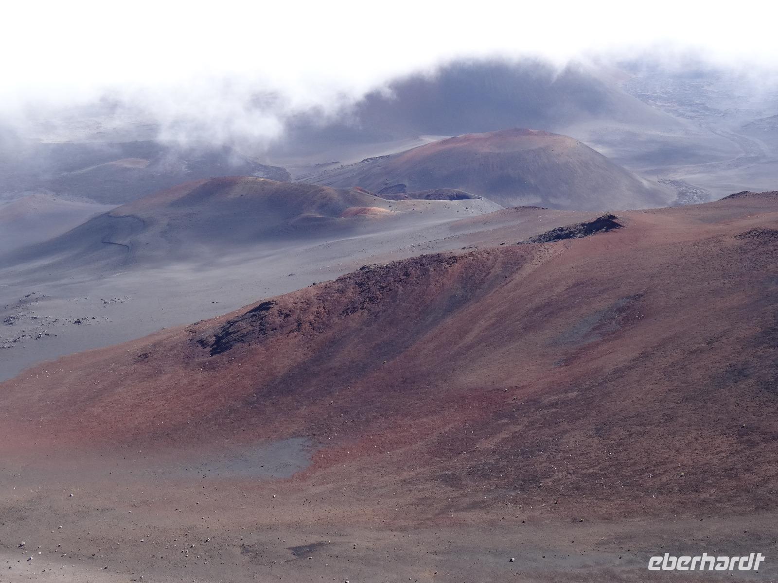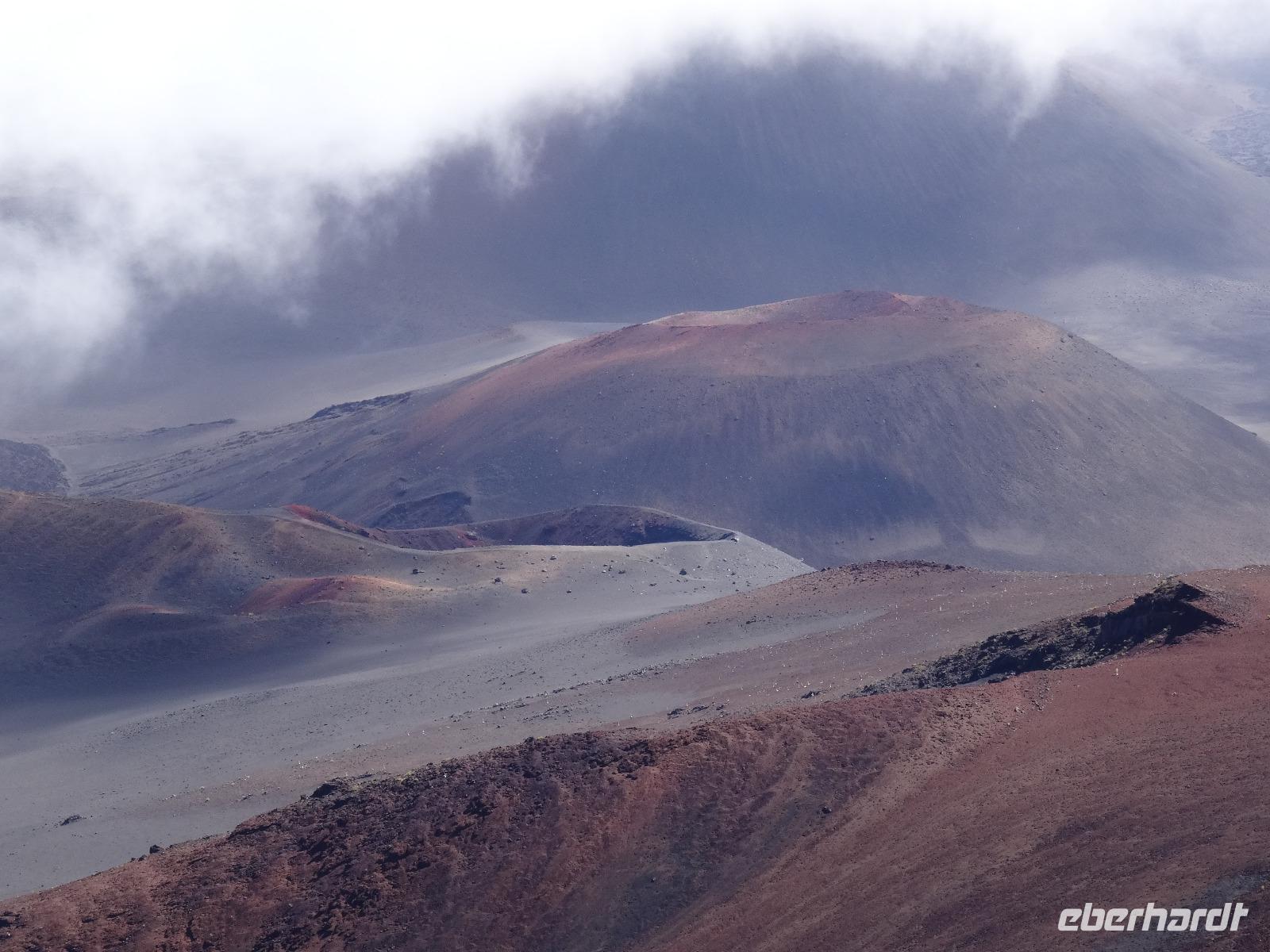 Seitdem wir auf Maui waren, schien uns der Regen zu verfolgen. Als wir an diesem Morgen unsere Augen aufschlugen und aus dem Fenster schauten, war ringsumher alles nass. Was generell nichts Schlechtes bedeuten muss, da das Wetter hier auch relativ schnell umschlägt. Aber von ewiger Sonneninsel kann auch keine Rede sein. So bestiegen wir nach dem Frühstück unseren Bus und starteten zu einer Fahrt, die uns auf knapp dreitausend Meter Höhe bringen sollte. Kleidungstechnisch waren wir sowohl für kalte Temperaturen als auch für Regen gerüstet. Wir fuhren an Lahaina vorbei die schöne Küstenstraße in Richtung Kahului entlang, passierten dabei die engste Stelle der Insel, die in der Nord-Südausdehnung nur knapp 15 Kilometer breit ist und der Insel ihren Beinamen Talinsel gegeben hat. Betrachtet man diese Stelle nämlich von den beiden Bergen Haleakala und Mauna Kahalawai aus, blickt man (zwangsläufig) in ein sich so ergebendes Tal. Wir bogen vor Kahului auf die Straße zum Nationalpark Haleakala ab und konnten zu unserer Freude feststellen, dass sich das Wetter im Trockenmodus befand. Wenn wir jetzt noch gute Sicht am Krater hätten... Doch soweit war es noch nicht. Vorher galt es, die serpentinenreiche Straße bergaufwärts zu meistern. Unterwegs sahen wir ein paar wenige Proteen und die seltene, nur hier wachsende Pflanze Ahinahina, das Silberschwert. Nach dem Erreichen des Haleakala-Besucherzentrums stiegen wir aus und - fröstelten. Es schien zwar glücklicherweise die Sonne, dafür blies der kalte Wind umso heftiger. Nichtsdestotrotz genossen wir hier in dreitausend Meter Höhe einen tollen Ausblick auf den riesigen Krater, der sich uns zu Füßen in verschiedenen Farben darbot. Stetige Wolkenbewegungen sorgten für immer andere Sichtfelder und am Ende unseres Aufenthalts zog urplötzlich so viel Nebel auf, dass der Krater und das nahegelegene Observatorium quasi im Nichts verschwanden. Vorher war uns aber noch der Blick auf die Nachbarinsel Big Island vergönnt, wo wir die beiden beherrschenden Vulkane Mauna Kea und Mauna Loa gut sehen konnten. Wir verließen den Haleakala-Gipfel wieder und begaben uns zurück auf Meeresspiegelniveau. Über Hali'imaile und Pa'ia fuhren wir weiter zur Maui Tropical Plantation bei Waikapua. Diese wunderschöne tropische Anlage bot einen guten Überblick über die Flora Hawaiis. Teile von alten Industrieanlagen waren dabei architektonisch eindrucksvoll in die Landschaft integriert worden und gingen mit den sie umgebenden Pflanzen eine wunderbare Symbiose ein. Bei einer kleinen Plantagenrundfahrt mit einer Elektrobahn sahen wir viele der hier wachsenden Pflanzen und Früchte aus der Nähe und konnten einer Schauvorführung beiwohnen, die das fachmännische Öffnen einer Kokosnuss zeigte. Zu guter Letzt führte uns unsere Tour nach Lahaina, in die ehemalige Inselhauptstadt unter Kamehameha I. und spätere Walfängerhochburg im Pazifik. Davon zeugen heute nur noch wenige Memorabilien, hat sich das Städtchen doch mittlerweile dem Tourismus an den Hals geworfen und dementsprechend viele Restaurants, Shops, Museen und vor allem Galerien entstehen lassen, die um die Gunst der Besucher buhlen. Einige wenige Häuser aus der Zeit des Walfangs waren noch zu besichtigen. Ein botanisches Highlight war sicher der mehr als 140 Jahre alte indische Banyasbaum, der mit einer Kronenfläche von knapp einem Hektar der drittgrößte Baum seiner Art weltweit ist. Wir verließen Lahaina, was auf Deutsch "Gnadenlose Sonne" bedeutet und während unseres Aufenthaltes spürbar war, am späten Nachmittag und kehrten in unser Hotel am Ka'anapali Beach zurück. Bevor wir uns jedoch mit dem Packen der Koffer beschäftigen wollten, nutzten einige die verbleibende Zeit noch zum Baden, Schnorcheln oder um einfach noch ein paar Andenken shoppen zu gehen.
